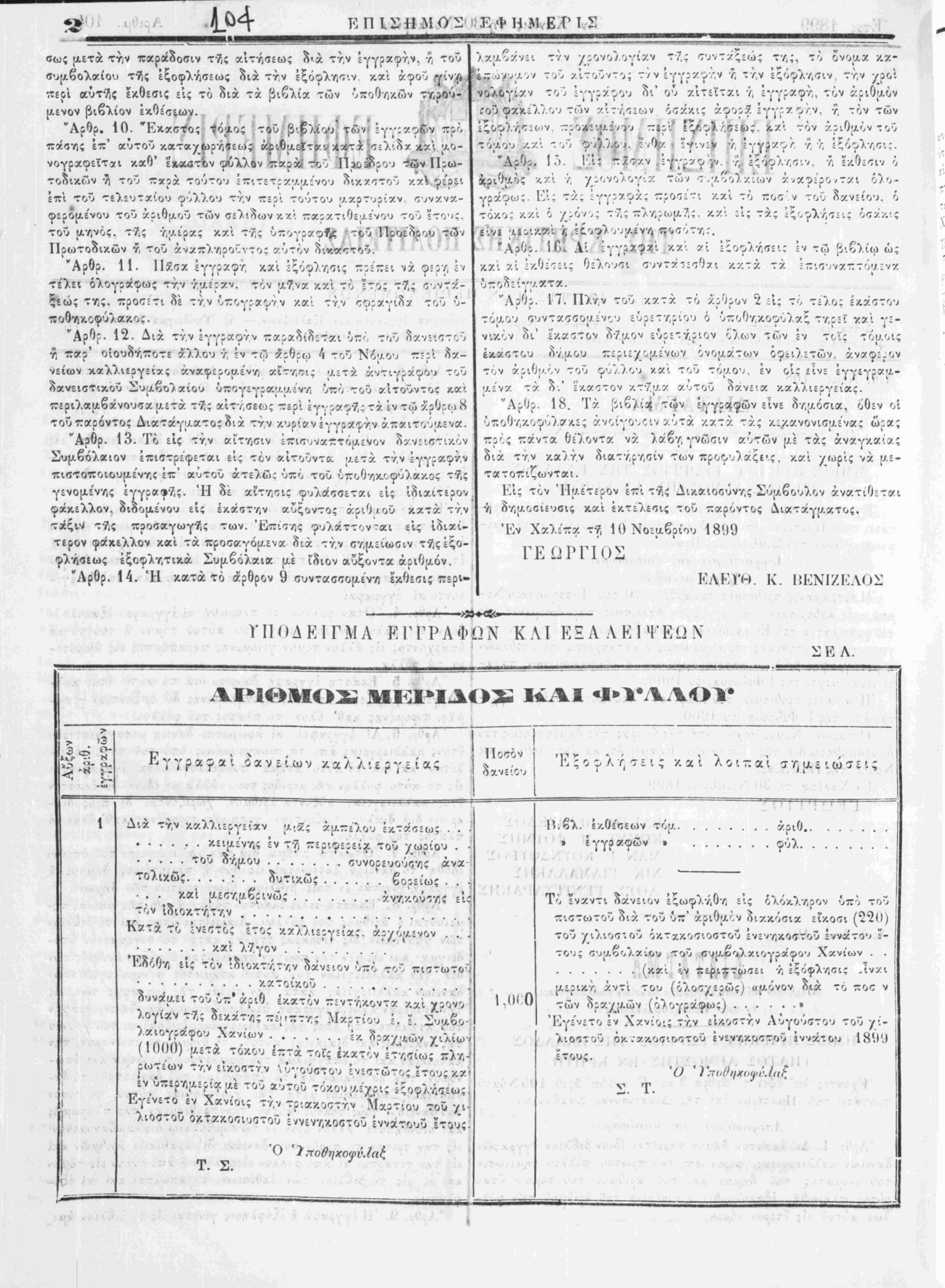 ίαν^ίων' κχλλιεργείχ;. <ρ^ον εττι τού -ρωτου φύλλου <Ι'θ;/.είωσ·.ν τού όνόα*τος τού «ν,αου κκί τού άριθν.οθ τού τό;~ου· οταν ουτο; πλΥ(ρω0·7(1 εξακολουθή υ, ουν£/3ΐα τού χ^ιθαου των φ·Ά- λων αυτού είς Έτερον νο|χον. φ ρ ετο; κχλλιεργείας αυςοντα ί-.ριθθΛν. •/ωρίζ',ντζι ίε -ρος κριοιν 5!ικ οι^ΧΤίς όριζοντίου γραααγ.ς *5υρο[Χ£νγ(ς καθ* όλον τό πλάτο; τού φύλλου. "Αοθο. 7. "Οταν τό Άτγ/Αα διά τγν καλλΐδ'ογειαν τού ότυοίου Ι · Ι · ε εδύθγ, το δάνειον Ικτίίνετα'- εί; ούο η πλειοτερους δγ,αους, γ, έγγραφγ, γίνετα·. εν τοίς βιβλίοι; ολων τούτων των δγ,αων. "Αοθΰ. 8. Εκάστη ηύλ; εκάστου τόαου ανωθι τ·7,ς όιτοίας ση- 'χειούται 6 άριθαός τού φύλλου, δ'.αιρεϊται οττως καΐ τό βιβλίον των ύποθγ,κών εί; τέσσαρας στγ4λκ; κατά τό συν7}αμ.ε'νον ύτ:ό« δειγαα· και εί; ν.1ν τγ,ν πρώτγ,ν σΥί^αειούται ό αυςων άριθαό; των διά τγ,ν κα7,λιεργίΐχν τού αυτού κτγ^ατο; συνο[ΑθλογΛθίντ( 4 δανείων καλλιεργεία; κατά τγν σειράν τίς εγγράφως των, εις τγ,ν δευτέραν γ4κυρίκ εγγρζφη. περιλααβάνουσα άκριβίπ-ριγραφτ,ν τού κτ·/ιαατο;, τό Ιτος τ-^ς καλλιεργίίας, όριζθ|χ·'νου τού χρόνου τ*7ί; ενάιζεως καΐ οιαοκεία; αυτού, το ονο'ΑΧ, το επώνυαον, τγ,ν κατοικίαν κχΐ το επάγγελΐλα τού οφειλετου, τό ονοαα κχι ε*ώ- νυαον. τγ,ν κατοικίαν και το ετίάγγελαα τού δανειστού, τό δχ- νειστικον Συμβόλαιον αετά τ·7ις χ^ονολογία; αυτού, τό ποσόν τού δανείον, τούς τόκου; αυτού τγ,ν ττροθεσμναν τ·/,; πληρωι/.^ς καί οιονδήποτε άλλον όρον εν τω συαβολαίω ?5·.αλαα.βανό'Λ=νον- είς τγν τιίτΥίν τό Τϊοσόν τού δχνείου δι1 άραβ'.κών αριθμών καί εί; τγ,ν τετά^τχν αί άπό φύλλου -ίςούλλον γ( ά^ότόαου εί; τόαον καΐ αί εί; τό βιβλίον των ε%0&'σεο>ν ^χρχ^οαπχι κχΐ χί εςο·