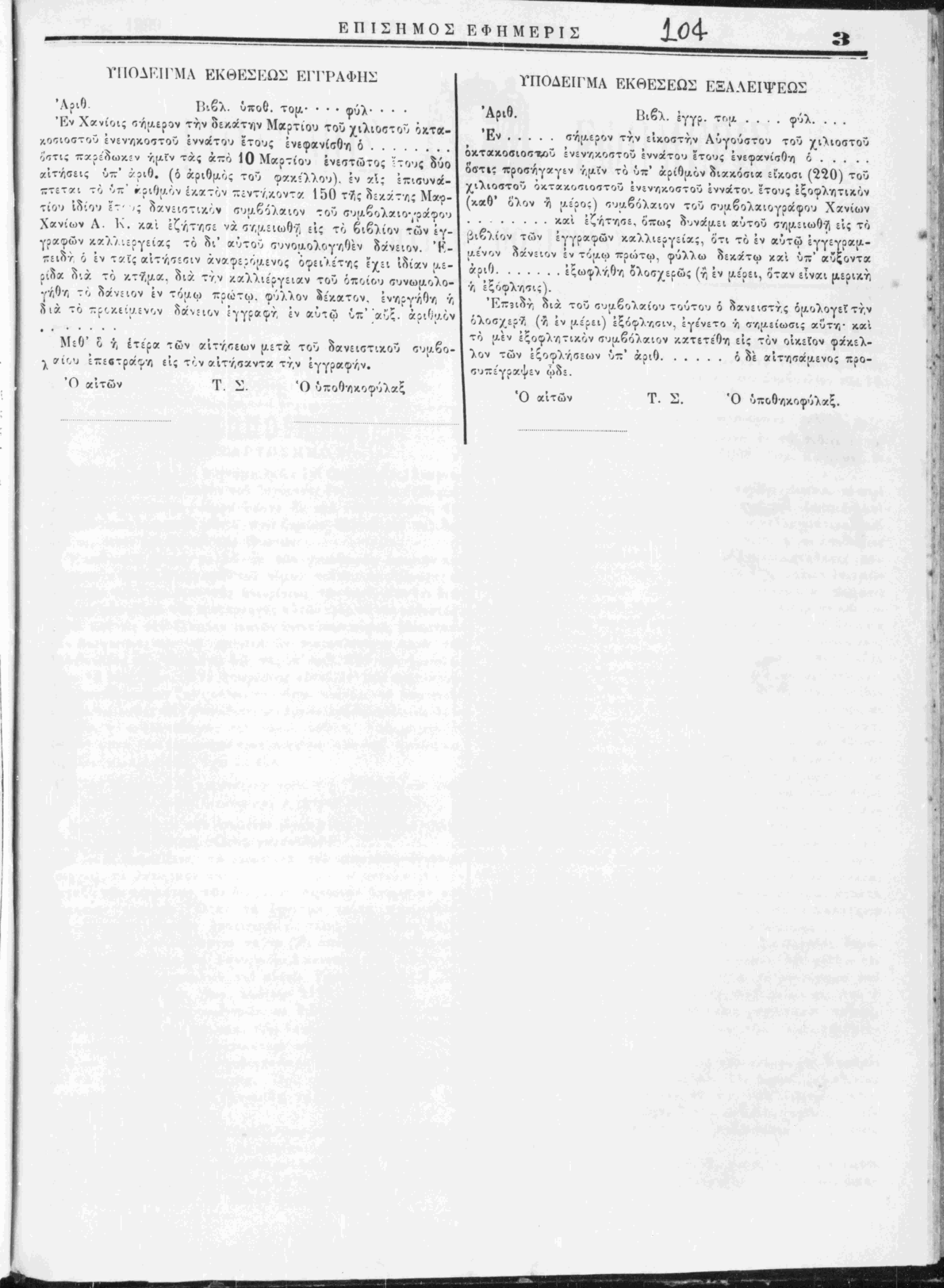 τερον φάκελλον καί τα προσαγόρ.ενα ?ιά τγ,ν σγ,(Λ3ίωσιν τγ,ςεξο- ησΕως έξοφλγ,τικά Συρ.βολαια ρ.έ ί'Χιον αυξοντα άριθαόν. "Αρθρ. 14. Ή κατα τό άρθρον 9 συντασσομενν) έκθεσις 7:ερ·· γ γ 8·.ά τγν κα/Υ.ν ^ιατχργ,σίν τ(ον προου) αςε»,:. /.αί νωρί; νά υ.ε- τατοπ^ωνται. Κίς τον Ημέτερον ετΐ τίς Λικαιοούνγ,ς Σύμβουλον ανατ·.0;ται •^ ίγ4αοσι$υσις καί εκτέλεσις τού -παρόντος Λιατάγ|7.ατος. Έν Χαλίττα τγ, 1 Ο Νοιαβρίου 18«ί Ο ΓΕΩΡΓΙΟΣ ΚΛΚ.νΗ. Κ. ΙϊΚΝΊΖΚΛΟΣ ΠΙΠΛΚΙΓΜΛ ΕΓΓΡΑΦΟΝ ΚΛΙ ΚΞΛ Λ Κ ΙΜ'Εϋ Χ ΣΕΛ ΚΑΙ Εγγραφαί οανείων καλ λιε ργε ίας Ποσόν ο χν & ι ου Ί δ : ο ο λ ή ;ίΐ; κ α Ι λ ο ι - α 1 τ η α ε ι ώ ι Δια τγ,ν καλλιέργειαν ;„.£; ά^ττελου εχ.τκσ·ως . . - ......κεΐί/,^'νγ,ς εν τη τντεριοειείχ τού νωοίου . . ..... .ου ογ,[/.ου.......συνορευουσΥΐς ανα τολικώς. ...:.. δυτικώς.....'. βορείως . . , . . .^ καί αεσγ,μβρινώ:.......ανγ,κούσ·/;: ε^ τον ίϊ; Κ^-τα τό :νεστό: Ιτο: καλλιεργείαί, ά?/ό«.ενον . . .' •......καί λ/.γον......... Ι Εδόθη είς τόν -Χιοκτητην δάνειον υ-ό τού -ι-τωτοΐ •.........κατοίκου.............ι ουνάίλει τού ΰπ'άριθ. εκατόν --ντή-Λοντκ κχι χοονο λογίαντη: ^κκτης -ήί-της Μκρτίου ε. ?. Συαβο- λαιογρά?ου Χανίων.......^. ϊ:«/.ι.ών /ιλίων (1000) μετά τόκου ί-τά τοΓ: εκατόν ετησίως^λη-' ρωτε'ων την εΐκοστγν ΰγούστου εν^στώτος ετου: κα- Τ. Σ. Ο Ί ι,(ΜΌ Π.βλ. ε/.Οε'σε(«)ν τόα, . . . γγ? αν.οων » . . . . αριθ, . . . . θύλ. Τό ΐναντι δάνειον εξωφληθη εις όλόν-ληοον υπό τού ^!.στο)τού Χ·.κ τού υζ1 αριθαόν ίικκόσια ίί'/.οσι (2*20) τού χιλιοσ".ού όκτχ^οσιοστού ενενηκο^του Ιννάτου ΐ'- του: συ'Λοολα·.ου τού ουυιοολζιονράοου Χανίων . .......(καί =ν περιπτώσει η Ιςόφλησις -ίνκι ί αε:ικη κντί τού (όλοσνεοώ:) «μονον Λιά τό ζοσ ν των ορα^ν/.ών (ο) ογρκζρω:^......» Εγένετο εν Χκνίο·.; την εί/.οστγν Αυγούστου τού γί- λιοστού ε τού;. ύ ενεντ.κοστού ί ν Τ —* · — ·