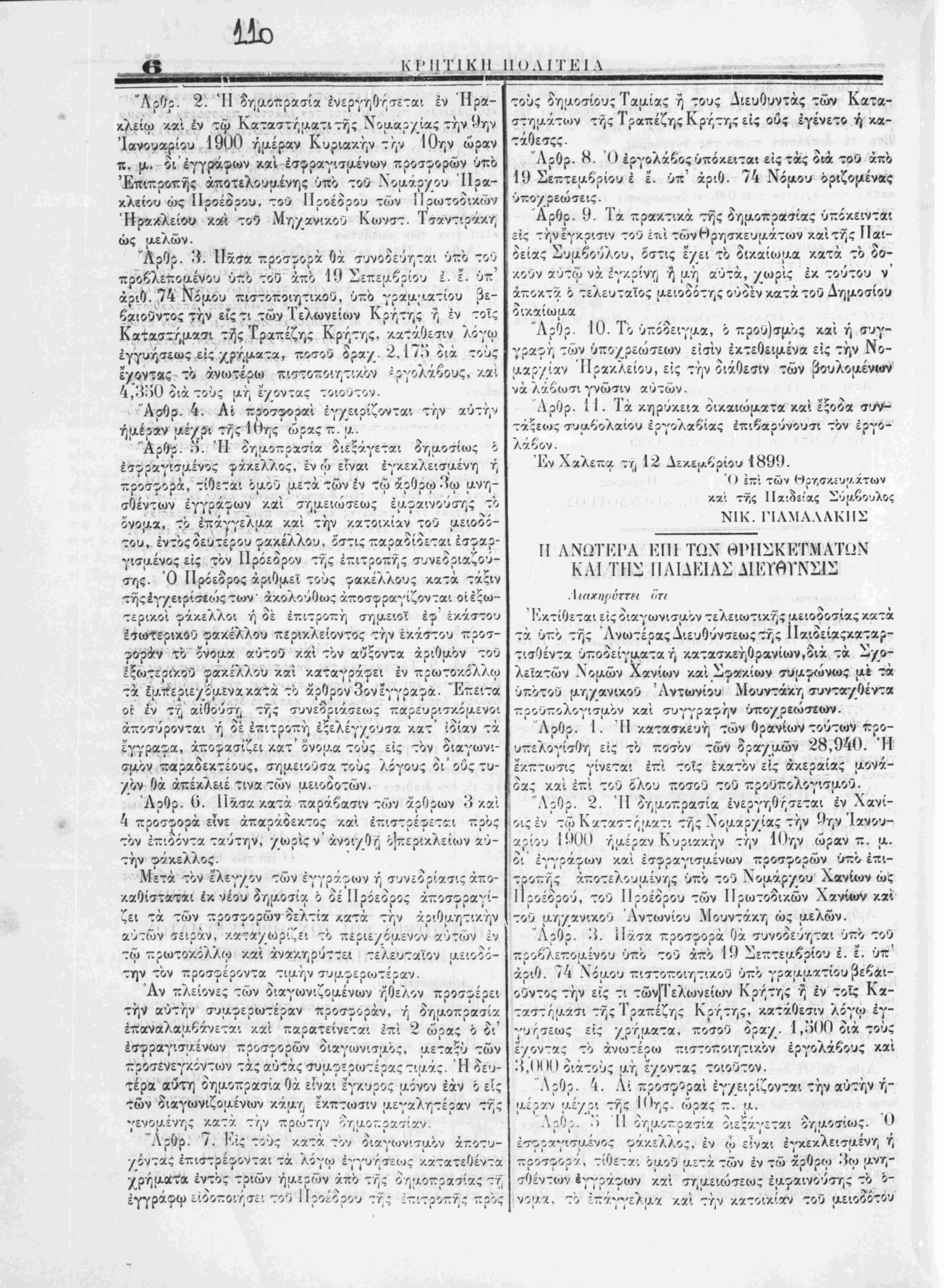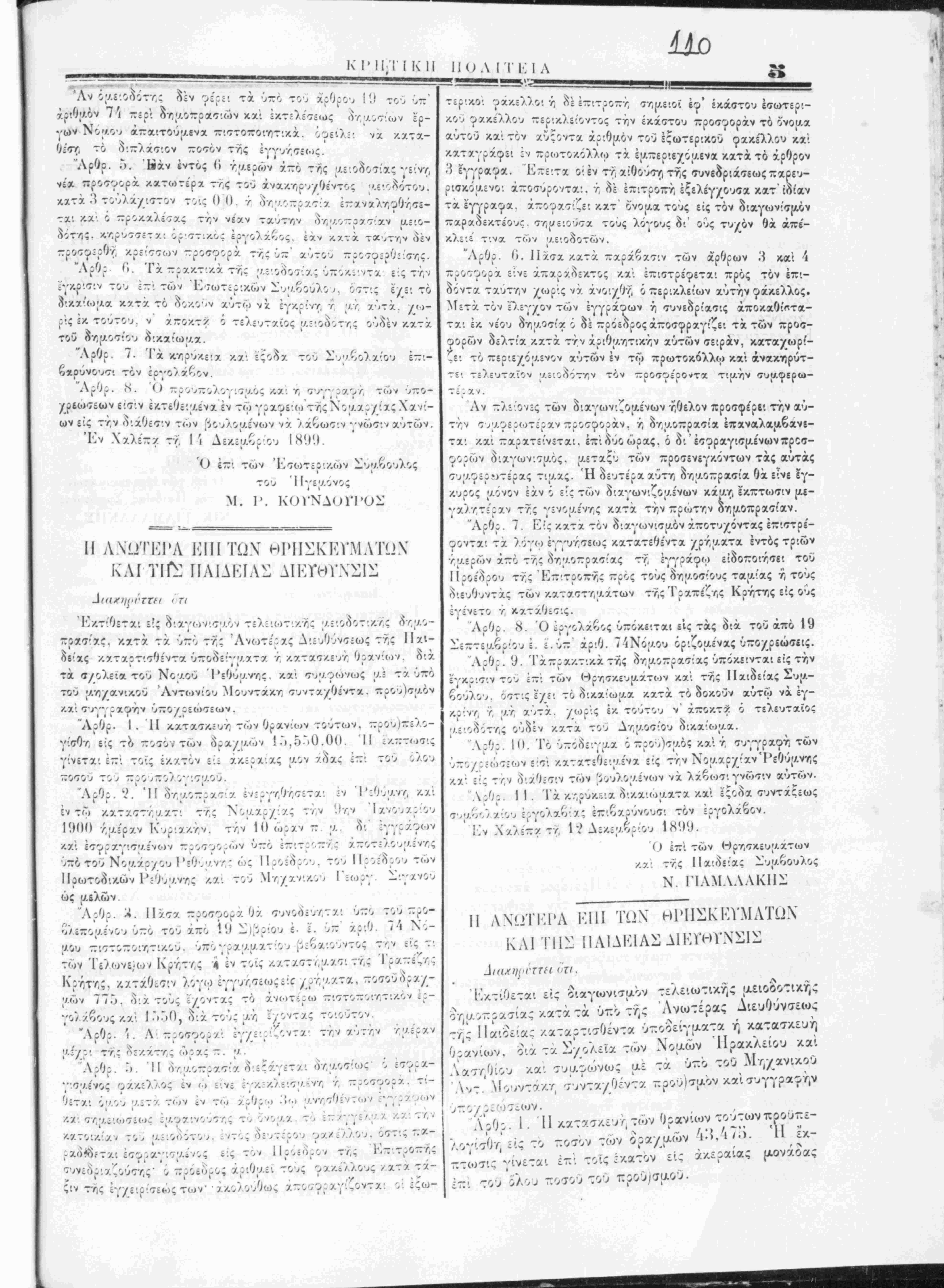 <) εττ: των ν καί της ΙΙα·.οε!ας — ΰμβο1 ΝΙΚ. ΠΑΜΛΛΛΚΠΣ II ΛΝΩΤΚΡΑ ΕΠΙ ΤΩΧ ΘΡΙ1ΣΚΚΤΜΑΤΩΝ ΚΛΙ ΤΗΣ ΠΛΙΔΚΙΛΣΔΙΚΪβΤΝΣΙΣ Κκτίθεται εις διαγωνισμόν τελειωτικης μειοοοσίας κατά τα υπο της Ανωτέρας Διευθύνσεως τής Παιδείαςκαταρ- τισθέντα υποδείγματαή κατασκεήθρανίων,διά τα Σ/ο- λεϊατών Χομών Χανίων και Σφακίων συμ^<ιίνως μ* τα ΰπ'οτου μη/ανικου 'Λντωνίου Μουντάκη συντα/Οέντα προυπολογισμόν κα! συγγρα^ην υπο/ρεώσεοιν. Λρθρ. Ι. Π κατασκευή των Ο ρανίων τούτων προ- υπελογίσθη είς το ποσόν των ορα/μών 28,940. Η έκπτωσις γίνεται επι τοίς εκατόν εις άκεραίας μονά- δας καί επι τού δλ^ ποσου τού προϋπολογισμόν. Λρθρ. 2. ΊΙ δημοπρασία ενεργηθήσεται έν Χανί¬ οις εν τω Καταστήματι τής Χομαρ/ίας την ί-ίην Ιανου- αρίου Ιί'ϋί) ημέραν Κυριακήν την ΙΟην ώραν π. μ. οί εγγράφων και εσφραγισμέναι προσ^ορών υπο έπι- τροπής αποτελούμενης υπο τού Νομάρχου Χανίων ώς Ιΐοοέδοού, τού Πςοέδοου των Ποωτοοικών Χανίων και τού μη/ανικου Λντωνίου Μουντάκη ώς μελών. Λρθρ. Λ. Πάσα ποοσφοοά Οά συνοδεύηται υπο τού ποο^Λεπουΐΐνου υπο τού απο Ι" Ιιεπτεαο,ιου ε. ε. >πζ