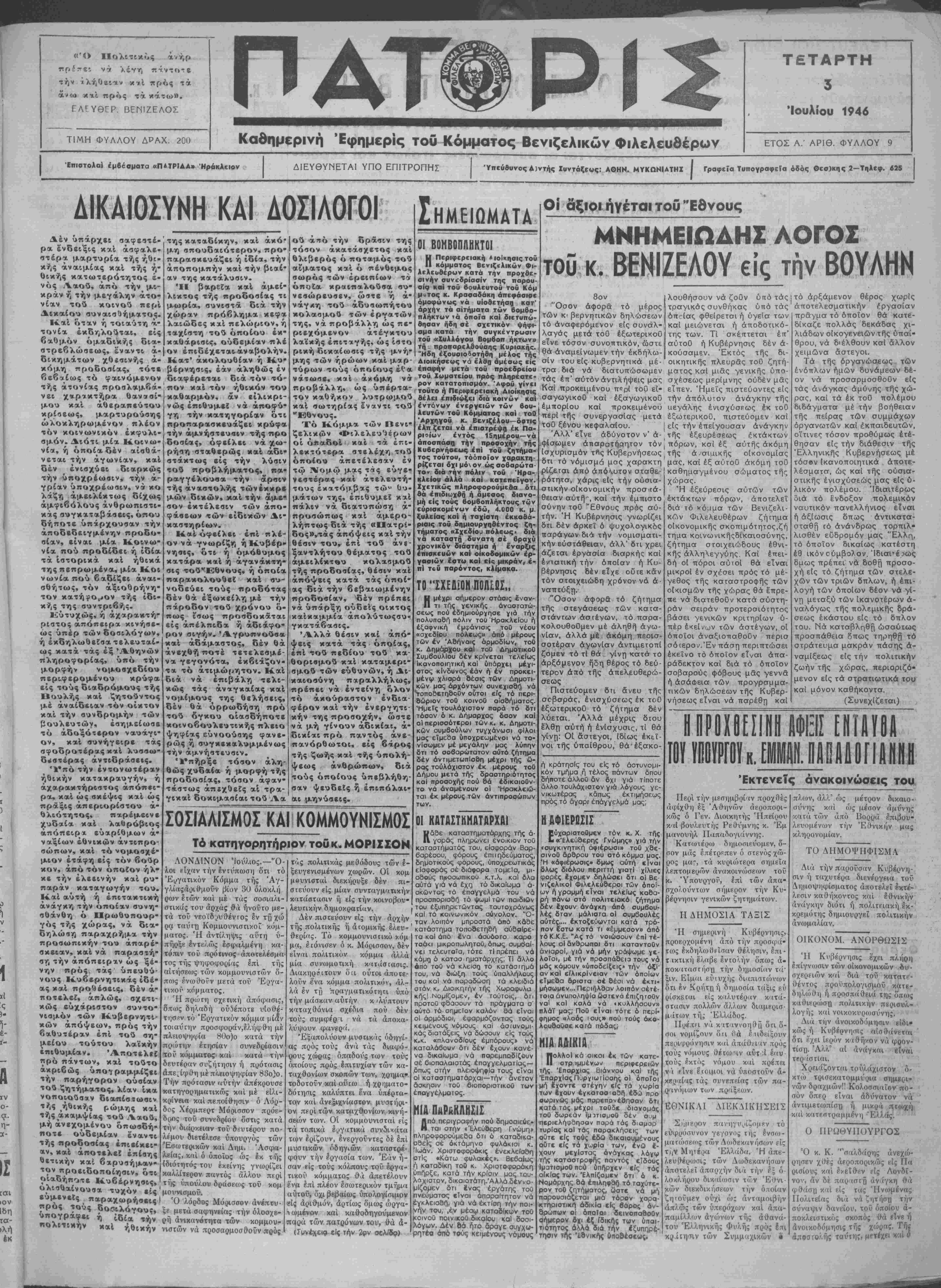 τσά<ι μικροπωλητοθ, όπως συμΰαΙ- νει τελευταία, τότε τί πρέπει νά κάμη ό κατασ.ηματάρχης, ΤΙ άλλο άπό τοΰ νά κλείση το κατάσΐημά τού, νά διωξη τους ύπαλλήλους τού καΐ νά παραδώση τα κλειδιά οτόν κ. Διοικητήν τής Χωροφυλα κης1 Νομίζομεν, έν τούτοις, ότι προτοϋ φ&άσουν τα πράγματα σ αύτο τό σημείον καλόν οά είναι οί άρμόδιοι, εφαρμόζοντας τους κειμενους νόμους και άσιυνομι κάς διατάξεις νά δώσουν είς τούς κ.κ. «πλανοδίους έμπόρους» νά καταλά6ουν ότι δέν έχουν κανέ- να δικαΐωμα νά παρεμποδΐζουν σέ βιοπαλαιατάς έπαγγελματιας— δπως οτήν πλειοψηφία τους είναι οί καταστηματάρχαι—την όνετον άσκησιν τοϋ 6ΊοποριοτικοΟ των έπαγγέλματος. ΜΙΑ ΠϋΡϋΚΛΗΣΐΣ Από περιγραφήν πού δημοαιεύε- ται στην «Έλευθερη Γνώμη» τληροφορούμεδα δτι ό καταδικα¬ σθείς σέ όκτάμηνο φυλάκισι κ. Ιωάν. Χριστοφοράκις ένεκλεΐσθη οτΐς «Κατω φυλακές». Βεβαίως ή καταδίκη τοθ κ. Χριστοφοράκη υπήρξε, κατά την κρίσιν μας του¬ λάχιστον, δικαιοτάτη.Άλλά δεννο- μΐζομεν δτι βνας έργάτης τοϋ πνεύματος εΤναι απαραίτητον νά έγκλεισοι^, γιά νά έκτίση την ποι¬ νήν τού, ,έν μέσω καταδίκων τοθ κοινοϋ ποινικοθ δικα/ου καΐ δοσι¬ λόγων. Δέν οά ήτο άραγε συγχιν- ρητέο από τούς κειμένους νόμους ΜΝΗΜΕΙΩΔΗΣ ΛΟΓΟΣ τοθ κ. ΒΕΝΙΖΕΛΟΥ είς την ΒΟΥΛΗΝ 8ον "Οσον άφορδ τό μέρος των Κ' βερνηπκών δηλώσεων τό αναφερόμενον είς συναλ¬ λαγάς μετά τού έξωτερικοΰ είνε τόσον συνοπτικόν, ώστε θά αναμείνωμεν την εκδήλω¬ σιν τού είς κυβερνηπκά μέ- τρα διά νά διατυπώσωμεν τάς έπ' αύτόνάντιλ,ήψεις μας Καί προκειμένου π<=ρί τού εί- σαγωγικοθ καΐ έξαγωγικοΰ έμπορίου καί προκειμένου περί τής συνεργασΐας μετά τοθ ξένου κεφαλαίου. Άλλ' είνε αδύνατον ν' α¬ φίσωμεν απαρατήρητον τόν Ισχυρισμόν τΛς Κυβερνήσεως δτι τό νόμισμά μας χαρακτη ρίζεται άπό άπόυτον σταθε- ρότητσ, χάρις είς την ούσια- στικήν οικονομικήν προσπά¬ θειαν αύτή'", καί την έμπιστο σύνην τοθ "Εθνους πρός αυ¬ τήν. Ή Κυβέρνησις γνωρΐζει δτι δέν άρκεΐ ό ψυχολογικ6ς παράγων διά την νομισματι- κήν εύστάθειαν, άλλ' δτι χρει άζεται έργασία διαρκής καί ένιατική την οποίαν ή Κυ¬ βέρνησις δέν εΐχε ουτε κάν τόν στοιχειώδη χρόνον νά α¬ ναπτύξη. "Οσον άφορα τό ζήτημα τής στεγάσεως των κατα- στάντων άστέγων, τό παρα- κολουθοθμεν μέ αληθή αγω¬ νίαν, άλλά μέ άκόμη πεοισ- σοτέραν αγωνίαν άντιμετοπί ζομεν τό τί θά γίνη κατά τό άρξόμενον ήδη θέρος τό δεύ¬ τερον άπό τής απελευθερώ¬ σεως Πιστεύομεν δτι άνευ τής σοβσράο, ένισχύσεως έκ τοθ έξωτερικοΰ τό ζήτημα δέν λύεται. Άλλά μέχρις δΐου έλθη αυτή ή ενίσχυσις, τί θά γΐντ]: ΟΙ άστεγοι, Ιδίως έκι,ΐ- νοι τής ύπαίθρου, θά'έξακο- ή κράτηοΐς τού είς τό αστυνομι¬ κόν τμήμα ή τέλος πάντων δπου δήποτε άλλού άν δχι γιά τίποτε άλλο τουλάχιστον γιά λόγους γε¬ νικωτέρας κάπως εκτιμήσεως πρός τό άγαρι έπάγγελμά μας. Η ΑΦΙΕΡΩΣΙΣ Ευχαριστούμεν τόν κ. Χ. τής «Έλεύθερης Γνώμης» γιά την «συγκινήτική άφιέρωσι» τοθ χθε- σινοθ ΰρθρου τού στό κόμμα μας. 'Η «άφιέρωσις» δμως αυτή είναι δλως διόλου περιττή γιατΙ χΐλιες φορές έχομεν δηλώοει ότι οί Βε νιζελικοί Φιλελεύθεροι των οποί¬ ων ή γραμμή είναι τελείως καθα- ρή πάνω στό πολιτειακό ζήτημα δέν (χούν άνάγκη άπό συμβου- λές δταν μάλιστα οί συμβουλές αύτές.... έκτοξεύωνται κατά τρό¬ πον έστω κατά τι «έμμεοον» άπό τό Κ.Κ.Ε. "Ας τό νοιώσουν επί τέ- λους οί δνδρωποι δτι καταντοϋν άνιαροί, γιά νά μην γράψωμε γε λοΤοι, μέ την προσπαθεία τους νά μδς κάμουν <<ύποδείξεις» την αξί¬ αν καί ειλικρίνειάν των οποίων είμεθα αρίστα σέ θέσι νά έ,κτ