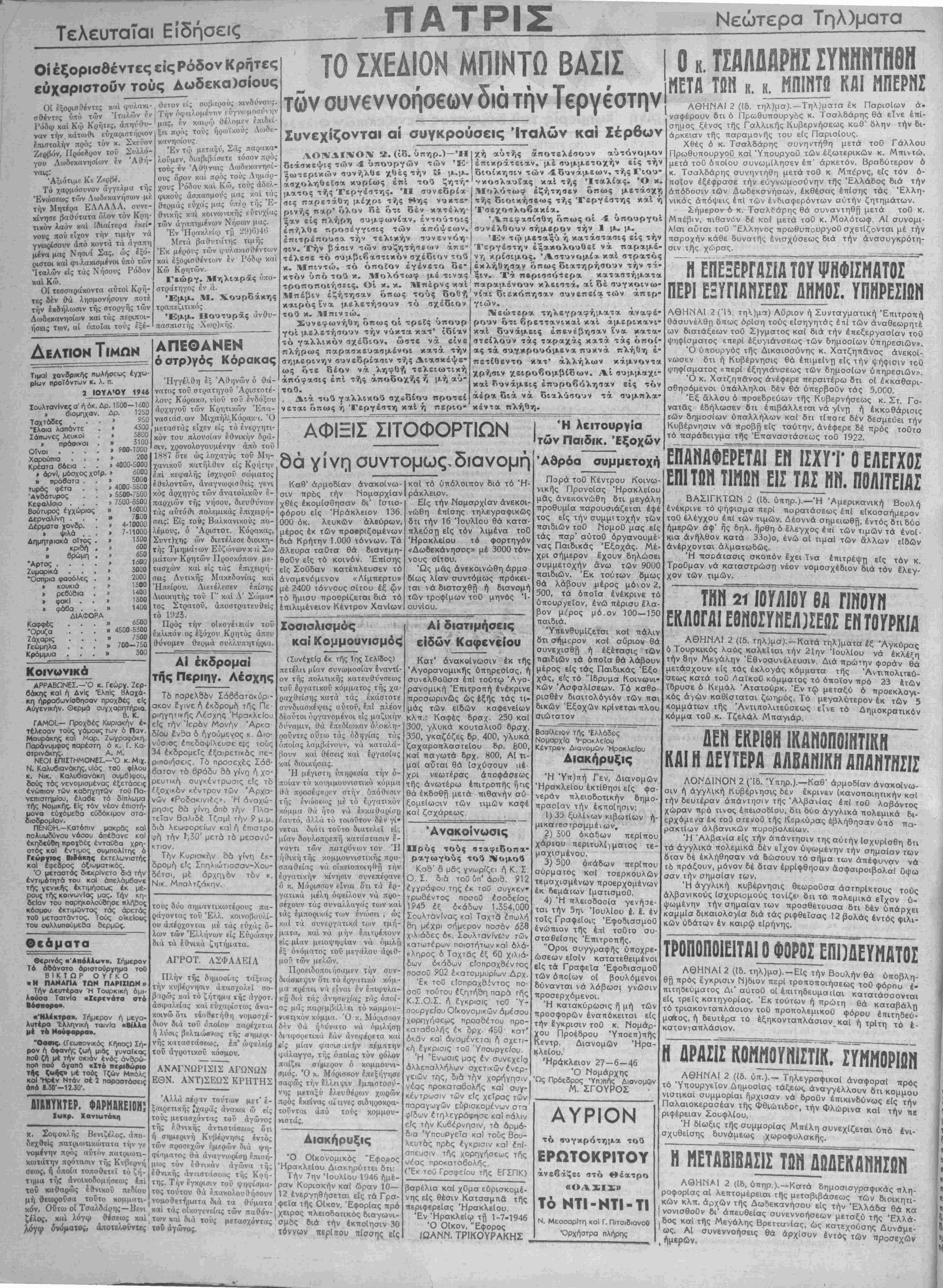 καταβολης £■< δρχ 450 κατ' όκδν καί άναμένεται ή σχετι- κή δγκρισ/ς τοϋ Ύπουργε/ου. Ή "Ενωσις μας έν συνεχεία αλλεπαλλήλων σχετικών ένερ- γειων της; διά την χορήγησιν νέςις προκαταβολής κρί συγ- κεν'τρωσιν των είς χε'ϊρας των παραγωγών ευρισκομένων στα' φίδων ετηλεγράφησε καί πάλιν είς την Κυβέρνησιν, τα αρμο¬ δία 'ΥπουΡγεΤα κα) τους Βου¬ λευτάς πρίις έγκρισιν καί έπί- σπευσιν τής χορηγήσεως της νέας προκαταβολής. (Έκ τοΰ Γρσφείου τής ΕΓΣΠΚ) Ο κ. ΤΣΑΛΔΑΡΗΣ ΣΥΗΗγΙΤΗΘΗ ΜΕΤΑ ΤΩΝ κ. κ. ΜΠΙΝΤΩ ΚΑΙ ΜΠΕΡΝΣ "ΑΘΗΝΑΙ 2 (ίδ. τηλ)μσ).— Τηλ)ματα έκ Παρισίων ά- ναφέρουν δτι ό ΠρωΘυποοργός κ. Τσαλδάρης θά είνε έπΐ- σημος ξένος τής Γαλλικής Κυβερνήσεως καθ1 δλην την δι¬ άρκειαν τής παραμονής τού είς Παρισίους. Χθές ό κ. Τσαλδάρης συνηντήθη μετά τοθ Γάλλου Πρωθυπουργοΰ καί 'Υπουργοϋ των εξωτερικών κ. Μπιντώ, μετά τοθ όποίου συνωμίλησεν έπ' αρκετόν. Βραδύτερον ό κ. Τσαλδάρης συνηντήθη μετά τοθ κ Μπέρνς, είς τόν ο¬ ποίον εξέφρασε την ευγνωμοσύνην τής Ελλάδος διά την απόδοσιν των Δωδεκσνήσων, έκθέσας έπίσης τάς Ελλη¬ νικάς άπόψεις επί των ένδιαφερόντων αυτήν ζητημάτων. Σήμερον ό κ. Τσσλ^άρης θά συναντηθή μετά τοΰ κ. Μττέβιν, πιθανόν δέ καί μετά τοΰ κ. Μολότωφ Αί συνομι- λ'αι αυται τοθ "Ελληνος πρωθυπουργοΰ σχετίζονται μέ την παροχήν κάθε δυνατή ένισχύσεως διά την άνασυγκρότη- σιν τής χώρας. Πσρά τοϋ Κέντρου Κοινω νίκης Προνοίας "Ηρακλείου μάς ανεκοινώθη δτι μεγάλη προθυμία παρουσιάζεται έφέ τος είς την συμμετοχήν τώ1 πσιδιών τοθ ΝομοΟ μας εί< τάς παρ' αύτοθ όργανουμέ νας Παιδικάς Έξοχάς. Μέ χρι σήμερον έχουν δηλώσε συμμετοχήν όνω των 9000 παιδιών. Έκ τούτων δμω θά λάβουν μέρος μόνον 2 500, τα όποΐα ενέκρινε τό υπουργείον, ένώ πέρισυ έ'λα βον μέρος μό όν 100—150 παιδία. "ΥπενθυμΙζεται καί πάλιν δτι σήμερον καί αυριον θά συνεχισθή ή έξέτασΐς των ■παιΕΐών τα όποΐα θά λάβου μέρος είς τάς Παιδικάς Έξο χάς, είς τό "Ιδρυμα Κοινωνι- κων Άσφαλίσεων. Τό καθο ρισθέν διαιτολόγιόν των πά δικών Έξοχών κρίνετα. πλου σιώτατον βασ'λειον τής "Ελλάδος Νομαρχία Ί-ροκλείου Κέντρον Διανομών Ηρακλείου Διακήρυξις Ή 'Υττ)πή Γεν. Διανομών Ηρακλείου εκτίθησι είς φα¬ νεράν πλειοδοτικήν δημο¬ πρασίαν την εκποίησιν; 1) 35 ξυλίνων κιβωτΐων ή- μΐκαίεστρσμμέιων. 2) 300 οκάδων περίπου χάρτου περιτυλί>μαιος τε-