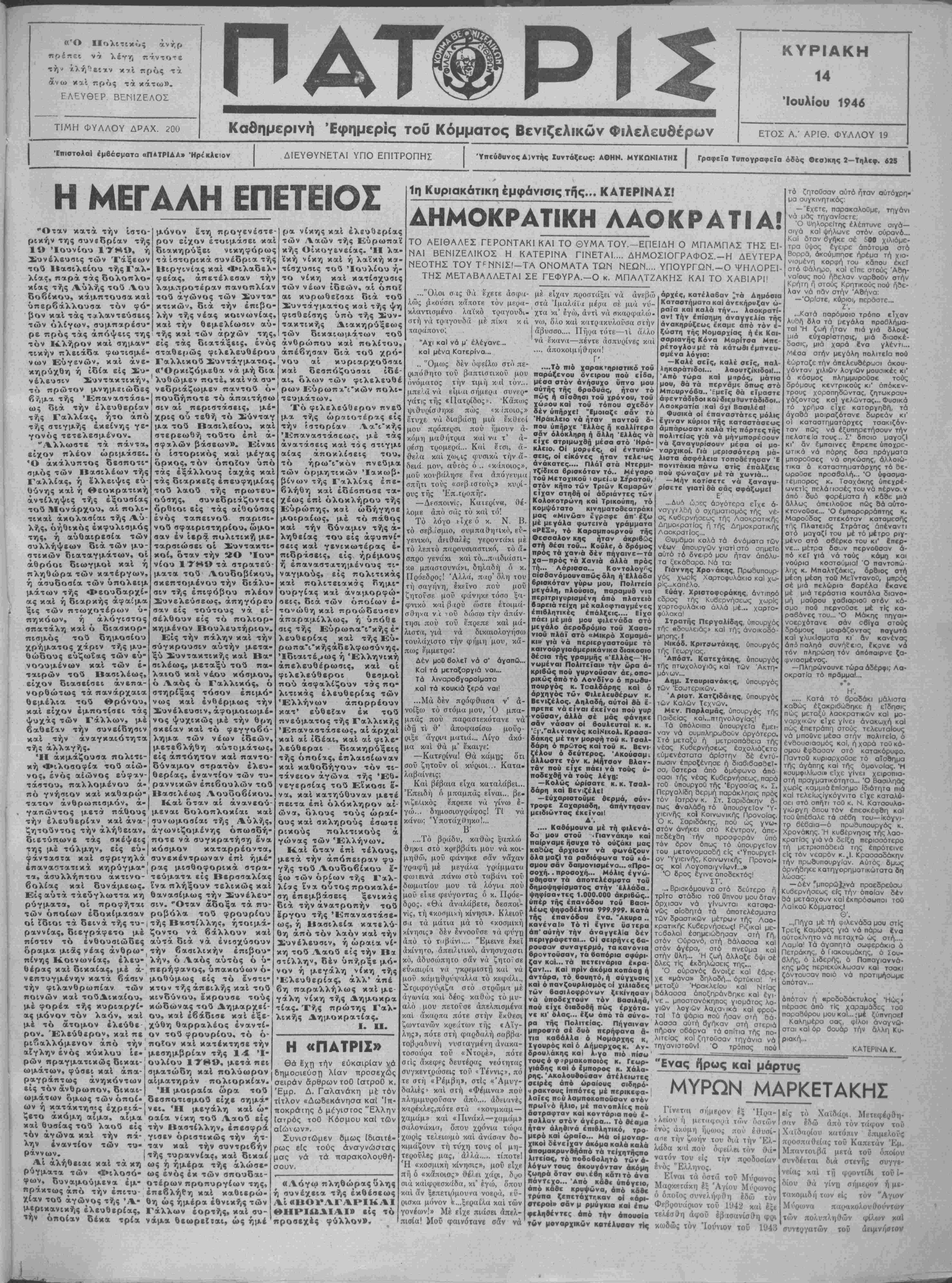 κλειο. Οί μορ<ιές, οί έντυπώ- πρός τα χανιά δέν πήγαινε—τα χά—πρός τα Χανιά άλλά πρός τή... Αάρισσα... Κοντολογής αίσβανόμουναπώςδλη ή'Ελλάδα βρισκόταν γύρω μου, Πολιτεία μεγάλη, πλούσια, παραμυθ νια περιτριγυρισμένη άπό πλατειά βαρεία τείχη μέ καλοφτιαγμένες έπιβλητικές έπάλξεις.... Ειχα πάει μέ μιά μου φιλενάδα στό μεγάλο άεροδρόμιο τού Χασα- νιοϋ πλάϊ στά «Μικρά Χαμαμά- κι» γιά νά περιεργαστούμε τα καινούργιαάμερικάνικα διακοσιο θε σία τής γραμμής «Ελλάς—Η¬ νωμεναι Πολιτειαι» την ωρα α¬ κριβώς πού γυρνοϋσαν άε,. οπο- ρικώς άπό τα Λονδϊνο ό πρωβυ- πουργός κ. Τσαλδάρης καί ό άρχηγός των Φιλελεύθερον κ. Βενιζέλος. Δηλαδή, αύτοι βά έ'- πρεπε νά είναι έκείνοι πού γυρ νούσαν, άλλά σέ μάς φάνηκε σάν νάσαν οί βουλευταί κ. κ. Ί:|·.ΓαΑινιανός καίΝικολ. Κρασα- δάκης μέ την μορφή τού κ. Τσαλ- δάρη ό πρώτος καΐ τού κ. Βενι¬ ζέλου ά δεύτερος. Άκούσαμ. αλλωστε τόν κ. Μήτσον Βλαν- τάν πού είχε πάει νά τούς ύ- ποδεχβή νά τούς λέγη.: —Κολως ώρίσατε κ. κ. Τσαλ- δάρη καί ΒενιζέλεΙ —Εύχαριστοϋμε βερμά, συν- τροφε Ζαχαριάδη, απήντησαν μειδιώντας έκεϊνοιΙ Δ. .... Καβόμουνα μέ τή φιλενά¬ δα μου στοΰ «Γιαννάκη» καί παίρναμε ήσυχα τό οϋζάκι μας καθώς άρχισαν νά φωνάζουν δλα μαζί τα ραδιόφωνα τού κό¬ σμου σαν δαιμονισμένα... «Προ- σοχή.. προσοχή... Μόλις εγνώ¬ σθησαν τα άποτελέσμστα τοϋ δημοψηφίσματος στήν Έλλάδα.. ψηφίσαντες 1.000.000 ακριβώς., υπέρ τής έπανόδου τού Βασι¬ λέως ψηφοδέλτια 999.999. Κατά τής έπανόδου ένα. Άκυρα.. κανένα!» Τό τί εγινε ϋοτερα άπ'αυτήν την άνατγελ1α δεν περιγράφεται... Οί σειρήνιςθα- ρουσαν συναγερμό, τακανονια βροντοϋσαν, τα βαπόρια σφύρι- ζαν καί... τα πετεινάρια έκρα- ζανΐ... Καί πρίν άκόμα κοπάση, ή άντάρα, τό βουητό, ή σύγχυσις καί ό πανζουρλισμός οί χιλΐαδες των βασιλοφρόνων ξεκίνηοαν ι νά ύποδεχτουν τόν Βασιληά,' ποϋ είχε όιαδοβή πώς έρχότα- ν« κι' όλας... έζω άπό τα σύνο- ρα τής Πολιτείας. Πήγαιναν μπροβτα σέ δυό περήφανα α- τια καβάλλα ό Νομαρχης κ, Χγουρός καί ό Δημαρχοςκ. Αν- δρουλάκης καί λ·γο πιό πίσω' τουςό φ^ρμακοποιός κ. Γεωρ¬ γιάδης καί ό ΐμπορος κ. Χάλα- ρης. Άκολουβοϋσαν άτέλειωτες σεΐρές άπό ώραίους σίδηρο¬ ν ρακτους Ιππότες μέ περικβφα- , λαϊες πού λαμποκοποϋσαν ο τόν πρωΐνό ήλιο, μέ πανοπλίες πού άστραφταν καί κοντάρια πού ί- παλλαν στόν άγέρα... Τό οέαμα ήταν άληβινά έπιβλητικό, τρο¬ μερά καί ώραίο... Μά οί μοναρ- χικοί δένείχαν άκόμα καλά καλά απαμακρυνσήάπό τα τείχητήςπο Ε' ώοες άργότερα εΐχε ά- ναγγελδή ό σχηματιομός τής νέ¬ ας Κυβερνήσεως τής Λαοκρατικής Δημοκρατίας ή τής Δημοκρατικής Λαοκρατίος.. Θυμάμαι καλό τα όνόματα των νέων υπουργόν γιατΙ στο σημεΤο αϋτό τα δνειρό μου ήταν άπόλυ- τα ξεκάδαρο. Νά τα: Γιάννης Χρονάκης, Πρωδυπουρ- γός χωρίς Χαρτοφυλάκιο καί χω¬ ρίς...καπέλο. Εύαγ. Χριστοφοράκης, άντιπρό εδρος τής Κυβερνήσεως χωρίς χαρτοφυλάκιο άλλά μέ... χαρτο- φύλακα1 Στρατής Περγαλίδης, ύπουργός τήο «δουλειάς» καί τής άνοικοδό μησης. Ι Νικόδ. Κριτσωτάκης, ύπουργός τής Γεωργίας. Απόστ. Κατεχάκης, ΰπουργός τής πτωχολογιάς καί των Άκτη- μόων... Αημ. Σταυριανάκ-,ς, ύπουργός των Εσωτερικόν. 'Αριοτ. Χατζιδάκης, ύπουργός τώ/ Καλών Τεχνων. Μέν. Παρλαμάς, ύπουργός τής ΠαιδεΙας καΙ...πτηνολογίας| Τα ϋπόλοιπα ΰπουργεΤα έμει¬ ναν νά συμπληρωδοϋν άργότερα. Στό μεταξύ ή μετριοπάθεια τής νέας Κυβερνήσεως έοχολιάζετο εύμενέστατα αρίστην δέ εντύ¬ πωσιν έπροξένησε ή διαβιβασσεΤ- σα, Οστερα άπό όμόφωνο άπό ωασι τής νέας Κυβερνήσεως, παρά τοθ ύπουργοθ τής Εργασίας κ. Σ. Π