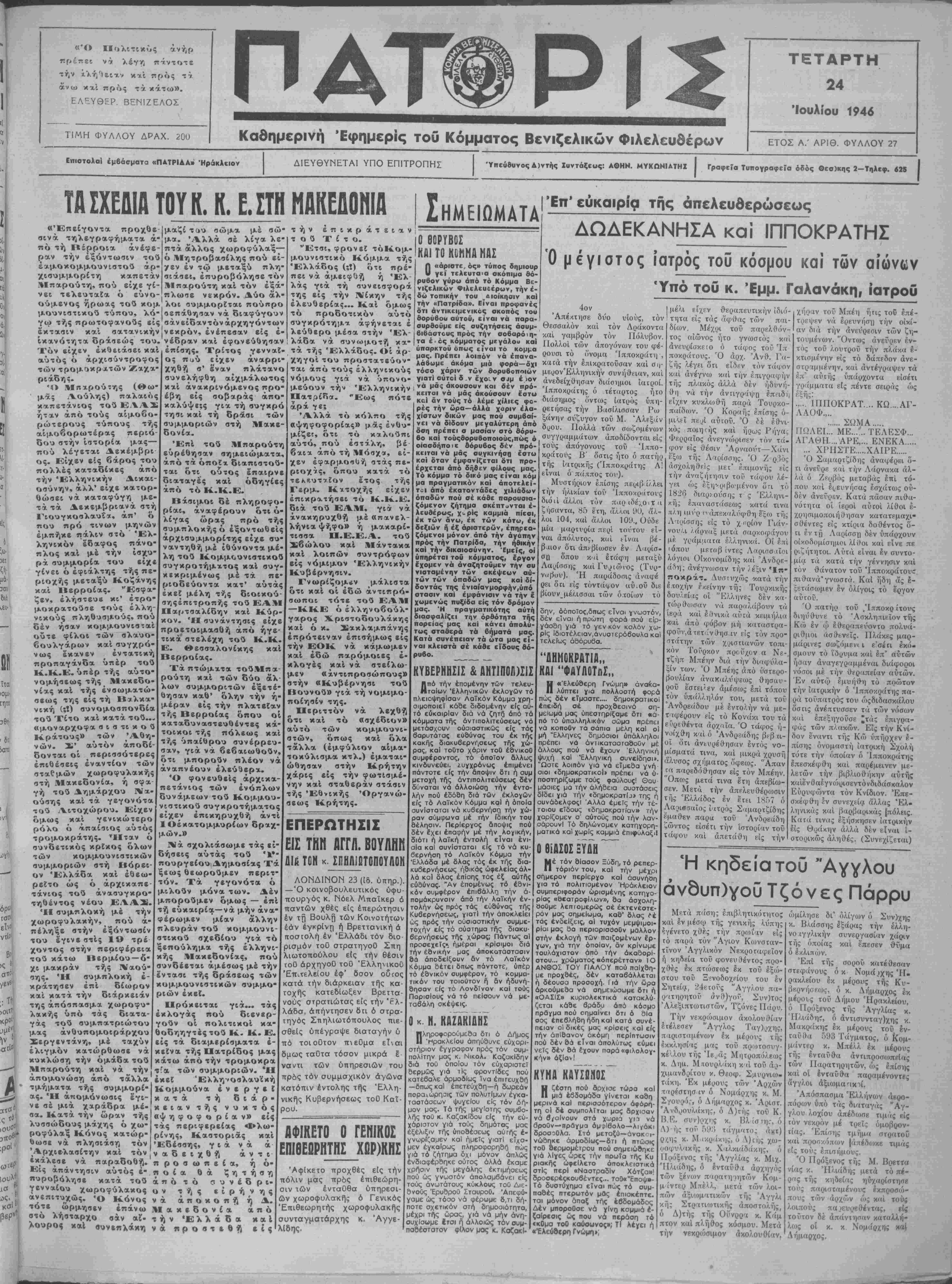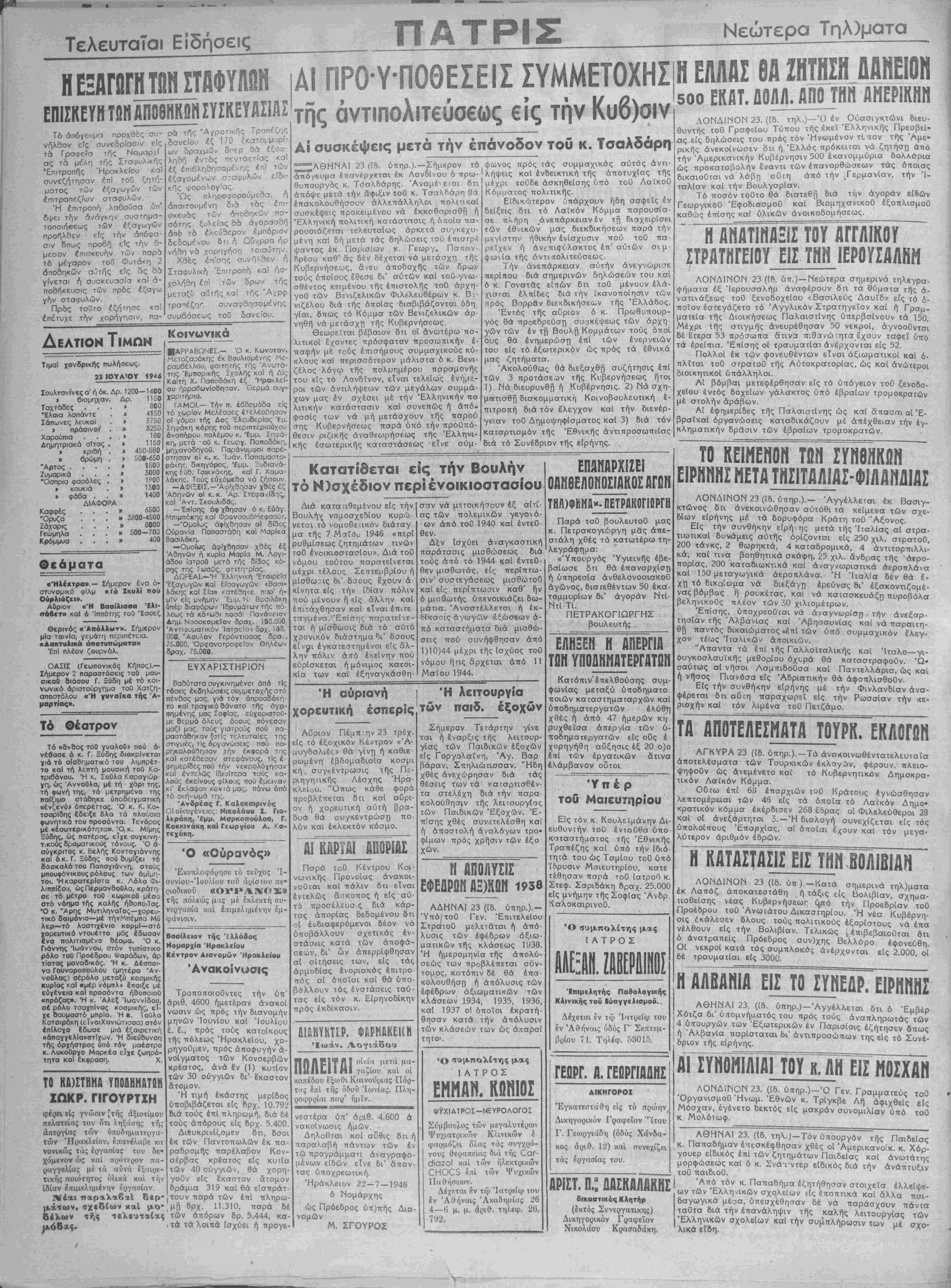 ρά<ης, δικηγάρος, Έμμ. Ξυδιανά- κης £ύδ. Τσικνά<ης, καΐ Γ. Χαμα- ,άκης. Τούς ευχόμεθα νά ζήσουν —ΑΦΙΞΕΙΣ.—Αφίχθησαν χθές έξ Αθηνών οί κ. κ. 'Αρ. ΣτεφανΊδης, καΐ Άντ. Σκουλιδάς. —'Επίσης άφ χθηοαν 6 κ. Εύαγ. Μπιμπόκης καΐ ΦρονσουάΜεφσούτ. —Όμοίως αφίχθησαν αί δίδες ΟύρανΙα Παπαστάδη καΐ Μαρίκα Βασιλάκη. —Ομοίως αφίχθησαν χσές έξ Αθηνών ή κυρΐα Μαρία Μ. Λογι¬ άδου ϊατροθ μετά τής δίδος κό- ΡΓΚ της Τωσώς, φπτητρ1ας. ΔΩΡΕΑΙ.—Ή Έλληνκή Έταιρεία Έξαγωγών καί Είσανωγών «Βασι¬ λάκης καΐ Σία» κατέ8η<ε π-^ρ' η¬ μίν είς μνήμην Έμμ. Ν Βασιλάκη υπέρ διαφόρων Ίδρυμάτωντής πό¬ λεως τα κάτωθι ποοά: Πανάνειον Αημ Νοσοκομείον δραχ. 150.000, "Αντιφυματικον Ιατρείον δρχ. 100. 000, "Ασυλον Γερόντισσας δρα.. 75.000, "Ορφανοτροφείον Θηλέων δραχ. 75.000. ΑΙ ΠΡΟΥΠΟΘΕΣΕΙΣΣΥΜΜΕΤΟΧΗΣ τιϊς αντιπολιτεύσεως είς την Κυβ)σιν Αί συσκέψεις μετά την επάνοδον τού κ. Τσαλδάρη Η ΕΛΛΑΣ 6Α ΖΗΤΗΣΗ ΔΑΝΕΙΟΝ 500 ΕΚΑΤ. ΛΜΕΡΙΚΗΙ1 ΤΟ ΚΑ)ΣΤΗΜΑ ΥΠΟΔΗΜΑΤΩΝ ΣΩΚΡ. ΓΙΓΟΥΡΤΙΗ φέρβι είς γνώσιν 'τής άξιοτίμου πελατείας τού ότι ληξάσης τής άπεργίας των ύποδηματεργα- τών Ηρακλείου, επανέλαβε κη νονικώς τάς εργασίας τού δε¬ χόμενον ώς καί πρότερον πα¬ ραγγελίας μρ τα αύτά έξαιορ- τικής ποιότητος δλικά καί την Ιδίαν Ιπιμελιιμένην εργασίαν. Νέαι παραλαβαί δερ μάτων, σχεδίων καί μο- οέλων τής τελευταίας ΕΥΧΑΡΙΣΤΗΡΙΟΝ Βασύτατα συγκινημένοι άπά τίς τόσες έκδηλώσειςσυμμετοχής στό πένοος μας, γιά τόν άπροσδόκη- το καΐ τραγικό θάνατο τής άγα- πημένης μας Σοφίας, εύχαριστοΰ- με θερμά δλους δοους πόνεσαν μαζΙ μας, τούς γιατρούς πού πα· ραστάθηκαν ζστίς τελευταίες της γμές, τίς όργανώσεις πού πα¬ ρηκολούθησαν την έκφορά της <αΙ κατέδεσαν στεφάνους, τίς έ φημερΐδες πού την νεκρολόγησαν <αί εντελώς Ιδιαιτέρα τούς κα- ,ούς έκείνους φίλους πού έμειναν κι' έκλαψαν κονιά μας, πάνω άπό τό σκήωμά της. Ανδρέας Γ. Καλοκαιρινό^ Οί οίχογένειες Νικόλαον Ζ. Για¬ λεράκη, Έμμ. Μαρκοπουλοσ, Γ. Κοκκινάκη καΐ Γεωργίου Α. Κα- τεχάκη. Ο «Ούρανός» Έκυκλοφόρησε τό τεϋχος Ί- ουνίου-Ίουλίου τού αρίστου πε- .Ηθδικοΰ «ΟΥΡΑΝΙΟΣ» τή; πόλεώς μας μέ εκλεκτή συ- νεργασία καί έπιμελημένην Ρμ- φάνισιν. Βασίλειον τής Ελλάδος Ηομαρχία Ηρακλείου Κέντρον Αιανομών Ηρακλείου Άνακοίνοσις Τροποποιοϋντες την ύπ' αριθ. 4600 ημετέραν άνακοί νωσιν ώς πρός την διανομήν μηνών Ίουνίου καί Ιουλίου έ. ε., πρός τούς κατοίκους τής πόλεως Ηρακλείου, χο- ρηγοθμεν, πρός αποφυγήν ά- νοίγματος των Κονσερβών κρέατος, άνά £ν (1) κυτΐον των 30 ούγγιών δι'- έκαστον άτομον. Ή τιμή έκάστης μερίδος ύποβιβάζεται είς δρχ. 10.792 διά τούς επί πληρωμί), διά δέ τούς απόρους είς δρχ. 5.4ΟΟ ΔιϊυκρινΙζομεν ότι, δσοι έκ των Παντοπωλών έκ πά ραδρομής παρέλαβον Κον σέρβας κρέατος είς κυτΐα των 40 οΰγγιών, θά χορη γοΰν είς έ'καστον άτομον δράμια 319 καί θά είσπράτ τουν παρά των επί πληρω μή δρχ, 11.310, παρά των άπόρων δρ. 5.444, κα τα τα λοιπά Ισχύει ή προγε .^ΑΘΗΝΑΙ 23 (ίδ. ύπηρ.).—Σήμερον τό άπόγευμα έπσνέρχεται έκ Λονέίνου ό πρω- θυπουργός κ. Τσαλδάρης. Άναμέ^εται δτι άπόψε μετά την άφιξιν τοθ κ. ΤσαλΒάρη θά έπακολουθήσουν άλλεπάλληλοι πολιτικαί συσκέψεις προκειμένου νά έκκοθσρισθή ή Έλληνική πολιτική κατάστασις ή ό ποία πα- ρουσιάζεται τελευταίως άρκετά συγκεχυ- μένη καί δή μετά τάς δηλώσεις τοθ έπιστρέ ψαντος έκ Παρισίων κ. Γεωργ. Παπαν¬ δρέου καθ" άς δέν δέχεται νά μετάσχη τής Κυβερνήσεως, άνευ άποδσχής των δρων τοϋς όποίους έθεσε δι' αυτών καΐ τού γνω- σθέντος κειμένου τής επιστολάς τοθ άρνη- γοΟ των Βενιζελικήν Φιλελευθέρων κ. Β;- νιζ