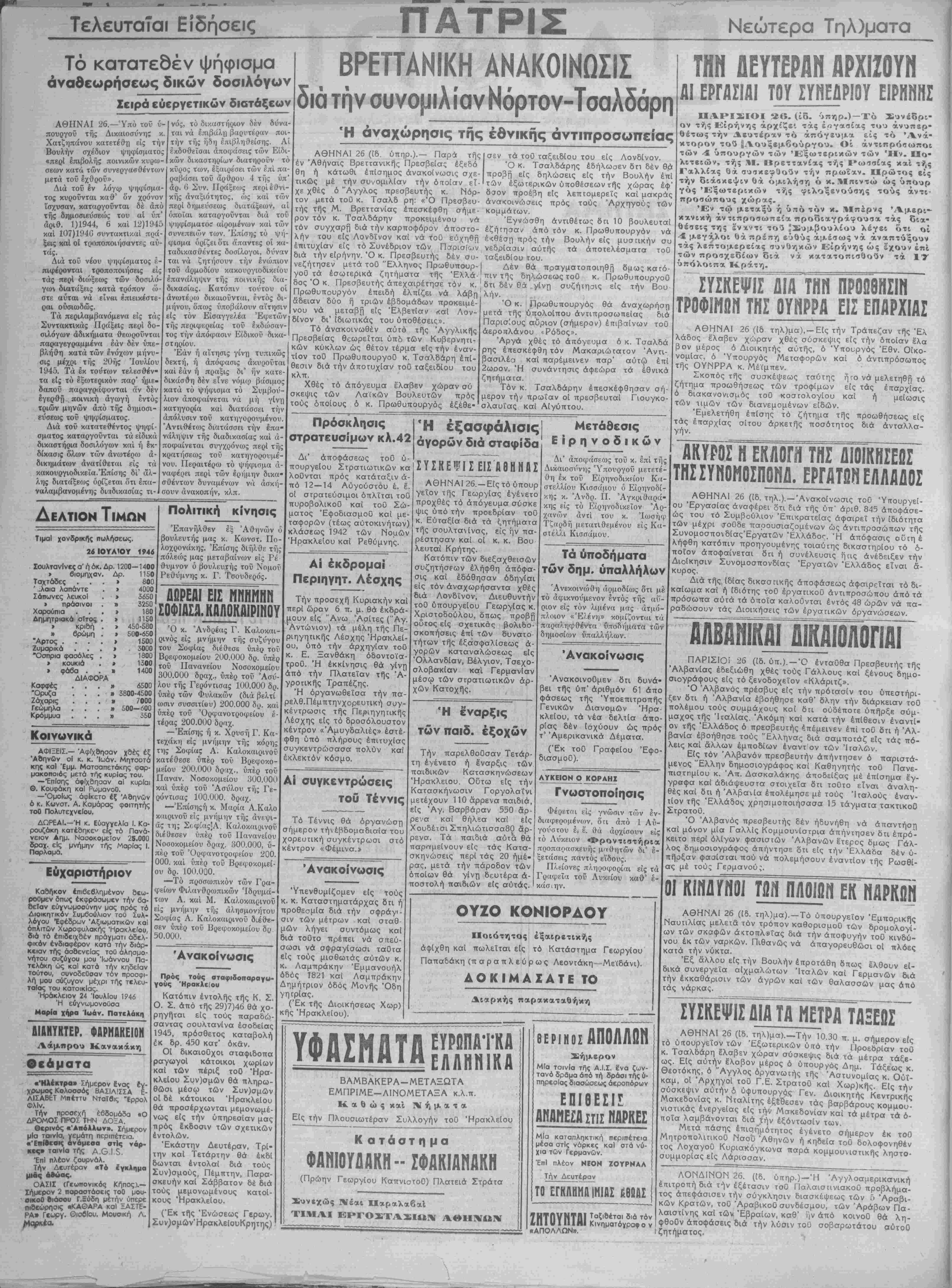 ΣυνομοσπονδίαςΈργατών Έλλάδο< Ή απόφασις οϋτη έ ληφθή κατόπιν προηγουμένης τοιαύτης δικαστηρίου τό ο¬ ποίον άποφαίνεται δτι ή συνέλευσις ήας άνέδειξεν την Διοίκησιν ΣυνομοσπονδΙας Έργατών Ελλάδος είναι ά- κυρος. ς ής ειξεν την Έργατών Ελλάδος είναι ά- Διά τής, Ιδίας δικασακής αποφάσεως άφαιρεΐται τό δι- καίωμα καί ή Ιδιότης τοϋ έργατικοθ άντιπροσώπου άπό τα πρόσωπα αύτά τα όηοΐα καλοΰνται έντάς 48 ώρών νά ραδώσουν τάς Διοικήσεις των έργατικών όργαν πα- ώσεων. Αί συγκεντρώσεις τού Τέννις Τό Τέννις θά όργανώστ) σήμερον τήνέβδομαδιαία τού χορευτική συγκέντρωσι στό κέντρον «Φέμινα.» 'Ανακοίνωσις Πρός τούς σταφιδοπαρανυ- γούς Ηρακλείου Κατόπιν έντολής τής Κ. Σ. Ο. Σ. άπό τής 29)7)46 θά χο- ρηγήται είς τούς παραδώ- σανχας σουλτανίνα εσοδείας '945, πρόσθετος καταβολή κ δρ. 450 κατ' οκάν. ΟΙ δικαιοϋχοι σταψιδοπα αγωγοί κάτοικοι χωρίων «αί τών πέριξ τοθ Ήρα- <λείου Συν)σμών θά πληρω- θώσι μέσφ τών Συν)σμών οί δέ κάτοικοι Ηρακλείου θά προσέρχωνται μεμονωμέ- νως είς την υπηρεσίαν μας ιρός έκδοσιν τών σχετικών ντολών. Έκαστην Δευτέραν, Τρί- ην καί Τετάρτην θά έκδΐ ωνται έντολαί διά τούς Συν)σμοΰς, Πέμπτην, Παρα- ίκευήν καΐ Σάββατον δέ διά ούς μεμονωμένους κατοί- ους Ηρακλείου. (Έκ τής Ενώσεως Γερωγ. Συν)σμώνΉρακλε(ουΚρητης) Ανακοίνωσις εΥπενθυμΙζομεν είς τούς κ. κ. Καταστηματάρχας δτι ή προθεσμία διά την σφράγ'- σιν των μέτρων καί σταθ μών λήγει συντόμως καί διά τουτο πρέπει νά σηεύ- σωσι νά σφραγίσωσι ταυτα είς τούς μισθωτάς αυτών κ. κ. Λαμπράκην Εμμανουήλ όδός 1821 καί Λαμπράκην Δημήτριον όδός Μονής Όδη γητρίας. (Έκ τής Διοικήσεως Χωρ) κης Ηρακλείου). Ή έναρξις των παιδ. έξοχών Την παρελθοθσαν Τετάρ- τη εγένετο ή έναρξις των παιδικών Κστασκηνώσεων Ηρακλείου Ούτω είς την Κατασκήνωσιν Γοργολαίνι μετέχουν 110 άρρενα παιδία, είς Αγ. Βαρβάραν 550 άρ¬ ρενα καί θήλεα καί είς Χουδέτσι ΣπηλιώτισσαθΟ άρ- ρενσ. Τα παιδία αύτα θά παραμείνουν είς τάς Κατα- σκηνώσεις περί τάς 20 ήμέ- ραο, μετά την πάροδον των οποίων θά γίνη δευτέρα ά- ποστολή παιδιών είς αύτάς. Ανακοίνωσις ΆνακοινοΟμεν δτι δυνά- βει τής ύπ' αριθμόν 61 άπο φάσεως τής Ύποεπιτροπής Γενικών Διανομών Ήρα κλείου, τα νέα δελτία άπο- ρίας δέν ίσχΰουν ώς πρός τ' Άμερικανικά Δέματα. (Έκ τοθ Γραφείου Έφο- διασμοθ). ΛΥΚΕΙΟΝ Ο ΚΟΡΑΗΣ Γνωστοποίησις Φέρεται είς γνώσιν τω )ν εν ρ ς γ των ^, διαφερομένων, ότι άπό 1 Αύ- γούστου Ι. έ. θά άρχίσουν ύζ ό Λ 4^ροντιστήρια ής μαθητών δι' έ τό Λυκειον «ροπαρασκευής μαθητών δι' έ- ξετάσεις παντός εί'δους. Πλείονες πληροφορίαι είς τα Γραφεΐα τοϋ Λυκείου καθ' ' ε- ΟΥΖΟ ΚΟΝΙΟΡΑΟΥ Ποιότητος έξαιρετικής "*'ν' αφιχθη καί πωλεΐται είς τό Κατάστημα Γεωργίου Παπαδάκη (παραπλεύρως Λεοντάκη—Μείδάνι). ΔΟΚΙΜΑΣΑΤΕ ΤΟ ——————————————————————————————————μ-—. * Διαρκής παρακαταθήκη - · · ΠΑΡΙΣΙΟΙ 26 (ίδ. ύπ.) —Ό ενταύθα Πρεσβευτής τής Άλβανίας έδεξιώθη χθές τούς Γάλλους καΐ ξένους δημο- σιογράφους είς τό ξενοδοχείον «Κλάριτζ». Ό Άλβανός πρέσβυς είς την πρότασιν τού ύπεστήρι- ξεν ότι ή Άλβανία έβοήθησε καθ' δλην την διάρκειαν τοθ πολέμου τούς συμμάχους κοί δτι ουδέποτε υπήρξε σύμ- μαχος τής Ιταλίας. Άκόμη καί κατά την επίθεσιν εναντί¬ ον τής Ελλάδος ό πρεσβευιής *.πέμεινεν επί τού δτι ή Άλ¬ βανία έβοήθησε τούς "Ελληνας διά σαμποτόζ είς τάς πό¬ λεις καΐ άλλων έμποδίων έναντ όν των Ίταλών. Είς τόν Αλβανόν πρεσβευτήν απήντησεν ό παριστά- μενος "Ελλην δημοσιογράψος καΐ Καθηγητής τοθ Πανε¬ πιστημίου κ. Άπ. Δασκαλ