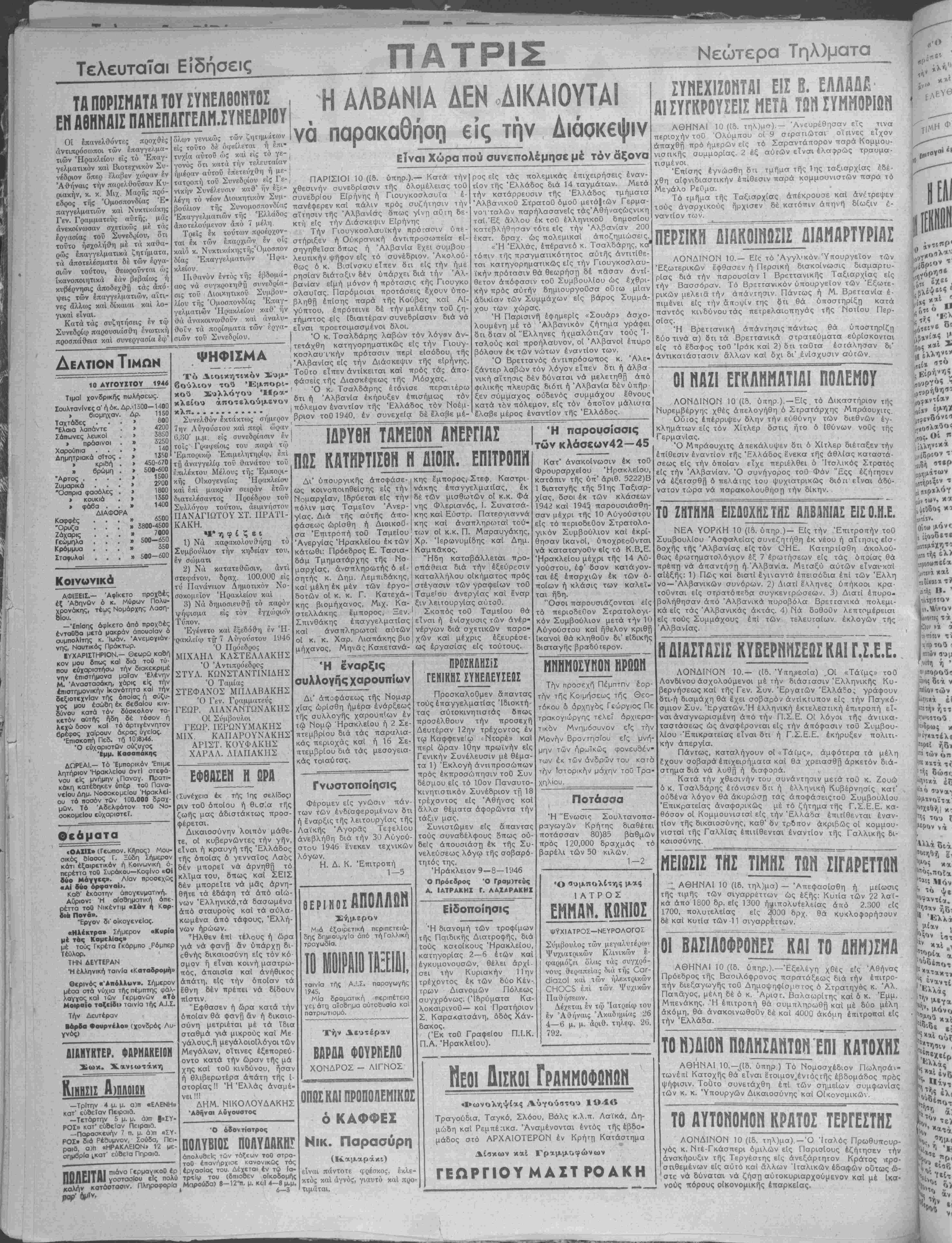 <(ας, δσοι έκ των κλάσεων 942 καί 1945 παρουσιάσθη¬ σαν μέχρι τής 10 Αύγούστου =ίς τό περιοδεΰον Στρατολο¬ γικόν Συμβούλιον καί έκρί- θησαν ίκανοί, ύποχρεοθνται νά καταταγοθν είς τό Κ.Β.Ε. Ηρακλείου μέχρι τής 14 Αύ¬ γούστου, έφ' όσον κατάνον- ται έξ έπαρχιών έκ των ο¬ ποίων ή κλάσις των καλεί¬ ται ήδη. 'Όσοι παρουσιάζονται είς τό περιοδεΰον Στρατολογι¬ κόν Συμβουλιον μετά την 10 Αύγούστου καΐ ήθελον κριθή ίκανο'ι θά κληθοϋν δι" είδικής διαταγάς βραδύτερον. ΠΡΑ θεαματα ρ ο «ΟΑΙΙΖ» (Γεωπο)._Κήπος) Μου- οικος δΐασος Γ. Ξύδη Σήμερον κάτι εξαιρετικόν ή Κοινωνική ό- περέττα τοϋ Συράκου—Κοφίνο «ΟΙ δύο Μογγες». Λίαν προσεχώς «ΑΙ δύο ©ρφαναΐ». Καθ' εκάστην άπογευματινή. Αύριον: Ή αίσθηματική όπε- ιέττα τοθ Νικέντιμ «Ιάν ή Χαρ- ίιά Πονά». "Εργον δΓ οικογενείας. «Ηλέκτρα» Σήμερον «Κυρία μέ τος ΚαμκλΙας» μέ τούς Γκρέτα Γκάρμπο ,Ρόμπερ Τέθλορ. ΤΗΝ ΔΕΥΤΕΡΑΝ Ή έλληνική ταινΐα «Καταδρομή» θερινός «Άηόλλυν». Σήμερον μέοα στά νύχια τήςπέμπτης φάλ- λαγγοςκα) ι ών Γερμανών «Τό Μοιραιο ταξείδι» ταινΐα τής Α.Ι.Σ. Την Δευτέραν ■ααδα Φουρνέλο» (χονδρός Λυ- γνός) ΔΙΑΗΥΚΤΕΡ. ΦΑΡΜΑΚΕΙΟΝ Σωκ. Χανιωτάκη Κινησισ Α)πλοιων —Τρίτην 4 μ. μ. α)π «ΕΛΕΝΗ» κατ' ευθείαν Πειραια. —Τετάρτην 5 μ. μ. ά)π |«ΣΥ- ΡΟΣ» κατ' ευθείαν Πειραια. —Παρασκευήν 7 π. μ. ά)π «ΙΥ- ΡΟΣ» διά Ρέθυμνον, Σούδα, Πει- ροια, α)π «ΗΡΑΚΛΕΙΟΝ» 12 με- οημβρΐα ΐκατ' εϋθετα Πηραια. (Συνέχεια έκ τής 1ης σελΐδος) ριν τοθ όποΐου ή θι,σΐα της ζωής μας άδιστάκτως προσ- φέρεται. Δικαιοσύνην λοιπόν μάθε- τε, οί κυβερνώντες την γήν, είναι ή κραυγή τής Ελλάδος τής οποίας ό γενναΐος Λαός δέν μπορεΐ νά αρνηθή τό κλΐμα τού, δπως καί ΣΕ1Σ δέν μπορεΐτε νά μάς άρνη- θήτε τα έδάφη τα άπό αΐώ- νων ΈλληνιΚά,τά δασωμένα άπό σταυρούς καί τα αύλα- κωμένα άπό τάψους, Έλλή- νον ήρώων. "Ήλθεν επί τέλους ή ώρα γιά νά φανή άν υπάρχη δι- εθνής δικαιοσύνη είς τόν κό σμόν ή είναι κοινή μαστρω- πός, άπαισΐα καί άνήθικος άπάτη, είς την οποίαν τα εθνη δέν πρέπει νά δίδουν Η έναρξις συλλογής χαρουπίων Δι' αποφάσεως τής Νομαρ χίας ωρίσθη ήμέρα ενάρξεως τής συλλογής χαρουηΐων έν τώ Νομώ Ηρακλείου ή 2 Σε- πτεμβρίου διά τάς παραλια- κάς περιοχάς καί ή 16 Σε- πτεμβρίου διά τάς μεσογεια- κάς τοιαύτας. Γνοστοποίηαις Φέρομεν είς γνώσιν πάν¬ των τθν ενδιαφερομένων δτι ή έναρξις τής λειτουργίας τής Λαίκής Άγορας Τε^ελίου ανεβλήθη διά την 30 Αύγού¬ στου 1946 ένεκεν τεχνικών λόγων. Η. Δ. Κ. Έπιτροπή 1—5 Εφθασεν ή ώρα κατά την οποίαν θά φανή άν ή δικαιο¬ σύνη μετριέται μέ τα ιδία σταθμά γιά μικροϋς καί Με γάλους,ή μεγάλοιοίλόγοι των Μεγάλων, οΐτινες έξεπορεύ- οντο κατά την ώραν τής μά χης καί τοθ κινδύνου, ήσαν ή θλιβερωτέρα άπάτη τής ί- στορΐαςϋ Ή Ελλάς άναμέ- νειΙΙ! ΔΗΜ. Ν1ΚΟΛΟΥΔΑΚΗΣ Αθήναι Αύγουστος πιάνο έρ Ό όδοντίατρος ΠΟΑΥΒΙΟΕ ΠΟΑΥΔΑΚΗ! άπολυθεΐς των τάξεων τοθ στρα- τοθ έπανήρχισε κανονικώς τάς εί Δέχεται έν τφ Ια- ΑΠΟΛΑΒΗ ΘΕΡΙΝΟΣ Σήμερον Μιά έξαιρετική περιπετειώ- δης δημιουργΐα άπό τήΓαλλική τραγωδία. ταινΐα τής Α.'.Σ. παραγωγής 1?45. Μΐα δραματική περιπέτεια γεμ άτιτι αϊοθημα αϋτοδυσία και πατριωτιομό. Την Δευτέραν ΒΑΡΔΑ ΦΟΐΡιΊΕΛΟ ΧΟΝΔΡΟΣ — Λ1ΓΝΟΣ ΠΡΟΣΚΛΗΣΙΣ ΓΕΝΙΚΗΣ ΣΥΝΕΛΕΥΣΕΩΣ Προσκαλοθμεν άπαντας τούς έπαγγελματίας Ιδιοκτή¬ τας αύτοκινηΐιστάς δττως προσέλθουν την προσέχη Δευτέραν 12ην τρέχοντος έν τω Καφφενείω «Ντορέ» καί περί ώραν ΙΟην πρωϊνήν είς Γενικήν Συνέλευσιν μέ θέμα- τα 1) Έκλογή άντΐπροσώπων πρός έκπροσώπησιν τοθ Συν δέσμου είς τό ΙΟον Παναυτο- κινητιστικόν Συνέδριον τή 18 τρέχοντο
