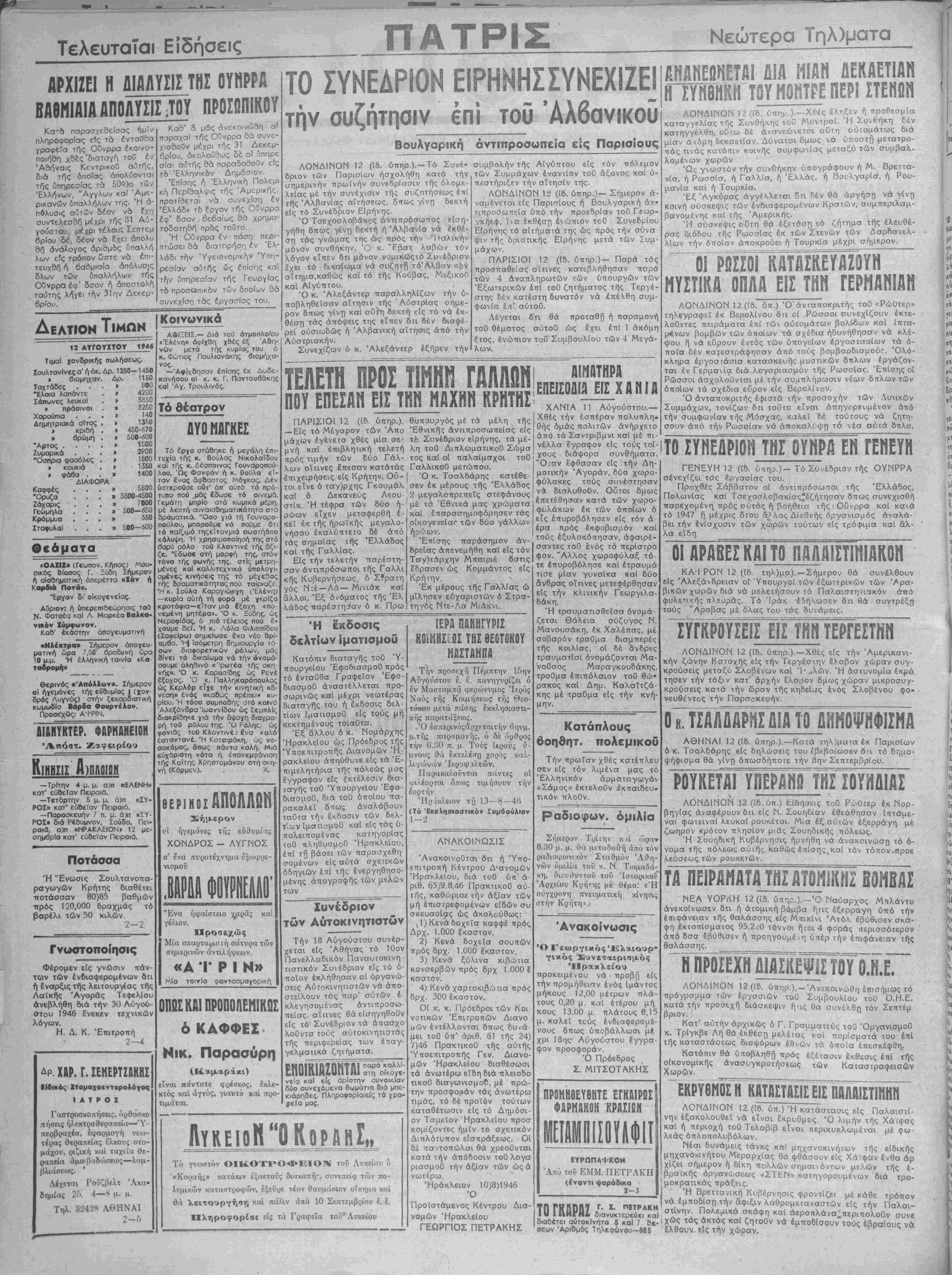 λρμικών κ«τ«στρο<ρών, έξενρε νέον θαυμάσιον οίκημα καί θά λειτουργήση καί πάλιν άπό 10 Σεπτεμβοίου έ, έ. Πληροφορίαι είς τα Γραφεΐα τοΰ* Λυκείου ΙΕΡΔ ΠΑΝΗΓΥΡΙΣ ΚΟΙΜΗΣΙΣ ΤΗΣ ΘΕΟΤΟΚΟΥ ΜΰΣΤΑΜΠΑ Την προσέχη Πέμπτην 15ην Αύγουστου έ. έ πανηγυρίζει ό έν Μασταμπά φερώνυμος Ίερος Ναός τής Κοιμήσεως τής Θεο¬ τόκου μετά πάσης εκκλησιαστι- κης παρατάξεως. Ό έσπερινόςάρχεταιτήν Οηνμ. μ.τής παραμονής, ό δέ ό'ρθρος την 6.;;0 π. μ Τούς ίερούς δ- μνους θά εκτελέση χορος καλ- λό Ίλ Παρακαλοϋνται πιίντες οί ψιλέορτοι δπως τιμήσουν την εορτήν. Ήρ ίκλειον τ?ί 13—8—4(5 (Τό Εκκλησιαστικήν Συμβούλιον 1—2 ΑΝΑΚΟΙΝΩΣΙΣ Ανακοινούται δτι ή 'Υπο- επιτροπή Κέντρου Δ'ανομών Ηρακλείου, διά τοθ ΰπ' ά ριθ. 65)9.8.46 ΠρακπκοΟ αυ¬ τής, καθώρισε την αξίαν των μή έπιστρεφομένων είδών συ σκευαοΐας ώς ακολούθως: ,1) Κενάδοχεΐα καφφέ πρός Δρχ, 1.000 έκαστον. 2) Κενά δοχεΐα σουτΐών πρός δρχ. 1.000 έκαστον, 3) Κενά ξύλινα κιβώτια κονσερβών πρός δρχ 1.000 ϊ καστον. 4) Κενά χαρτοκιβώτια πρός δρχ. 300 έκαστον. Οί κ. κ. Πρόεδροι των Κοι νοτικών Επιτροπών Διανο ιαών έντέλλονται δπως δυνά¬ μει τοθ ύπ' αριθ. 61 τής 24) 7)46 Πρακτικοΰ τής αυτής Ύποεττιτροπης Γεν. Διανο- μών Ηρακλείου διαθέσωσι τα ανωτέρω εϊδη διά πλειοδο τικοθ διαγωνισμοθ, μέ πρώ¬ την προσψοράν τάς ανωτέρω τιμάς, τό δέ προϊόν τούτων καταθέτωσιν είς τό Δημόσι¬ ον Ταμείον "Ηρακλείου προσ κομίζοντες ημίν το σχετικόν Διπλότυπον είσπράξεως. Οί δέ παντοπώλαι θά χρεοΰνται κατά την απόδοσιν τοθ λογα ριασμοθ την αξίαν των ώς ά νωτέρω. Ηράκλειον 10)8)1946 Ό Προίστάμενος Κέντρου Δια- νομών Ηρακλείου ΓΕΩΡΓΙΟΣ ΠΕΤΡΑΚΗΣ ΑΙΜΑΤΗΡΑ ΕΠΕΙΣΟΰΙϋ ΕΙΣ ΧΑΝΙΑ ΧΑΝΙΑ 11 Αύγούστου.— Χθές την εσπέραν πολυπλη- θής ομάς πολιτών άνήρχετο άττό τό Σαντριβμνΐ καί μέ πι- νέλλα έγραφον είς τοΰς τοΐ- χους διάφορα συνθήματα. "Ο:αν έφθασαν είς την Δη¬ μοτικήν Αγοράν, δύο χωρο- φύλακες τοΰς συνέστησαν νά διαλυθοθν. Ούτοι δμως επετεθησαν κατά των χωρο- φυλάκων έκ των οποίων ό εΐς έπυροβόλησεν είς τόν ά έρα πρός εκφοβισμόν καί τούς έξυλοκόπησαν, άφαιρέ- σαντες τοθ ενός τό περίστρο φόν. 'Άλλος χωροφύλαξ τό τε έπυροβόλησε καί έτραυμά τισε μίαν γυναΐκα καί δύο άνδρας οΐτινες μετεφέρθησαν είς την κλινικήν Γεωργιλα- δάκη. Ή τραυμαπσθεΐσα όνομά- ζεται Θάλεια σύζυγος Ν. Μανουσάκη, έκ Χαλέπας, μέ σοβαρόν τραϋμα διαμπερές τής κοιλΐας, οί δέ άνδρες τραυματίσι όνομάζονται Μα- νοθσος Μαραγκουδάκης, τροθμα έπιπόλαιον τοθ θώ· ρακος καί Δημ. Καλαϊτζά¬ κης μέ τραθμα είς την κνή- μην. Κατάπλους βοηθητ. πολεμικοϋ Την πρωΐαν χθές καΐέπλευ σεν είς τόν λιμένα μας τό Ελληνικόν άρματαγωγόν «Σάμος» έκτελοΰν έκπαιδευ- τικόν πλοθν. Ραδιοφων. όμιλία Σήμερον Τρίτην κ ά ώρίϊ·» 8.30 μ. μ. ί)·ά [ΐεταδοθ-ή άπό τόν ραδιοφωνικόν Σταθμόν Αθη¬ νών όμιλία τοϋ κ. Ν Τωμαδά- κη, διευθυντού τού Ίστορικοί Άρχείου Κρήτης μέ θέμα: «Ή σύγχρονη πνευματική κίνησις στήν Κρήτη». Ανακοίνωσις Ό ΓεωργΐΜΟςΈλαιουρ· γικός Συνεταιρισμός Ηρακλείου προκειμένου νά ττροβή είς την προμήθειαν ενός Ιμάντος μήκους 12,00 μέτρων πλά- τους 0,20 μ, καί ετέρου μή κους 13.00 μ. πλάτους θ,15 μ. καλεΐ τούς ενδιαφερομέ¬ νους δπως υποβάλλωσι μέ χρι 18ης Αϋγούστου έ'γγρα φόν προσφοράν. Ό Πρόεδρος Σ. ΜΙΤΣΟΤΑΚΗΣ ΠΡΟΜΗΘΕΥΘΗΤΕ ΕΓΚΑΙΡΩΣ ΕΥΡΩΠΑΙ'ΚΟΗ Άπό τοϋ ΕΜΜ. ΠΕΤΡΑΚΗ (έναντι ψαράδικα 2-3 ΑΗΔπΈΩΝΕΤΑΙ ΔΙΑ ΜΙΑΝ ΔΕΚΑΕΤΙΑΝ Η1ΓΗ8ΗΚΗ ΤΟΥ ΜΟΗΤΡΕ ΠΕΡΙΣΤΕΗΩΝ ΛΟΝΔΙΝΟΝ 12 (ίδ. ύπημ ). —Χθές έληξεν ή προθεσμία καταγγελΐας τής Συνθήκης τοϋ Μοντρσί. Ή Συνθήκη δέν κατηγγέλθη, ούτω δέ άνανεώνετσι αυτή ούτομάτως διά 