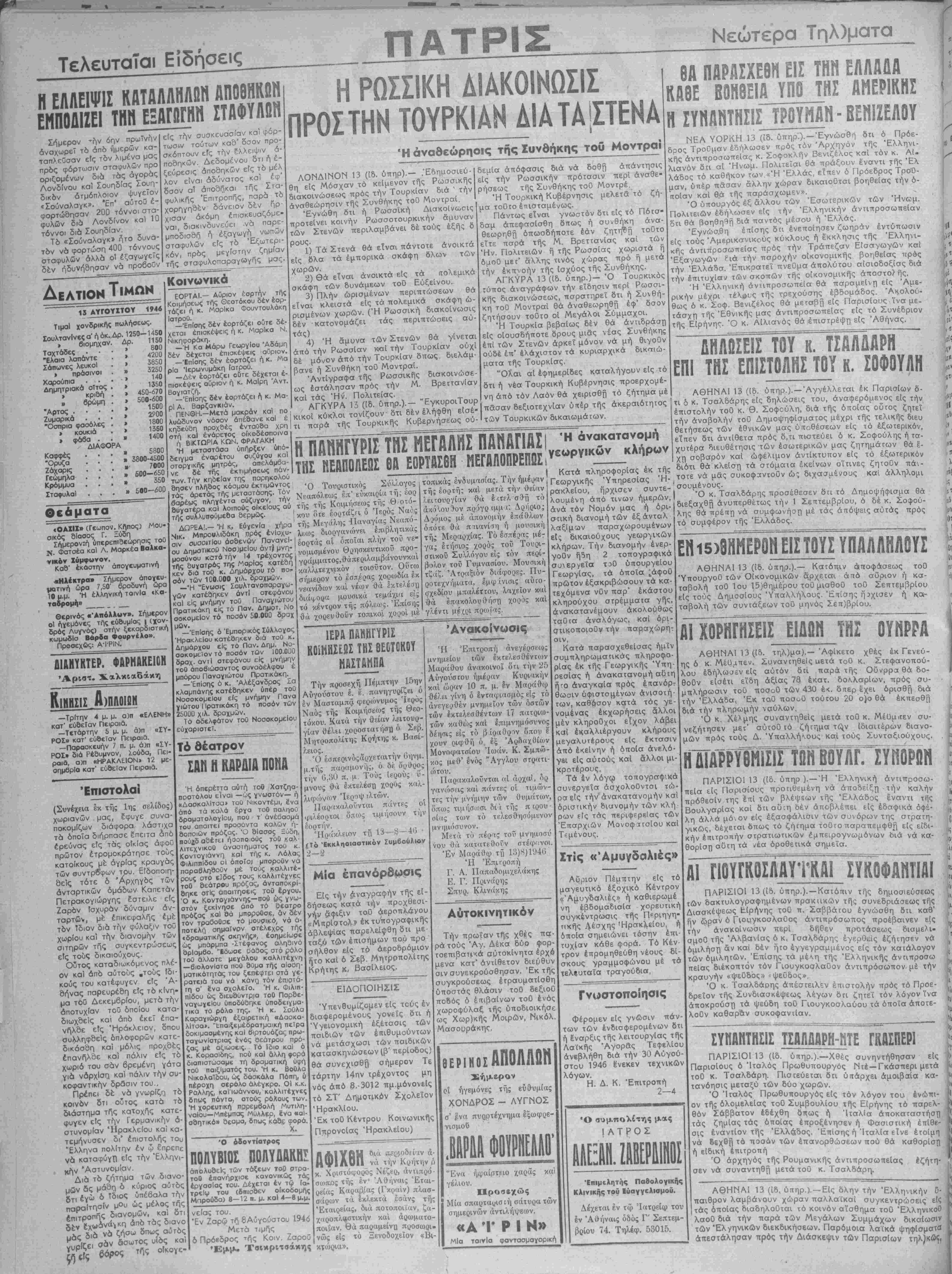κραυγήν «ψεύδος» < ψεθδος». Ό κ Τσαλδάρης απέστειλεν επιστολήν πρός τό Προε¬ δρείον τής Συνδιασκέψεως λέγων δτι ζητεί τόν λόγον ίνα αποκρούση τα ψευδη τοϋ Γιουγκοσλαύου τα όποία άποτε- λοϋν καθαράν συκοφ«*ιτ(π/ ■Ο συμπολίτης μας Ι ΑΤΡΟΣ Επιμελητάς Παδολογικής Κλινικής τού Εϋαγγελισμοϋ. Δέχεται έν τώ Ίατρείφ τού έν Αθήναις όδός Γ' Σεπτεμ- βρίου 74. Τηλέφ. 53015. ΠΑΡΙΣΙΟΙ 13 (Ιδ. ΰπηρ.).—Χθές συνηντήθησαν είς Ί' Παρισίους δ "Ιταλός Πρωθυπουργός Ντέ—Γκάσπερι μετά |1ι τοΟ κ. Τσαλδάρη. Πιστεύεται ΰτι ύπάρχει άμοιβαία κα- *ι τανόησις μεταξύ των δύο χωρών. " Ό Ιταλός Πρωθυπουργός είς τόν λόγον τού ένώπι- Ι όν τής δλομελείας τοΟ ΣυμβουλΙου τής Είρήνης τό παρελ- 'ΐ θόν Σάββατον εδέχθη όπως ή "Ιταλία αποκαταστήση ' τάς ζημίας τάς οποίας έπροξένησεν ή Φασιστική έπίθε- Ί σ·ς εναντίον τής Έλλά,δος, ΈπΙσης ή Ιταλία είνε ετοίμη νά δεχθή τό ποσόν των έπανορθώσεων πού θά καθορίση £ ή είδική έπιτροπή Ό άρχηγός σεν νά συναν >υιιΐ|