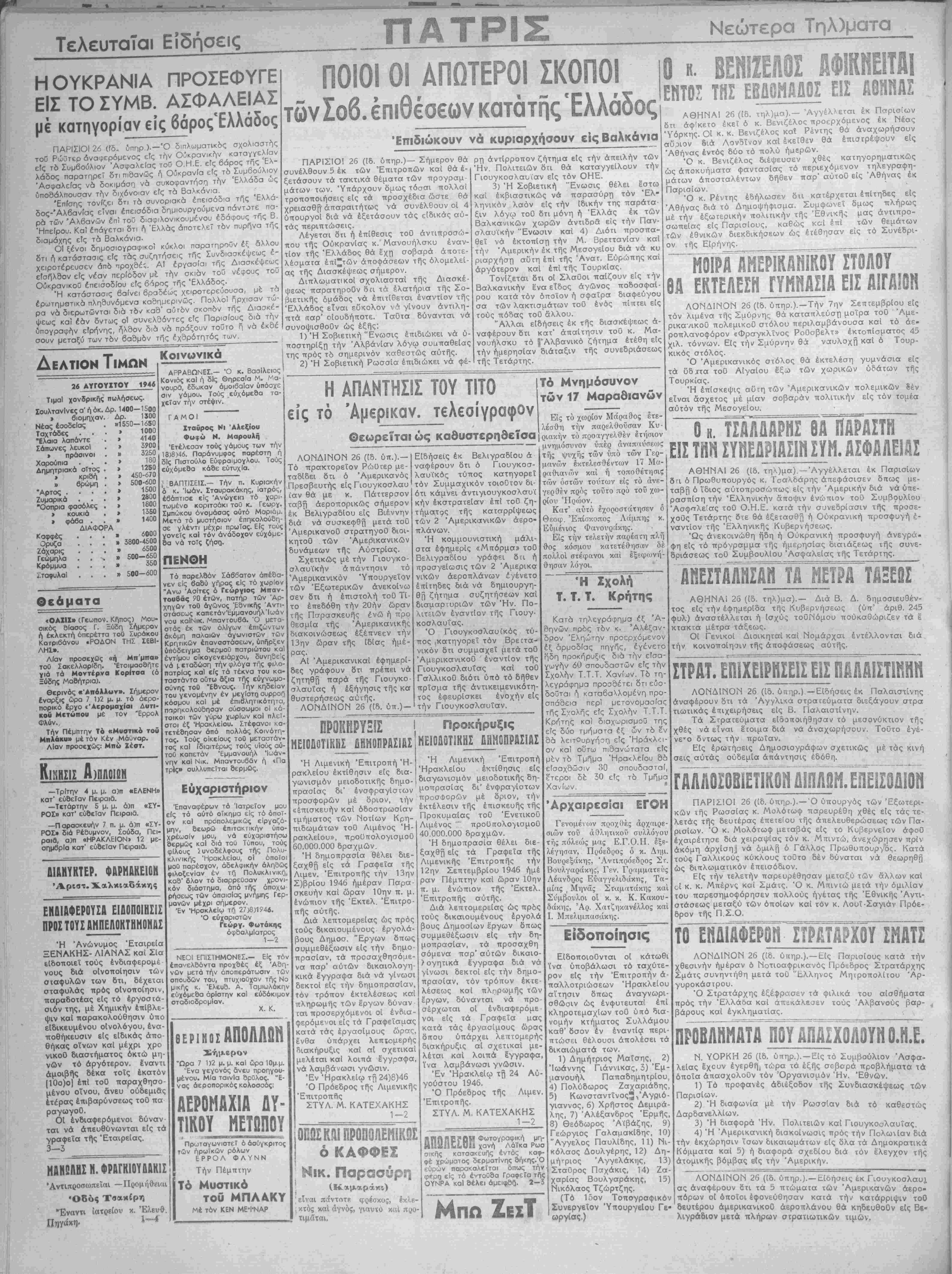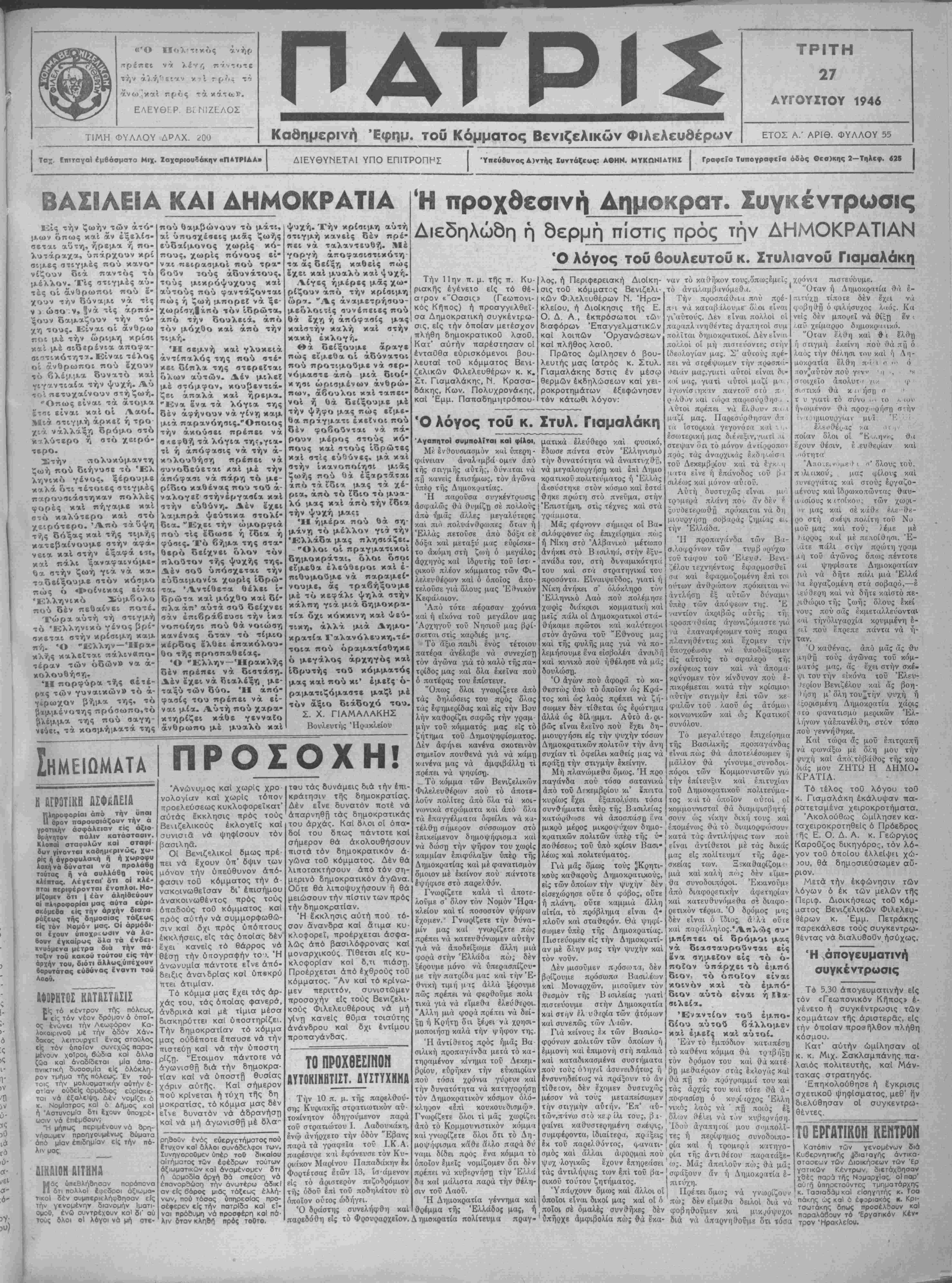 'ΐίν<.)'καΙ πρός τα κάτα». ΕΛΕΥΘΠΡ. βί.Μ!ΖΕ:ΛΟΣ ΤΙΜΗ ΦΥΛΛΟΥ ΔΡΛΧ. 200 ΠΑΤ Καδημερινή Έφημ. τού Κόμματος Βενιζελικών Φιλελεύθερον ΤΡΙΤΗ 27 ΑΥΓΟΥΣΤΟΥ 1946 ΕΤΟΣ Α.' ΑΡΙΘ. ΦΥΛΛΟΥ 55 Ταχ. Επιταγα) έμβασματα Μιχ. Ζαχαριουδάκη ν «Π ΑΤΡΙΑ Α» ΔΙΕΥΘΥΝΕΤΑΙ ΥΠΟ ΕΠΙΤΡΟΠΗΣ ΎπεύουνοςΑ)ντής Συντάξεως: ΑΘΗΝ. ΜΥΚαΝΙΑΤΗΧ Γραφεΐα Τυπογραφεΐα όδός θεο)κης 2—Τηλεφ. 625 ΒΑΣΙΛΕΙΑ ΚΑΙ ΔΗΜΟΚΡΑΤΙΑ Είς την ζωήν των άτό- μων όπως καί άν έξελίσ- σεται αυτή, ήρεμα ή' πό- λυτάραχα, ύπάρχουν κρί σιμες στιγμές πού κανο- νίζουν διά παντός τό μέλλον. Τίς στιγμές αύ- τές οί άνθρωποΐ πού ε- χούν την δύναμι ν ά. τίς ν > ώβο ν, Ινα τίς άρπά-