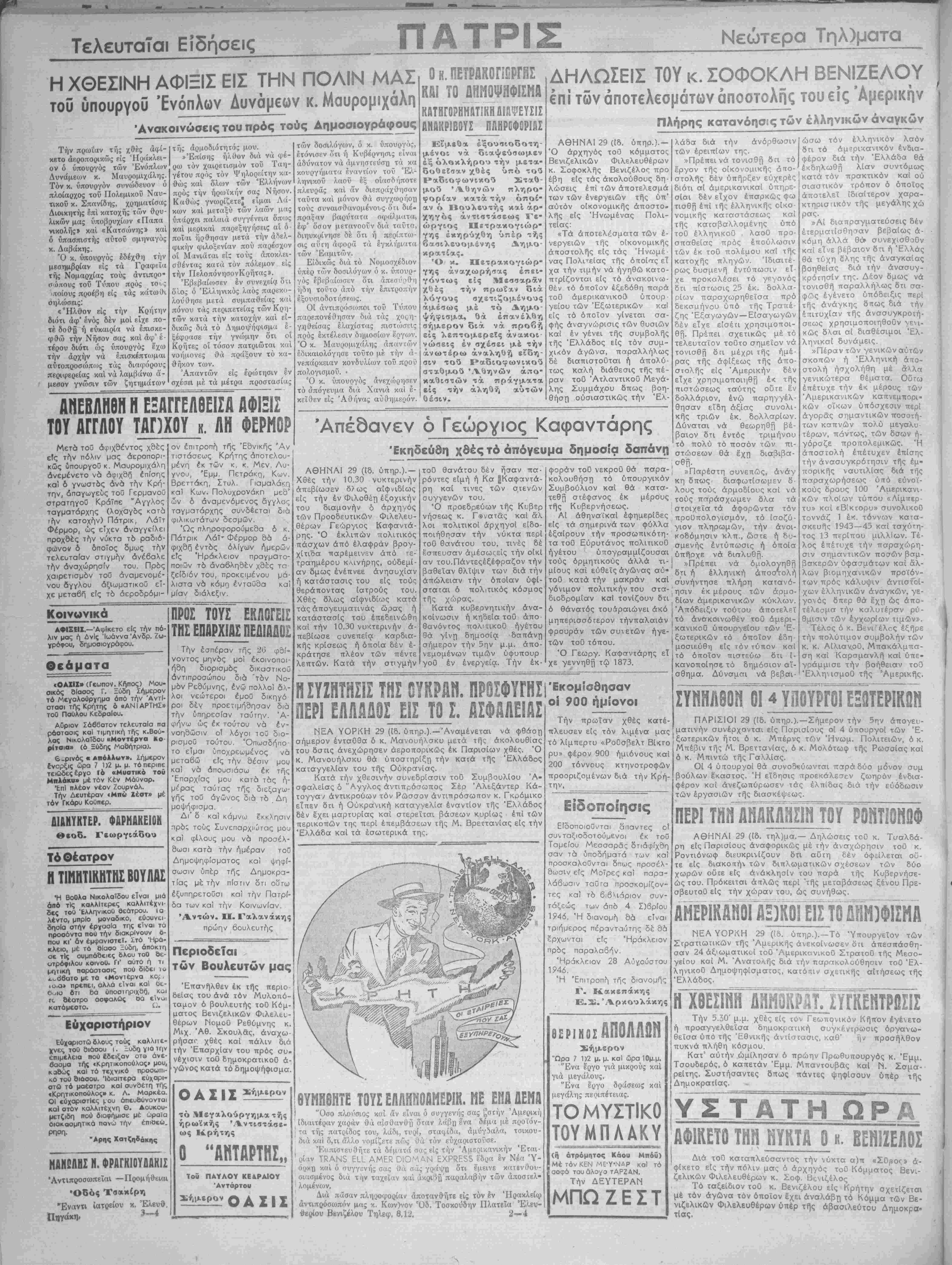 ξωτερικών ήτοι ό κ. Μπέρνς τ<Όν Ήνωμ. Πολιτειών, ό κ. Μπέβιν τής Μ. Βρεττανίας, ό κ. Μολότωφ τής Ρωσσίας καί ό κ. Μπιντώ τής Γαλλίας. Οί 4 ύιτουργοί θά συνοδεύωνται παρά δύο μόνον συμ βούλων έ'καστος. Ή είδησις προεκάλεσαν ζωηρόν ενδια¬ φέρον καί άνεζωπύρωσεν τάς ελπίδας διά την εύόδωσιν των εργασιών τής διασκέψεως. ΠΕΡΓΤΗΗΙηΑΚΛΗΣΤν ΤΟΥ Ρ0ΗΤ10Ν0Φ ΑΘΗΝΑΙ 29 (ίδ. τηλ)μα.— Δηλώσεις τού κ. Τσαλδά- ρη είς Παρισίους αναφορικώς μέ την αναχώρησιν τοϋ κ. Ροντιόνωφ διευκρινίζουν ότι αυτή δέν όφείλεται οϋ¬ τε είς διακοπήν των διπλωματικήν σχέσεων των δύο χωρών ουτε είς άνάκλησίν τού παρά τής Κυβερνήσε¬ ως τού. Πρόκειται απλώς περΐ "τής μεταβάσεως ξένου Πρε- σβευτοθ είς την χώραν τού, ώς συνήθως. ΑΗΕΡΙΚΑΗΟΙΑ53Κ01 ΕΙΣ ΤΟ ΔΗΜ1Φ1ΣΜΑ ΝΕΑ ΥΟΡΚΗ 29 (Ιδ. ύπηρ.).~Τό Υπουργείον των Στρατιωτικών τής Άμερικής ανεκοίνωσεν δπ άπεσπάσθη- σαν 24 άξιωματικοί τοϋ ΆμερικανικοΟ ΣτρατοΟ της Μεσο- γείου καΐ Μ. Άνατολής διά την παρακολούθησιν τοΟ Έλ- ληνικοϋ Δημοψηφίσματος, κατόπιν σχετικής αίτήσεως ττις Ελλάδος. ' Η ΧΘΕΣΙΗΗ ΔΗ.,,,., ... .ίίΓΚΕΗΤΡΩΣΙΣ Την 5,30' μ.μ. χ6ές είς ιον Γεωπονικόν Κήπον εγένετο ή προαγγελθείσα δημοκρατική συγκέντρωσις όργανω- ]θεΐσα υπό τής 'ίϊθνικής άνχίστασις, καθ" ήν προσήλθον 'πυκνάπλήθη κόσμου. Κατ' αυτήν ωμίλησαν ό πρώην Πρωθυπουργός κ. Έμμ. Τσουδερός, ό καπετάν Έμμ. Μπαντουβάς καί Ν. Σσμα- ρείτης. Συστήσαντες όπως πάντες ψηφΐσουν υπέρ τής Δημοκρατίας. Ϋ Σ Τ Α Τ Η Ω ΑΦΙΚΕΤΟ ΤΗΝ ΝΥΚΤΑ Ο«. ΒΕΝΙΖΕΛΟΣ Διά τοΟ καταπλεύσαντος την νύκτα α)π «Σθβοο α¬ φίκετο είς την πόλιν μας ό άρχηγός τοϋ Κόμματος Βενι¬ ζελικών Φιλελευθέρων κ. Σοφ. Βενιζέλος Τό ταξείδιον τοΰ κ. Βενιζέλου είς Κρήτην σχετίζεται μέ τόν άγώνα τον οποίον έ'χει αναλάβη τό Κόμμα των Βε¬ νιζελικών Φιλελευθέρων υπέρ τής άβασιλεύτου Δημοκρα· χίος. '~ Γ ώσω τόν ελληνικόν λαόν δτι τό αμερικανικόν ενδια¬ φέρον διά την Έλλάδα θά εκδηλωθή λίαν συντόμως κατά τόν πρακτικόν καΐ ού ι σιαστικόν τρόπον ό οποίος ι αποτελεί ιδιαίτερον χαρα- κτηρισακόν τής μεγάλης χώ ρας. »Αί διαπραγματεύσεις δέν ετερματίσθησαν βεβαίως ά- κόμη άλλα θό> συνεχισθοθν «