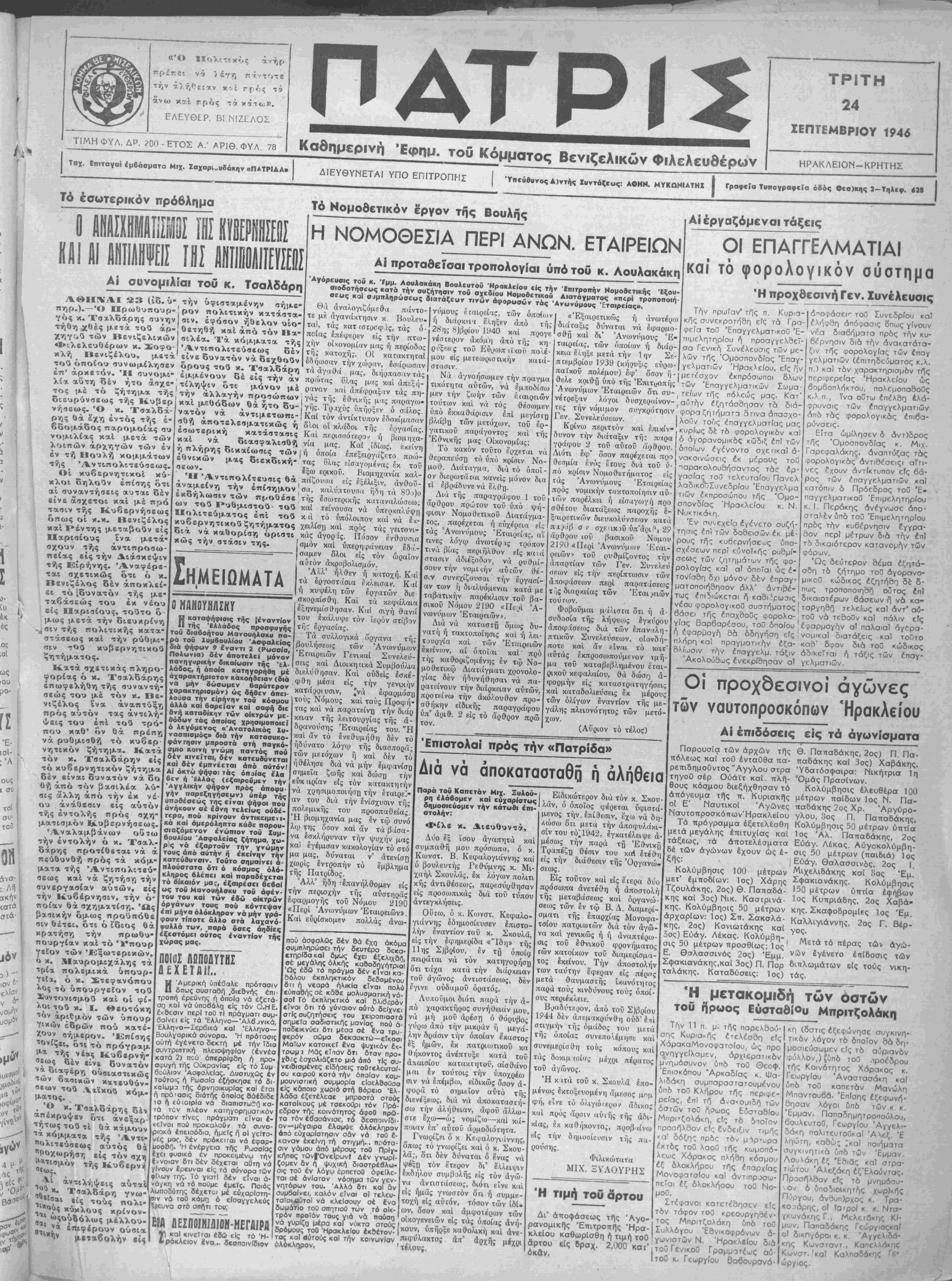 άν ω κ » ι γ ρ < ις τ» κίίτω». εν ΕΛΕΥΘΕΡ Βί ΝΙΖίΛΟΙ ΤΙΜΗ ΦΥΛ. ΔΡ. ?0Ο - ΕΤΟΣ Α.' ΑΡΙΘ. ΦΥΛ 78 ΠΑΤ Καβημερινή Έφημ. τού Κόμματος Βενιζελικών Φιλελεύθερον ΤΡΙΤΗ 24 ΣΕΠΤΕΜΒΡ/ΟΥ 19445 ΗΡΑΚΛΕΙΟΝ-ΚΡΗΤΗΣ Ταχ. Εηιταγαί έμβάοματα Μιχ. Ζαχαριουδάκη^ «ΠΑΤΡΙΔΑ» ΔΙΕΥΘΥΝΕΤΑΙ ΥΠΟ ΕΠΙΤΡΟΠΗΣ Ύι?ε.ύβιινοςΑ)ντής Συντάξεως: ΑΟΗΝ. ΜΥΚΩΝΙΛΤΗΧ Ι Γραφεία Τυπογραφεία όδός Οεσ)κης 2-Τηλεφ. «25 Τό εσωτερικόν πρόβλημα Ο ΙίΧΙΑίίίΙΙΙΚΙΡΗ ΑΙ ΑΝΤΙΛΗΨΕΙΙ 1ΗΙ111ΙΥΜ Τό Νομοθετικόν έργον της Βουλής Η ΝΟΜΟΘΕΣΙΑ ΠΕΡ1 ΑΝΩΝ. ΕΤΑΙΡΕΙΩΝ Αί προταβεΤσαι τροπολογίαι υπό τού κ. Λουλακάκη Αι συνομιλίαι τού κ. Τσαλδάρη ΑΘΗΝΑΙ 23 (ίδ. ύ- πηρ.).—Ό Πρωθυπουρ- γός κ. Τσαλδάρης συνην τήθη,αθές μβτά τοΰ άρ- χηγού των Βενιζελικών Φιλελευθέρας κ. Σοφο- κλή Βενιζέλου, μετά τού όποίου συνωμίλησεν έπ' αρκετόν. Ή συνομι- λία αυτή δέν ήτο άσχε- τος μέ τό ζήτημα τής διευρύνσεως τής Κυβερ νήσεως. Ό κ. Τσαλδά¬ ρης θά έχη έντός τής ε¬ βδομάδος παρομοίας συ νομιλίας καί μετά των λοιπών άρχηγών των έν έν τή Βουλή κομμάτων τής Αντιπολιτεύσεως. Οί κυβερνητικόν κύ- κλθί δηλούν έπίσης ότι αί βυναντήσεις αυται δέν είνε άσχετοι καί μέ πρό τάσιν της Κυβερνήσεως όπως οί κ.κ. Βενιζέλος καί Ρέντης μεταβούν είς Παρισίους .ν* μετά- βχουν τής άντιπροσω- πείας είς την Διάσκεψιν τής Έίρήνης- Άναφέρε- ται σχετικώς ότι ο κ. Ββνιζέλος δέν άποκλεί- ει τό ^δυνατόν τής με" ταβάσεώς τού έκ νέου είς Παρισίους, τούτο ό- )μως μετά την διευκρίνη ^βιν τής πολιτικής κατα¬ στάσεως καί την ρύθμι¬ σιν ?θΰ κυβερνητικού ζητήματος. Κατά σχετικάς πληρο¬ φορίας ό κ. Τσαλδάρης έπωφελήθη τής συναντή¬ σεως τού μέ τον κ. Βε- νιζέλος ?να αναπτύξη πρός αυτόν τας άντιλή άεις τού επί τού τρό που καθ' όν θά πρέπη νά ρυθμισθη" τό κυβερ νητικόν ζήτημα. Κατά τόν κ. Τσαλδάρην εις τό κυβερνητικόν ζήτημα δέν είναι δυνατόν νά δο βή άπό τόν βασΐλέα λύ¬ σις άλλη άπό την έκ^ νέ¬ ου άνάθεσιν είς αυτόν τής έντολής πρός σχη¬ ματισμόν καυβερνήσεώς. Άναλαμβάνων οΰτω την εντολήν ό κ. Τσαλ¬ δάρης προτίθεται νά α πεύθυνθή πρός τα κόμ¬ ματα τής Αντιπολιτεύ¬ σεως καί νά ζητήση την συνεργασίαν αυτών, είς την Κυβέρνησιν, την ό* ποίαν Θά σχηματίση. Ώς βασικήν όμως προΰπόθε σιν θέτει, ότι ό ΐδιος θά κρατήση την πρωθυ· πουργίαν καί τό Υπουρ γεϊον των Εξωτερικών, ό κ. Μαυρομιχάλης τα τρία πολεμικά ύπουρ- γϊΐα, ό κ. Στεφανόπου λος τό υπουργείον ^ τοΰ —υντονισμοΰ καί οί φί- λοι τού κ. Ι. Θεοτόκη τόν αριθμόν των υπουρ γικών έδρών πού κατέ- χουν σήμερον. Έπίσης τονίζει, ότι τό ηρόγραμ ε»·* τής νέ*ς Κυβερνή¬ σεως οέν είν» δυνατόν νά διαφέρη ούσιαστικώς 1 των βασικών κατευθύν- σεων τού Αχϊκοΰ κόμ- ματος. , Ό κ. Τσαλδάρης δέν απέκρυψεν δτι ανεξαρ¬ τήτως τού τί θά κάμουν τα κόμματα τής Αντι¬ πολιτεύσεως αύτός θά "ροχωρήση είς τόν σχη Ι^τισμόν τής Κυβερνή Ι -ομ* ν>1