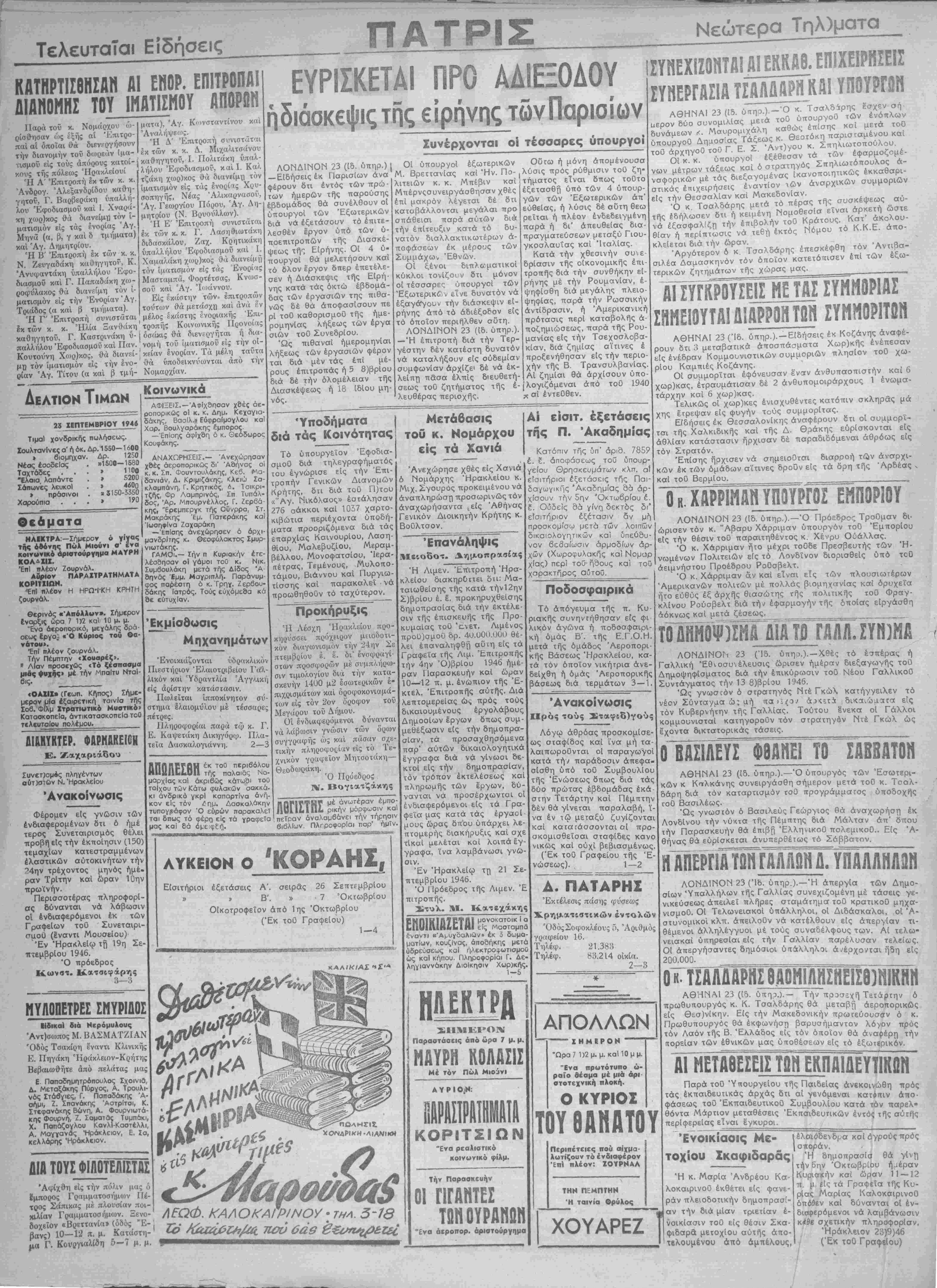 νέον Σύνταγμα ώ; αή πα>;<οο ά ο<ί τ λ , δικαίω α 3 τα είς τόν Κυβερνήτην τής Γαλλίας. Τούτου ένεκα οί Γάλλοι κομμουνισταί κατηγοροϋν τόν στρατηγόν Ντέ Γκώλ ώς έ'χοντα δικτατορικάς τάσεις. ΡΐΑΣΪΛΕΥΣ" ΦΘΑΗΕΙ ΐθ ΣΑΒΒΑΤΟΝ ΑΘΗΝΑΙ 23 (ίδ. ΰπηρ.).—Ό ύπουργός των Έσωτερι- κών κ Καλκάνης συνειργάσθη σήμερον μετά τοθ κ. Τσαλ- δάρη διά τόν καταρτισμόν τοθ προγράμματος ύποδογΗς τοΟ Βασιλέως. ' Ώς γνωστόν ό Βασιλεύς Γεώργιος θά αναχωρήση έκ ΛονδΙνου την νύκτα της Πέμπτης διά Μαλταν άπ' δπου την Παρασκευήν θά έπιβή "ΕλληνικοΟ πολεμικοθ.. Είς Α¬ θήνας θά ευρίσκεται ανυπερθέτως τό Σάββατον. Η ΑΠΕΡΓ1ΑΤΩΗΓΑΛΑΩΗΔ. ΥΠΑΛΑΗΑΟΝ ΛΟΝΔΙΝΟΝ 23 (Ίδ. ύπηρ.).—Ή άπεργΐα των Δημο- σίων Ύπαλλήλων τής Γαλλίας συνεχιζομένη μέ τάσεις γε- νικεύσεως άπειλεΐ πλήρες σταμάτημα: τού κρατικοθ μηχα- νισμοϋ. Οί Τελωνειακοί ύπάλληλοι, οί Διδάσκαλοι, οί Ά- στυνομικο'ι κλπ. άπειλοθν νά κατέλθουν είς απεργίαν τι- θέμενοι άλληλέγγυοι μέ τούς συναδέλφους των. Αί τελω- νειακαί υπηρεσίαι είς την Γαλλίαν παρέλυσαν τελείως. ΟΙ άπεργήσαντες δημόσΐοΐ ύηάλληλοι ά^έρχονται ήδη είς 200.000. ___________ ΟΊΓΤΣΑΑΛΑΡΗΣ ΘΑΟΜΙΑΗΣΗΕΙΣΘΙΝΙΚΗΗ ΑΘΗΝΑΙ 23 (15. ύπηο.).— Την πρ3σεχή Τετάρτην ό πρωθυπουργός κ. Κ. Τσαλδάρης θά μεταβή άεροπορικως είς Θεσ)νίκην. Είς την Μακεδονικήν πρωτεύουσβν ό κ. Πρωθυπουργός θά έκφωνήστ) βαρυσήμαντον λόγον πρός τόν Λαόν τής Β. Ελλάδος είς τόν οποίον θά άναφέρη την πορείαν των έθνικών μας ύποθέσεων είς τό έξωτβρικόν. ΑΪΜΕΤΑΘΕΣΕ1Σ ΤΩΝ ΕΚΠΑ1ΑΕΥΤ1ΚΩΝ Παρά τοθ 'ΥπουργεΙου τής Παιδείας ανεκοινώθη πρός τάς έκπαιδευτικάς αρχάς δτι αί γενόμεναι κατόπιν απο¬ φάσεως τοθ ΈκπαιδευτικοΟ ΣυμβουλΙου κατά τόν παρελ· θόντα Μάρτιον μεταθέσεις Έκτταιδευτικών έντός τής αυτής περιφερείας είναι εγκυροι. Ένοικίαοις Με- τοχίου Σκαφιδαρας 'Η κ. Μαρία Άνδρέου Κα- λοκαιρινοΰ έκθέτει είς φανε¬ ράν πλειοδοτικήν δημοπρασί¬ αν την διά μίαν τρΐετίαν ε¬ νοικίασιν τοθ είς θέσιν Σκα- φιδαρα μετοχίου αυτής απο¬ τελουμένου άπό άμπέλους, ελαιόδενδρα καί άγροΰς πρός σιτοράν. Ή δημοπρασίσ θά γίνη την 6ην Όκτωβρίου ημέραν Κυριακήν καί ώραν 11 — 12 τι. μ. ίίς τα Γραφεΐα τής Κυ- ρίας Μαρίας ΚαλοκαιρινοΟ όπόβεν καί δύνανται οί έν- δισφερόμενοι νά λαμβάνωσιν 9 σχετικήν πληροφορίαν, Ηράκλειον 23)9)46 (Έκ τοθ ΓραφβΙου)