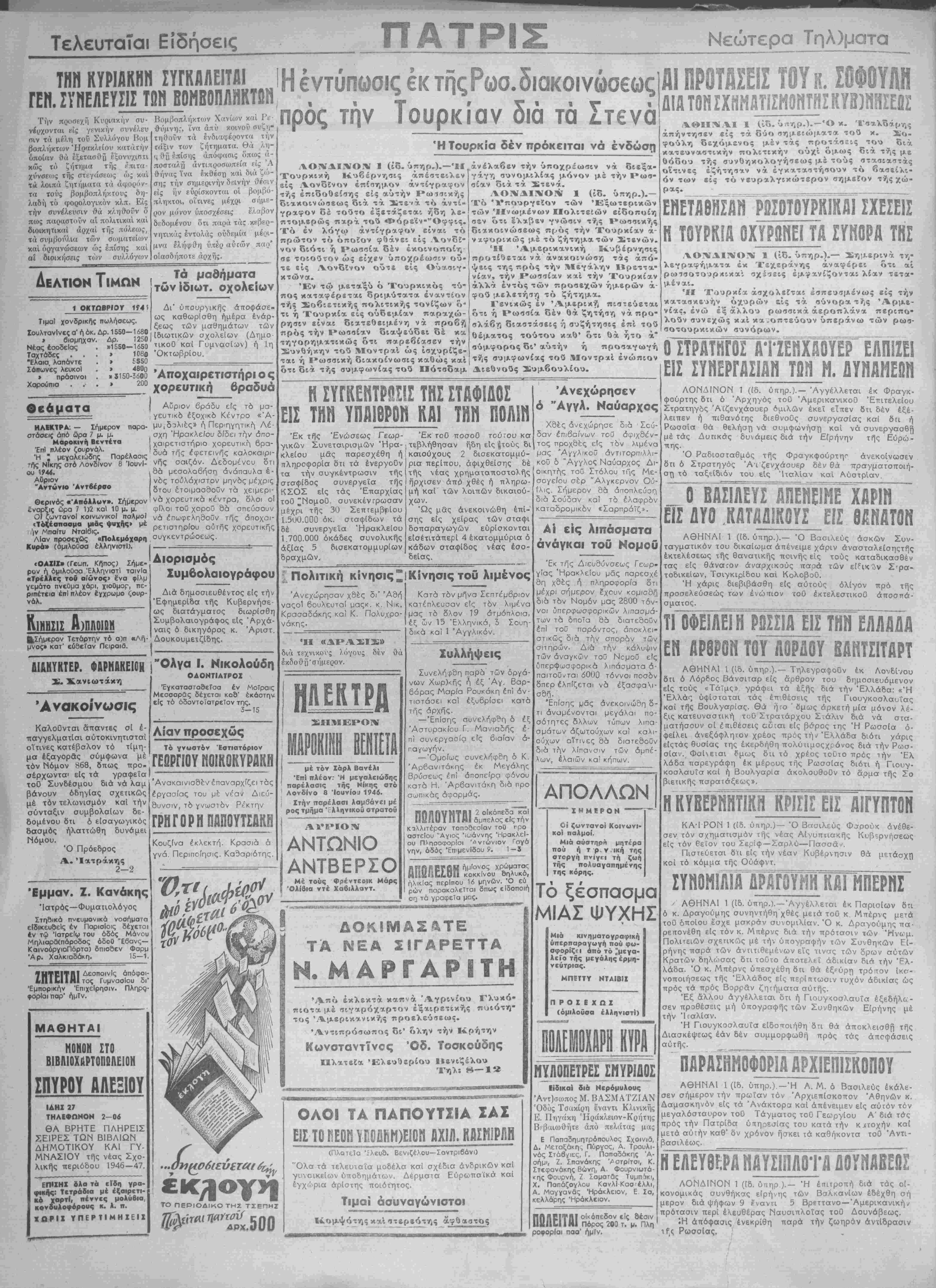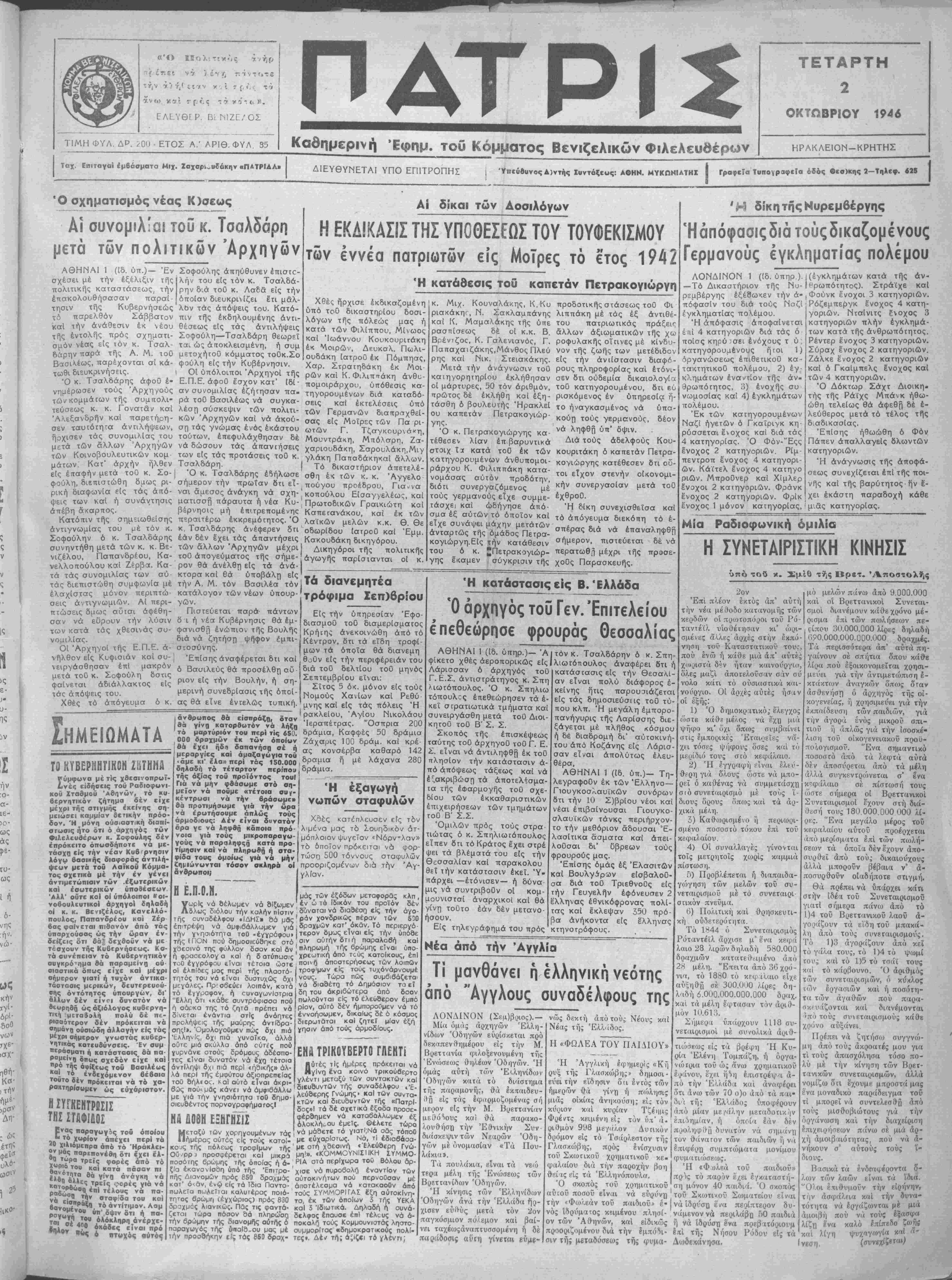 την ? ί ή< ε ι γ ν ν. ι 7 ( Λ τΊ ϊ κ όϊ ι ?· ρ ί. ς τ ά ν ο' - (■ )5. ΕΛΓ-ΥΘΠΡ. Βι ΜΖΓ./ΟΣ ΤΙΜΗ ΦΥΛ. ΔΡ. /ΟΟ ■ ΕΤΟΣ Α.' ΑΡΙΘ. ΦΥΛ 35 Καβημερινη ΈφΠμ. τού Κόμματος Βενιζελικών Φιλελεύθερον ΤΕΤΑΡΤΗ 2 ΟΚΤΩΒΡΙΟΥ 1946 ΗΡΑΚΛΕΙΟΝ-ΚΡΗΤΗΣ Ταχ. ΕπιταγαΊ έμβάσματα Μιχ. Χαχαρ^υ£άκην «ΠΑΤΡΙΔΑ» ΔΙΕΥΘΥΝΕΤΑΙ ΥΠΟ ΕΠ1ΤΡΟΠΗΣ 'Υπεύβυνος Α)ντί|ς Συντάξεως: ΑΘΗΝ. ΜΥΚΩΝΙΛΤΗΧ Ι Γραφεία Τυπονραφεία όδός Θεο)κης 2-Τηλεφ. 628 Ι Ό σχηματισμός νέας Κ)σεως Αι συνομιλ'αι τού κ. Τσαλδάρη μετά των πολιτικών Άρχηγων ΑΘΗΝΑΙ 1 (ίδ. ύπ.)— Έν σχέσει μέ την εξέλιξιν τής πολιτικής καταστάσεως, την έπακολουθήσασαν παραΐ τησιν τής Κυβερνήσεως το παρελθόν Σάββατον καΐ την άνάθεσιν έκ νέου τής έντολής πρός σχηματι¬ σμόν νέας είς τόν κ. Τσαλ- δάρην παρά τής Α. Μ. τοΰ Βασιλέως, παρέχονται αί κά¬ τωθι διευκρινήσεις. Ό κ. Τσαλδάρης άφοθ έ- νημέρωσεν τούς Άρχηγούς των κομμάτων τής συμιτολι- τεύσεως κ. κ. Γονατάν καί Άλεξανδρήν καί παρετήρη- σεν ταυΐότητα αντιλήψεων, ήρχισεν τάς συνομιλΐας τού μετά των άλλων Άρχηγών των Κοινοβουλευτικήν κομ μάτων Κατ' αρχήν ήλθεν είς επαφήν μετά τοθ κ. Σο¬ φούλη, διεπιστώθη δμως ρι- ρική διαφωνΐα είς τάς άπό- ψεις των καί ή συνάντησις άπέβη άκαρπος. Κατόπιν τής σημειωθεΐσης άντιγνωμΐας τοϋ μέ τόν κ. Σοφούλην ό κ. Τσαλδάρης συνηντήθη μ&τά των κ. κ. Βε¬ νιζέλου, Παπανδρέου, Κα- νελλοΐτούλου καί Ζερβά. Κα- τά τάς συνομιλΐας των αύ¬ τάς διεπιστώθη συμφωνΐα μέ ελαχίστας μόνον περιπτώ σεις άντιγνωμιών. Αί περι- πτώσεις δμως αυται αφέθη¬ σαν νά εϋρουν την λύσιν των κατά τάς χθεσινάς συ- νομιλίας. Οί Άρχηγοί τής Ε.Π.Ε. ά- νήλθον είς Κυφισιάν καί συ- νειργάσθησαν επί μακρόν μετά τοθ κ. Σοφούλη δστις φαίνεται άδιάλλακτος είς άα άπόψεις τού. Χθές τό άπόγευμα ό κ. Σοφούλης απηύθυνεν επιστο¬ λήν τού είς τόν κ. Τσαλδά- ρην δ·.ά τοΰ κ. Λαδα είς την οποίαν διευκρινίζει έ'τι μάλ¬ λον τάς άπόψεις τού. Κατό¬ πιν τής έκδηλουμένης άντι- θέσεως είς τάς άντιλήψεις Σοφούλη—Τσαλδάρη θεωρεΐ ται ώς άποκλεισμένη, ή συμ μετοχήτοϋ κόμματος τοϋκ.Σο φούλη είς την Κυβέρνησιν. Οί ϋπόλοιποι Άρχηγοί τής Ε.Π.Ε. άφοθ έ'σχον κατ' Ιδί¬ αν συνομιλίας εζήτησαν πα¬ ρά τοθ Βασιλέως νά συγκα¬ λέση σύσκεψιν των πολιτι¬ κών Άρχηγών καΐ νά ακού¬ ση τάς γνώμας ενός εκάστου τούτων, έπεφυλάχθησαν δέ νά δώσουν τάς άπανιήσεις των είς τάς προτάσεις τοθ κ. Τσαλδάρη. Ό κ. Τσαλδάρης εδήλωσε σήμερον την πρωΐαν ότι εί¬ ναι άμεσος άνάγκη νά σχη¬ ματισθή πάραυτα ή νέα Κυ¬ βέρνησις μή έπιτρεπομένης περαιτέρω έκκρεμότητος. Ό κ. Τσαλδάρης ανέφερεν δτι εάν δέν εχει τάς άπαντήσεις των άλλων Άρχηγών μέχρι τοθ άπογεύματος τής σήμε¬ ρον θά ανέλθη είς τα άνά- κτορα κσί θά υποβάλη είς την Α. Μ. τόν Βασιλέα τόν κατάλογον των νέων ΰπουρ- γών. Πιστεύεται παρά· πάντων δ ι ή νέα Κυβέρνησις θά εμ¬ φανισθή ενώπιον τής Βουλής διά νά ζητήση ψήφον έμπι- στοσύνης. ΈπΙσης άναφέρεται δτι καί ό Βασιλεύς θά προσέλθη αυ¬ ριον είς την Βουλήν, ή ση- μερινή συνεδρΐασις τής οποί¬ ας θά είνε εντελώς τυπική. Αί δίκαι των Αοσιλόγων Η ΕΚΔίΚΑΣΙΣ ΤΗΣ ΥΠΟΘΕΣΕΩΣ ΤΟΥ ΤΟΥΦΕΚΙΣΜΟΥ των έννέα πατριωτδν είς Μοϊρες τό ετος 1942 Ή κατάθεσις τοθ καπετάν Πετρακογιώργη Σημειωματα ΤΟ ΚΥΒΕΡΗΗΠΚΟΗ Ζ8ΤΗΗί Σύμφωνα μέ τίς χθεσινοπροϊ νές είδήοεις τού Ραδιοφωνι κου Ζταβμοϋ Αθηνών, τό κυ βερνητικον ζήτημα δέν εϊχε μέχρι τής στιγμάς έκείνης ση μειώσει καμμίαν δετικήν πρόο δόν. Ή μόνη ούσιαοτική διαπί' στάσις ήτο ότι ό άρχηγός των Φιλελεύθερον κ. Σοφούλης δέν επρόκειτο όποσδήποτε νά με- τάσχα είς την νέαν Κυβερνησιν λόγ