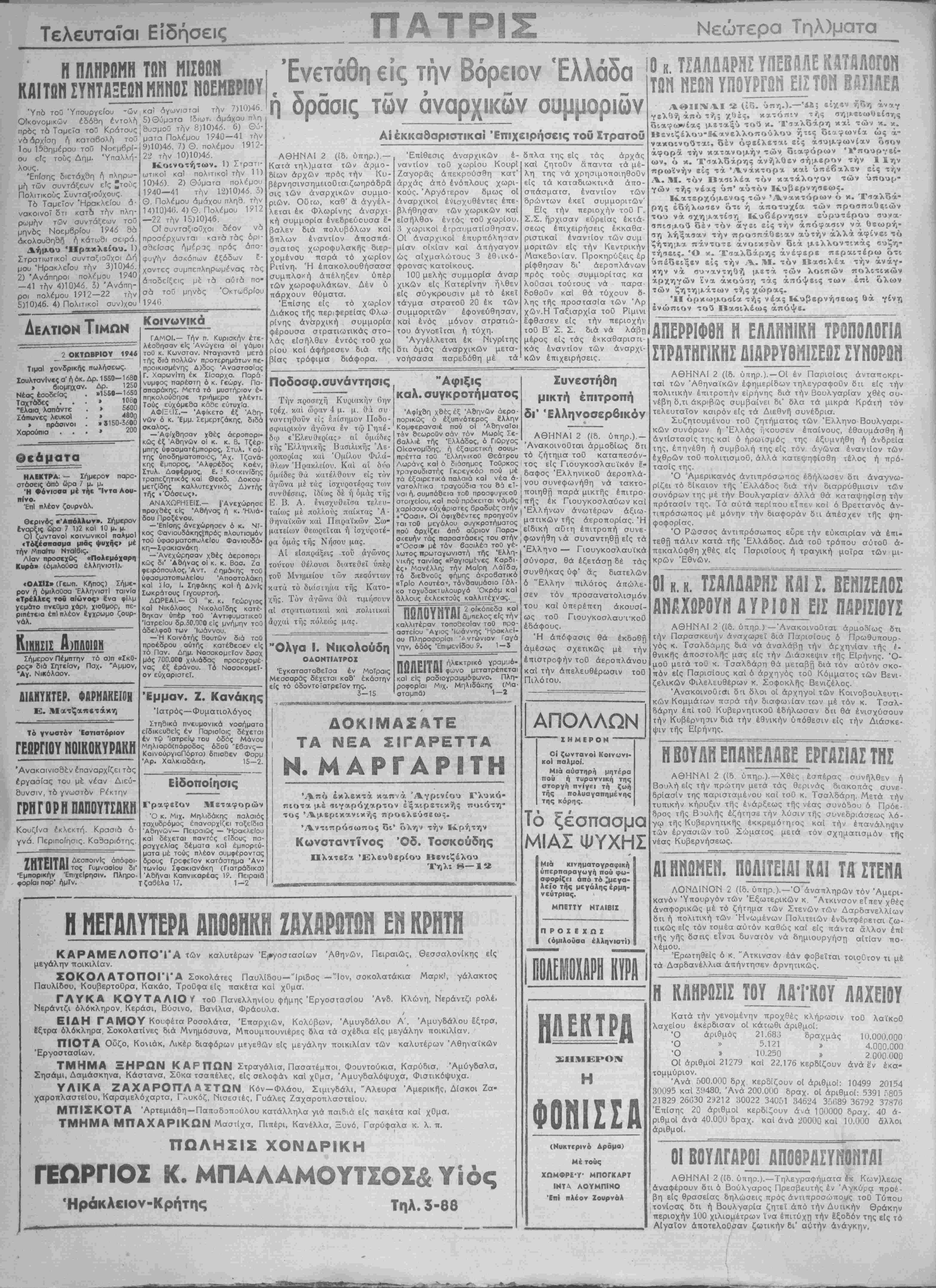 τό διεθνοϋς φήμης ά<ροβατικό «ΤρΙο Λουτέο*, τόνθαυμάσιο Γάλ- κο ταχυδακτυλουργό Όκράμ καΐ δλλους έκλεκταύς καλλιτέχνας._ ΠβΑΟΤΒΤΑΙίμΙΐ^τϊ! καλλιτέραν τοποθεσίαν τοϋ προ- αστείου 'Αγιος "Ιωάννης Ηρακλεί¬ ου Πληροφορίαι '^ντώνιον Γαγά νην, όδός Έπιμενίδου 9. 1—3 ΠΟΑΕΙΐΗΙ φωνο μετατρέπεται καΐ είς ραδιογραμμόφωνο. Πλη¬ ροφορίαι Μιχ. Μηλιδά^ης (Μα¬ σταμπά) 1—2 Συνεστήθη μικτή έπιτροπή δι* Ελληνοσερβικόν ΑΘΗΝΑΙ 2 ((δ. ύπηρ.) — Ανακοινούται αρμοδίως δτι τό ζήτημα τοΰ καταπεσόν¬ τος είς Γιουγκοσλαι-ικόν έ- ρ δαφος Έλληνικοΰ άεροπλά- {νού συνεφωνήθη νά τακτο- ιποιηθή παρά μικτής έπιτρο- ίπής έκ Γιουγκοσλαΰων καί (Έλλήνων ανωτέρων αξιω¬ ματικών της άεροπορίας. Ή είδική αυτή έπιτροπή συνε- ,φωνήθηνά συναντηθή είς τα Έλληνο — Γιουγκοσλαυία σύνορσ, θά έξετάστ] δέ τάς συνθήκας υφ' δς διατελών Έλλην πιλότος άπώλε- σεν τόν προσανατολισμόν τού καί ΰπερέπτη άκουσί- ως τοϋ Γιουγκοσλαυ-ι·κοΟ έδάφους. Ή απόφασις θά εκδοθή άμέσως σχετικώς μέ την επιστροφήν τοΰ άεροπλάνου καί την απελευθέρωσιν τοΰ Πιλότου. ΔΟΚΙΜΑΣΑΤΕ ΤΑ ΝΕΑ ΣΙΓΑΡΕΤΤΑ ΝθΜΑΡΓΑΡΙΤΗ 'Από έκλεκτά καπνά Αγρινίου Γλυκό- πιοτα μέ σιγαρόχαρτον έξαιρετικής ποιότη¬ τος Άμερικανικής προελεύσεως. Άντιπρόσωπος δι' όλην την Κρήτην Κωνσταντίνος Όδ. Τοσκούδης Πλατεία Ελευθερίου Βενιζέλου Τηλι 8—1» Η ΜΕΓΑΑΥΤΕΡΑ ΑΠΟΒΗΚΗ ΖΑΧΑΡΩΤΠΜ ΕΗ ΚΡΗΤΗ ΚΑΡΑΜΕΛΟΠΟΊ'Α των καλυτέρων Έ(*γοσΓασΙων Άθη.'ών, Πειραιώς, Θεσσαλονίκης είς μεγάλην ποικιλίαν. ΣΟΚΟΛ ΑΤΟΠΟΓΓΑ Σοκολάτες Παυλίδου—Ίριδος —"Ιον, σοκολατάκια Μαρκ!, γάλακτος ΠαυλΙδου, Κουβερτοθρα, Κακάο, Τροΰφα είς πακέτα καΐ χθμα. ΓΛΥΚΑ ΚΟΥΤΑΛΙΟ/ τοΰ Πανελληνίου φήμης Έργοστασίου Ανδ. Κλώνη, Νεράντζι ρολέ. Νεράντζι ολόκληρον, Κεράσι, Βύσινο, Βανίλια, Φράουλα. ΕΙΔΗ Γ Α ΜΟΥ Κουφέτα Ροσολάτα, Έπσρχιων, Κολύβων, Άμυγδάλου Α'. Άμυγδάλου έ'ξτρσ, 6ξτρα όλόκληρα, ΣοκολατΙνες διά Μνημόσυνα, Μπουμπουνιέρες δλα τα σχέδια είς μεγάλην ποικιλίαν. ΠΙΟΤΑ Οΰζο, Κονιάκ, Λικέρ διαφόρων μεγεθών είς μεγάλην ποικιλίαν των καλυτέρων Άθηναίκών 'ΕργοστασΙων. ΤΜΗΜΑ ΞΗΡΩΝ Κ ΑΡΠΩΝ Στρπγάλισ, Πασατέμποι, Φουντούκια, Καρύδισ, Άμύγδαλα, Σησάμι, Δαμάσκηνα, Κάστανα, Σΰκα τσαπέλες, είς σελοφάν καί χθμσ, Άμυγδαλόψυχα, Φιστικόψυχα. ΥΛΙΚΑ ΖΑΧΑΡΟΠΛ ΑΤΤΩΝ Κόν-Φλάου, Σιμιγδάλι, Άλευρα Άμερικής, Δίσκοι Ζα- χαροπλαστεΐου, Καραμελόχαρτα, Γ^υκόζ, Νισεσιές, Γυάλες ΖαχαροπλαστεΙου. ΜΠΙΣΚΟΤΑ Άρτεμιάδη—Παπαδοπούλου κατάλληλα γιά παιδία είς πακέτα καί χθμα. ΤΜΗΜΑ ΜΠΑΧΑΡΙΚΩΝ Μαστίχα, Πιπέρι, Κανέλλα, Ξυνό, Γαρύφαλα κ. λ. π. ΠΩΛΗΣΙΣ ΧΟΝΔΡΙΚΗ ΓΕΩΡΓΙΟΣ Κ. ΜΠΑΛΑΜΟΥΤΣΟΣ& Υιός Ήράκλειον-Κρήτης Τηλ. 3-88 ΑΠΟΛΛΩΝ -------ΣΗΜΕΡΟΝ -------- Οί ζοντανοΐ Κοινωνι- κοί παλμοί. Μιά αύοτηρή μητέρα ποϋ ή τυραννική της οτοργη πνίγπ τή ζωή τής πολυαγαπημένης της κόρης. Τό ξέσπασμα ΜΙΑΣ ΦΥΧΗΣ Μιά κινηματογραφικη ύπερπαραγωγή ποϋ φω- σφορίζει άπό τό ΐμεγα- Αείο τής μεγάληςέρμη- νευτριας. ΜΠΕΤΤΥ ΝΤΑΙΒΙΧ ΠΡΟΖΕΧΩΖ (όμιλοϋσα έλληνιοτ'ι) ΗΑΕΚΤΡη ΣΗΜΕΡΟΝ ΦΟΚΙΣΣΑ (Νυκτερινό Αράμα) Μ έ τοΰς ΧΠΜΦΡΕΥ· ΜΠΟΓΚΑΡΤ ΙΝΤΛ ΑΟΥΜΠΙΜΟ "Επί πλέον Ζουρνάλ Ο«. ΤΣΑΛΔΑΡΗΣ ΥΠΕΒΑΛΕ ΚΑΤΑΛΟΓΟΝ ΤΩΝ ΝΕΟΝ ΥΠΟΥΡΓΩΗ ΕΙΣ ΤΟΝ ΙΑΪΙΛΕΔ ΑΘΗΝΑΙ 2 (ίδ. ύπη.).—«Ω; είχεν ήδη άναγ γελθή άπό τή; χθές, κατόπιν τής σημειωΜείσης οιαφωνίας ν».δταξύ τού κ. Τιαλδάρη καί των κ. κ. ΙίενιζΙλου-Κανελλοπούλου ήτις διαφωνία ώς α¬ νακοινούται, δέν όφείλεται είς άσυμφωνίαν όσον άφορά την κατανομήν των διαφόρων Υπουργεί¬ ων, ό κ. Τσαλδάρης ανήλθεν σήμερον την 1 Ιην πρωϊνήν είς τα Άνάκτορα καί υπέβαλεν είς την Α. ΑΙ. τόν Βασ