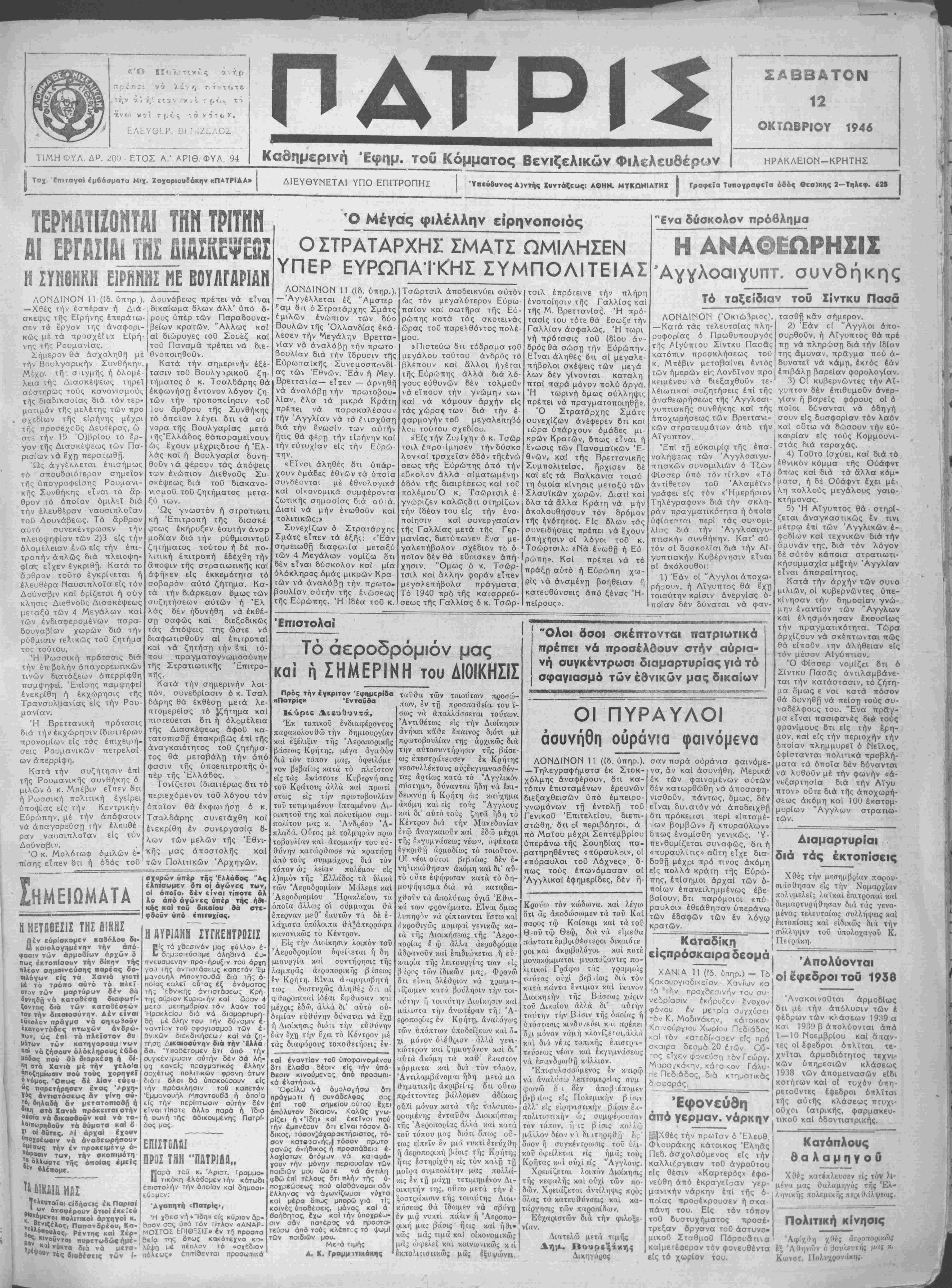 ;(,<",. τι Β τ ν ζ ·. ό π'-ο ν. •ν ΕΛί.ΥΘ'_Ρ ϋι ί ΙΖΓ./ΟΖ ΊΊΜΗ ΦΥΛ. ΔΡ. , ΌΟ - ΕΤΟΣ Λ.' ΑΡΙΘ. ΦΥΛ 94 ΠΑΤ Καθημερινή Έφημ. τού Κόμματος Βενιζελικών Φιλελεύθερον ΣΑΒΒΑΤΟΝ 12 ΟΚΤΩΒΡΙΟΥ 1946 ΗΡΑΚΛΕΙΟΝ-ΚΡΗΤΗΣ Ταχ. Επιταγαϊ έμβάσματα Μιχ. Ζαχαριουδάκη^ «ΠΑΤΡΙΑΑ» ΔΙΕΥΘΥΝΕΤΑ1 ΥΠΟ ΕΠΙΤΡΟΠΗΣ 'Υηεύουνος Δ)ντής Συντάξεως: ΑΘΗΝ. ΜΥΚΩΝΙΑΤΗΧ Ι Γραφεία Τυπογραφεΐα όδος Θεσ)κης 2—Τηλεφ. «25 ΤΕΡπΑΤΙΖΟΝΤΑΙ ΤΗΝ ΤΡΙΤΗΝ ΑΙ ΕΡΓΑΣΙΑΙ ΤΗΣ &Ι&ΣΚΕΨΕΠΣ Η ΣΥΝΘΗΚΗ ΕΙΡΗΝΗΣ ΜΕ ΒΟΥΛΓΑΡΙΑΝ ΛΟΝΔΙΝΟΝ 11 (ίδ. ύπηρ ). — Χθές την εσπέραν ή Διά¬ σκεψις τής Ειίρήνης έπεράιω- σεν τ© έργον της αναφορι¬ κώς μέ τα προσχέ^ια Είρή- νης τής ΡουμανΙας. Σήμερον θά άσχοληθή μέ την Βουλγαρικήν Συνθήκην ΜΙχρΐ τή; σ ιγμής ή όλομέ λεια τής Διασκέψεως τηρεΐ αυστηρώς τοϋς κανονισμού τής διαδικαοίας διά τόν τερ μαημόν τής μελέτης των προ σχεδΐων τής είρήνης μέχρι τής προσεχούς Δευτέρας, ώ στε την 15 Ό)βρΙου τό έρ¬ γον τής Διασκέψεως των Πα¬ ρισίων νά έχη περατωθή. Ώς άγγε»Λ.εται επισήμως τό σπουδαιότερον σημείον τής ύπογραφεΐσης Ρουμανι- κής Συνθήκης είναι τό άρ θρον τό οποίον ομιλεί διά την ελευθέραν ναυσιπλοΐαν τού Δουνάβεως. Τό άρθρον αύτό συνεκέντρωσεν την πλειοψηφίαν των 2)3 είς την όλομέλειαν ένώ είς την επι¬ τροπήν απλώς διά πλειοψη- φίσς είχεν εγκριθή. Κατά τό αρθρον τουτο έγκρΐνεται ή ελευθέρα Ναυσιπλοΐα είς τόν Δούναβιν καί όμζεται ή ούγ κλησις Διεθνοΰς Διασκέψεως μειαξύ των 4 Μεγάλων καί των ενδιαφερομένων παρα- δουνσβίων χωρών διά την ρύθμισιν τελικώς τοϋ ζητήμα τος τούτου. Ή Ρωσσική πρότασις διά την επιβολήν άπαγορευτΐκών τινών οιατάξεων απερρίφθη παμψηφεΐ. ΈπΙσης παμψηφεί ενεκρίθη ή έκχώρησις τής ΤρανσυΛ|ίανίας είς την Ρου¬ μανίαν. Ή Βρεττανική πρότασις διά τήνέκχώρη7ΐν ίδιοιιέρων προνομίων είς τάς έπιχειρή- σεις Ρουμανικών πετρελαί ών άπερρίφη. Κατά την συζήτησιν επί τής Ρουμανικής συνθήκης ό μιλών ό κ. Μπέβιν είπεν δτι ή Ρωσσική πολιτική έγείρει ύποψΐας είς την Κεντρικήν Ευρώπην, μέ την απόφασιν νά απαγορεύση την ελευθέ¬ ραν ναυσιπλοΐαν είς τύν Δούναβιν. Ό κ. Μολόΐωφ ομιλών έ- πίσης είπεν δτι ή όδός τοθ Δουνάβεως πρέπει νά είναι ( δικαίωμα δλων άλλ' υπό δ- ίρους υπέρ των Παραδουνα- βείων κρατών. "Αλλως καί αί διώρυγες γοΟ Σουεζ καί |τοΰ Παναμα πρέπει νά διε- θνοποιηθοΰν. Κατά την σημερινήν εξέ¬ τασιν τοϋ Βουλγΐρικοΰ ζη- τήματος ό κ. Τ σαλδάρης θά έκφωνήστ] έντονον λόγον ζή των την τροποποίησιν τοθ 1ου άρθρου τής Συνθήκης γο οποίον λέγει δτι τα ού νορα τής Βουλγαρίας μετά ιήςΈλλάδος θάπαραμεΐνουν ώς έχουν μέχριςδτ,ου ή Ελ¬ λάς καί ή Βουλγαρία ουνη θοΰν ν ά φέρουν τάς άπόψεις των ενώπιον Διεθνοΰς Συ σκέψεως διά τοθ διακανο- νισμοθ τοθ ζητήματος μετα- ξύ των. Ώς γνωστόν ή στρατιωτ κή Έπιτροπή τής διασκέ ψεως εκήρυξεν εαυτήν άνσρ μοδΐαν διά την ρόθμισιντοϋ ζηιήματος τούτου ή δέ πο¬ λιτική έπιτροπή εδέχθη την άποψιν τής στραηωτικής καί άφηκεν είς έκκεμότητα τό σοβαρόν αύτό ζήτημα. Κα¬ τά την διάρκειαν δμως των συζητήσεων αυτών ή Έλ λάς δεν ηδυνήθη νά εκθέ¬ ση σαφώς καί διεξοδικώς τάς άπόψεις της ώστε νά διαφωΐισθοΰν αί έτιιτροπαί καί νά ζητήση την επί τό- που πραγματογνωμοσύνην τής Στρατιωτικής Έπιτρο- πής. Κατά την σημερινήν λοι- πόν, συνεδρίασιν ό κ. Τσαλ δάρης θά εκθέση μειά λε¬ πτομερείας τό ^ζήτημα καί πισΐεύεται δτι ή όλομέλεια τής Διασκέψεως άφοΰ κα τατοπισθΓ) έπακριβώς επί τής άναγκαιότητος τοΰ ζητήμα¬ τος θά μεταβάλη την άπό φασιν τής ύποεπιτροπής υ¬ πέρ τής Ελλάδος. Τονίζβται ιδιαιτέρως δτι τό περιεχ