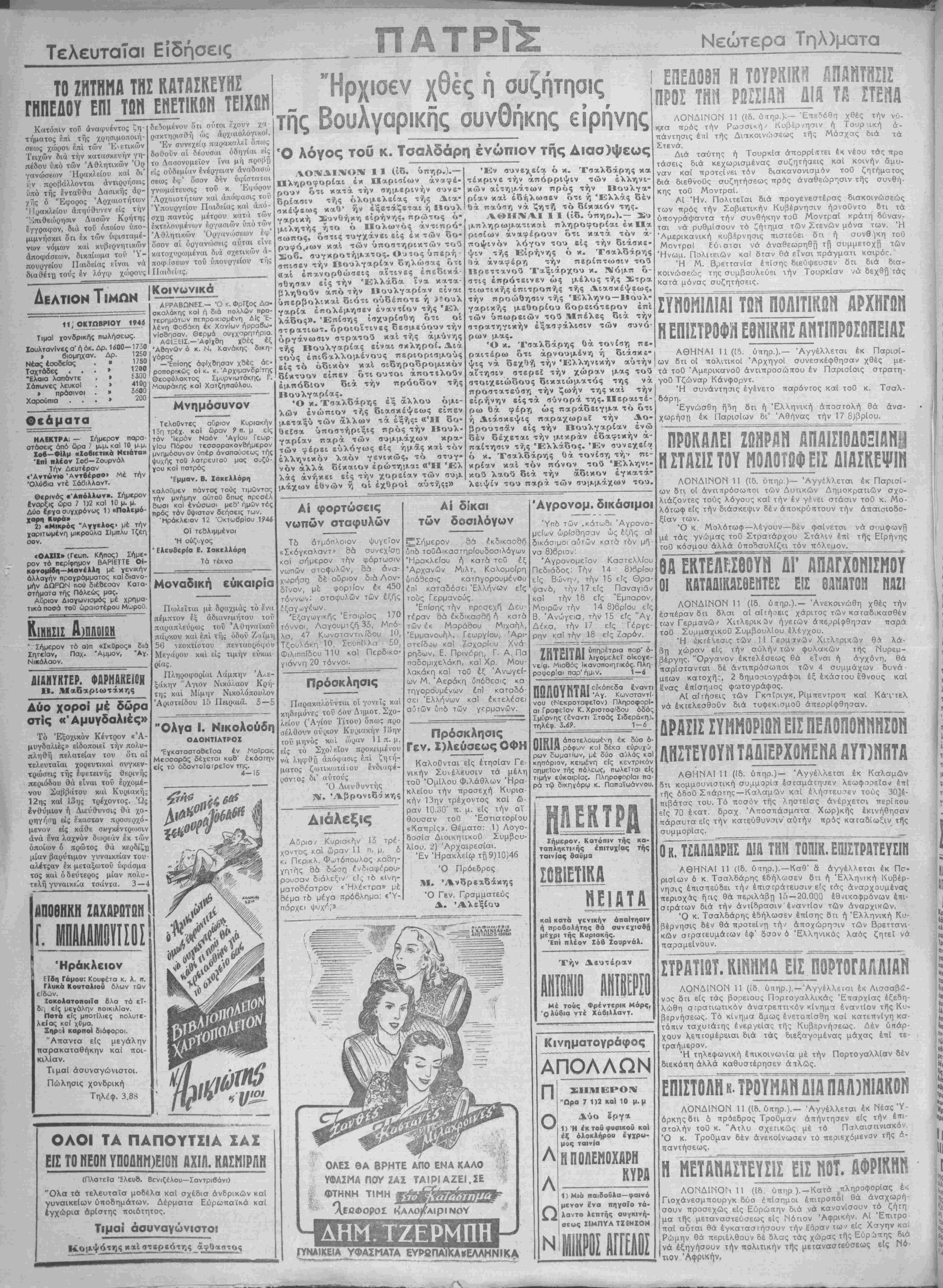 δίνον, με ψοριίον έ< 450 τόννων: οταφυλών των έζής ΐξαγωγέων. Έξαγωγικης Έταιρίας 170 τόννοι, Λαγουμιζη 33, Μπό- λα, 47 Κωνσταντιίδου 10 Τζουλάκη 10, Σ<:υπίλλα 50, Φιλιππίδου ΠΟ και Περδικο¬ γιάννη 20 τόννοι. Πρόσκλησις Παρακα/.οΰνχαι οί γονεΐς καί κηδεμόνες τού 6ου Δημοτ. Σχο- λρίου (Άγίου Τίτου) όπω; προ σέλθουν αυριον Κυριακήν 13ην τοϋ μηνός και ώραν 11 π. μ. είς τό Σχολείον προκειμένου νά ληφθή απόφασις επί ζηνή- ματος ζωτΐκωτάιου ένδΐαφέ- οονιος δι" αύτούς Ό Διευθυντής Ν· Άβρονιδίκης Διάλεξις Αίριο/ Κυριακήν 13 τρέ¬ χοντος καί ΪΟραν 11 π. μ ό κ. Περικλ. Φυϋτόπουλος ,καση- γητής 86 δώσι^ ένδιαφίρου- ρουσαν διάλεξιν εί-, τδ κΐνη- ματοδέατρον «Ήλέκτρα» μέ 8έμα τδ μέγα πρόβλημα. «Ύ- πάρχει ^ Αί δίκαι των δοσιλόγον "^Σήμερον 86 έκδικασθπ ύπδ τοΰΔικαστηρίουδοσιλόγων Ηρακλείου ή κατ6 τοΰ έξ Αρχανών Μιλτ. Καλομοίρη υπόθεσις κατΠγορουμένθυ επί καταδόσει Έλλήνων είς τούς Γερμανούς. Έπίσης την προσέχη Δευ τέραν 86 έκδικασδη ή κατά των έκ Μαράδου Μιχαήλ, Εμμανουήλ, Γεωργίου, Αρι¬ στείδου καί Ζσχαρκυ Χνά ρηδων, Ε. Πρινόρη, Γ. Α Πά παδομιχεΧάκη, καί Χρ Μου λακάκη καί τοΰ έξ Ανωγεί¬ ων Μ Άεράκη ύπόδεσις κα τηγορουμένων έπϊ καταδό σει Έλλήνων κα) έκτελέσει αυτών ύπδ των γερμανών. Πρόσκλησις Γεν. ΡλεύσεωςΟΦΗ Καλοθνται είς ετησίαν Γε¬ νικήν Συνέλευσιν τα μέλη τοθ Όμίλου Φ^λάΘλων "Ηρα κλεΐου την προσέχη Κυρια κήν 13ην τρέχοντος καϊ ώ¬ ραν ΙΟ.οΟ' π. μ. ι=1ς την αί θουσαν τοθ Έστιατορίου «Καπρίς». Θέματα: 1) Λογο- δοσίσ Διοικητικοϋ Συμβου- λίου. 2) Αρχαιρεσίαι. Έν ΉρακλεΙφ τή 9)10)46 Ό Πρόεδρος Μ. Άνδρεαοάκης Ό Γεν. Γραμματεύς Δ. Αλεξίου ΟΛΕΣ ΘΑ ΒΡΗΤΕ ΑΠΟ ΕΝΑ ΚΑΛΟ ΥΦΑΣΜΑ ΠΟΥ ΖΑΣ ΤΑΙΡΙΑΖΕΙ.ΣΕ ΦΤΗΝΗ Τ1ΜΗ ΗΆΛθ/ΆφΙΝΟΫ αΤάότημα ΔΗΜ ΤΖΕΡΜΠΗ Ετ^ 'Αγρονομ. δικάσιμοι Ύπδ των .κάτωθι Άγρονο- μείων ωρίσθησαν ώς εξής α? δικάσιμοι αυτών κατ6 τδν μή να 8)6ριον Άγρονομεϊον Καστελλίου Πεδιάδος Την 14 8)6ρίου είς ΒΙινην, την 15 είς ©ρ ψανδ, την 17 είς Παναγίαν καϊ την 18 είς Έμπορον, Μοιρών την 14 8)6ρίου είς Β. Άνώγεια, την 15 είς "Αγ Δέκα, την 17 είς Γέργε- ρην καϊ την 18 είς Ζαρόν. 7 Η Τϊ ΙΥΙΙΙ ύπηρέτρια πορ' ό- 4Π1£Ι1ΗΙ λιγομελεΤ οΐκογε- νε'α. Μισθός Ικανοποιητικάς. Πλη 'ι^ΐαρ^ήμ,ν^1—6 γ νού (Νεκροταφείον) Πληροφορί αι Γραφείον Κ. Χριστοφΐδου όδός Σμύρνης (έναντι Ιτοάς Σιδεράκη). τηλέφ. 2.69._____________1-6 αποτΕλουμένη έκ δύο ό- υΐΐΛΙΗ ρόφων κοί δέκα εύρυχώ ρων δωματΐων, μέ δύο αόλάς καί κηπάριον, κειμένη είς κεντρικόν σημείον τής πόλεως πωλεΤται είς τιμήν εϋκαιρΐας. Πληροφορίαι πα¬ ρά τφ δικηγόρψ κ. Παπαϊωάννου. ΡΕΚΤΡΑ Χήμερον. Κατόπιν της κα¬ ταπληκτικώς επιτυχίας τής ταινίας βαϋμα ΣΟΒΙΕΤΙΚΑ ΝΕΙΑΤΑ καί κατά γενικήν άπαΐτηοιν ή προβολήτης βά συνεχιοοό μέχρι τής Κυριακάς. Επί πλέον Χόβ Ζουρνάλ. Την Δευτέραν Μέ τοΰς Φρέντερικ Μόρς, Όλύβια ντέ Χάθιλλαντ. Κινηματογράφος ΑΠΟΛΛΩΝ Π Ο Λ Λ Ω Ν ΣΗΜΕΡΟΝ "Ωρα 7 1)2 καί 10 μ.μ Δύο έργα 1) Ή έκ τοϋ φυοικοϋ καί έξ ολοκλήρου έγχρυ- μος ταινία ΗΠΟΛΕΗΟΧΑΡΗ ΚΥΡΑ 1) Μιά παιδοΰλα—φαινό μενον έ'να πηγαίο τά- λαντο λεπτής ουγκινή- σεως ΙΙΜΠΥΑ ΤΧΕΚΧΟΝ ΣΥΝΟΗΙΛΙΑΙ ΤΩΝ ΠΟΛΙΤΙΚΩΝ ΑΡΧΗΓΟΝ Η ΕΠΙΣΤγΌΦπ1 Ε8Η.ΚΗΣ ΑΗΤΙΠΡΟΣΟΠΕΙΑΣ ΑΘΗΝΑΙ 11 ([5. ύπηρ.).— "Αγγέλλεται έκ Παρισί¬ ων δτι οί πολιτικοΐ Άρχηγοί συνεσκέφθησαν χθές με- τά τού ΆμρρικανοΟ άνηπροσώπου έν Παρισίοις στρατη- γοθ Τζώναρ Κάνφορντ. Ή συνάντηυις εγένετο παρόντος καΐ τοθ κ. Τσαλ- δάρη. Εγνώσθη ήοη δα ή Έλληνική αποστόλη θά ανα¬ χωρήση έκ Παρισίων δι" Αθήνας την 17 8)βρΙου. προκαλεΤζωϊϊρΙι απαϊσ¥δο1ιαηι η στασισ του μολοτβφ εισ διασκεψιν ΛΟΝΔΙΝΟΝ 11 (ίδ. ύπηρ)— Αγγέλλεται έκ Παρισί¬ ων 