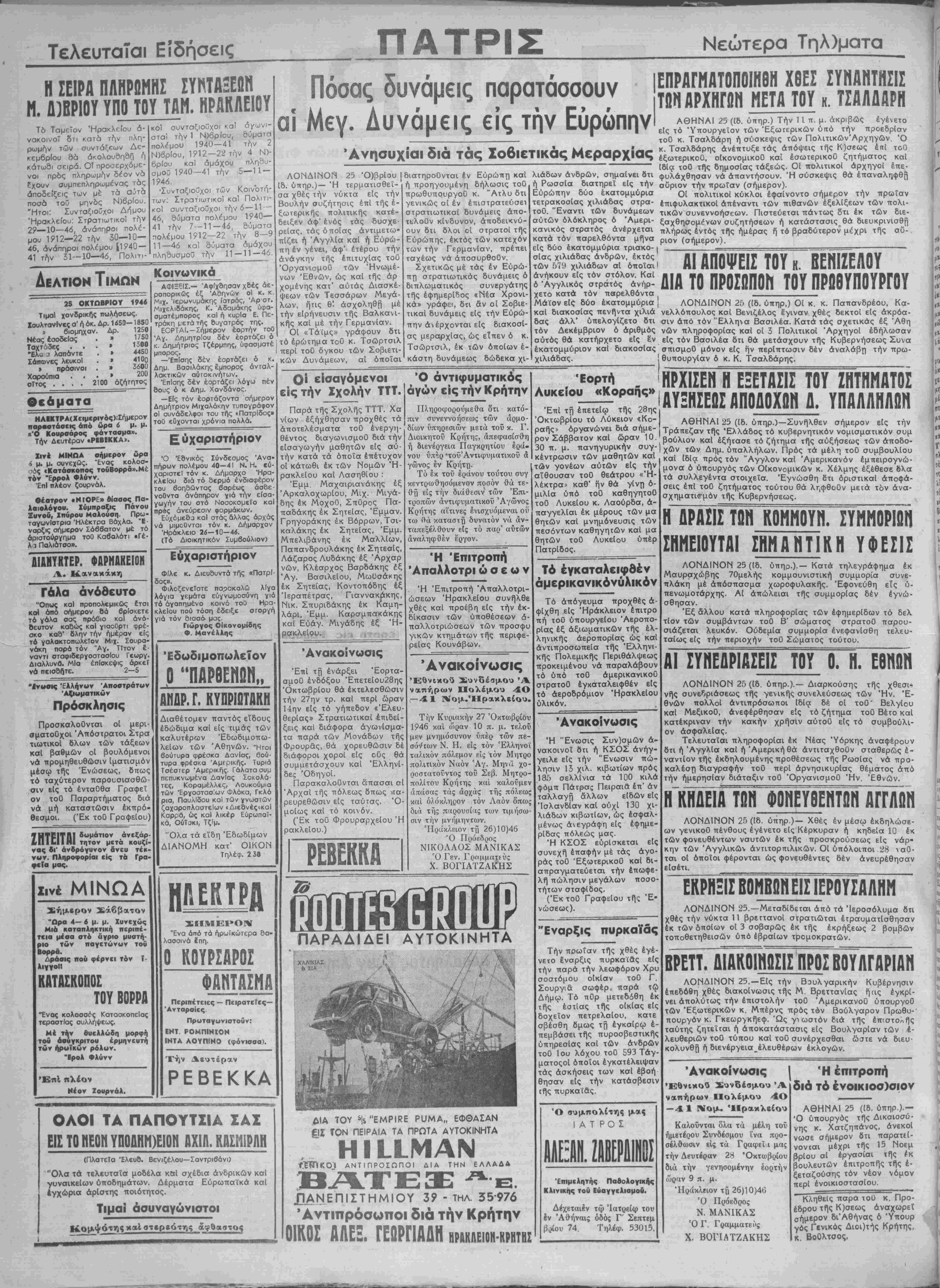 <ί μ. μ. συνεχώς. Ένας κολοσ- αός «Κατάσκοπος τοϋΒορρά».Μέ τον "Ερρολ Φλύνν. Επί πλέον ζουρνάλ. θέατρον «ΝΤΟΡΕ» βίασος Πα- λαιολόγου. Σύμπραξις Πάνου ΐυνοϋ, Ιπύρου Μαλούση. Πρω- ταγωνΐστρια Ήλέκτρα Βάχλα. "Ε - ναρξις σήμερον Σάββατον μέ τό άριστούργημα τοθ Καβαλότι ·Γέ- λ ι Παλιατσο». 'ΙΙΙΠΙΤΕ». ΦΑΡΜΑΚΕΙΟΝ Λ. Κανακάκη Κοινωνικά ΑΦΙΞΕΙΣ.— Αφίχθησαν χθές άε· ροπορικώς έξ Αθηνών οί κ. κ Μιχ. Ίερωνυμάκης ίατρός, Άρστ. Μιχελιδάκης, Κ. Άδαμάκης ύ<ρα- σματέμπορος καί ή κυρία Ε. Πε¬ τράκη μετά τής θυγατρός της. ΕΟΡΤΑΙ.-Σήμερον εορτήν τοθ "Αγ. ΔημητρΙου δέν έορτάζει ό κ. Δημήτριος ίζέρμπης, ύφασματέ μπορος. —'ΕπΙσης δέν έσρτάζει ό κ. Δημ. Βασιλάκης έμπορος άνταλ- λακτικων αύτοκινήτων. 'ΕπΙσης δέν έορτάζει λόγω πέν θους ό κ Δημ. Χανδάνος. —Είς τόν έορτάζοντα σήμερον Δημήτριον Μιχαλάκην τυπογράφον ο! συνάδελφοι τού τής «Πατρίδος» τού «ΰχονται χρόνια πολλά. Ευχαριστηριον Ό 'Εθνικός Σύνδεσμος Άνα· πήρων πολέμου 40—41 Ν. Η· εΰ- χαριστεΤ τόν κ. Δήμαρχο Ηρα¬ κλείου διά τό σερμό ενδιαφέρον τού βοηθώντας βαρέως άσθε- νοθντα ανάπηρον γιά την εισα¬ γωγήν τού οτο Νοσοκομεϊο καί πρός ανεύρεσιν φορμάκων. Εΰχόμεθςι καί οτάς άλλας αρχάς νά μιμοθνται τόν κ. Δήμαρχον Ήράκλειο 20-10-46. (Τα Διοικητικόν Συμβούλιον) Γάλα άνόδευτο "Οπως καί προπολεμικως έτσι κα) άπό σήμερον θά βρΐσκετε τό γάλα σας πρόβιο καί άνό- δευτον κα&ώς καί γιαοϋρτι φρέ- σκο καθ" 6λην την ημέραν είς τό γαλακτοπωλείον Μιχ. Σουρα- νάκη παρό τόν "Αγ. Τίτον έ¬ ναντι σταφιδεργοοτασΐου Γεωργ. Διαλλυνά. ΜΙα επίσκεψις άρκεΐ νό πεισθήτε. 2—5 ■Ινααις Έλλήνων Άποοτράτων Αξιωματικών Πρόσκλησις Προσκαλοθνται οί μερι- σματοθχοι Άπόστρατοι Στρα τιωτικοί βλων των τάξεων καί βαθμών οί βουλόμενοι νά προμηθευθώσιν Ιματισμόν μέσω τής Ενώσεως, Βπως τό ταχύτερον παρουσιασθώ¬ σιν είς τό ένταθθα Γραφεΐ όν τοθ Παραρτήματος διά νά μή καταστώσιν έκπρό- θεσμοι. (Έκ τοθ Γραφείου) ΤΗΤΡΙΤΒΙ δωμάτιον άνεξάρ- ΙιΙΙΙΙϊΙΙΗΙ τητον μετά κουζί- νας βι' άνδρόγυνον άνευ τέκ- ν«ν. Πληροφορίαι είς τα Γρα- φ«Τα μας· Πάσας δυνάμεις παρατάσσουν αί Μεγ. Δυνάμεις είς την Ευρώπην Άνησυχίαι διά τάς Σοβιετικάς Μεραρχίας ΛΟΝΔΙΝΟΝ 25 Ό)[3ρΙου | Ιδ. ύπηρ.)— Ή τερματισθεΐ- σα χθές την νύκτα είς την Βουλήν συζήτησις επί τής έ- ξωτερικής πολιτικής κατέ- δειξεν άφ' ενός τάς δυσχε¬ ρείας, τάς οποίας άντιμετω- πΐζει ή Αγγλία καί ή Εύρώ- πη έν γένει, άφ' ετέρου την ανάγκην τής επιτυχίας τοΰ ΌργανΐσμοΟ των Ήνωμέ- νων Εθνών, ώς καί τής άρ χομένης κατ' αύτάς Διασκέ- ψεων των Τεσσάρων Μεγά- λων, ήτις θ' άσχοληθή μέ την είρήνευσιν τής Βαλκανι- κής καί μέ την Γερμανίαν. Οί «Τάϊμς» γράψουν δτι τό έρώτημα τοθ κ. Τσώρτσιλ περί τοΟ δγκου των Σοβιετι- κών Δυνάμεων, αί οποίαι Ευχαριστηριον ΦΙλε κ. Διευδυντά τής «Πατρί¬ δος». ΦιλοξενεΤστε παρακαλώ λΐγα λόγια γεμάτα εύγνωμοούνη γιό τό άγαπημένο κοινό τοθ Ηρα¬ κλείου πού τόση έδειξε στοργή γιά τόν θιασό- μας. Πυργος ΟΙκονομίδης Φ. Μανέλλης Εδωδιμοπωλείον Ο "ΠΑΡΟΕΝΩΝ,, ΑΗΔΡ.Γ.ΚΥΠΡΙΩΤΟΚΗ χ.νέ ΜΙΝΩΑ Σήμερον Σάββατον "Προ 4— 6 μ. μ. Ζυνεχύς Μια καταπληκτική περιπέ- τεια μέαα στό αγριο μυοτή- ριο των παγετώνον τού Βορρά. Δράσις ποϋ φέρνει τόν ϊ λιγγοΙΙ ΚΑΤΑΣΚΟΠΟΣ ΤΟΥ ΒΟΡΡΑ "Ενας κολοσσός ΚατασκοπεΙας τεραστίας συλλήψεως. Μέ τη_ν βυελλώδη μορφή τού άαυγκριτου έρμηνευτή των ήρυΐκών ρόλον. "Ερολ Φλύνν Επί πλέον Νέον Ζουρνάλ. Διαθέτομεν παντός εϊδους έδώδιμα καί είς τιμάς των καλυτέρων 'Εδωδιμοπω- λείων των Αθηνών. "Ητοι βούτυρα φρέσκα ΔανΙας, 6ού- τυρα φρέσκα Άμε