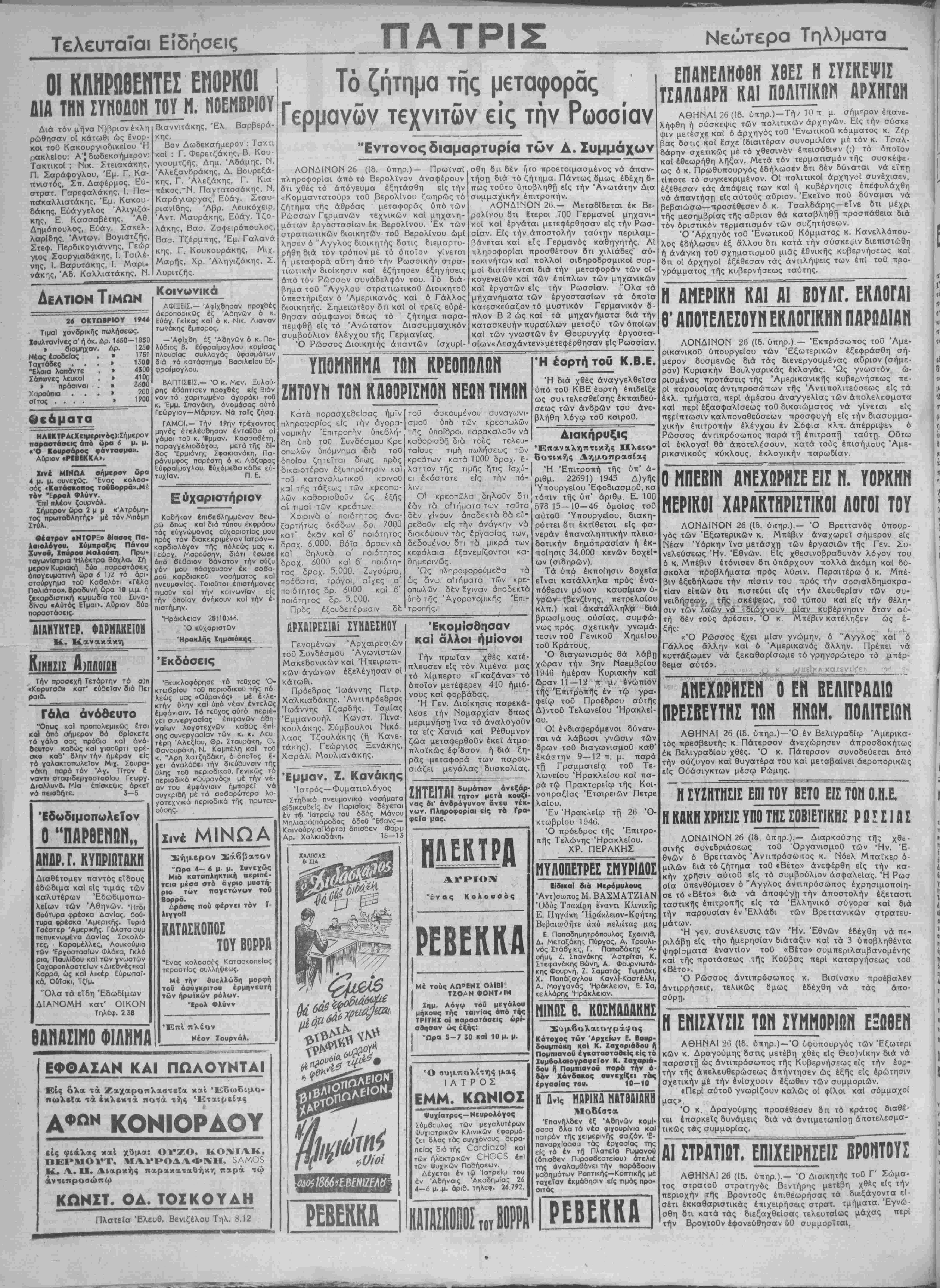 λεως μας «Ούρανός» μέ έ<λε- κτήν Ολην καΐ υπό νέαν εντελώς εμφάνισιν. Τό τεθχος αΰτό περιέ- χει συνεργασίας έπιφανών άθη νοΐων λογοτεχνων καθώς επί σης συνεργασίαν των κ. κ. Λευ τέρη Αλεξίου, ©ρ. Σταυράκη, Θ. Φανουράκη, Ν. Καμπέλη καΐ τοθ κ. "Αρη Χατζηδάκη, ό οποίος έ- χει άναλάβει την διεύθυνσιν τής ϋλης τοθ περιοδικοϋ. Γενικώς τό περιοδικό «Ούρανός» μέ την νέ¬ αν τού εμφάνισιν ημπορεί νά συγκριθή μέ τα σοβαροτέρα λο- γοτεχνικά περιοδικά τής πρωτευ¬ ούσης. ΜΙΝΩΑ Σήμερον Σάββατον "Προ 4— 6 μ. μ. Ζυνεχώς Μιά καταπληκτικήν περιπέ- τεια μέσα οτό αγριο μυοτή- ριο των παγετώνων τοϋ Βορρά. Δράσις που φερνει τόν ϊ- λιγγοΙΙ ΚΑΤΑΣΚΟΠΟΣ ΤΟΥ ΒΟΡΡΑ "Ενας κολοσσός ΚατασκοπεΙας τεραστίας συλλήψεως. Μέ την δυελλώδη μορφή τού άσύγκριτου έρμηνευτή Των ήρωϊκων ρόλον. "Ερολ Φλύνν Επί πλέον Νέον Ζουρνάλ. ΕΦΘΑΣΑΝ ΚΑΙ ΠΩΑΟΥΝΤΑΙ Είς όλα τα Ζαχαροπλαστεΐα καί Εδωδιμο¬ πωλεία τα έκλεκτά ποτά τής Έταιρείας ΑΦΩΝ ΚΟΝΙΟΡΔΟΥ «ίς φΐάλας καΐ χύμα: ΟΥΖΟ, ΚΟΝΙΑΚ, ΒΕΡΜΟΥΤ, ΜΑΥΡΟΔΑΦΝΗ, 5ΑΜΟ$ Κ* Λ. Π. Δΐαρκής παρακαταθήκη παρά τώ άντιπροσώπω ΚΩΝΣΤ. Ο Α. ΤΟΣ ΚΟΥ ΔΗ Πλστεΐα Έλευθ. Βενιζέλου Τηλ. 8,12 ΥΠΟΜΗΗΜΑ ΤΩΝ ΚΡΕΟΠΩΛΩΗ ΖΗΤΟΥΝ ΤΟΝ ΚΑΘΟΡΙΣΜΟΝ ΝΕΟΝ ΤΙΜΩΝ Κατά πορασχεοείσας ημίν πληροφορίας είς την άγορα- νομικήν Επιτροπήν υπεβλή¬ θη ύπδ τού Συνδέσμου Κρε οπωλών ΰπόμνημα διά τού δποίου ζητεϊται όπως πρός δικαιοτέραν εξυπηρέτησιν καΐ τού καταναλωτικοϋ κοινοΰ κα! τής τάξεως των κρεοπω- λών καδορισοοΰν ώς εξής αί τιμαί των κρεάτων Χοιρινά α' ποιότητος ανε¬ ξαρτήτως οκάδων δρ. 7000 κατ' οκάν καΐ 6' ποιότητος δραχ. ό 000. ΒόΤα άρσενικά καΐ δηλυκά α' ποιότητος δραχ. 6000 καΐ 6' ποιότη¬ τος δραχ. 5.Ο00. Ζυγούρια, πρόβατα, τράγοι, α'νες α' ποιότητος δρ. 6000 καϊ β' ποιότητος δρ. 5.000. Πρός εξουδετέρωσιν δέ τού άσκουμέ'νου συναγωνι- σμοΰ ύπ6 των κρεοπωλών τής ΰπαΐσρου παρακαλοΰν νά καθορισθή διά τοϋς τελευ- ταίους τιμή πωλήσεως των κρεότων κατά 1000 δραχ. έ¬ λαττον τής τιμής Ρ^τις ίσχύ- ει εκάστοτε είς την πό¬ λιν Ο" κρεοπώλαι δηλούν δτι εάν τα αίτήματα των ταύτα δέν γίνουν άποδεκτά θά ευ¬ ρεθούν εΤς την ανάγκην νά διακόψουν τάς εργασίας των, δεδομένου δτι τα μικρά των κεφάλαια έξσνεμίζονται κα δημερινώς Ώς πληροφορούμεθα τα ώς 5νω αϊτήματα των κρε οπωλών δέν έγιναν άποδεκτά υπό τής Άγορανομικής Επι τροπής. Ή έορτή τού Κ.Β.Ε. Ή διά χθές αναγγελθείσα υπό τοϋ ΚΒΕ έορτή έπιδείξε ως συντελεσθείσης έκπαιδεύ σεως των άνδρών τού ανε¬ βλήθη λόγω τοθ καιροΰ. ΑΡΧΛΪΡΕΣΙ&Ι ΣΥΝΑΕΣΜΟΥ Γενομένων Αρχαιρεσιών τοθ Συνδέσμου Άγωνιστών Μακεδονικών καί Ήπειρωτι- κών άγώνων εξελέγησαν οί κάτωθι. Πρόεδρος Ιωάννης Πετρ. Χαλκιαδάκης. Άνπτιρόεδρος Ιωάννης Τζαρδής. Ταμίας "Εμμανουήλ Κωνστ. Πινα- κουλάκης. Σύμβουλοι Νικό¬ λαος Τζουλάκης (ή_ Κανε- τάκης), Γεώργιος Ξενάκης, Χαράλ. Μουλιανάκης. 'Εμμαν. Ζ. Κανάκης Ίατρός—Φυματιολόγος Στηθικό πνευμονικά νοσήματο εϊδικευδεΐς έν Παρισίοις δέχεται έν τ* Ιατρείω τού όδός Μάνου Μηλιάράιπάροδος όδοθ "Εβανς— ΚαινούργιαΠόρτα) δπισδεν Φαρμ Αρ. Χαλκιαδακη. 15—13 Εκομισθησαν καί αλλοι ήμίονοι Την πρωΐαν χθές κατέ πλευσεν είς τόν λιμένα μας τό λΐμπερτυ «Γκαζάνα» τό οποίον μετέφερεν 410 ήμιό- νους καί φορβάδας. Ή Γεν. Διοίκησις παρεκά¬ λεσε την Νομαρχίαν δπως μεριμνήση ίνα τα άναλογοθν τα είς Χανιά καί Ρέθυμνον ζώα μεταφερθοϋν έκεΐ άτμο πλοίκώς έφ'δσον ή διά ξη- ράς μετοφορά των παρου- σιάζει μεγάλας δυσκολίας. ΤΗΤΕΙΤΠΙ δωμάτιον άνεξάρ ■νΠ 1 ΕΙ 1ΗΙ τητον μετά κουζί- νας δι* άνδρόγυνον ανευ τέ κ νων. Πληροφορίαι είς τα Γ