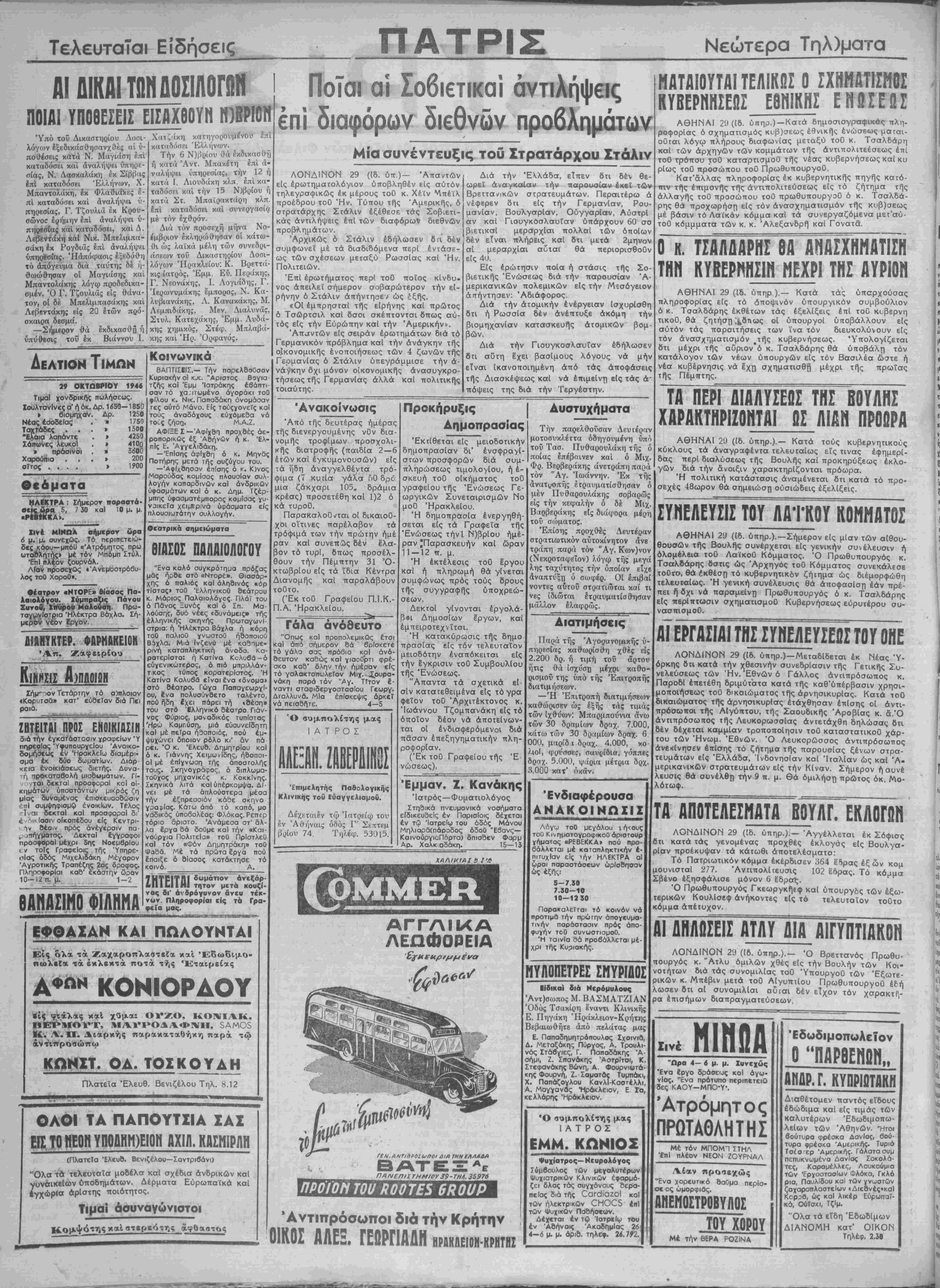 Λόγω τοθ μεγάλου ή<ους τοϋ Κινημοτογροφικοΰ άριοτουρ γΑματος «ΡΕΒΕΚΚΑ» πού προ- θάλλεται μέ καταπληκτικήν ε¬ πιτυχίαν είς την ΗΛΕΚΤΡΑ αί ωραι παραοτάσεων ωρίσθησαν ώς εξής: 5-7.30 7.50-10 10-12 50 ΠαρακαλεΤται τό κοινόν νό προτιμα την πρώτην απογευμα¬ τινήν παράστασιν πρός απο¬ φυγήν τοϋ ουνωστισμοθ. Ή ταινΐα θά προβόλλετοι μέ¬ χρι τής Κυριακής. ΝΥΛΟΠΕΤΡΕΣ ΣΝΥΡΙΔΟΣ ΒΙδικαΙ διά Ννρόμυλους Αντ)σωπος Μ. ΒΑΣΜΑΤΖΙΑΝ Όδος Τσακίρη έναντι Κλινικής Ε. Πηγάκη Ήράκλειον-Κρήτης Βεβαιωθήτε άπό πελάτας μας Ε. Παπαδημητρόπουλος Σχοινια, Δ. Μεταξάκης Πυργος, Α. Τροκλι- νάς Στάβγιες, Γ. Παπαδάκης Ά· σήμι, Ζ. Σπανάκης 'ΑστρΙτοι, Κ. Στεφανάκης Βώνη, Α Φουρνιυτά- κης Φουρνή, Ζ. Σοματος Τυμπάκι, Χ. Παπάζογλου Κανλί-Καστέλλι, Α. Μαγγανας Ηράκλειον, Ε Σα, κελλάρης "Ηράκλειον. Ό συμπολίτης μας ΙΑΤΡΟΣ ΕΜΜ. ΚΩΝΙΟΣ Ψυχίατρος— Νευρολό γος Χύμβουλος των μεγολυτέρων Φυχιατρικων Κλινικών έφαρμό- ζει όλος τάς συγχόνους βερα- πεΐας διά τής ΟαιτΙιαζοΙ κοΐ των ήλεκτρ'κών 0ΗΟ05 επί των Ψυχικόν Παβήσεων. Δέχ«ται έν τφ Ιατρείω τού έν Αθήναις 'ΑκοδημΙας 26 4—έ μ. μ. άριδ. τηλεφ. 76.197. ΜΑΤΑΙΟΥΤΑΙΤΕΛΙΚΩΣ Ο ΣΧΗΜΑΤΙΣΝΟΣ ΚΥΒΕΡΗΗΣΕΠΣ Ε8Η1ΚΗΣ ΕΝΩΣΕΩΣ ΑΘΗΝΑΙ 29 (Ιδ. ύτιηρ.) — Κατά δημοσιογραφικάς πλη- ροφορίας ό σχηματισμός κυβ)σεως έθνικής ενώσεως μαται- οθται λόγω πλήρους διαφωνίας μεταξύ τοθ κ. Τσαλδάρη καϊ των άρχηγών των κομμάτων τής άντιπολιτεέσεως επί τοθ τρόπου τοθ καταρτισμοθ τής νέας κυβερνήσεως καί κυ ρΐως τοθ προσώπου τοθ ΠρωθυπουργοΟ. Κατ'άλλας πληροφορίας έκ κυβερνητικής πηγής κατό- την τής έπιμονής τής αντιπολιτεύσεως είς τό ζήτημα τής άλλαγής τοϋ προσώπου τοΟ πρωθυπουργοΟ ό κ. Τσαλδά- ρης θά προχωρήστι είς τόν ανασχηματισμόν τής κυβ)σεως μέ βάσιν τό Λαϊκόν κόμμα καί τα συνεργαζόμενα μεΐ'αύ- τοΟ κόμμματα των κ. κ. Άλεξανδρή καί Γονατδ. Ο κ. ΤΣΑΛΔΑΡΗΣ ΘΑ ΑΝΑΣΧΗΜΑΤΊΣΗ ΤΗΝ ΚΥΒΕΡΝΗΣΙΝ ΜΕΧΡΙ ΤΗΣ ΑΥΡΙΟΝ ΑΘΗΝΑΙ 29 (ίδ. ύπηρ ).— Κατά τάς υπαρχούσας πληροφορίας είς τό άποψινόν υπουργικόν συμβούλιον ό κ. Τσαλδάρης έκθετον τάς έξελίξεις επί τού κυβερνη τικοϋ, θά ζητήση ,Ι,βτιως οί ύπουργοί ύποβάλλουν είς αυτόν τάς πορσιτήσεις των 'ινα τόν διευκολύνουν είς τόν ανασχηματισμόν φτής κυβερνήσεως. εγπολογ[ζεται 8τι μέχρι τής αυριον ό κ. Τσαλδάρης θά υποβάλη τόν κατάλογον των νέων ύπουργών είς τόν Βασιλέα ωστε ή νέα κυβέρνησις νά έχη σχηματισθή μέχρι τής πρωΐας τής Πέμπτης. ΤΑ ΠΕΡΙ ΔΙΑΛΥΣΕΩΣ ΤΗΣ ΒΟΥΛΗΣ ΧΑΡΑΚΤΗΡΙΖ0ΗΤΑ1 ΩΣ ΛΙΑΝ ΠΡΟΩΡΑ ΑΘΗΝΑΙ 2) (ίδ. ύπηρ.).— Κατά τούς κυβερνητικοΰς κύκλους τα αναγραφέντα τελευταίως είς τινάς εφημερί¬ δας περί διαλύσεως τής Βουλής καί προκηρύξεως έκλο- γών διά την άνοιξιν χαρακτηρΐζονται πρόωρα. Ή πολιτική κατάστασις άναμένεται δτι κατά τό προ¬ σεχές 48ωρον θά σημειώση ούσιώδεις έξελίξεις. ΣΥΝΕΛΕΥΣΙΣ ΤΟΥ ΛΑΪΚΟΥ ΚΟΜΜΑΤΟΣ ΑΘΗΝΑΙ 2ΰ (Ιδ. ύπηρ.).—Σήμερον είς μίαν των αίθου- θουσών τής Βουλής συνέρχεται είς γενικήν συνέλευσιν ή όλομέλεια τοθ ΛαίκοΟ Κόμματος. Ό Πρωθυπουργός κ. Τσαλδάρης δστις ώς Άρχηγός τοϋ Κόμματος συνεκάλεσε τουτο, θά έκθέστι, τό κυβερνητικόν ζήτημα ώς διέμορφώθη τελευταίως. Ή γενική συνέλευσις θά αποφασίση εάν πρέ- πει γ) δχι νά παραμείνη Πρωθυπουργός ό κ. Τσαλδάρης είς περίπτωσιν σχηματισμοθ Κυβερνήσεως εύρυτέρου συ- νασπισμοΟ. αΤεΡΓΑΣΙΑΙ ΤΗΣ ΣΥΝΕΛΕΥΣΕΩΣ ΤΟΥ ΟΗΕ ΛΟΝΔΙΝΟΝ 29 (ίδ. ύτιηρ.)-Μεταδίδεται έκ Νέας "Υ¬ όρκης δτι κατά την χθεσινήν συνεδρίασιν τής Γετικής Συ¬ νελεύσεως των Ήν. "Εθνών ό Γάλλος άνηπρόσωπος κ. Παροδί επετέθη δριμύτατα κατά τής καθ'ύπέρβασιν χρη