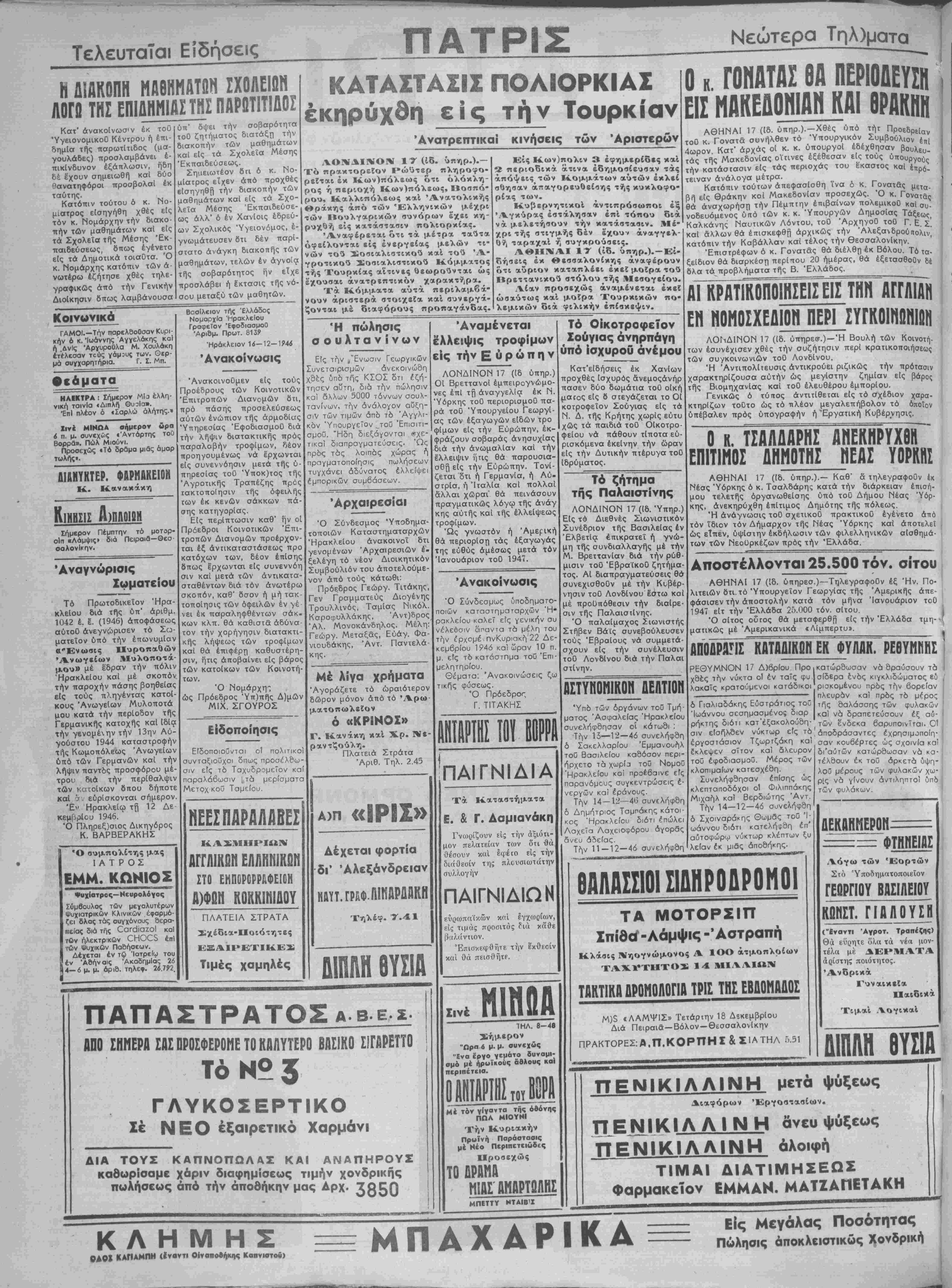 Πρόεδρος Γεώργ, Τιτάκη<:, Γεν Γραμματεύς Δΐογένης Τρουλλινός, ΤαμΙας Νικόλ. Καροφυλλάκης, Άντ)δρος Άλ. Μονοκάνδηλος. Μέλη: Γεώργ. Μεταξάς, Εύαγ. Φα- νιουδάκης, Άντ. Παντελά- κης. Μέ λίγα χρήματα Άγοράζετε τό ώραιότερον δώρον μόνον άπό τό Άρω- ματοπωλεΐον ό «ΚΡΙΝΟΣ» Γ. Κανάκη καί Χρ. Νε- ραντζούλη. Πλατειά Στράτα Αριθ. Τηλ. 2.45 «ΙΡΙΣ» Δέχεται φορτία δι* Αλεξάνδρειαν ηγλυτ. γρ^φ ΑΙΠΑΡΠΑΚΗ Τηλέφ. 7.41 βΙΙΪΛΗ ΘΥΣΙΑ ΤΤΑΠΑΣΤΡΑΤΟΣ α β ε - ΑΠΟ ΣΗΝΕΡΑ ΣΑΣ ΠΡΟΣΦΕΡΟΜΕ ΤΟ ΚΔΛΥΤΕΡΟ ΒΑΣΙΚΟ ΣΙΓΔΡΕΤΤΟ ΓΛΥΚΟΣΕΡΤΙΚΟ ΝΕΟ έξαιρετικό Χαρμάνι ΔΙΑ ΤΟΥΣ ΚΑΠΝΟΠΩΛΑΣ ΚΑΙ ΑΝΑΠΗΡΟΥΣ καθωρίσαμε χάριν διαφημίσεως τιμήν χονδρικής -πωλήσεως άπό την αποθήκην μας Δρχ. 3850 Άναμένεται έλλειψις τροφίμων είς την Ευρώπην ΛΟΝΔΙΝΟΝ 17 (ίδ ύπηρ.) Οί Βρεττανοί έμπειρογνώμο- νες επί τή άναγγελία έκ Ν. Υόρκης τοϋ περιορισμοϋ πα- ρά τοϋ ΎπουργεΙου Γεωργί¬ ας των έξαγωγών εΐδών τρο φίμων είς την Ευρώπην, έκ- φράζουν σοβαράς ανησυχίας διά την ανωμαλίαν καΐ την έλλειψιν ήτις θά παρουσια¬ σθή είς την Ευρώπην. ΤονΙ- ζεται δτι ή ΓερμανΙα, ή Αύ- στρία, ή Ιταλία καΐ πολλαί άλλαι χώραι' θά πεινάσουν πραγματικώς λόγω τής άνάγ κης αυτής καΐ τής ελλείψεως τροφίμων. Ώς γνωστόν ή Άμερική θά περιορίση τάς έξαγωγάς της ευθύς άμεσος μετά τόν Ιανουάριον τοΟ 1947. Ανακοίνωσις Ό Σύνδεσμως υποδηματο- ποιών καταστηματαρχών Η¬ ρακλείου καλεΐ είς γενικήν συ νέλεύσιν άπαντα τό μέλη τού την έρχομέ ΠνΚυριακή 22 Δε¬ κεμβριού 1946 καί ώραν 10 π. μ. είς τό κατάστπμα τού "Επι- μελητηρίου. Θέματα. Άνακοινώσεις ζω τικης φύσεως. Ό ΠρόεδρθΓ Γ. ΤΙΤΑΚΗΣ ΠΑΙΓΝΙΔΙΑ Τα Καταστήματα Ε. & Γ. Δαμιανάκη Γνωρίζουν είς την αξιότι¬ μον πελατείαν των ότι θά θέσοχιν καί εφέτο είς την διάθεσιν της πλουσιωτάτην συλλογήν ΠΑΙΓΝΙΔΙΩΝ εύρωπαίκών κοί εγχωρίων, είς τιμάς προσιτας ?ιά κάθε β'^/.άντιον. Επισκεφθήτε την εκθεοίν καί θά πεισθήτε. Τό ΟίκοτροφεΤον Σούγιας άνηρπάγη υπό ίσχυροϋ ά νέ μου Κατ'είδήσεις έκ Χανίων προχθές Ισχυρός άνεμοςάνήρ πασεν δύο δωμάτια τοΟ οΐκή μαΐος είς δ σΐεγάζεται το Οί κοτροφεΐον Σούγιας είς τα Ν. Δ. τής Κρήτης χωρίς εύτυ χώς τα παιδία τοΟ Οίκοτρο- φεΐου νά πάθουν τίποτα ευ¬ ρισκόμενα εκείνην την ώραν είς την Δυτικήν πτέρυγα τοϋ ίδρύματος. Τό ζήτημα τής Παλαιστίνης ΛΟΝΔΙΝΟΝ 17 (Ιδ. Ύπηρ.) Είς τό Διεθνές Σιωνιστικόν Συνέδριον τής ΒασιλεΙας έν Ελβετία έπικρατεΐ ή γνώ- μη τής συνδιαλλαγής μέ την Μ. Βρεττανίαν διά την ρύθ¬ μισιν τοΟ ΈβραϊκοΟ ζητήμα¬ τος. ΑΙ διαπραγματεύσεις θά συνεχισθοθν μέ την Κι,βέρ νησιν τοΟ ΛονδΙνου έστω καΐ μέ προϋπόθεσιν την διαίρε- σιν τής Παλαισιίνης. Ό παλαΐμαχος Σιωνιστής Στήβεν Βάις συνεβούλευσεν τούς 'Εβραίους νά συμμετά- σχουν είς την συνέλευσιν τοΟ ΛονδΙνου διά την Πάλαι στίνην. ΤΗΛ. 8-48 Σήμερον "Ωρα ό μ. μ. ουνεχως "Ενα έργο ν,εμάτο δυναμι- σμό μέ ήροϊκοΰς αολους καΐ περιπέτεια. Ρ ΑΗΤΑΡΪΗΣ τού ΒΟΡΑ Μ έ τόν γίγαντα της όβόνης ΠΩΛ ΜΙΟΥΝΙ Την Κυριακήν Πρωΐνή Παράστασις μέ Νέο Περιπετειόδες Προσεχώς ΤΟ ΟΡΑΗΑ ΗΊΑΣ ΑΜΑΡΤΩΛΒΣ ΜΠΕΤΤΥ ΗΤΑΙΒΊ ΒΣΤΥΝΟΗΙΚΟΗ ΠΕΛΤΙΟίΙ ιΥπό των όργάνων τοϋ Τμή ματος Ασφαλείας Ηρακλείου συνελήφθησαν οί κάτωθι : Την 13—12 — 40 συνελήφθη ό Σακελλαρίου Εμμανουήλ τού ΒασιλεΙου καθόσον περι- ήρχετο τα χωρία τού Νομοϋ Ηρακλείου κοΐ προέβαινε είς παρανόμους συγκεντρώσεις έ- νεργών καί έράνους. Την 14—12—40 συνελήφθη ό Δημήτριος Τσμπάκης κάτοι- κος Ηρακλείου διότι επώλει Λαχεΐα Λαχειοφόρου άγορδς άνευ αδείας Την 11—12—46 συνελήφθη νοδευόμενος υπό των κ. κ. Ύπουργών Δημοσίας Καλκάνης Ναυτικών Λόντου, τοϋ Ά