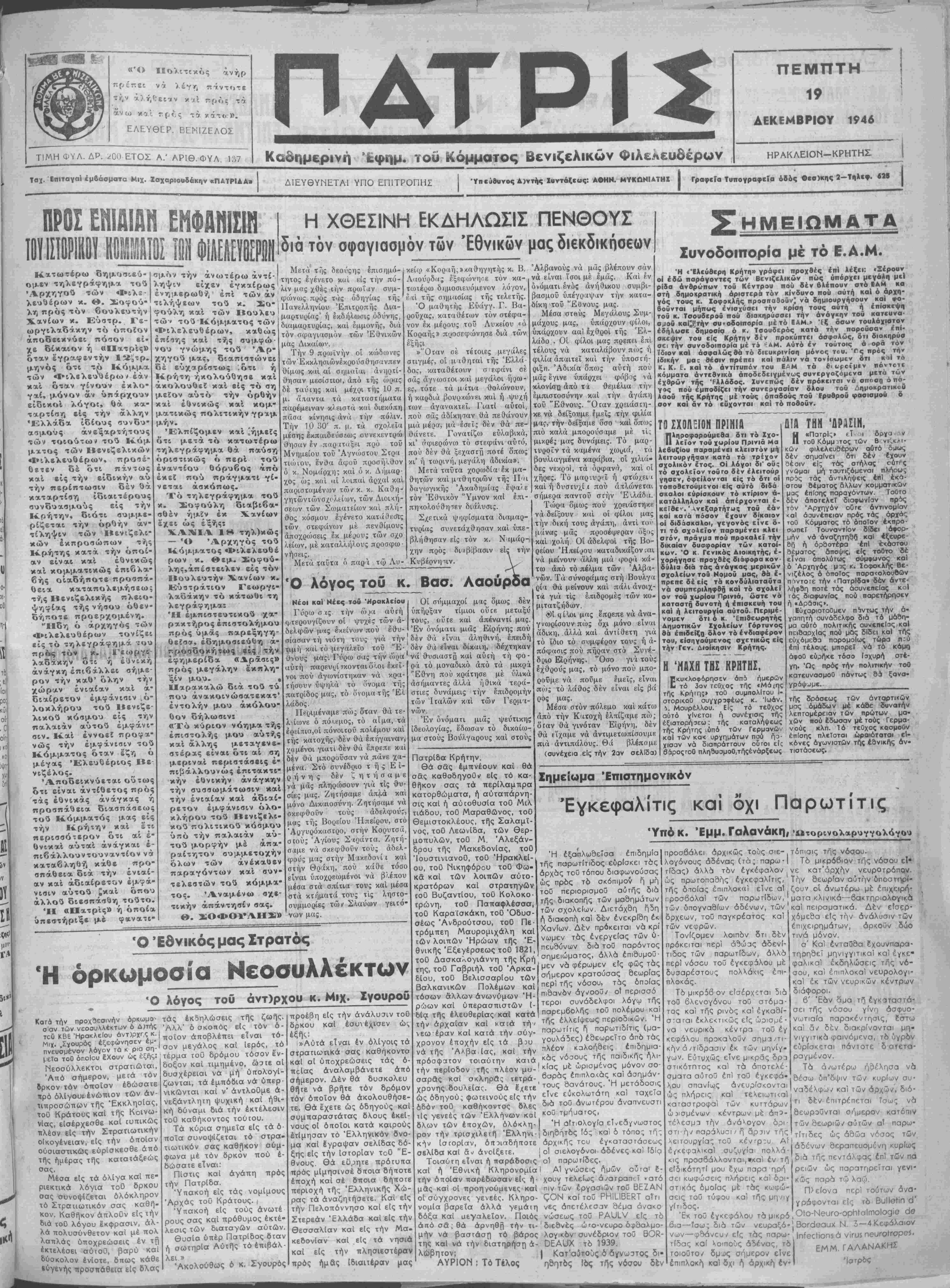 Κοδημερινή Έφημ. «ου Κόμματος Βενιζελικήν Φιλελεύθερον