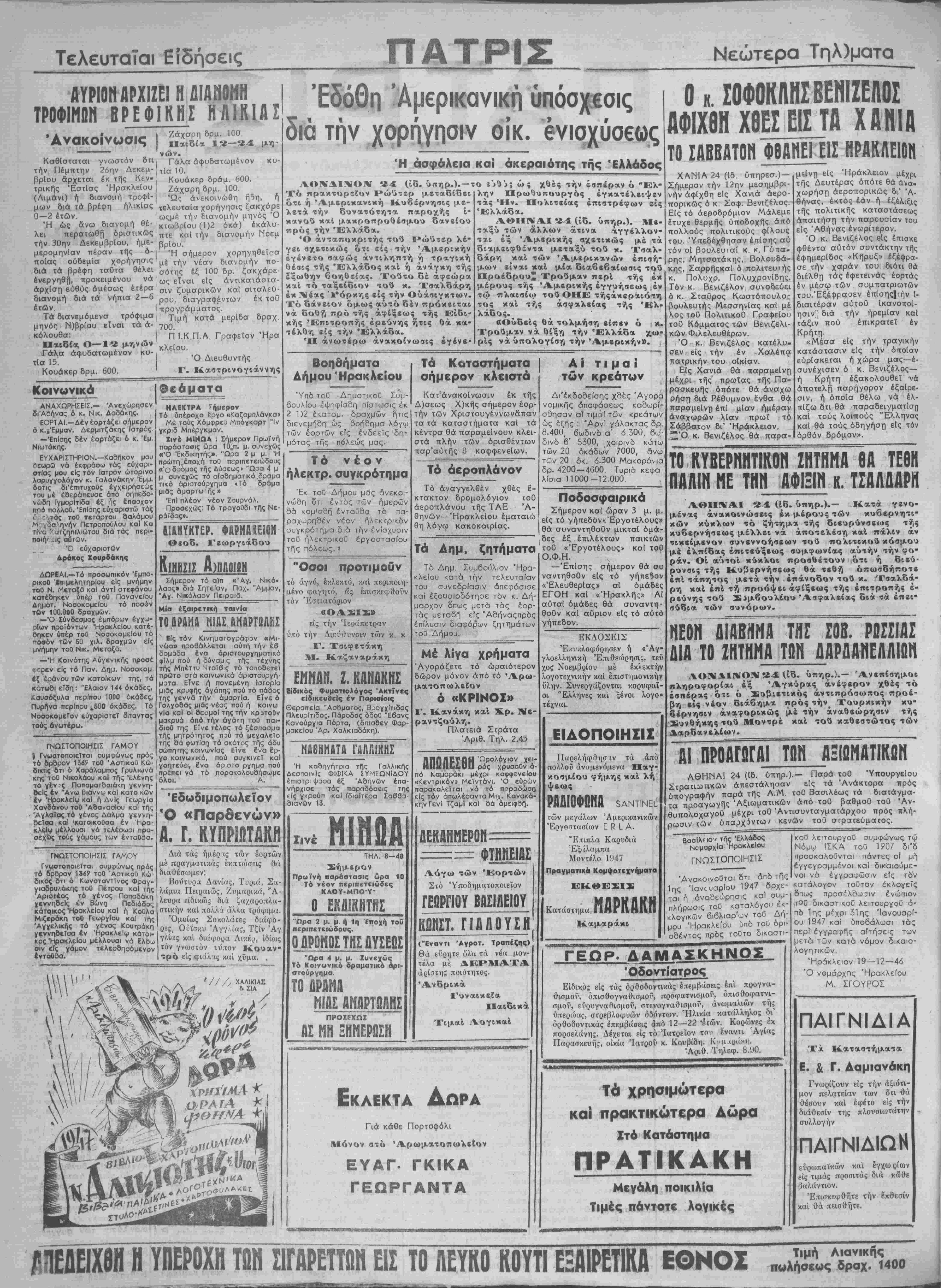 Παρασκευής, οίκία Ίατροΰ κ. Καυβίδη. Κ·<μ^ουνΐϊ. Αριθ. Τηλεφ. 8.90. χρπσιμώτερα καί πρακτικώτερα Λώρα Στό Κατάστημα ΠΡΑΤΙΚΑΚΗ Μεγάλη ποικιλία , Τιμές πάντοτε λογικάς κού λειτουργοϋ συμφωνως τώ Νομώ ΙΣΚΑ τού 1907 δΓδ προσκαλοΰνται πάντες οί μή εγγεγραμμένοι καί δικαιούμε¬ νοι νά έγγραφώσιν είς τό'ν τούτον έκλογεΤς δπως προσέλδωαιν ενώπιον δικαστικοΰ λειτουργοϋ ά- ργ πό 1ης μέχρι 31ης ΊανουαρΓ- ου 1947 καί υποβάλωσι περ! έγγραρης αίτήσεις τάς των μετά των κατά νόμον δικαιο· λογητικών. Ηράκλειον 19—12—46 Ό νομάρχης Ηρακλείου Μ. ΣΓΟΥΡΟΣ " ΠΑΙΓΝΙΔΙΑ Τά Καταστήματα Ε. & Γ. Δαμιανάκη Γνωρίζουν είς την αξιότι¬ μον πελατείαν των ότι θά θέσουν καί εφέτο είς την διάθεσιν της πλουσιωτάτην συλλογήν ΠΑΙΓΝΙΔΙΩΗ εύρωπαίκών καί εγχωρίων είς τιμάς προσιτάς διά κάθε βαλάντιον. Επισκεφθήτε την «ίκθεσίν καί θά πεισθήτε. ΑΠΕΔΕΙΧΘΗ Η ΥΠΕΡΟΧΗ ΤΩΝ ΣΙΓΑΡΕΤΤΩΝ ΕΙΣ ΤΟ ΛΕΥΚΟ ΚΟΥΤΙΕΞΑΙΡΕΤ1ΚΑ -ΟΝΟΣ Τιμή Λιανικης πωλήσεως δραχ. 1400