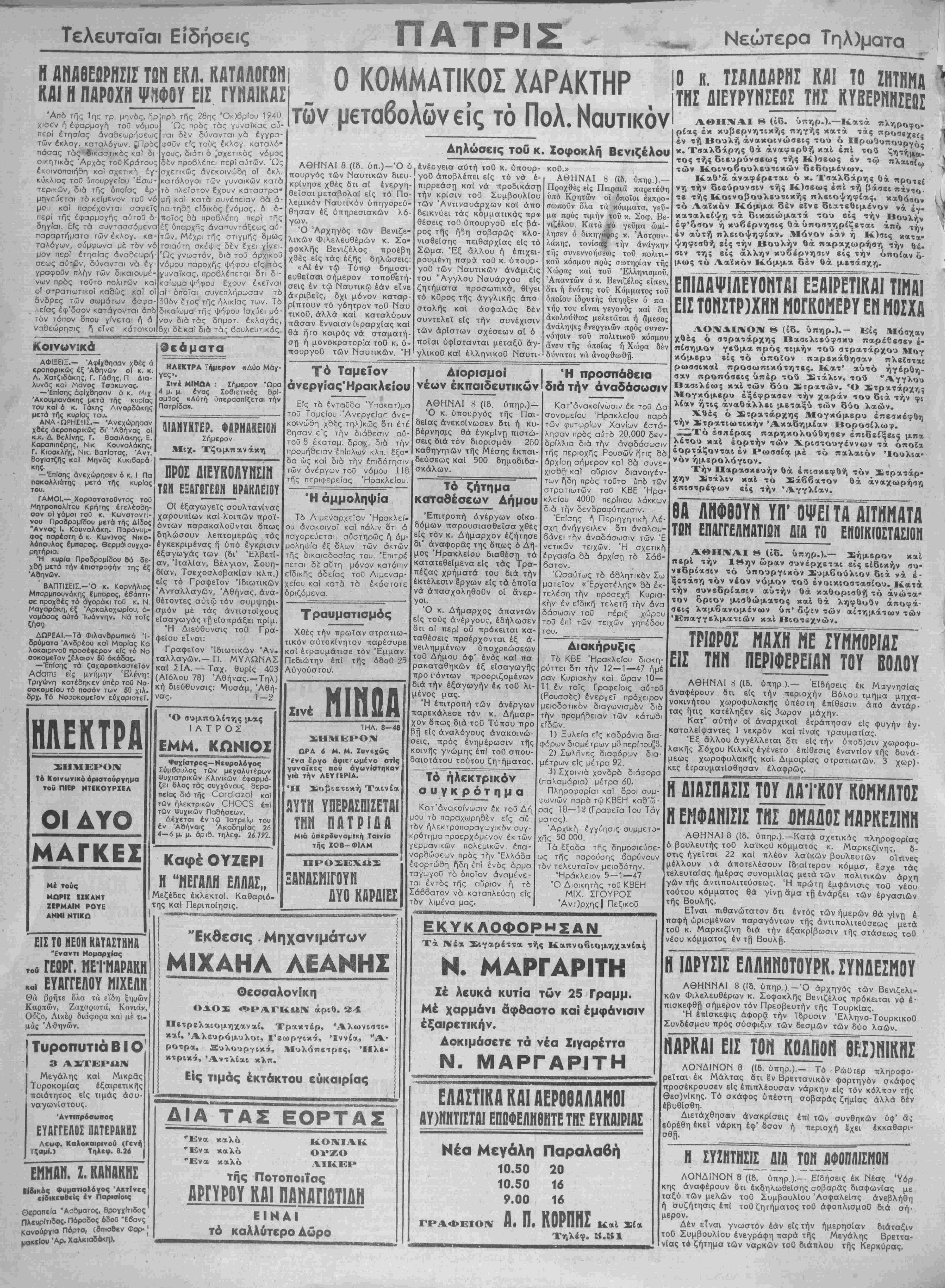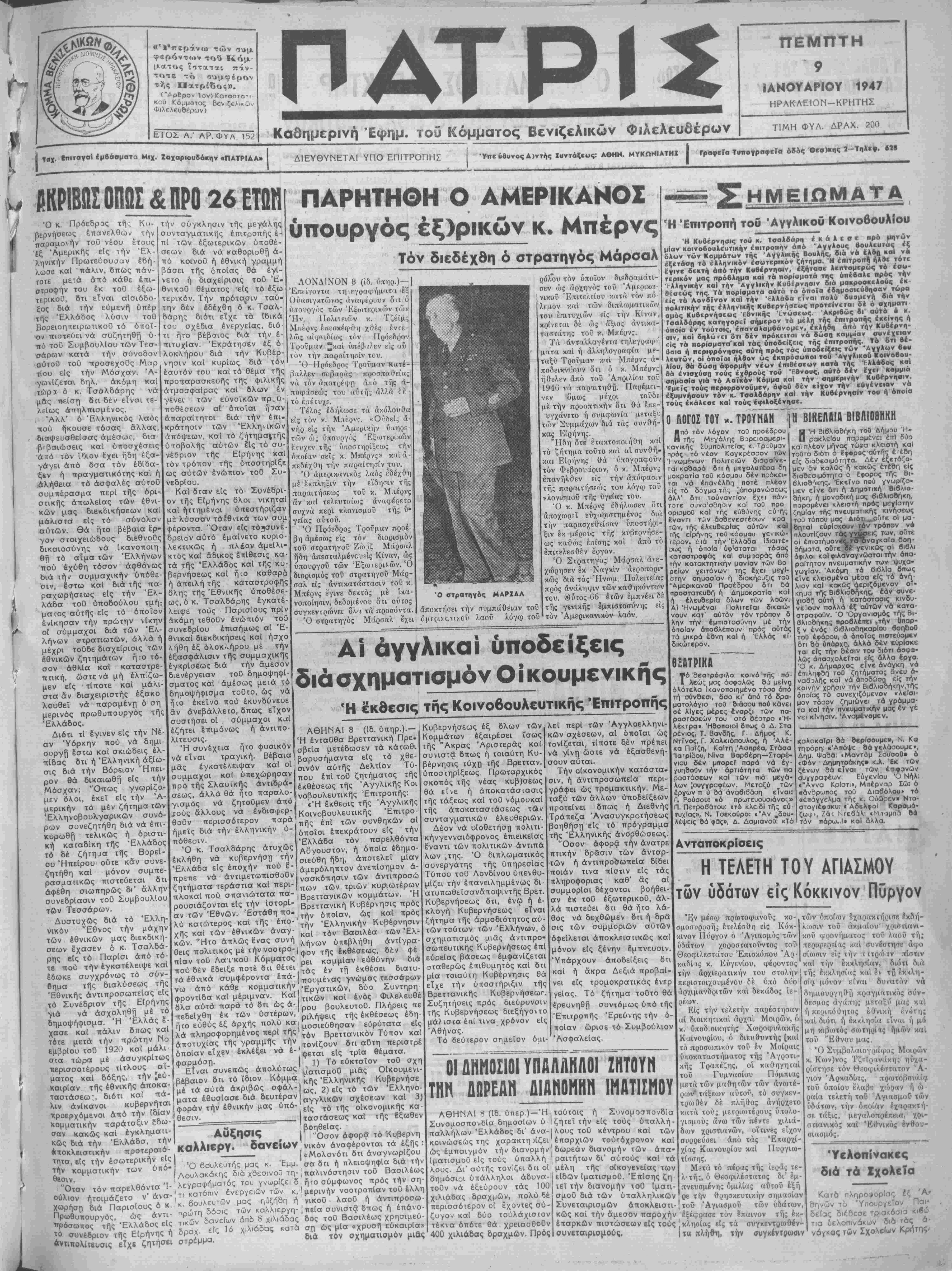 "<οΟ Κώμμοτος Βενιζελικήν Φιλελευθέρων) Ε.ΤΟΣ Α.' ΑΡ. φΤλ~Τ~ ΠΔΤΡΙ Καθημερινή Εψημ. τού Κόμματος Βενιζελικήν ΦιΑελευδέρων ΠΕΜΓΤΤΗ * 9 ΙΑΝΟΥΑΡΙΟΥ 1947 ΗΡΑΚΛΕΙΟΝ-ΚΡΗΤΗΣ ΤΙΜΗ ΦΥΛ. ΔΡΑΧ. 200 | ταχ. ΕπιταγαΙ έμβάοματα Μιχ. Ζαχαριουδάκη «ΠΑΤΡΒΛΑ» ΔΙΕΥΘΥΝΕΤΑΙ ΥΠΟ ΕΠΙΤΡΟΠΗΣ 'Υηε 6βυνοςΑ)ντής Συντάξεως: ΑΘΗΝ. ΜΥΚΩΝΙΑΤΗΧ Ι ΓραφεΓα ΤυπογραφεΓα όδβς ·ΐΌ)κης 2-Τΐ|λει·. «28 Ό κ. Πρόεδρος τή, Κυ¬ βερνήσεως επανελθών την παραμονήν τοθ νέου ετους 'έξ Άμερικής είς ιήν Ελ¬ ληνικήν Πρωτεύουσαν έδή λωσε καί πάλιν, δπως πάν- τοτε μετά άπό κάθε επι¬ στροφήν τού έκ τοΟ έξω- τερικοό, δτι είναι αΐσιόδο- ξος διά την εύμενή υπέρ τής Ελλάδος λύσιν τοθ ΒορειοηπειρωτικοΟ τό όποι¬ αν πιστβύει νά συζητηθή υ¬ πό τοθ ΣυμβουλΙου των Τ>σ-