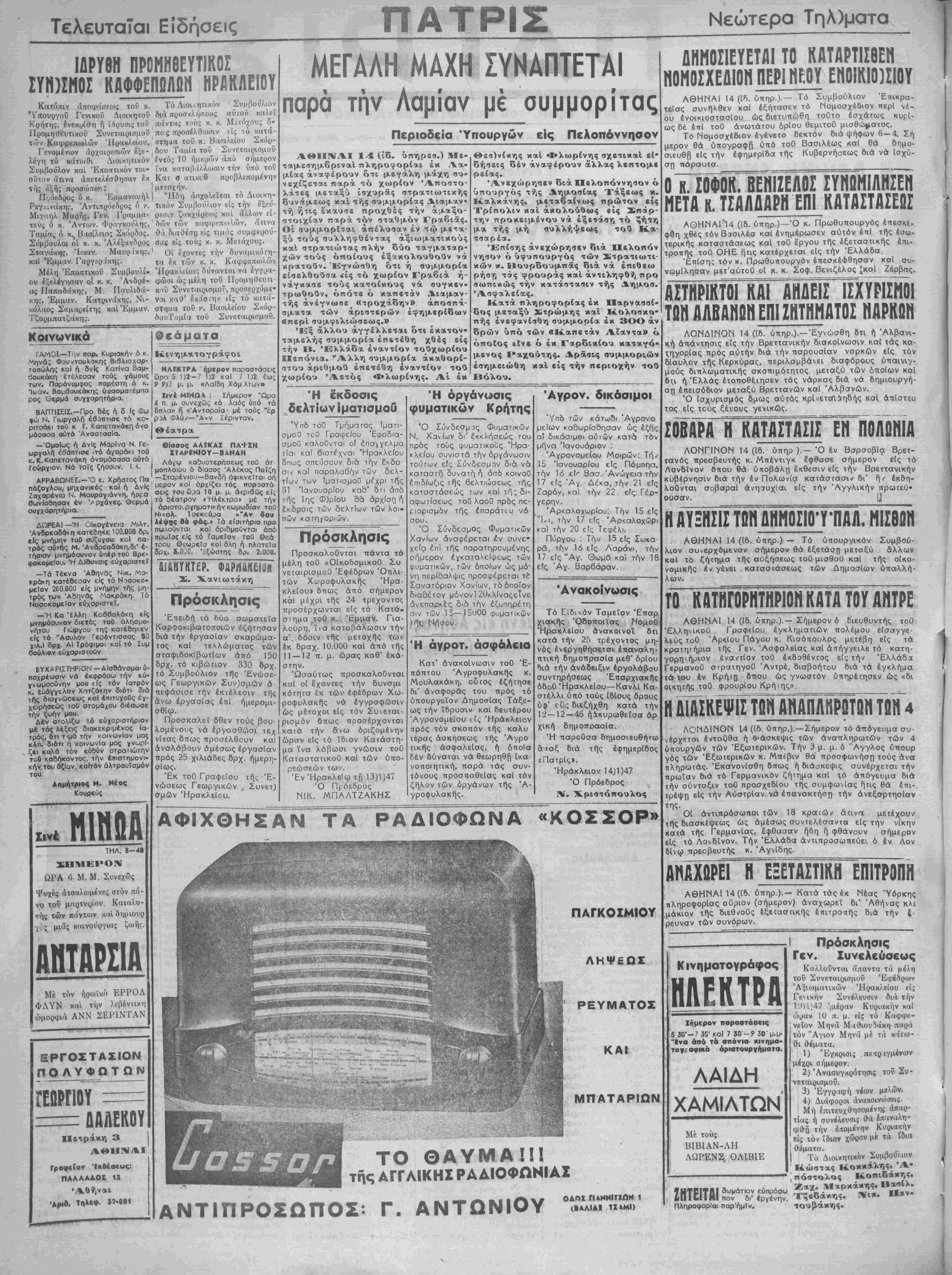 "Ι*ι, την 17 είς Άρ<αλοχώρι καΐ την 20 είς Τεφέλι. Πύργου Την 15 είς Σωκα ρά, την 16 είς Λαράνι, την 17 είς "Αγ Θωμά καΐ την 18 είς Αγ Βάρβαρον Ανακοίνωσις Τό Ειδικόν Ταμείον Έπαρ χιακής Όδοποιιας ΝομοΟ Ηρακλείου ανακοινοί δτι κατά την 25 τρέχοντος μη¬ νός ενεργηθήσεται έπαναλη- πτική δημοπρασΐα μεθ' όρίου διά την άνάδβιξιν έργολόβου συντηρήσεως 'Επαρχιακής όδοθ "Ηρακλείου—Κανλί Κα¬ στέλλι υπό τούς ίδίους δρους ύφ" οϋς διεξήχθη κατά την 12—12—46 ήλκυρωθεΐσα άρ χική δημοπραοΐα. Ή παροθσα δημοσιευθήτω άπαξ διά τής εφημερίδος «Πατρίς». Ηράκλειον 14)1)47 Ό Πρόεδρος Ν. Χριατόπουλος ΑΦΙΧΘΗΣΑΝ ΤΑ ΡΑΔΙΟΦΩΝΑ «ΚΟΣΣΟΡ» ΠΑΓΚΟΣΜΙΟΥ ΛΗΨΕΩΣ ΡΕΥΜΑΤΟΣ ΚΑΙ ΜΠΑΤΑΡΙΩΝ ΤΟ ΘΑΥΜΑΠ1 τής ΑΓΓΛΙΚΗΣ ΡΑ ΑΙΟΦΩΝΙΑΣ ΑΝΤ1ΠΡΟΣΩΠΟΣ: Γ. ΑΝΤΩΝΙΟΥ ΟΔΟΙ ΡΙΑΜΝΙΤΙΛΜ 1 (ΒΑΛΙΑΙ ΤΖΑΜΙ) ΔΗΜΟΣΙΕΥΕΤΑΙ ΤΟ ΚΑΤΑΡΤΙΣΘΕΝ ΝΟΜΟΣΧΕΔΙΟΝ ΠΕΡΙ ΗΕΟΤ ΕΗ0ΙΚΙ01ΣΙ0Υ ΑΘΗΝΑΙ 14 ((3. ύπηρ.)·— Τό Συμβούλιον Έπικρα- τεΐας συνήλθεν καί εξήτασεν τό Νομοσχέδιον περί νέ- ου ενοικιοστασίου ώς διετυπώθη τουτο εσχάτως κυρΐ- ως δέ επί τοϋ ανωτάτου όρίου θεμιτοθ μισθώ|ΐατος. Τό Νομοσχέδιον εγένετο δεκτόν διά ψήφον 6—4. Σή μερον θά υπογραφή υπό τοθ Βασιλέως καΐ θά δημο¬ σιευθή είς την εφημερίδα τής Κυβερνήσεως διά νά Ισχύ¬ ση πόραυτα._________________________ Ο ΊΠθΊΏΙΖΕΛΟΣ ΣΥΗΩΜΙΛΗΣΕΗ ΜΕΤΔ κ. ΤΣΑΛΔΑΡΗ ΕΠΙ ΚΑΤΑΣΤΑΣΕΩΣ ΑΘΗΝΑΙΊ4 (ίδ. ύπηρ )—Ό κ. Πρωθυπουργός επεσκέ¬ φθη χθες τόν Βασιλέα κ.αΐ ένημέρωσεν αυτόν επί τής έσω- τερικής καταστάσεως καΐ τοθ έ'ργου τής έξετασΐικής έπι- τροτιής τού ΟΗΕ ήτις κατέρχεται είς την Έλλάδα ΈπΙση; τόν κ. Πρωθυπουργόν επεσκέφθησαν κσί συ- νωμίλησαν μετ'αότοϋ οί κ. κ. Σοφ. Βενιζέλος [καί Ζέρβας. ΑΣΤΗΡΙΚΤΟΙ ΚΑΙ ΑΗΔΕΪΣ ΙΣΧΫΡΪΣΜΟΙ ΤΩΝ ΑΛΒΑΗΩΗ ΕΠΙ ΖΗΤΗΜΑΤΟΣ ΝΑΡΚΩΝ ΛΟΝΔΙΝΟΝ 14 (Ιδ. ύπηρ.).—"Εγνώσθη »τι ή Άλβανι- κή απάντησις είς την Βρεττανικήν διακοίνωσιν καΐ τάς κα- τηγορίας πρός αυτήν διά την παρουσίαν νσρκών είς τόν δίαυλον τής Κερκύρας, περιλαμβάνει διαφόρους ύπαινιγ- μούς διπλωματικής σκοπιμότητος μεταξύ των οποίων καί δΐι ή "Ελλάς έτοποθέιησεν τάς νάρκας διά νά δημιουργή¬ ση επεισόδιον μεταξύ Βρεττανών καί Άλβανών. Ό Ισχυρισμός δμως αύτός κρίνετοΛίίηδιΊς καΐ άπίστευ τος είς τους ξένους γενικώς. ΣθΐΑΤΓίΙΙΜΜΤΓπθΛΩΝΙΑ ΛΟΝΠΝΟΝ 14 (Ιδ. ύπηρ ) — Ό έν Βαρσοβία Βρετ- τανός πρεοβευτής κ. Μπέντιγκ έφθασε σήμερον είς τό Λονδίνον δπου θά υποβάλη έκθεσιν είς την Βρεττανικήν κυβέρνησιν διά την έν Πολωνία κατάστασιν δι" τ^ έκδη- λοθνται σοβαραί άνησυχιαι είς την Αγγλικήν πρωτεύ¬ ουσαν. ] Η ΑΥΞΗΣΙΣ ΤΩΝ ΔΗΜΟΣ1ΟΤΠΑΛ. Μ1ΣΘΡΗ ΑΘΗΝΑΙ 14 (Ιδ. ϋπηρ.) — Τό υπουργικόν Συμβού¬ λιον συνερχόμενον σήμερον θά εξετάση μεταξύ άλλων καί τό ζήτημα τής αυξήσεως τοϋ μισθοΰ καί τής οΐκο- νομικής έν γένει καταστάσεως των Δημοαίων ύπαλλή- λων. ΤΟ ΚΑΤΗΓΟΡΗΤΗΡ1ΟΗ ΚΑΤΑ ΤΟΥ ΑΝΤΡΕ ΑΘΗΝΑΙ 14 (Ιδ. ύπηρ.).— Σήμερον ό διευθυντής τοΟ ΈλληακοΟ Γραφείου έγκληματιών πολέμου είσαγγε- λεϋς τοθ Άρείου Πάγου κ. Κισόπουλος μετέβη είς τα κρατητήρια τής Γεν. Ασφαλείας καί άπήγγειλε τό κατη- γορηιήμΐον εναντίον τοθ έκδοθέντος είς την "Ελλάδι Γερμανοϋ στρατηγοϋ Άντρέ, διαβοήτου διά τα έγκλήαα τα τού έν Κρηιρ, ΰπου ώς γνωστόν ύπηρέτησεν ώς «δι οικηΐής τοθ φρουρΐου Κρήιης». Η ΔΙΑΣΚΕΨΙΣ ΤΩΝ ΑΗΑΠΛΗΡ8ΤΩΗ ΤΩΝ 4 ΛΟΝΔΙΝΟΝ 14 (ίδ ύπηρ,)—Σήμερον τό άπόγβυμα συ έρχεται ένταθθα ή διάσκεψις των άναπληρωτών των 4 ύπουργών των Εξωτερικών. Την 3 μ. μ ό "Αγγλος υπουρ γός των "Εξωτερικών κ. Μπέβιν θά προσφωνήση τούς άνα πληρωτάς. Εκανονίσθη δπως ή διάσκεψις συνέρχεται την πρωΐαν διά τό Γερμανικόν ζή-ημα καί
