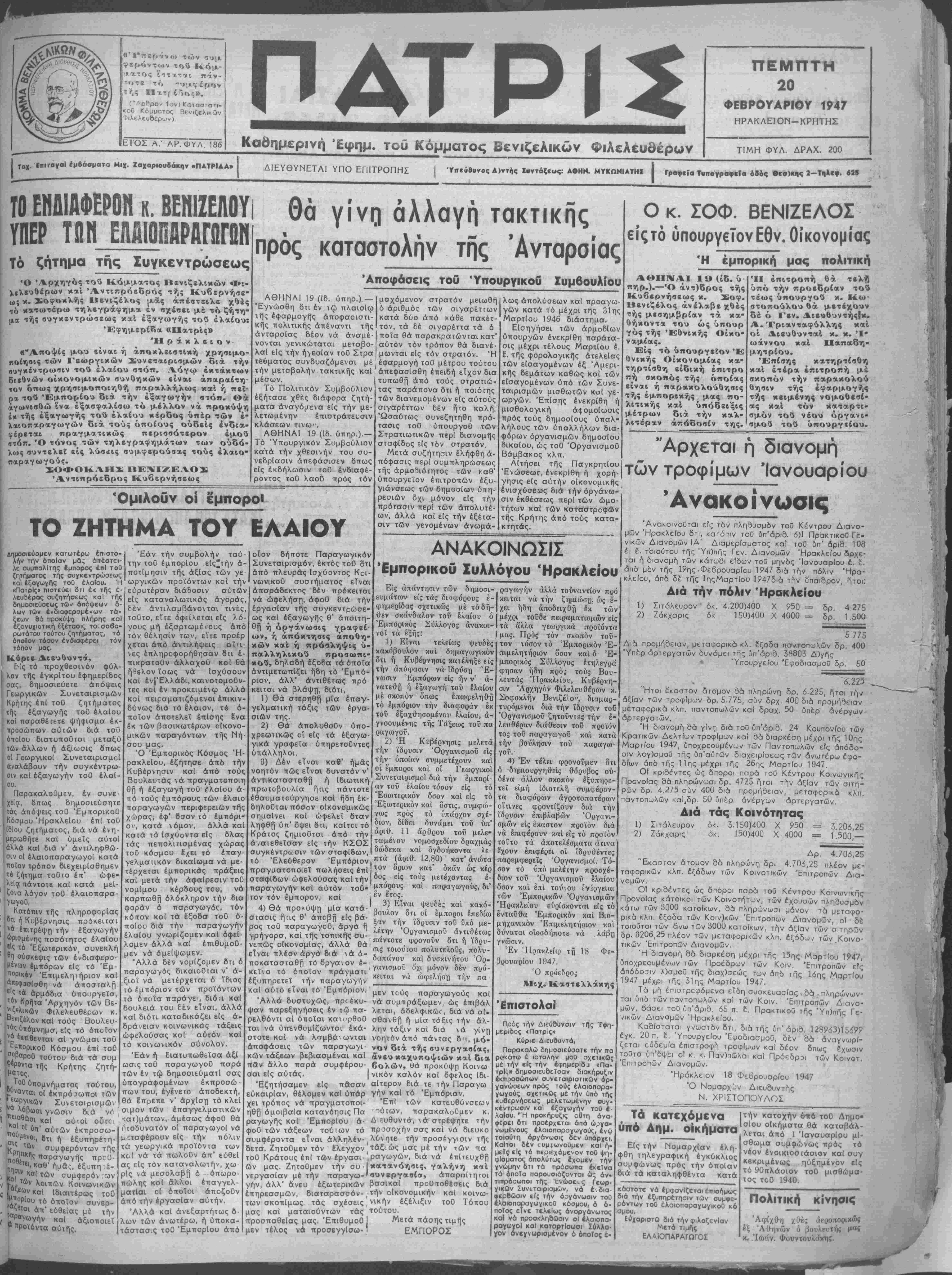 κλάσεων τινω<. ΑΘΗΝΑΙ 19 (Ιδ. ΰπηρ.).- Τό Υπουργικον Συμβούλιον κατά την χθεσινήν τού συ¬ νεδρίασιν απεφάσισεν δπως είς εκδήλωσιν τοθ ένδιαφέ- ροντος τοθ λαοΟ πρός τόν Όμιλοΰν οί εμποροΐ ΤΟ ΖΗΤΗΜΑ ΤΟΥ ΕΛΑΙΟΥ Δημοσιεύομεν κατωτέρω επιστο¬ λήν την όποιαν μας απέστει¬ λε ουμπολΐτης ίμπορος επί τοθ ζηΐήματος τής συγκεντρώσεως κοΙ έξογωγής τού ελαίου. Ή «Πατρίς» πιοτεύει ότι έκ τής έ λευοέρας συζητήσεως καΙ τή' δημοοιεύσεως τώ/ άπόψεων δ λων των ενδιαφερομένων τα ξεων θά προκύψο, πλήρης κα εξονυχιοτική έξέτασις τοΐσοβα ρωτάτου τούτου ζητήματος, τό οποίον τόσον ένδιοφέρει τό τόπον μας. Κόριε Διευθυντά, £?[ς τό προχθεσινόν φύλ |λον τής εγκρίτου έφημερίδο Ι σας, δημοσιεύεχε άπόψει ; Γεωργικών Συνεταιρισμόν Κρήτης επί τοθ ζητήματοι ! τή*ς έξαγωγής τοθ ελαίου Ι καί παραθέτ,ετε ψήφισμα έκ : προσώπων αυτών διά τοθ , όποΐου διατυποθται μεταξ' 1 των αλλων ή άξίωσις βπω οί ΓεωργικοΙ Συνεταιρισμο άναλάβουν την συγκέντρω σιν καί εξαγωγήν τοθ ελαί¬ ου. Παρακαλούμεν, έν συνε χεΐα, δπως δημοσιεύσητε τάς άτιόψεις τοϋ Έμπορικοΰ Κόσμου Ηρακλείου επί τοθ Ιδΐου ζητήματος, διά νά ένη- μερωθήτε καί ύμεΐς αύτοι |άλλά καί διά ν' άντιληφθώ- σιν οί έλαιοπαραγωγοί κατά ποίον τρόπον διεχειρΐοθημεν τ* ζήτημα τοθτο επ" ωφε¬ λεία πάντοτε καί κατά μεΐ- ^ονα λόγον τοθ έλαιοπαρα γωγοθ, Κατόπιν τής πληροφορίας ή Κβέ τής π 8τι ή Κυβέρνησις ||νά επιτρέψη την ωρέ πρόκειται ρέψη την εξαγωγήν ωρισμένης ποσόιητος ελαίου 8'<; τό "Εξωτερικόν, συνεκλή Θ1 σύσκεψις των ενδιαφερο¬ μένων έμπόρων είς τό Έμ- 5·πορικ*ν Έπιμεληιήριον καί θη νά αποσταλή τα αρμοδία ύπουργεΐσ, τ°ν Κρήτα Αρχηγόν των Βε- Ηελώ Φιλελευθέρων κ. ζ καί τούς Βουλευ¬ τάς ύτιόμνημσ, είς τό οποίον ν* ίκτΐθενται αί γνωμαι τοϋ ^μη Κ γμ Κόσμου επί τοθ ο0 τούτου διά τά συμ η Κ . ΓοΟ ύττομνήματος τούτου, ■ωργικων ΣυνεταιΡισμώ » ύπομνήματος τούτου, ■°νανται οί έκπρόσωποι των ♦ εωργικών Συνεταιρισμόν ^ Ρσι γνώσιν διά κοΐ ?°ι.κα| , °' ύπ' αυτών έκπροσω- ^νο,, ότι ή έξυπηρέτη- Κρη,,Ι« συμψερ6ντων της ποβ,!?ς ηαΡ°Υωγής Εάν την συμβολήν ταύ¬ την τοϋ έμπορΐου εΐς'τήν ά- ποτίμησιν τής άξΐας των γε ωργικών προίόντων κοΐ την ευρύτερον διάδοσιν αυτώ είς καταναλωτικάς άγορά ί:έν άντιλαμβάνονται τινές τουτο, είτε όφείλεται είς λό γους μή έξσρτωμένους άπ τόν θέλησίν των, είτε προέρ χεται άπό αντιλήψεως αϊιι νες έπληροφορήθησαν δτι έ πικρατοόν άλλαχοθ κοΐ θά ήθελον ϊσως νά Ισχύσου καί έν|Έλλάδι, καινοτομοθν τες κοί έν προκειμένφ άλλά κοΐ πειρσματιζόμενοι έπικιν δύνως διά τό έλαιον, τά ό ποίον αποτελεί έπίσης £να έκ των βασικωτέρων οίκονο μικών παραγόντων τής Νή σου μας Ό "Εμπορικάς Κόσμος Ή ρακλεΐου, εζήτησε άπό τή Κυβέρνησιν καί άπό τού Βουλευτάς ά πραγματοποιι θή ή έξαγωγή τοθ ελαίου ά πό τούς έμπόρους των έλαιι παραγωγών περιφερειών τή χώρας, έφ' δσον τό έμπόρι όν, κατά νόμον, άλλά κα κατά τά ίσχύοντα είς δλας τάς πεπολιτισμένας χώρας τοθ κόσμου έχει τό έπαγ γελματικόν δικαΐωμα νά με- τέρχεται εμπορικάς πράξεις καί μετά την άφαίρεσιν τοϋ νομίμου κέρδους τού, νά καρπωθή ολόκληρον την δια φοράν ό παραγωγός, τόν κόπον καί τά Ιξοδα τοθ ό ποίου διά την παραγωγήν ελαίου γνωρίζομεν καί οφεί¬ λομεν άλλά καΐ έπιθυμοϋ- μεν νά όμείψωμεν. Άλλά δέν νομίζομεν 8τι ό παραγωγός δικαιοϋται ν' ά- )ΐ νά μετέρχεται ό ίδιος τό εμπόριον των προίόντων τά όττοΐα παράγει, διόιι καί δουλειά τού Εέν είναι, άλλά καΐ διότι καταδικάζει είς ά- δράειαν κοινωνικάς τάξεις ώφελούσας καί αυτόν καί ό κ
