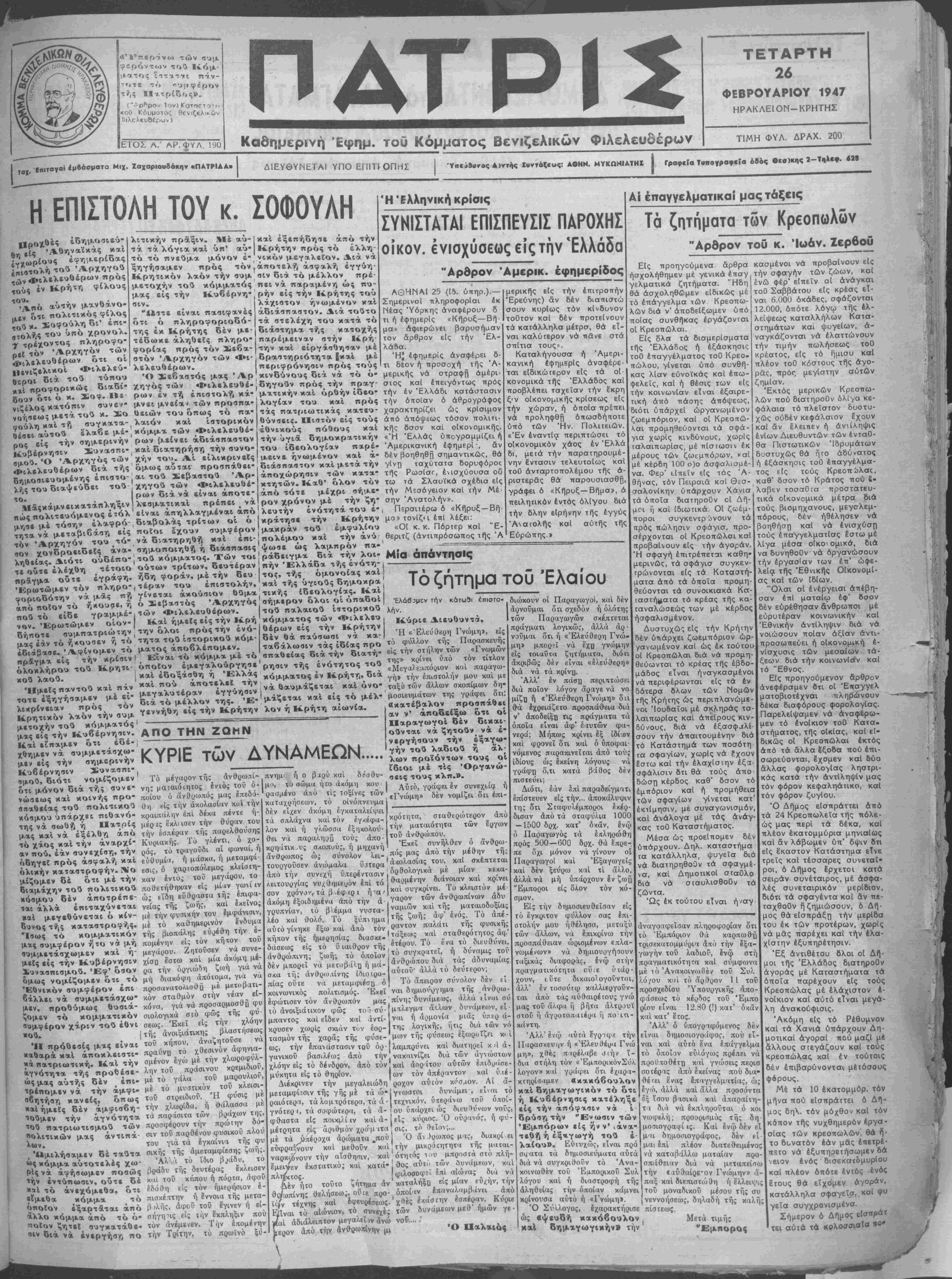 δτι πολιτικάς φίλο< ,ου κ. Σοφούλη δι' επι β.ολής τού υπο χρονολ γ τρέχοντος πληροφο- ρ,ϊτόν Αρχηγόν των Φιλελευθέρων ότι οί Μενιζελικοί Φιλελευ- λιτικήν πράξιν. Μέ αύ- καί έξεπήδησε άπό τήν τα τα λόγια καί ύπ' αύ- Κρήτην πρός τό έλλη- τό τό πνεύμα μόνον έ- νικόν μεγαλείον. Διά νά ξηγήααμεν πρός τόν|άποτελή άσφαλή έγγύη- Κρητικόν λαόν τήν συμ σιν διά τό μέλλον πρέ- μβτοχήν τού κόμματός πει νά παραμένη ώς πυ- μας είς τήν Κυβέρνη-|ρήν είς την Κρήτης τού — ·■ 'λάχιατον ηνωμένον καί άδιάσπαστον. Διά τούτο τα στελέχη τού κατά τό διάατημα τής κατοχής παρέμειναν στήν Κρή¬ την καί ειργάσθησαν μέ σιν ν. "Ωστε είναι πασΐφανές ότι ό πληροφοριοδό- της έκ Κρήτης δέν με- τέδωκε άληθείς πληρο¬ φορίας πρός τόν Σεβα ό ό ω Φ φορίας πρός τόν Σεβα( .... ---- -ν-.-----. στόν Αρχηγόν των Φι- δραστηριότητα |καί μέ ΉΈλληνική κρίσις ΣΥΝΙΣΤΑΤΑΙ ΕΠΙΣΠΕΥΣΙΣ ΠΑΡΟΧΗΣ οίκον, ένισχύσεως εις την Έλλάδα . "Αρθρον 'Αμερικ. εφημερίδος ΑΘΗΝΑΙ 25 (15. 6πηρ.).— Σημεριναί πληροφορίαι έκ Νέας Υόρκης άναφέρουν δ τι ή εφημερίς «Κηρυξ—Βη"- μα» άφιερώνει βαρυσήααν τον άρθρον είς την Έλ¬ λάδα. ..... ,..... Ή; εφημερίς άναφέρει δ- λελευθέρων. περιφρόνησιν πρός τούς ' τι δέον ή προσοχή τής Ά- 6εοοι δια τού τύπου Ό Σεβαστός μας 'Αρ' κινδύνους διά νά τό ό- μερικής νά στραφή άμέρι- >φορικώς διαδί- χηγός των Φιλελευθέ·|δηγούν πρός την πραγ- σιος κα| έπειγόντως πρός