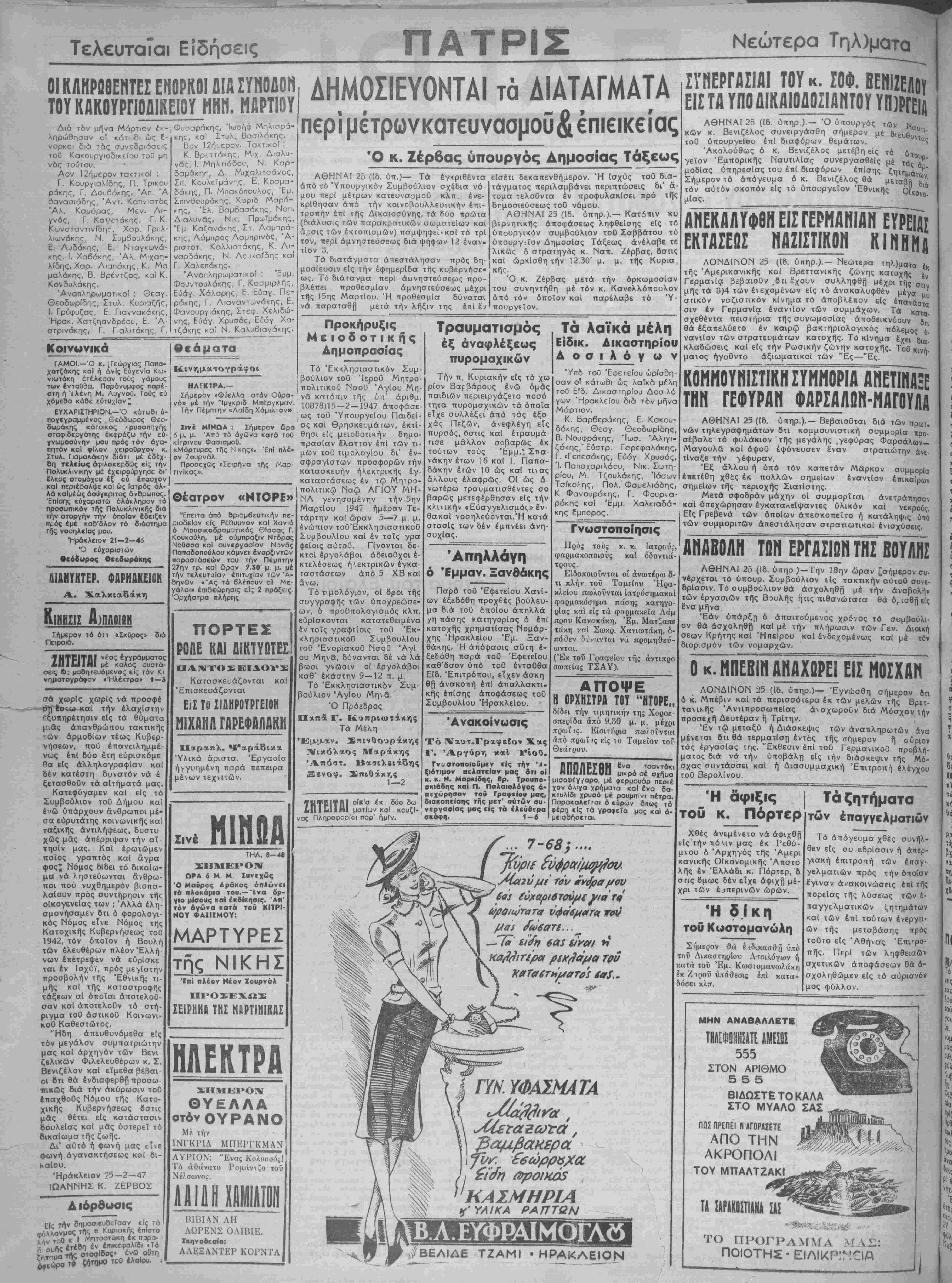μισοφεγ<·αρο, μέ φερμουάρ πεοιέ χον ολίγα χρήματα κοί 6να δα- κτυλΐδι χρυοό μέ ρουμπίνι πέτρο, ΠορακαλεΤται ό ευρών δαως τό φέρη είς τα γραφεϊα μας καΐ ά μειφδήσεΐαι. ... 7 Ό Ο 9 »·»* ρνριε ίόφροα'μψ^σν. ΓΥΗ. ΥΦΑΣΜΑΤΛ βαμβακΕρα ύ εώ " ι'ΚΑΣΜΗΡΙΑ ΡΑΠΤΩΝ ΒΆ.ΕΥΦΡΑΙΜΟΓΛ» ΤΖΑΜΙ · ΗΡΑΚΛΕΙΟΝ ΑΝΕΚΑΛΥΦΘΗ ΕΙΣ ΓΕΡΜΑΝΙΑΝ ΕΥΡΕΙίί ΕΚΤΑΣΕΩΣ ΝΑΖΙΣΤΙΚΟΗ ΚΙΜ Η Μ Α ΛΟΝΔΙΝΟΝ 25 (Ιδ. ύπηρ.).— Νεώτερα τηλ)ματα έκ τής Άμερικανικής κοί Βρεττανικής ζώνης κατοχήν 8ν ΓερμανΙα βεβαιοϋν ,οπ έ'χουν συληφθρ μέχρι τής σϊ1ν μής τα 3)4 των ένεχομένων είς τό άνακαλυφθέν μέγα αί σπκόν νοζιστικόν κίνημα τό άποβλέπον είς έπσνάστσ σιν έν ΓερμανΙα εναντίον των συμμάχων. Τα κατα- σχεθέντα πειστήρια τής συνωμοσίας άποδεικνύουν 8η θά έξαπελύετο έν καιρώ βακτηριολογικός πόλεμος ε. νανιίον των στρατευμάτων κατοχής. Τό κίνημα Ιχει 6ια. κλαδώσεις καί είς την Ρωσικήν ζώνην κατοχής. Τοθ κινή. μαχος ήγοθντο άξιωματικοί των "Ες—Ές. ΚΟΜΜΟΫΝΙΣΤΙΚΗΣΥΜΜΟΡΙΑ ΑΝΕΤϋΕΕ ΤΗΝ ΓΕΦΥΡΑΗ ΦΑΡΣΑΛΟΗ-ΜΑΓΟΥΛΒ ΑΘΗΝΑΙ 25 (ίδ. ύΐτηρ.).— Βεβαιοθται διά των πρωί. νών τηλεγραφημάτων δτι κομμουνιστική συμμορία προ- σέβαλε τό φυλάκιον τής μεγάλης .γεφύρας Φαρσάλων— Μαγουλδ κσί όφοϋ έφόνευσεν δναν στρατιώτην άνε- τίναξε την γέφυραν. Έξ άλλου ή υπό τόν καπετάν Μάρκον συμμορία επετέθη χθές έκ πολλών σημείων εναντίον έπικαίρων σημείον τής περιοχής Σιατίστης. Μετά σφοδράν μάχην οί συμμορΐται άνετράπησαν καί υπεχώρησαν έγκαταη,εΐψαντες υλικόν καί νεκρούς. Είς Γρεβενά των οποίων άπεσκοπεΐτο ή κατάληψις ϋιτό των συμμοριτών απεστάλησαν στρατιωτικαί ένισχύσεις. ΑΗΑΒΟΑΗ ΤΩΝ ΕΡΓΑΣΙΩΝ ΤΗΣ ΒΟΫΑΗΣ ΑΘΗΝΑΙ 25 (ίδ. ύπηρ ) — Την 18ην ώραν [σήμερον συ· νέρχεται τό υπουρ. Συμβουλιον ιίς τακτικήν αύτοθ συνε¬ δρίασιν, Τό συμβούλιον θά άσχοληθή μέ την άναβολήν των εργασιών τής Βουλής ήας πιθανώτατα θά όΓισθτ) είς έ"να μήνα. "Εάν ϋπάρξτι ό άπαιτούμενος χρόνος τό συμβούλι¬ ον θά άσχοληθή καί μέ την πληρώσιν των Γεν. Διοική σεων Κρήτης καί Ηπείρου καί ενδεχομένους καί μέ τόν διορισμόν των νομαρχών, ο κ. ηπεβ¥αηΙχωρει εισ μϊσχαΤ ΛΟΝΔΙΝΟΝ 25 (Ιδ, ύπηρ.)— "Εγνώσθη σήμερον δτι ό κ. Μπέβιν καί τα περισσότερα έκ των μελών τής Βρετ· τανικής Άνηπροσωπείας άνσχωροθν διά Μόσχαν την προσέχη Δευτέραν ή Τρίτην. Έν «ώ μεταξύ ή Διάσκεψις των άναπληρωτών άνα μένεται δτι θά τερματΐστ) έντός τής σήμερον ή ουριον τάς εργασίας της. "Εκθεσιν επί τοθ ΓερμανικοΟ προβλή- μαΐος διά νά την υποβάλη, είς την διάσκεψιν τής Μό- σχας συντάσσει καί ή Διασυμμαχική ΈπιτροπιΊ έλέγχου τοθ Βερολίνου. Ή άφιξις τού κ. Πόρτερ Χθές ανεμένετο νά αφιχθή είς την τιό'αν μας έκ Ρεθύ- μνου ό Άρχηγός τής Άμερι κανικής Οίκονομικής Άπστο λής έν Ελλάδι κ. Πόρτερ, δ σπς ομως 6έν εΐχε άφΐχή μέ¬ χρι των έ^περινών ώρών. Ή δίκη τοθ Κοστομανώλη Σήμερον θά έ<δικασθη υπό τοΰ Δικαστηρίου Δισιλόγων ή κατά τοΰ Έμ. Κωσιομανωλάκη έκ Ζ <ροΰ υπόθεσις επί 5όσει κλπ. κατα- Τα ζητήματα των έπαγγελματιών Τό άπόγευμα χθές συνήλ¬ θεν είς ου εδρίσσιν ή άπερ- γιακή έπιτροπή των έιταγ- γελματιών πρός την οποίαν έγιναν ανακοίνωσις επί της πορεΐας τής λύσεως των έ· παγγελματικών ζητημάτων καί των επί τούτων ένεργει- ών τής μεταβάσης πρός τουτο είς Αθήνας Έπΐ'ρο- πής. Περί των ληφθεισών σχετικών άποφάσεων θά α¬ σχοληθώμεν είς τό αυριανόν μος φύλλον. ΜΗΝ ΑΝΑΒΑΛΛΕΤΕ ΤΗΑΕΦΟΗΗΣΑΤΕ λΜΕΣϋ! 555 ΣΤΟΝ ΑΡΙΘΜΟ 5 5 5 ! ΒΙΔΩΣΤΕΤΟΚΑΛΑ ΣΤΟ ΜΥΑΛΟ ΣΑΣ ΠΟΣ ΠΡΕΠΕΙ Ν ΑΓΟΡΑΣΕΤΕ ΑΠΟ ΤΗΝ ΑΚΡΟΠΟΛΙ ΤΟΥ ΜΠΑΛΤ2ΑΚΙ ΤΑ ΣΑΡΑΚΟΣΤΙΑΗΑ ΣΑΣ ΤΟ ΠΡΟΓΡΑΜΜΑ Μ ΠΟΙΟΤΗΣ