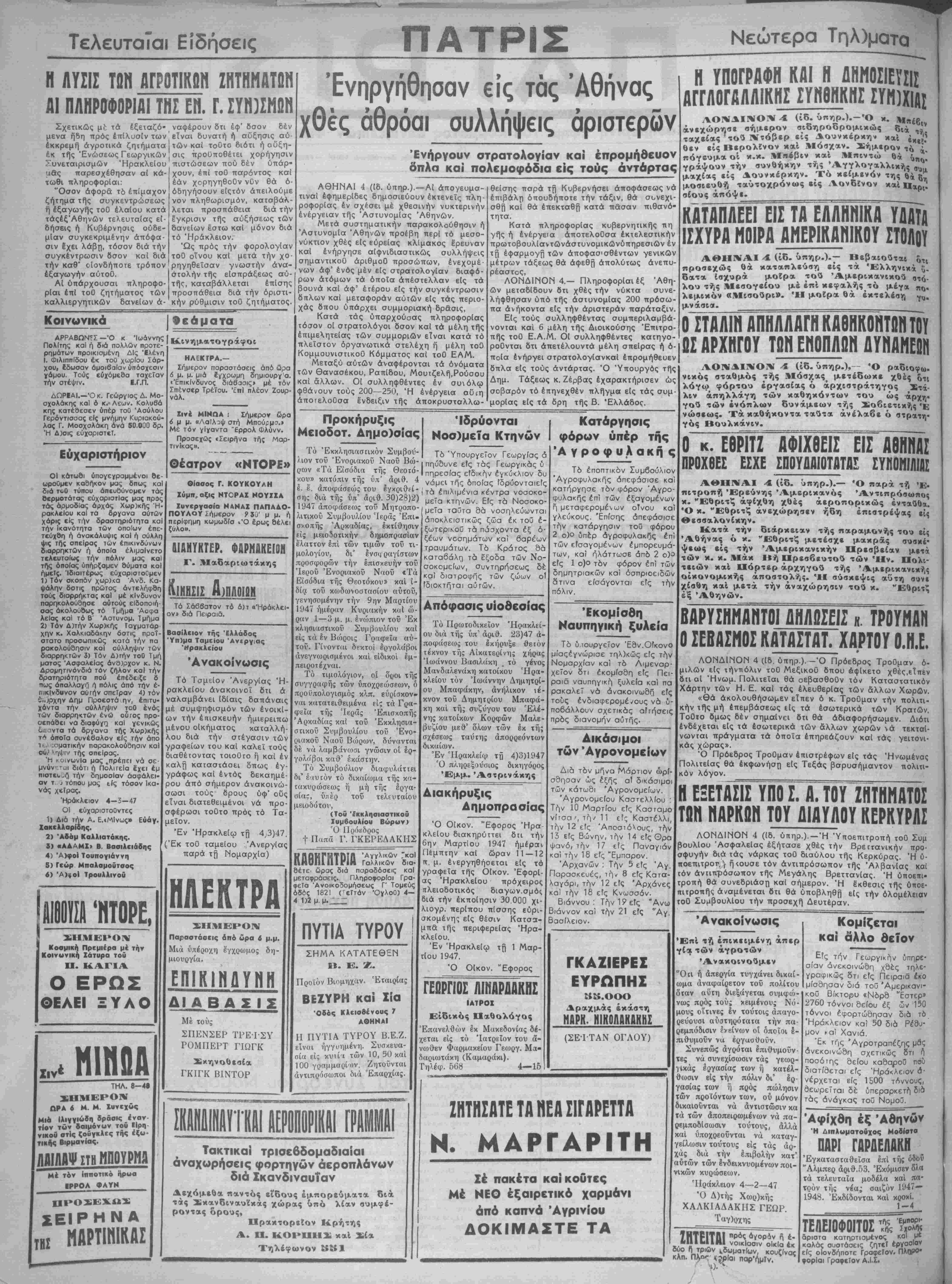 1) Τόν σκοπόν χωρλ<ο Ανδ. Κα ψάλην δστις πρώτος αντελήφθη τούς διορρήκτας καί μέ κίνδυνον παρηκολούθησε αύτούς εΐδοποιή σας ακολούθως τό Τμήμα Άοφα λεΐας καΐ τό Β' Άστυνομ. Τμήμα 2) Τόν Δ)τήν Χωρ)κής ϊαγματάρ χην κ. Χαλκιαδάκην όστις προΐ- στατο προσωπικώς κατά την πά ρακολούοησιν κοί σύλληψιν των διαρρηκτών 3) Τόν Δ)τήν τοθ Τμή ματος Ασφαλείας άνΟ)ρχον κ. Ν. Δρομητινόνδιά τόν ζήλον καί την δρατηριότητα πού επέδειξε ο πως απαλλαγή ή πόλις άπό την έ· πικΐνδυνον αυτήν σπείραν 4) τόν ϋ,,;ρχην Δημ Πμοεστά ην, έπιτυ χόντα την σύλληψιν τοθ ενός των διαρρηκτών ένώ ούτος προ¬ σεπάθει να διαφύγη καΐ γενικώς ίιπαντα τα δργανα τής Χωρ)κής τΛ όποΤα ουνέβαλον είς την άπο Τγ ιαματικήν παρακολούθησιν κα) ού? ηψιν τής οπείρας. Ή κοινωνία μας ^πρέπει νά σε μνύν.τΐ)ΐ διότι ή Πολιτεία £χει έμ πιστευθή την δημοσίαν ασφάλει¬ αν τ ι τόπου μας είς τόσον Ικα- νάς χείρας. Ηράκλειον 4-3-47 ΟΙ ευχαριστούντες 1) Διά την Α. Ε.ιΜΙνως» Εύαγ. Χακελλαρίδης. 2) Αδαμ Καλλιατάκης. 3) αΑΑΑΜΣ» Β. Βασιλειάδης 4) Ά)φοΙ Τουπογιάννη 5) Γεώρ Μπαλαμοϋτσος 6) Ά)»οί Τρουλλινοΰ 'ΪΙΤΟΡΕ, ΣΗΜΕΡΟΝ Κοσυική Πρεμιέρα μέ την Κοιν«νική Ιάτυρα τού Π. ΚΑΓΙΑ Ο ΘΕΛΕΙ ΞΥΑΟ Ιΐν Μ1ΗΠΑ ΤΗΛ. 8-4· ΣΗΜΕΡΟΝ ΠΡΑ β Μ. Μ. Χυνβχός , Μιά Ιλιγγιώβη δράσις έναν ΙτΙον των δαιμόνων τού Ειρη¬ νικόν στΐς ζοθγκλες τής έζ«· τικης Βιρμανίας. | Λ ΑΙΛΛΦστηΜΠΟΥΡΜΛ ΤΗΣ Μέ τόν 'πηοτικό ηραα ΙΡΡΟΑ ΦΛΥΝ ■ι — 0ΡΟΣΈΧΩΣ 2ΕΙΡΗΝΑ ΜΑΡΤΙΗΙΚΑΣ % ε ά μ α τα Κινηματογράφοι ΗΑΕΚΤΡΑ.— Σήμερον παραστάσεις άπό ωρα 6 μ. μ. μιά έγχρωμη δημιουργ'α. «Έπικΐνδυνος διάβασις» μέ τόν Σπένσερ Τρέϊου. Επί πλέον Ζουρ νάλ. Χινέ ΜΙΝΩΑ ι Σήμερον ωρα έμμ. «Λαίλαψ στή Μπού;μα.» Μέ τόν γίγαντα "Ερρολ Φλύνν. Προσεχώς «Σειρήνα τής Μαρ τινίκας». Θέατρον «ΝΤΟΡΕ» θίασος Γ. ΚΟΥΚΟΥΑΗ Σϋμπ,αξις ΝΤΟΡΑΪ ΝΟΥΖΖΑ Χυνεργασία Ν ΑΝ ΑΙ ΠΑΠΑΑΟ- ΠΟΥΑΟΥ Σήμερον 9 30' μ μ. γ1 περίφημη κωμωδίσ »Ό έρως θέλε ξυλο». αΐΑΝΥΚΤΕΡ. ΦΑΡΜΑΚΕΙΟΝ Γ. Μαδαριωτάκης Κινησισ Α )ΠΛΟΙΩΝ Τό Σάββατον τα 6) ι «Ήράκλεΐ' όν» διά Πειραια. Βασίλειον τής Ελλάδος "Υπ)μα Ταμείου Άνεργιας Ηρακλείου Ανακοίνωσις Τό Ταμείον Άνεργίας Η¬ ρακλείου ανακοινοί ότι ά ναλαμβάνει ΙδΙαις δαπάναις μέ συμψηφισμόν των ένοικί- ων την επισκευήν ήμιερειπω μένου οΐκήματος καταλλή- λου διά την στέγασιν των γραφείων τού καΐ καλεΐ τούς διαθέτοντος τοιοθΐο ή καί έν καλή καταστάσει δπως εγ¬ γράφως καί έντός δεκαημέ ρου άπό σήμερον άνακοινώ- σωσι τούς δρους υφ' ούς είναι διατεθειμένοι νά προ- σφέρωσι τουτο πρός τό Τα¬ μείον. Έν Ηρακλείω τή 4,3)47. Εκ τοθ ταμείου ,Άνεργίας παρά τή ΝομαρχΙα) ΗΑΕΚΤΡΑ ΣΗΜΕΡΟΝ Παραστάσεις άπό ϋρα ό μ.μ. Μιά ύπέροχη έγχρωμος δη- μιουργία. ΕΠΙΚΙΝΔΥΝΗ ΑΙ Α Β Α Σ ΙΣ Μέ τούς ΣΠΕΝΣΕΡ ΤΡΕΓΣΥ ΡΟΜΠΕΡΤ ΓΙΩΓΚ Σκηνοθεσία ΓΚΙΓΚ ΒΙΝΤΟΡ ΈνηργήΘπσαν είς τάς "Αθήνας χθές άθρόαι συλληφεις άριοτερών - < , 'Ενήργουν στρατολογίαν καΐ έπρομήθευον .·.......δπλα καί πολεμοφόδια είς τούς άντάρτας ΑΘΗΝΑΙ 4 (ίδ. ύπηρ.).—Αί απογευμα¬ τιναί έφημερίδες δημοσιεύουν έκτενεΐς πλη¬ ροφορίας έν σχέσει μέ χθεσινήν νυκτερινήν ενέργειαν τής Άστυνομίας Αθηνών. Μετά συστηματικήν παρακολούθησιν ή Άστυνομία Αθηνών προέβη περί τό μεσο¬ νύκτιον χθές είς εύρείας κλΐμακος έρευναν καί ενήργησε αίφνιδιαστικώς συλλήψεΐς σημαντικοϋ άριθμοθ προσώπων, ένεχομέ- νων άφ' ενός μέν είς στρατολογίαν διαφό¬ ρων άτόμων τα όποΐα άπέστελλαν είς τα βουνά καί άφ' ετέρου είς την συγκέντρωσιν δπλων καΐ μεταφοράν αυτών είς τάς περιο¬ χάς δπου ύπάρχει συμμοριακή δρδσις, Κατά τάς υπαρχούσας πληροφορίας τόσον οί σ