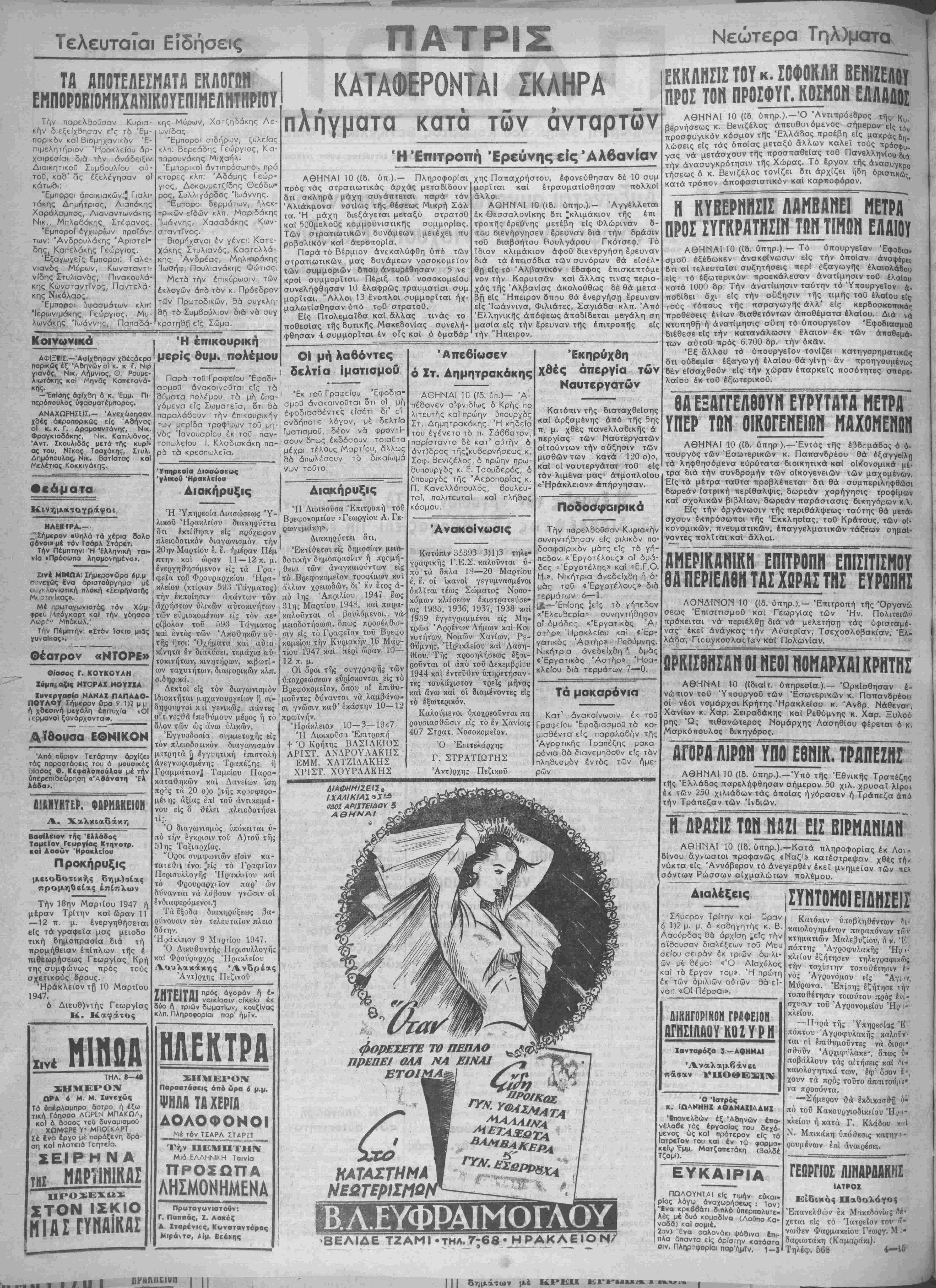 &< των 250 χιλιάδων τάς οποίας ηγόρασεν ή Τραπέζα άπό την Τράπεζαν των Ίνδιών. 1Γ ΔΡΑΣΙΣ ΤΩΝ ΗΗΙ ΕΙΣ ΒΙΡΜΑΐΊΙΑΗ ΑΘΗΝΑΙ 10 (ίδ. ύπηρ.).-Κατά πληροφορίας έκ Λο- δίνου άγνωσΐοι προφανώς «Ναζί» καΐέστρεψαν χθές τή; νύκτα είς Άννόβερον τό άνεγερθέν έκεΐ μνημεΐον των τιε^ σόντων Ρώσσων αίχμαλώΐων πολέμου. Διαλέξεις Σήμερον Τρίτην καΐ ώραν 6 1)2 μ. μ. δ καθηγητάς κ. Β. Λαούρδας θά αρχίση .είς την αίθουσαν διαλέξεων τού Μευ σείου σειράν έκ τριών δμιλι- ών μέ θέμα: Ό καΐ τδ έργον η έκ των όμιλιών αοτών θά εί¬ ναι: «ΟΙ Πέρσαι». «Ό ΑΙσχύλος τομ». Ή πρώτη ΔΙΚΗΓΟΡΙΚΟΝ ΓΡΑΦΕΙΟΝ ΑΓΗΙΙΑΑϋΥ ΚΟΙ Υ ΡΗ Ιανταοόςα 3 -ΑΟΗΝΑΙ Άναλαμβάνει πάσαν Ό Ίατρός Κ. 'ΩΛΝΝΗΧ «ΘΑΝΑΧΙΑΑΗΧ 'Ιπανελδών έξ Αθηνών έπα- νέλαβε τος εργασίας τού δεχό- μενος ως καΐ πρότερον είς τό Ιατρείον τού καΐ έν τώ κείω Έμμ Ματζαπετάκη Τζαμί). φαρμα (Βαλδέ ΕΥΚΑΙΡΙΑ ΒΕΛΙΔΕ ΤΖΑΜΙ ·τμλ^7;68 « ΗΡΑΚΛΕΙΟ Ν/ ΠΩΛΟΥΝ!*Ι είς τιμήν ρίσς λόγω αναχωρήσεως Ί ββάτ, διπλό ύ εύκαι- ΐον) Ίνα κρεββάτ, διπλό ύπερπολυτε- λές μέ δυό κομοδΐνα (Λοθπο Κα- ναδα) καΐ σομιέ. 2ον) "Ενα οαλονόκι ψάθινα Ιπι- πλα δπαντα είς αρίστην κατάοτα οιν. Πλιρ?φορΙαι παρ'ημίν. 1-3 ΣΥΗΤΟΜΟΙΕΙΛΗΣΕΙΣ Κατόπιν δποβληθέντοον ?ι- καιολογημένων παραπόνων των κτηματιών Μαλεβυζίον, ό χ. Έ πόπτης^ 'Αγροφυλακής Ήρ ι-' κλίίου εζήτησεν τηλεγραφικώς την ταχίστην τοποθέτησιν ε¬ νός Άγρονόμου είς "Αγι >ν