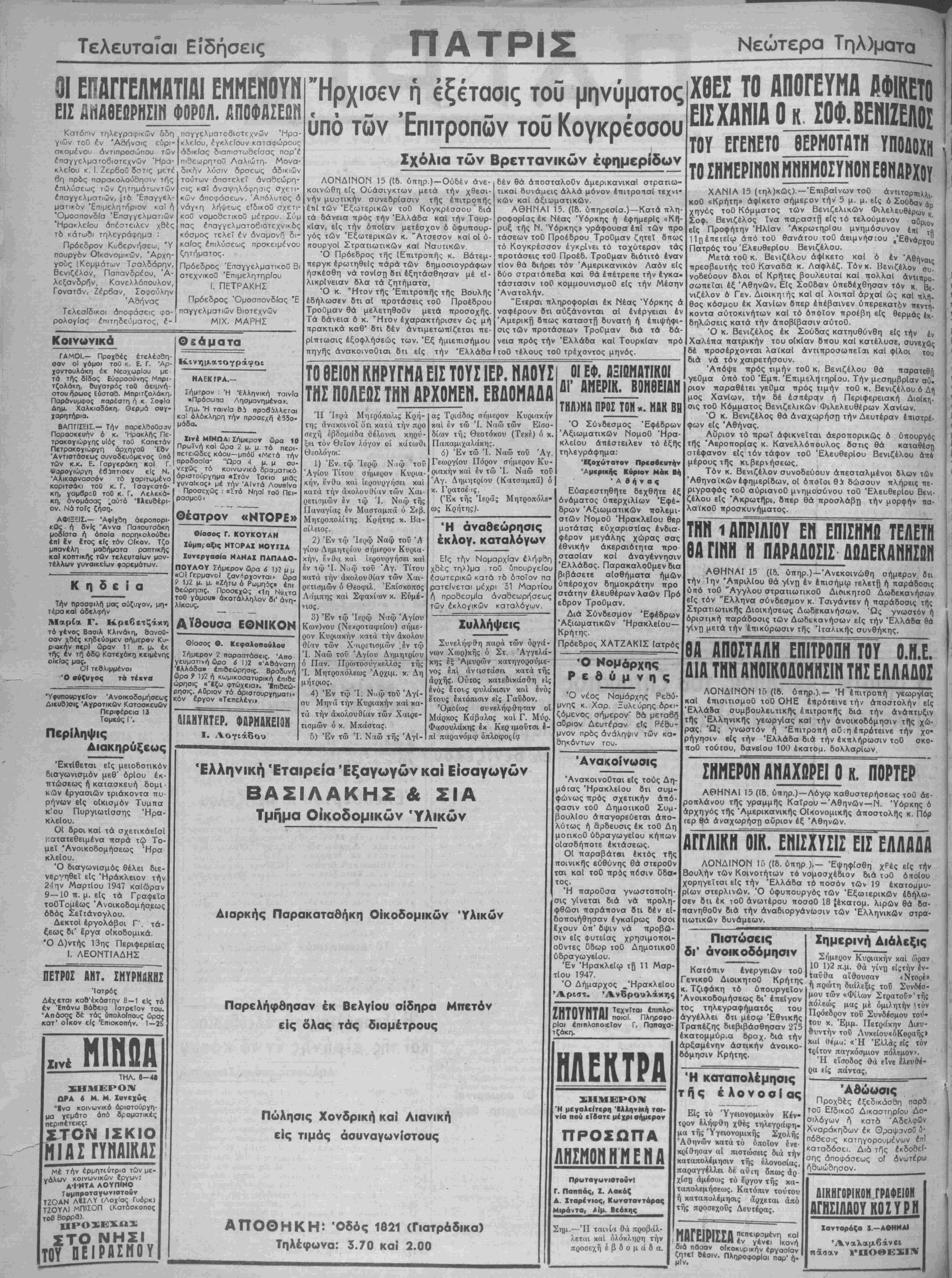 κ. Γρατσέ <ς. ΟΙ ΕΦ. ΑΗΙΟΝΑΤΙΚΟ! ΔΓ ΛΗΕΡ1Κ. ΒΟΗΘΕΙΑ» ΤΗΛ)ΜΑ ΠΡΟΣ ΤΟΗ κ. ΜΑΚ ΒΗ "Ο Σύνδεσμος Έφέδρων Αξιωματικών ΝομοΟ "Ηρα¬ κλείου απέστειλεν τό εξής τηλεγράφημα: Ίξοχύτατον Πρεσβευτήν Άμΐρικής Κύριον Μάκ Βή ' Α ο η υ α ς Ι Εύαρεστηθήτε δεχθήτε έξ (Έκ τής Ίερά; Μητροπόλε-Ιόνόματος ύπερχιλίων 'Εφέ- ως Κρήτης). Ή αναθεώρησις έκλογ. κατάλογον Είς τΓδ,ν Νομαρχίαν ελήφθη χδές τηλ)μα τοΰ ύπουργείου εσωτερικώ κατό. τδ όιοϊον πά ρατείνεται μέχρι 31 Μαρτίου ή προδεαμΐα αναθεωρήσεως των έκλογΊκών καταλόγων Συλλήψεις Συνελήφθη παρά των ύργά- νων Χωρ)κής ό Στ Άγγελά- κη; έξ Άμυρών κατηγορούμε- νος επί άναστάσει κατά τής άρχής". Ούτος κατεδικάσθη είς ενός ετονς φυλάκισιν καί ενός έ'τους έκτόπισιν είς Γαϋδον. Όμοίως συνελήφθη τα ν οί Μάρκος Κάβαλος καί Γ. Μύρ. Φασουλάκης έκ Κερκμοΰτσι έ- πΐ παρανόμω δπλοφοςία |δρων Αξιωματικών πολεμι στών ΝομοΟ Ηρακλείου Θερ μοτάτας ευχαριστίας ενδια¬ φέρον μεγάλης χώρας σας εθνικήν άκεραιότητα προ αχασίαν κοί αναγέννησιν Ελλάδος. Παρακαλοθμενδια βιβάσετε αίσθήματα ημών υπέροχον δημοκράτην προ στάτην έλευθέρων λαών Πρό εδρον Τροθμαν. Διά Σύνδεσμον Έφέδρων Αξιωματικών "Ηρακλείου— Κρήτης. Πρόεδρος ΧΑΤΖΑΚΙΣ Ιατρός Έλληνική Έταιρεία Έξαγωγών καί Είσαγωγών ΒΑΣΙΛΑΚΗΣ & ΣΙΑ Τμήμα Οίκοδομικών Υλικών Διαρκής Παρακαταθήκη Οίκοδομικών Υλικών Παρελήφθησαν έκ Βελγίου οίδηρα Μπετόν ,, είς δλας τάς διαμέτρους :' -'; τ V ^ Πώλησις Χονδρική καί Λιανική είς τιμάς ασυναγωνίστους ΑΤΤΟΘΗΚΗ: Οδός 1821 (Γιατράδικα) Τηλέφονα: 5.70 καί 2.00 €Ο Νομάρχης Ρεθύμνης Ό νέος Νομόρχης Ρεθύ¬ μνης κ. Χαρ. Ξυλούρης ορκι¬ ζόμενος σήμερον" σά μεταβή αυριον Δευτέραν είς Ρέθυ¬ μνον πρός ανάληψιν των κα- δηκόντων τού. Ανακοίνωσις Άνακοινοθται είς τούς Δη- μότας Ηρακλείου Οτι συμ¬ φώνως πρός σχετικήν από¬ φασιν τοθ ΔημοιικοΟ Συμ- βουλίου άηαγορεύεται απο¬ λύτως ή άρδευσις έκ τοθ Δή μοΐικοθ ϋδραγωγείου κήπων οΐασδήποτε εκτάσεως. ΟΙ παραβάτβι έκτός τής ποινικής ευθυνής θά στεροθν ται καΐ τοθ πρός πάσιν Οδα- τος. Ή παροθσα γνωστοποίη- σις γΐνεται διά νά προλη- φθώσι παράπονα δτι δέν εί- δοποιήθησαν εγκαίρως βσοι έχουν ΰπ' βψιν νά προβώ σιν είς φυτείας χρησιμοποι- οθντες ύδωρ τοθ ΔημοΐικοΟ ύδραγωγείου. Έν Ηρακλείω τβ 11 Μαρ- τίου 1947. Ό Δήμαρχος ^"Ηρακλείου Άριστ. Άνδρουλάκης Νεώτερα Τηλ)ματα ΧΘΕΣ ΤΟ ΑΠΟΓΕΥΝΑ ΑΦΙΚΕΤΟ ΕΙΙΧΑπΙΑ Ο κ ΪΟΦ. ΒΕΝΙΖΕΛΟΣ ΤΟΥ ΕΓΕΝΕΤΟ ΟΕΡΜΟΤΑΤΗ ΥΠΟΔΟΧΗ ΤΟ ΣΗΜΕΡΙΝΟΝ ΜΝΗΜΟΣΥΝΟΝ ΕΟΗΑΡΧΟΥ ΧΑΝΙΑ 15 (τηλ)κώς).—Έπιβαίνων τοθ άνπτορηιλλι. κοθ «Κρήτη» αφίκετο σήμερον την 5 μ. μ. είς ό Σούδαν άό χηγός τοθ Κόμματος των Βενιζελικών Φιλελεύθερον κ Σοφ. Βενιζέλος ίνα παραστί) είς τό τελούμενον αυριον είς Προφήτην ΉλΙαν Άκρωτηρΐου μνημόσυνον επί ,« ΠρέπετεΙω άπό τοθ θανάτου τοΰ αειμνήστου ,'ΕθνάρνΟυ Πατρός τού "Ελευθερίου Βενιζέλου. Μετά τοθ κ. Βενιζέλου αφίκετο καΐ ό έν Αθήναις πρεοβευτής τοθ Καναδα κ. Λαφλέζ. Τόν κ. Βενιζέλον συ· νοδεύουν δλοι οί Κρήτες βουλευταί καί πολλαί άντιπρο- σωπεΐαι έξ Αθηνών. Είς Σοθδαν ϋπεδέχθησαν τόν κ. Βε· νιζέλον ό Γεν. Διοικηΐής καΐ αί λοιπαί αρχαί ώς καί πλη- θος κόσμου έκ Χανίων υπέρ έπέβαινεν ύπερεκατόν ττβντή- κοντα αύτοκινήτων καί τό οποίον προέβη είς θερμάς εκ¬ δηλώσει κατά την άποβίβασιν αύτοΟ. Ό κ. Βενιζέλος έκ Σούδας κατηυθύνθη είς την έν Χαλέπα πατρικήν τού οίκίαν 6που καί κατέλυσε, συνεχβς δέ προσέρχονται λαίκαί άντιπροσωττεΐαι καί φΐλοι τού διά νά τόν χαιρετήσουν. Άπόψε πρός τιμήν τοθ κ. Βενιζέλου θά παρατεθ{| γεθμα υπό τοθ Έμπ. Έπι