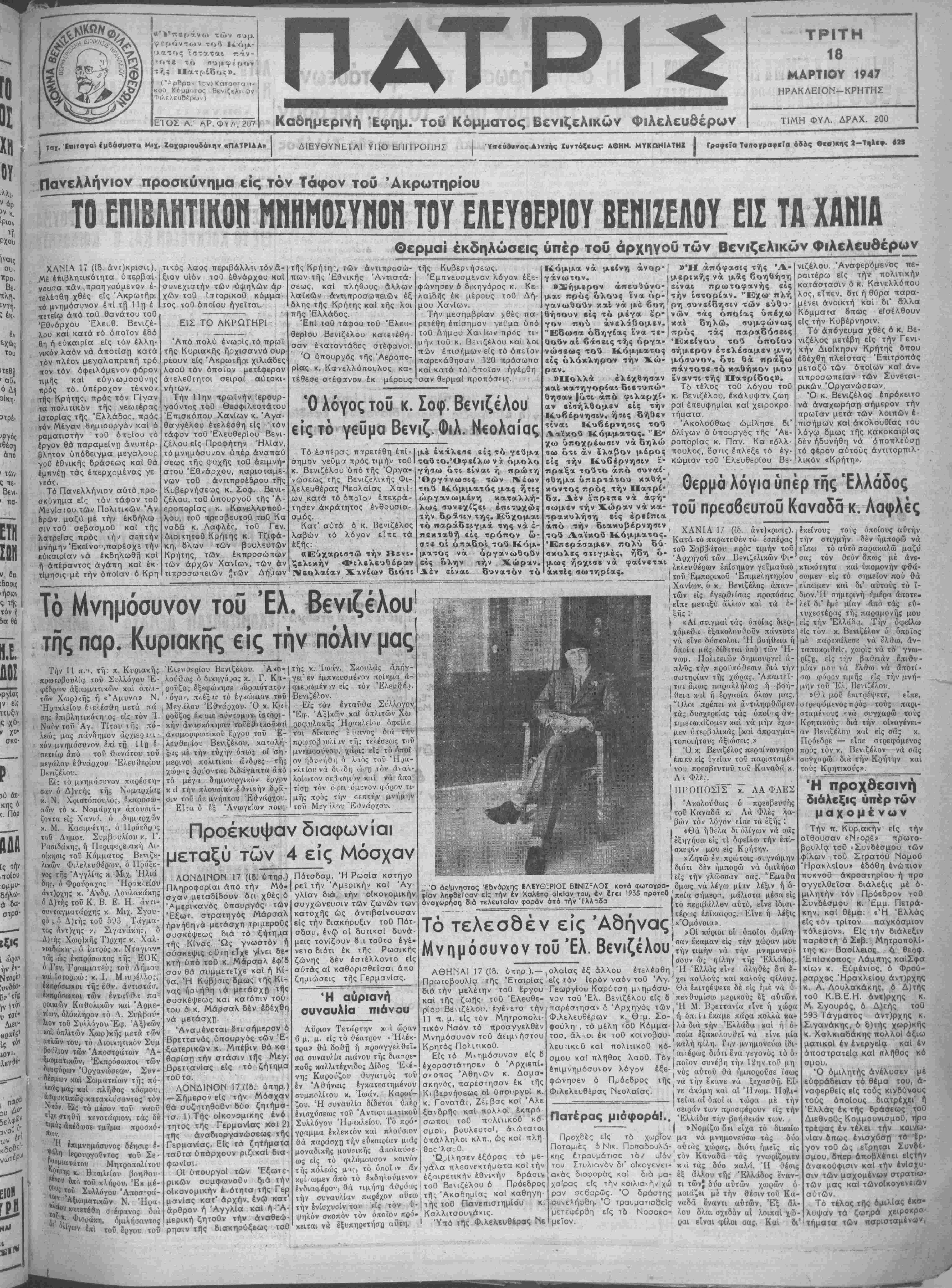 ΤΟ ΕΠΙΒΛΗΤΙΚΟΝ ΜΗΗΜΟΣΥηθίΊ ΤΟΥ ΕΛΕΥΘΕΡΙΟΥ ΒΕΗΙΖΕΛΟΥ ΕΙΣ ΤΑ ΧΑΝΙΑ