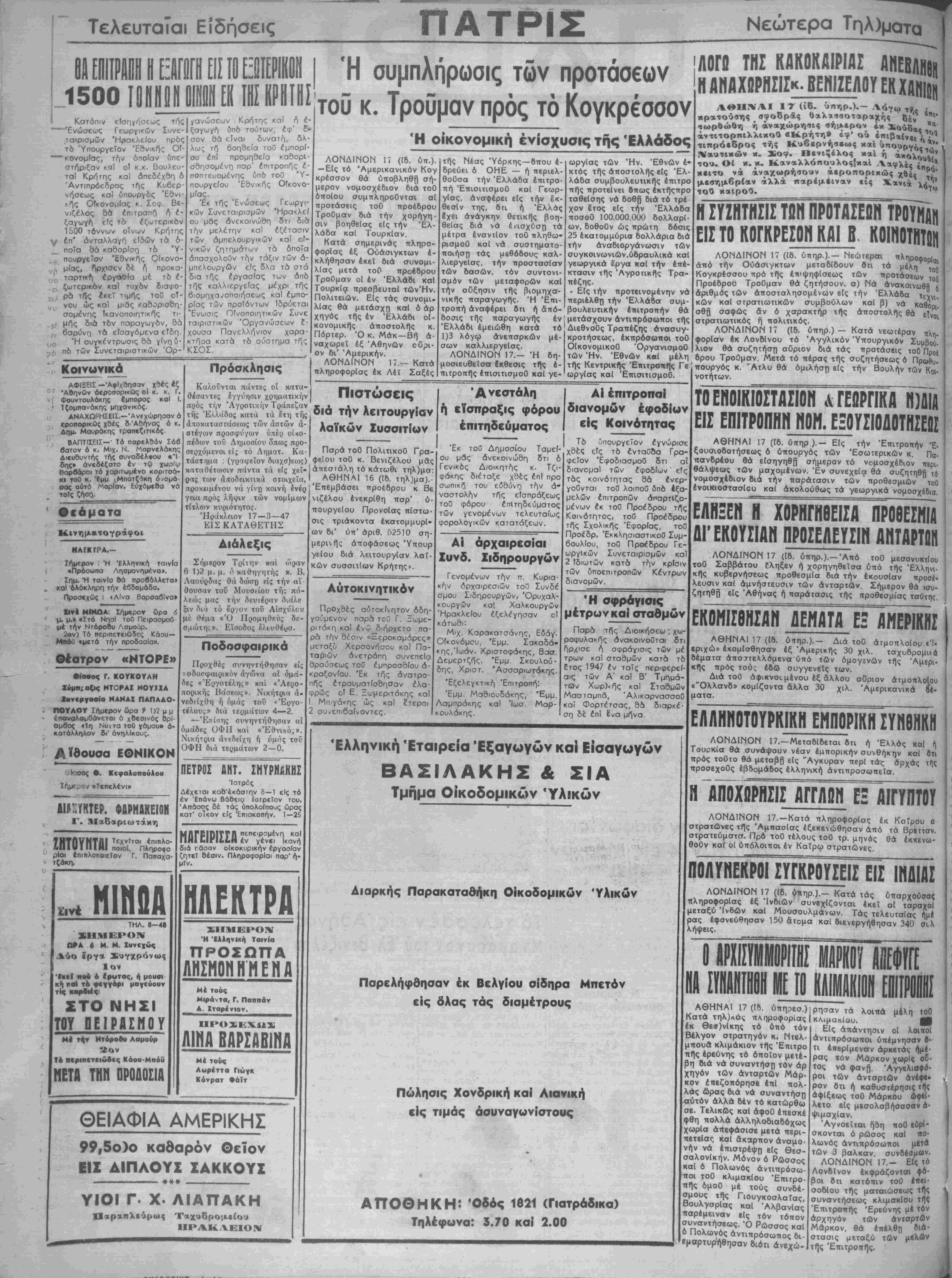 των Χωρ)<ής καΐ Σταθμών Μασταμπά, Άλικαρνασσοϋ|ματο: καΐ Φορτέτσας, δα διαρκέ¬ ση δέ επί ε"να μήνα ΕΛΗΞΕΝ Η ΧΟΡΗΓΗΟΕΙΣΑ ΠΡΟΘΕΣΝΙΑ ΑΓ ΕΚ0ΥΣ1ΑΗ ΠΡΟΣΕΛΕΥΣΙΝ ΑΝΤΑΡΤ1Η ΛΟΝΔΙΝΟΝ 17 (ίδ. ύπηρ.).—Άπό τοθ μεσονυκτίου τοθ Σαββάτου έληξεν ή χορηγηθεΐσα υπό τής "Ελληνι¬ κάς κυβερνήσεως προθεσμία διά την έκουσίαν προσέ· λευσιν καΐ άμνήστευσιν των άνταρτάν. Σήμερον θά ΐσυ- ζητηθή είς Αθήνας ή παράτασις τής προθεσμίας ταύτης. Ι ΕΚΟΜΤσΒΗΣΑΗ ίΕΜΑΤΑ ΕΞ ΑΜΕΡΙΚΗΙ ΑΘΗΝΑΙ Ι ΗΑΕΚΤΡΑ ΣΗΜΕΡΟΝ Ή Έλληνική Τοινία ΠΡΟΣΩΠΑ ΛΗΣΜΟΝΗΜΕΝΑ Μέ τοΰς Μιράντα, Γ. Παππάν Α Ζταρένιον. ΠΡΟΣΕΧΩΣ ΛΙΝΑ ΒΑΡΣΑΒ1ΝΑ Μέ τοΰς Αυρέττα Γιώγκ Κόνρατ Φάϊτ Έλληνική Εταιρείαι Έξαγωγών και Είσαγωγών ΒΑΣΙΛΑΚΗΣ & ΣΙΑ Τμήμα Οΐκοδομικών Υλικών ΑΘΗΝΑΙ 17 (Ιδ. ύτηρ.).— Διά τοϋ ατμοπλοίου «Ί· βριχώ» εκομίσθησαν έξ Άμερικής 30 χιλ. ταχυδρομΐεά βέματα άπο^τείνλόμενα ϋτιό των όμογενών τής Άμερι¬ κής πρός τού; έδω συγγενεΐς των. Διά τού άφικνοι,μένου έξ άλλου αυριον ατμοπλοίου «'Όλλανδ» κομίζοντα άλλα 30 χιλ. Άμερικανικά οέ- ι · - # - . 1 ~ Αιαρκής Παρακαταθήκη Οΐκοδομικών Υλικων ΘΕΙΑΦΙΑ ΑΜΕΡΙΚΗΣ 99,5ο)ο καδαρόν Θείον ΕΙΣ ΛΙΠΛΟΥΣ ΣΛΚΚΟΥΣ ΥΙΟΙ Γ· Χ* ΛΙΑΠΑΚΗ Ιΐαραπλεύρως Ταχυδρομειον ΗΡΑΚΛΕΙΟΝ Παρελήφθησαν έκ Βελγίου σίδηρα Μπετόν είς δλας τάς διαμέτρους ΕΛΛΗΗΟΤΟΥΡΚΙΚΗ ΕΜΠΟΡΙΚΗ ΣΥΗθΗΚΗ ΛΟΝΔΙΝΟΝ 17.-ΜεταδΙ6εται ότι ή Ελλάς καΐ ή Τουρκια θά συνάψουν νέαν εμπορικήν συνθήκην καΐ Οτι πρός τουτο θά μεταβή είς Άγκυραν περί τάς αρχάς τής προσεχούς εβδομάδος έλληνική άντιπροσωπεϊα. Η ΑΐΧΟΡΗΣΙΣ ΑΓΓΛοΠξ ΑΙΓΥΠΤΟΥ ΛΟΝΔΙΝΟΝ 17.-Κατά πληροφορίας έκ Καΐρου ο στρατώνες τής Άμπαοίας έξεκεν ώθησαν άπό τα Βρετταν στρατεύματσ. Πρό τοθ τέλους τοθ τρ. μηνός θά έκκενω- θοθν καί οί ύπόλοιποι έν Καιρώ στρατώνες. ΠΟΛΥΗΕΚΡΟΙ ΣΥΓΚΡΟΥΣΙΣ ΕΙΣ ΙΗΔΙΑΣ ΛΟΝΔΙΝΟΝ 17 (ίδ. Οπηρ.).- Κατά τάς υπαρχούσας πληροφορίας έξ Ινδιών συνεχίζονται έκεΐ αί ταραχαί μεταξυ Ινδών καί Μουσουλμάνων. Τάς τελευταίας ημέ¬ ρας εφονεύθησαν 150άτομα καΐ διενεργήθησαν 340 σΤλ Πώλησις Χονδρική καί Αιανική είς τιμάς ασυναγωνίστους ΑΘΗΝΑΙ 17 ((δ. ύπηοεσ.) πληροφορίας Κατά τηλ)ινας έκ Θε<»)νίκης τό υπό τόν ΑΓΓΟΘΗΚΗ: Όδός 1621 (Γιατράδικα) Τηλέφωνα: 5.70 καί 2.00 Βέλγον στρατηγόν κ. Ντβλ- μπουά κλιμάκιον τής Έπιτρο πής ερεύνης τό οποίον μετέ¬ βη διά νά συναντήθΓ| τόν άρ χηγόν των άνταρτών Μάρ¬ κον έπεζοπόρησε επί πολ¬ λάς ώρας διά νά συναντήση αυτόν άλλά δέν τό κατώρθω σε. Τελικώς καΐ άφοθ έπβσκέ ψθη πολλά αλληλοδιαδόχως χωρία απεφάσισε μετά περι¬ πετείας καί άκαρπον άναμο- νήν νά επιστρέψη είς Θεσ¬ σαλονίκην. Μόνον ό Ρώσσος καί ό Πολωνός άντιπρόσω¬ ποι τοθ κλιμακίου Έπιτρο- πής δμοθ μέ τούς συνδέ- σμους τής Γιουγκοσλαΐας, Βουλγαρίας καί Άλβανίας παρέμειναν είς τόν τόπον συναντήσεως. Ό Ρώσσος καί ο Πολωνός άντιπρόσωτιος δι¬ ' ίΗ»ρτυρήθησαν διότι άνεχώ-ί ρησαν τα λοιπά μέλη τοθ Κλιμακΐου. 0} Είς απάντησιν οί λοιποί άντιπρόσωποι ύπέμνησαν 8- τι επερίμεναν αρκετάς ημέ¬ ρας τόν Μάρκον χωρίς οδ- τος νά φανή Άγγελιαφό- ροι των άντσρτών άνέφί· ρον δτι ή καθυστέρησις τής άφίξεως τοθ Μάρκου ωφεί¬ λετο είς μβσολσβιΊσασαν ά- ψιμαχΐαν. Άγνοεΐΐαι ήδη ποθ ευρί¬ σκονται ό ρώσος καΐ ίγο- λωνός άντιπρόσωποι μεΐά των 3 βαλκαν. συνδέσμων. ΛΟΝΔΙΝΟΝ 17.- Είς τό Λονδίνον εκφράζοντα! <ρο- βοι δτι κατόπιν τοθ έίΐβι- σοδΐου τής ματαιώσεως τί|ζ συναντήσεως κλιμακίου Τί)ς Έπιτροπής Ερεύνης μέ τόν αρχηγόν των άνταρτών Μάρκον, θά επέλθη διά¬ στασις μεταξύ των μελών τί)ς Επιτροπήν,