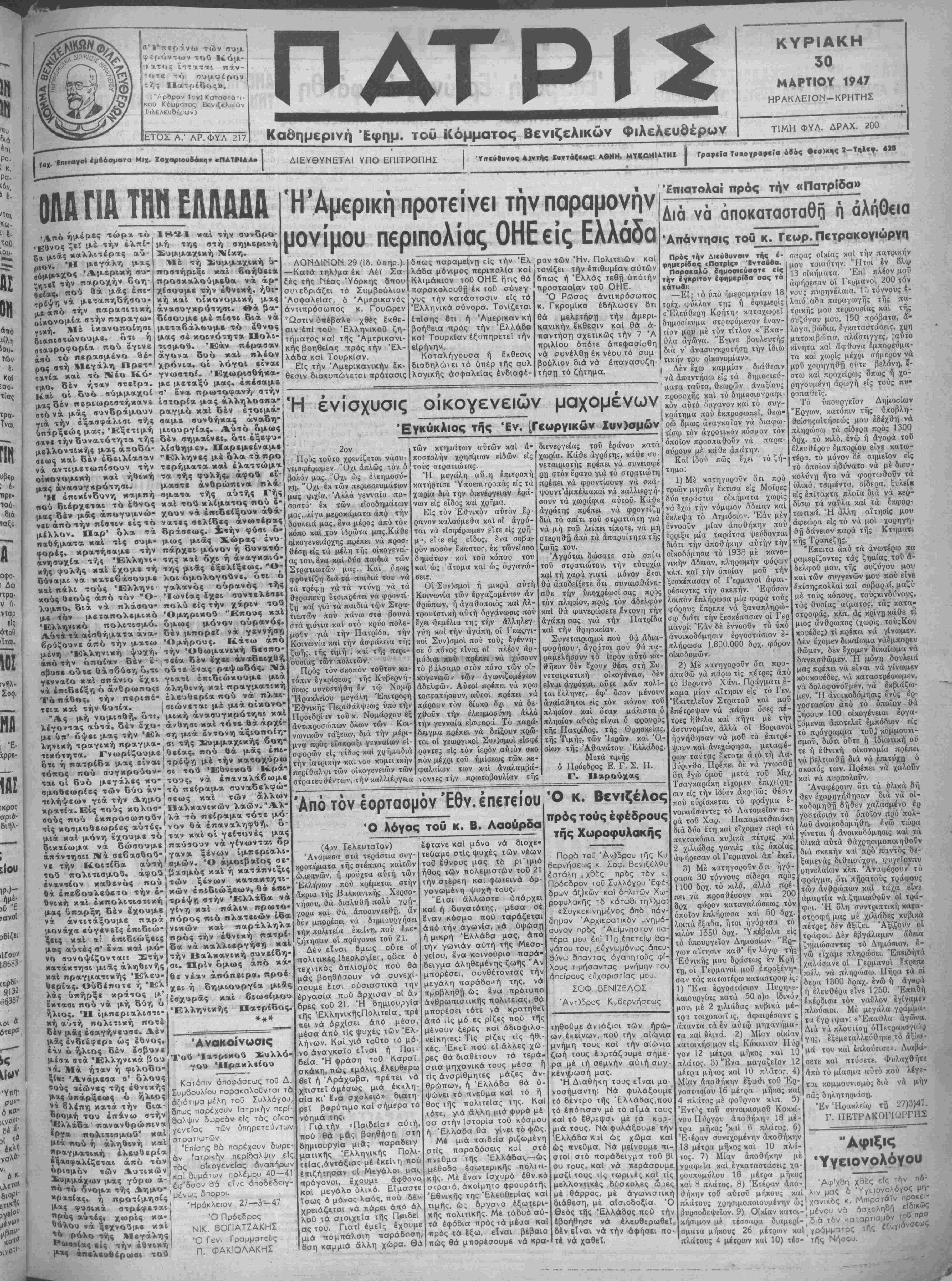 φδρ<Ίντ<ον τού Κόμ- πάν- συμφέρον ίΓ ("άρθρον 1ον) ατοσται κοθ Κόμμοτος Βενιζελικων Βιλελευθέρων) ΕΤΟΣ Α.' ΑΡ.ΦΥΛ 217 ΠΑΧ ^^^^^^^^^^^^^^^^^^^^^^^^^^■^^■^^ε^ιεπ^ρ^ι^^ε^εεΒ^εΒΐΒΐΐί^^ιπ^^^β^ι^ι^ιπβΐΒΡεειι^ε^εΒΐιει^ε^πβίρε^^ Καθημερινή Εφημ. τοΰ Κόμματος Βενιζελικών Φιλελεύθερον ΚΥΡΙΑΚΗ 30 ΜΑΡΤΙΟΥ 1947 ΗΡΑΚΛΕΙΟΝ-ΚΡΗΤΗΣ Τ1ΜΗ ΦΥΛ. ΔΡΑΧ. 200 Τα*. 'ΙπιταναΙ έμββσματα Μιχ. Χαχαριουδακην «ΠΑΤΡΙΑΑ» ΔΙΕΥΘΥΝΕΤΑ1 ΥΠΟ ΕΓΠΤΡΟΠΗΣ Υπαάοιινος Α>ντης Ιυντάξεως: ΑβΗΜ. ΜΥΚΟΜΙΑΤΗΧ Ι Γραιρεία Τυπογραβεϊα όδος θ·0)κι,ς 3-Τηλεφ. Μβ
