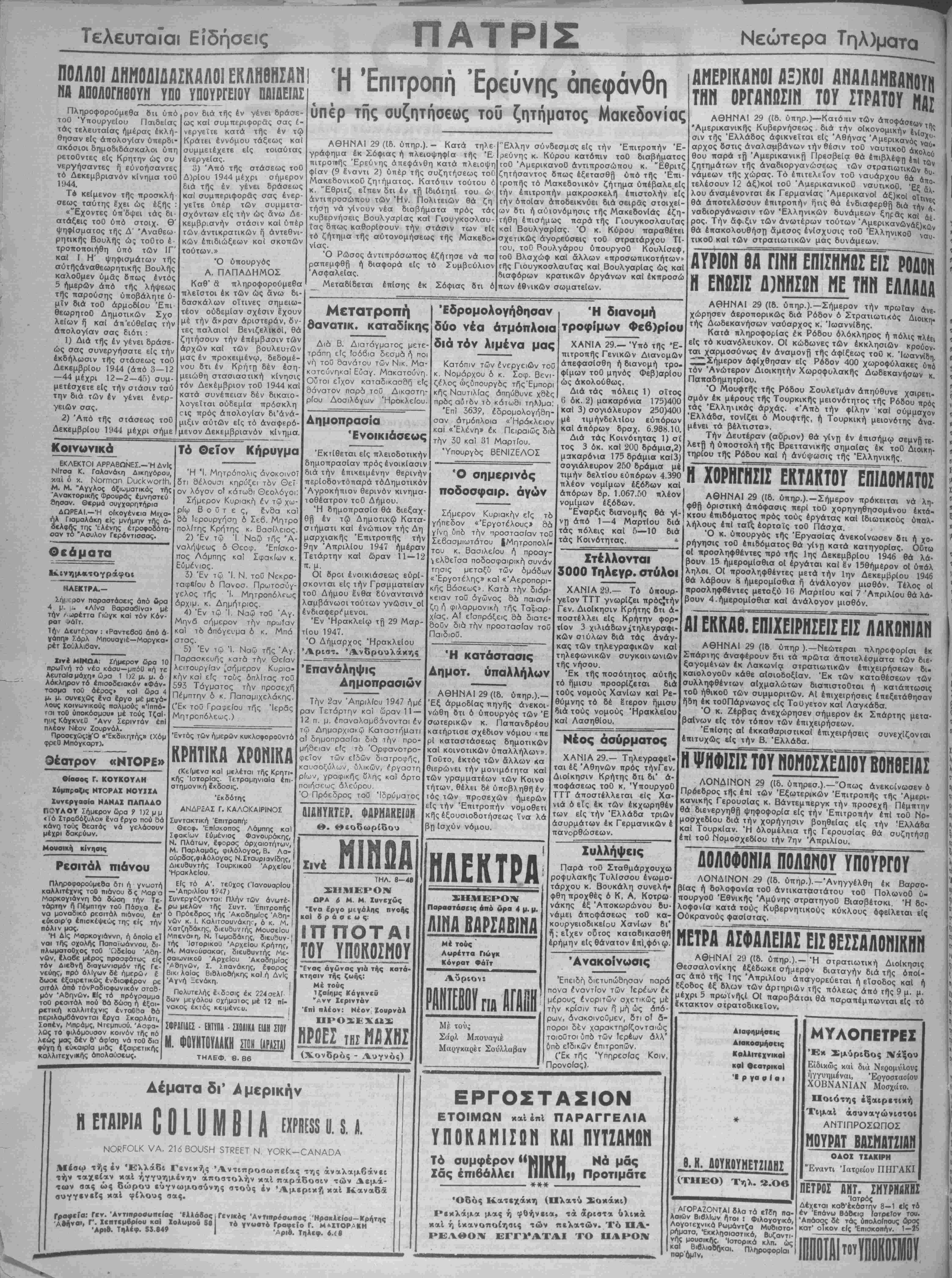κ. "Εθριτζ είπεν δτι έν τή ΙδιότητΙ τού ώ<· άντιπροσώπου των Ήν. Πολιτειών θά ζή τήστ) νά γίνουν νέα διαβήματα πρός τάς κυβερνήσεις Βουλγαρίας καΐ Γισυγκοσ-λαυ- ΐας δπως καθορΐσουν την στάσιν των είς τό ζήτημα τής αύτονομήσεως τής Μακεδο¬ νίας. Ό Ρώσος άντιπρόσωπος εζήτησε νά πά ραπεμφθή ή διαφορά είς τό Συμβούλιον "Ασφαλείας. Μεταδίδεται έπίσης έκ Σόφιας δτι ό "Ελλην σύνδεσμσς είς την ρεύνης κ. Κύρου κατόπιν Επιτροπήν Έ- τοθ διαβήματος ρη ρ τοϋ ΆμερικανοΟ άντιπροσώπου κ. Έθριτζ ζητήσαντος όπως εξετασθή υπό τής Έπι- τροπής τό Μακεδονικόν ζήτημα υπέβαλε είς την επιτροπήν μακροσκελή επιστολήν είς την οποίαν άποδεικνύει διά σειράς στοιχεί- ων δτι ή αύιονόμησις τής Μακεδονίας εζη¬ τήθη επισήμως παρά τής Γιουγκοσλαυΐας καί Βουλγαρίας. Ό σχετικώς άγορεύσεις ■ ου, τοθ Βουλγάρου ύπουργοθ Κουλίσεφ, τοθ Βλσχώφ καί άλλων «προσωπικοτήτων» τής Γιουγκοσλαυΐας καΐ Βουλγαρίας ώς καί διαφόρων κρατικόν όργάνων καΐ έκπροσώ πων έθνικών σωματείων. κ. Κύρου παραθέτει τοθ στρατάρχου Τί- Μετατροπή θανατικ. καταδίκης Διά Β. Διατάγματος μετε- τράπη είς ίσόβια δεσμά ή ποι νή τού δανάτου των Νικ. Μα- κατούνηκαΐ Εύαγ. Μακατούνη. Ούτοι είχον καταδικασδη είς θάνατον παρα τοϋ Δικαστη- ρίου Δοσιλόγων "Ηροκλείου. Δημοπρασία Ενοικιάσεως 'Εκτίθεται είς πλειοδοτικήν δημοπρασίαν πρός ενοικίασιν διά την έπικειμένην θερινήν περίοδοντόπαρά τόΔημοτικόν Αγροκήπιον θερινόν κινημα- ιοθέατρον τοθ Δήμου. Ή δημοπρασία θά διεξαχ¬ θή έν τώ Δημοτικώ Κατα¬ στήματι καί ενώπιον τής Δή μαρχιακής Έπιτροπής την 9ην Απριλίου 1947 ημέραν Τετάρτην καΐ ώραν 11—12 π. μ. ΟΙ όροι ενοικιάσεως ευρί¬ σκονται είς την Γραμματείαν τοθ Δήμου ένθα εύνανταινά λαμβάνωσι τούτων γνώσιν_οΙ ενδιαφέρη μενοι. Έν Ηρακλείω τή 29 Μαρ- τίου 1947. Ό Δήμαρχος Ηρακλείου Άριστ. Άνδρουλάχης Επανάληψις Δημοπρασιών Την 2αν Απριλίου 1947 ήμέ ραν Τετάρτην καΐ ώραν 11 — 12 π. μ. έπαναλαμβάνονται έν Δημαρχιακψ Καταστήματι αί δημοπρασίαι διά ΤΓδ,ν προ¬ μήθειαν είς τδ "Ορφανοτρο¬ φείον των είδών διατροφης, καυσοξύλων, υλικών, ίργαστη ρίων, νραφικΠζ ΰλης κα! άρτο ποιήσεως άλεύρου. Ό Πρόεδρος τοϋ Ίδρύματος ΔΙΑΝΥΚΤΕΡ. ΦΑΡΜΑΚΕΙΟΝ Θ. Θεοδωρίδου Σινέ ΜΙΗΟΑ ΤΗΛ. 8-4β ΣΗΜΕΡΟΝ ΩΡΑ 6 Μ. Μ. Ιυνεχύς "Ενα έ'ργο μεγόλης πνοης καΐ δ ρ ά ο ε μ ς: ΙΠΠΟΤΑΙ ΤΟΥ ΥΠΟΚΟΙΗΟΪ κατά· 'Ενας αγώνας γιά τής κτηοιν τής ζωής: Μ έ τοίις ΐζαίημς Κάγκνεϋ Άνν Χεριντάν Επί πλέον: Νέον Ζουρνάλ ΠΡΟΣΕΧΩΣ ΗΡ0ΕΣ τ»ΐ ΜΛΧΗΣ (Χονδρός - Λυγνός) Αέματα δι'Αμερικήν , Η ΕΤΑΙΡΙΑ Ε Ο ί Ω Μ Β ΙΑ ΕΧΡΚΕ55 0.5. Λ. ΝΟβΡΟίΚ νΑ. 216Βθυ$Η 5ΤΚΕΕΤ Ν ΥΟΙ5Κ-ΟΑΝΑΟΑ Μέσω τής έν Ελλάδι Γενικής Άντιπροαωπείας της άναλαμβάνει την ταχείαν καί ηγγυημένην αποστολήν καί παράδοσιν των Δεμά- των σας ώς δώρου εύγνωμοσύνης στούς έν Άμερική καί Καναδά βυγγενεΐς καί φίλους σας. . ΓοαφεΓα: Γεν. "Αντιπροβοπε/ας ΤΑΑάδος,Γενικάς Άντιτίρόσοπος Ήρακλε(ο«ι-Κρήτΐ|ς Άβήναι, Γ. ΚπτεμβρΙοιι καΐ Χολομοΰ 50 τό γνωοτό Γραφείο Γ. ΜΜΤΟΡΑΚΗ π Άριβ. Τηλέφ. 53.84* | Αριβ. Τηλβφ. Α.ίΒ Έδρομολογήθησαν δύο νέα άτμόπλοια διά τόν λιμένα μας Κατόπιν των ένεργειών τού κ. Νομάρχου δ κ. Σοφ. Βενι- ζέλος ώςύπουργδς τής'Εμπορι κης Ναυτιλίας άπηύδυνε χδές πρδςαύτδν τδ κάτωθι τηλ)μα Επί 363?, έδρομολογήδη σαν άτμόπλοια «Ήράκλειο καί «Ελένη» έκ Πειραιώς δι την 30 καΐ 31 Μαρτίου. Ύπουργδς ΒΕΝΙΖΕΛΟΣ Ο σημερινάς ποδοσφαιρ. αγών Σήμερον Κυριακήν είς τδ γήπεδον «Έργοτέλους» 8ά γίνη ύπδ την προστασίαν το Σεβασμιωτάτου |Μητροπολί τού κ. Βασιλείου ή προαγ¬ γελθείσα ποδοσφαιρικη συνά τ