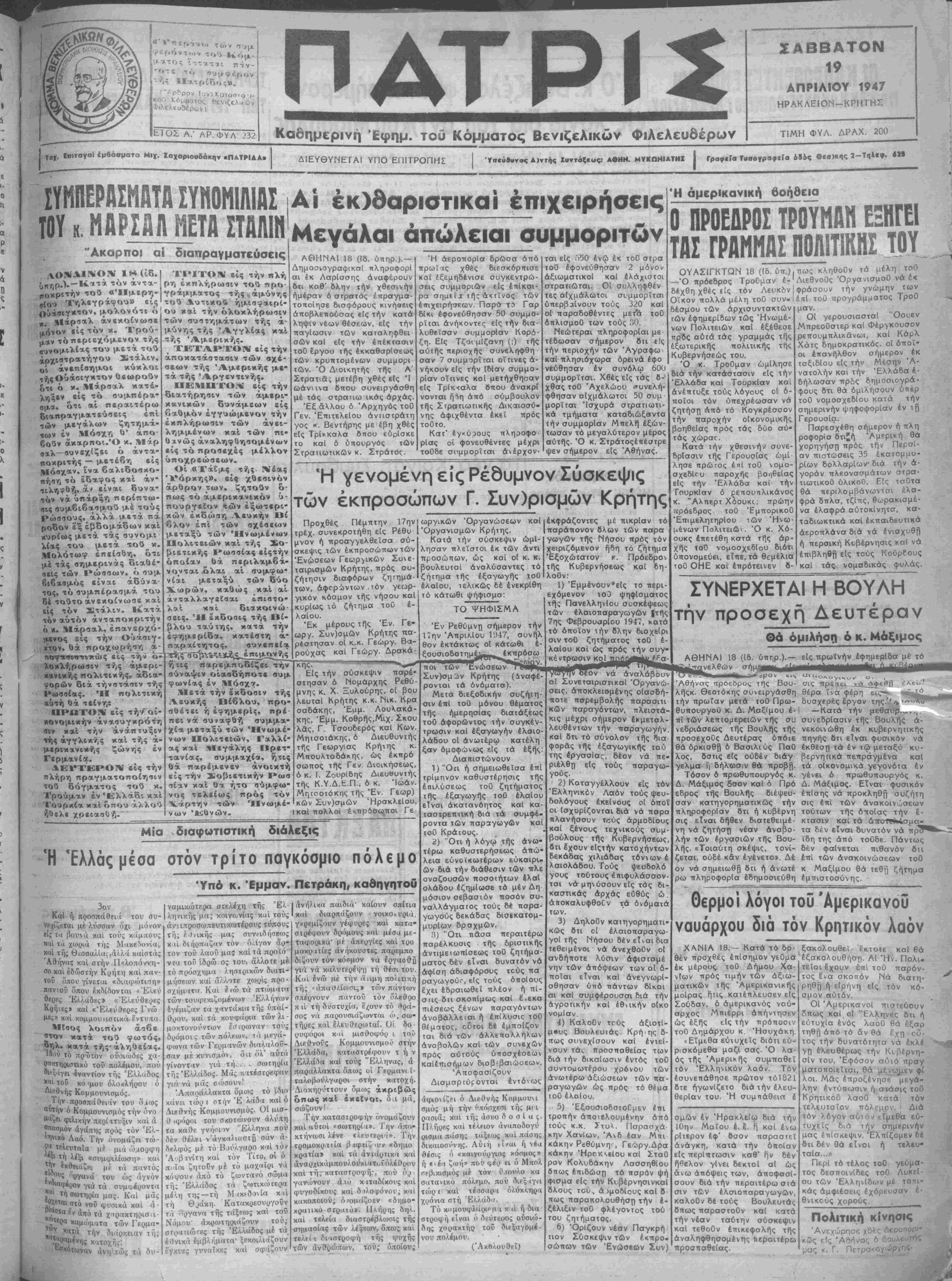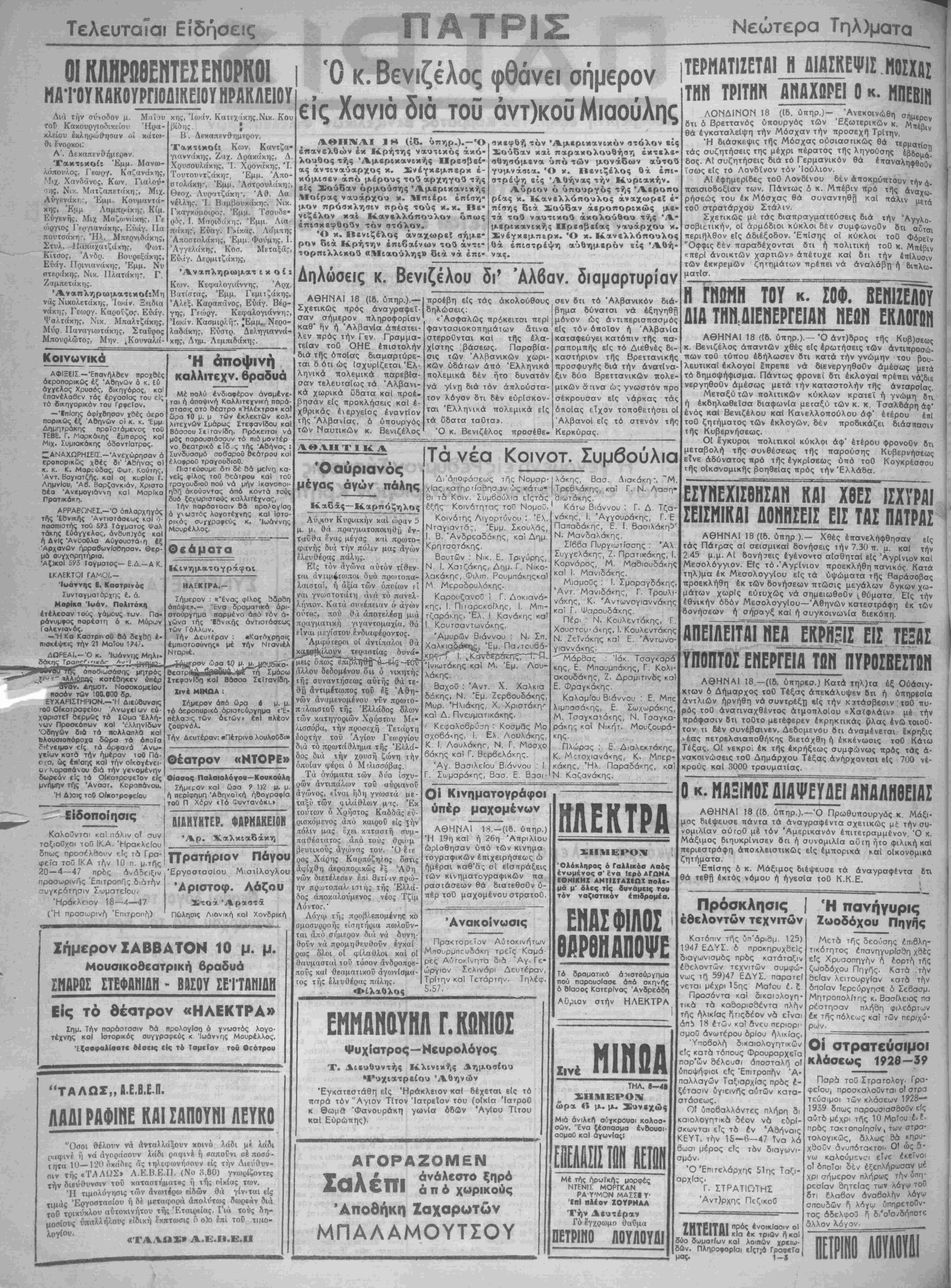 σχο6ά<ης, Ι. Ελ. Λουλάκης, Κ Ι Λουλάκηο, Ν. Γ. Μοσχο βάκης καΐ Γ. Βερβελάκης. €Αγ· Βασιλείου Βιάννου " Ι Γ. Σωμαράκης, Βασ. Ε. Βασι· Ίάκ Τσαγκαρά κης, Ε. Μπουμπάκης, Γ. Κολι- ακουδάκης, Ζ. Δραμιτινδς κα Ε. Φραγκάκης. Καλαμίου Βιάννου ■ Ε. Μπε λιμπασά^ης, Ε. Σωχωράκης Μ. Τσαγκατάκης, Ν. Τσαγκα ράκης καί Νικήτ. Μουζουρά- κης. Πλώρας : Ε. Διαλεκτάκης Κ. Μ·:τοχιανά<ης, Κ. Μπερ- κάκης, "Ηλ. Παραδάκης, κα Ν Καζανάκης. Οί* Κινηματογράφοι υπέρ μαχομένων ΑΘΗΝΑΙ 18. —(18. ύπηρ.) Ή 19η καί ή 26η Απριλίου ωρίσθησαν υπό των κινημα τογρσψικών έπιχειρήσεως ώ ημέραι καθ'ας οί εΐσπράξεις των κινηματογραφικών πά ρασιάσεων θά διατεθοθν υ¬ πέρ τοθ μαχομένου στρατοΟ Ανακοίνωσις Πρακτορείον Αύτοκινήτων Μπθυρμπουδάκη τρείς Καμά ρες Αύτοκίνητα διά "Αγ. Γε· ώργιον Σελινάρι Δευτέραν, Τρίτην καΐ Τετάρτην. Τηλέφ 5,57. Επίΐ ΑΗΟΥΗΛ Γ. ΚΩΗΙΟΕ Ψυχίατρος—Νευρολόγος Τ. Διευθυντής Κλινιχής Δημοσίου ,»,^- ^ ·4*υχιατρείου Αθηνών Εγκατεστάθη είς Ηράκλειον καί δέχεται^ είς τό παρά τόν "Αγιον Τίτον Ιατρείον τού (οίκία ΊατροΟ κ θωμά 'Φανουράκη γωνία όδών Άγίου Τίτου καί Εύρώτιης), . ΑΓΟΡΑΖΟΜΕΝ ανάλεστο ξ άπό χωρικούς Ιαχαρωτών ΜΠΑΑΑΜΟΥΤΣΟΥ ΗΛΕΚΤΡΑ ΣΗΜΕΡΟΝ Όλόκληρος ό Γαλλικοσ Αοός ένυμένος ο' ίνα Ιερό ΑΓΟΝΑ ΕΘΝΗΚΗΙ ΑΗΤΙΙΤΑΖΙΩΤ Πθλ«- μά μ' όλες τίς δυνάμεις τού τόν ναςιστικόν έπιδρομέα. ΕΗΑΣΦΙΛΟΣ ΟϋΡΒΗΑΠΟΨΕ Τό δραματικό άιιστούργηυα πού παρουοΐασε άπό οκηνής ό θΐαοος ΚατερΙνας Άνδρεάδη Αυριον στήν ΗΛΕΚΤΡΑ Νεώτερα Τηλ)ματα ΤΕΡΜΑΤΙΖΕΤΑΙ Η ΔΙΑΣΚΕΨΙΣ ΜΟΣΧΒΣ ΤΗΝ ΤΡΙΤΗΝ ΑΝΑΧΩΡΕΙ Ο κ. Ι1ΠΕΒΙΝ ον Ιινέ ΜΙΗΟΑ ΤΗΛ. β—41 ΣΗΜΕΡΟΝ ώρα ϋ μ. μ. Χυνεχώς Μιά όνιλεή σύγκρουσι κολοο οών. "Ενα ξέσπασμα ένθουβι- αομοϋ καΐ άγωνΐαςΐ Μέ τής ήρωϊκΓ|; μορφες ΝΤΕΝΙΣ ΜΟΡΓΚΑΝ ΡΑΥ'ΜΟΝ ΜΑΙΠ γ· ΈηΙ Πλέον ΧΟΥΡΝΑΛ Την Δευτέραν Γό Ιγχρωμο θαϋμα ΠΕΤΡΙΗΟ ΑΟΥΛΟΥΔΙ ΛΟΝΔΙΝΟΝ 18 (Ιδ. ύπηρ.)- Ανεκοινώθη σήμεοον 8τι δ Βρεττανός ύπουργός των Εξωτερικών κ. ΜπέΒΐν θά εγκαταλείψη την Μόσχαν την προσέχη Τρίτην. Ή διάσκεψις τής Μόσχας ούσιασηκώς θά τερμστίοπ τάς συζητήσεις της μέχρι πέρατος τής ληγούσης έβδομά 6ος. Αί συζητήσεις διά ΐό Γερμανικόν θά έπαναληΛθοΟν ΐσως είς τό Λονδίνον τόν Ιούλιον. Αί έφημερΐδες τοθ Λονδίνου δέν άποκρύπτουν την ά- παισιοδοξΐαν των. Πάντως δ κ. Μπέβιν πρό τής άναχ«! ρήσεώς τού έκ Μόσχας θά συναντηθ{| καΐ πάλιν με^ τοθ στρστάρχου Στάλιν. Σχετικώς μέ τάς δισπραγματεύσεις διά την Άγγλ0. σοβιετικήν, οί άρμόδιοι κύκλοι δέν συμφωνοθν δτι αυται περιήλθον είς άδιέξοδον. 'Επίσης οί κύκλοι τοθ Φόρε(ν "Οφφις 6έν παραδέχοντσι δτι ή πολιτική τοθ κ. Μπέβιν «περί άνοικτών χαρτιών» άπέτυχε καί 6ιι την επίλυσιν των έκκρεμών ζητημάτων ιχρέπει νά αναλάβη ή διτιλω- ματίσ.____________________________ ηΤνΩΜΗ ΤΟΥ κ. ΣΟΦ. ΒΕΝΙΖΕΛΟΥ ΔΙΑ «ΕΝΕΡΓΕΙΑΝ ΗΕΟΗ ΕΚΛΟΓΟΗ ΑΘΗΝΑΙ 18 (ίδ. ύπηρ.). — Ό άντ)8ρος τής Κυβ)σεως κ. Βενιζελος απαντών χθές είς ερωτηθείς των άντιπροσώ- πων τοό τύπου εδήλωσεν βτι κατά την γνώμην τού βου- λευτικαί εκλογαί έπρεπε νά διενεργηθοθν άμέσως μετά τό δημοψήφισμα. Πάντως φρονεί δτι εκλογαί πρέπει νά;διε νεργηθοθν άμέσως μετά την καταστολήν τής άνταρσίας. Μετσξύτών πολιτικών κύκλων κράτει ή γνώμη 6τι ή εκδηλωθείσα διαφωνία μεΐαξύ των κ. κ. Τσαλδάρη άφ' ενός καί Βενιζέλου καί Κανελλοπούλου άφ' ετέρου επί τού" ζητήματος των έκλογών, δέν προδικάζει διάσπασιν τής Κυβερνήσεως. ΟΙ έγκυροι πολιτικοί κύκλοι άφ' ετέρου φρονοθν δτι μεταβολή τής συνθέσεως τής παρούσης Κυβερνήσεως είνε άδύνατος πρό τής έγκρίσεως υπό τοθ Κογκρέσσου τής οίκσνομικής βοηθείας πρός την Έλλά