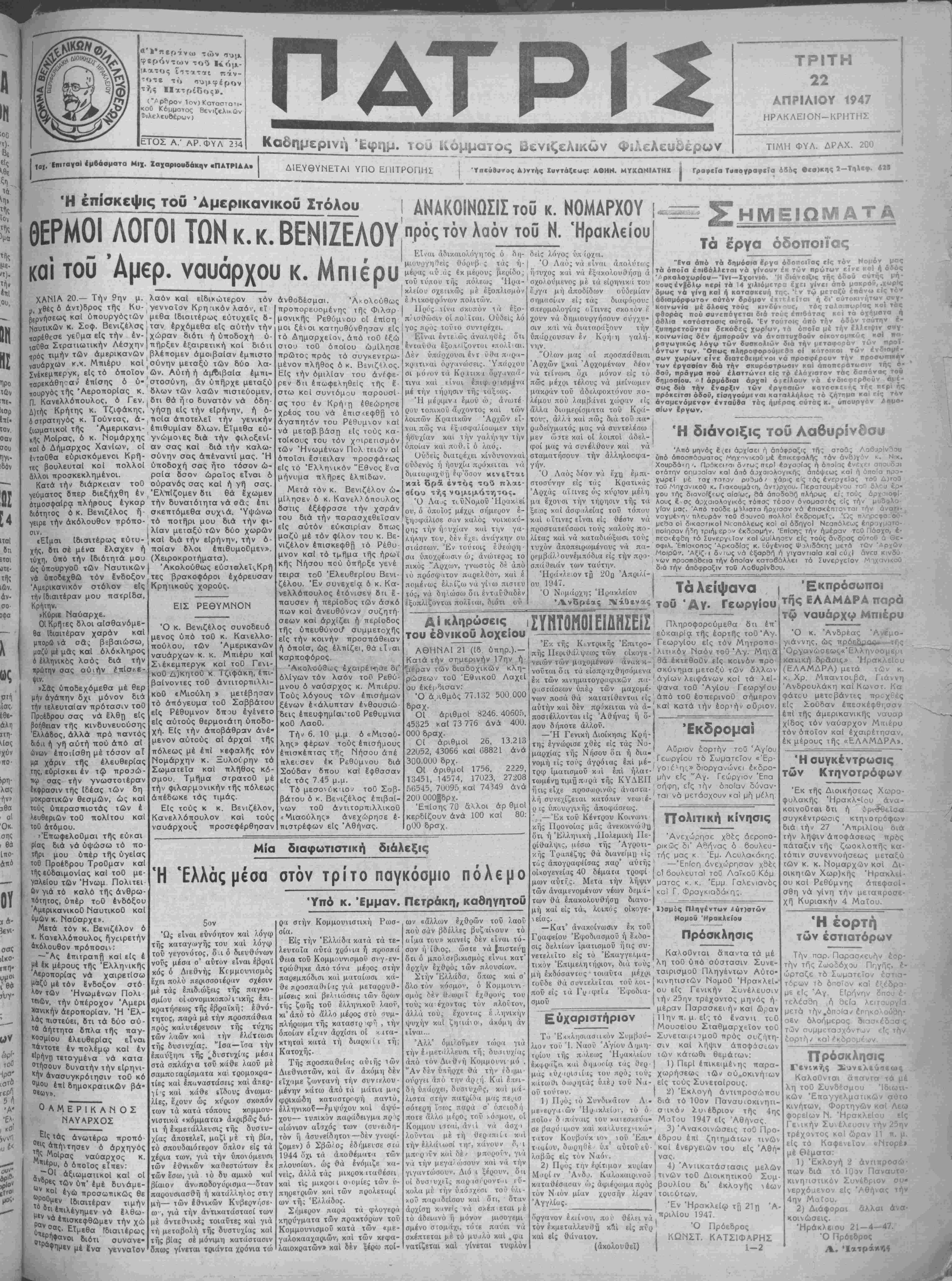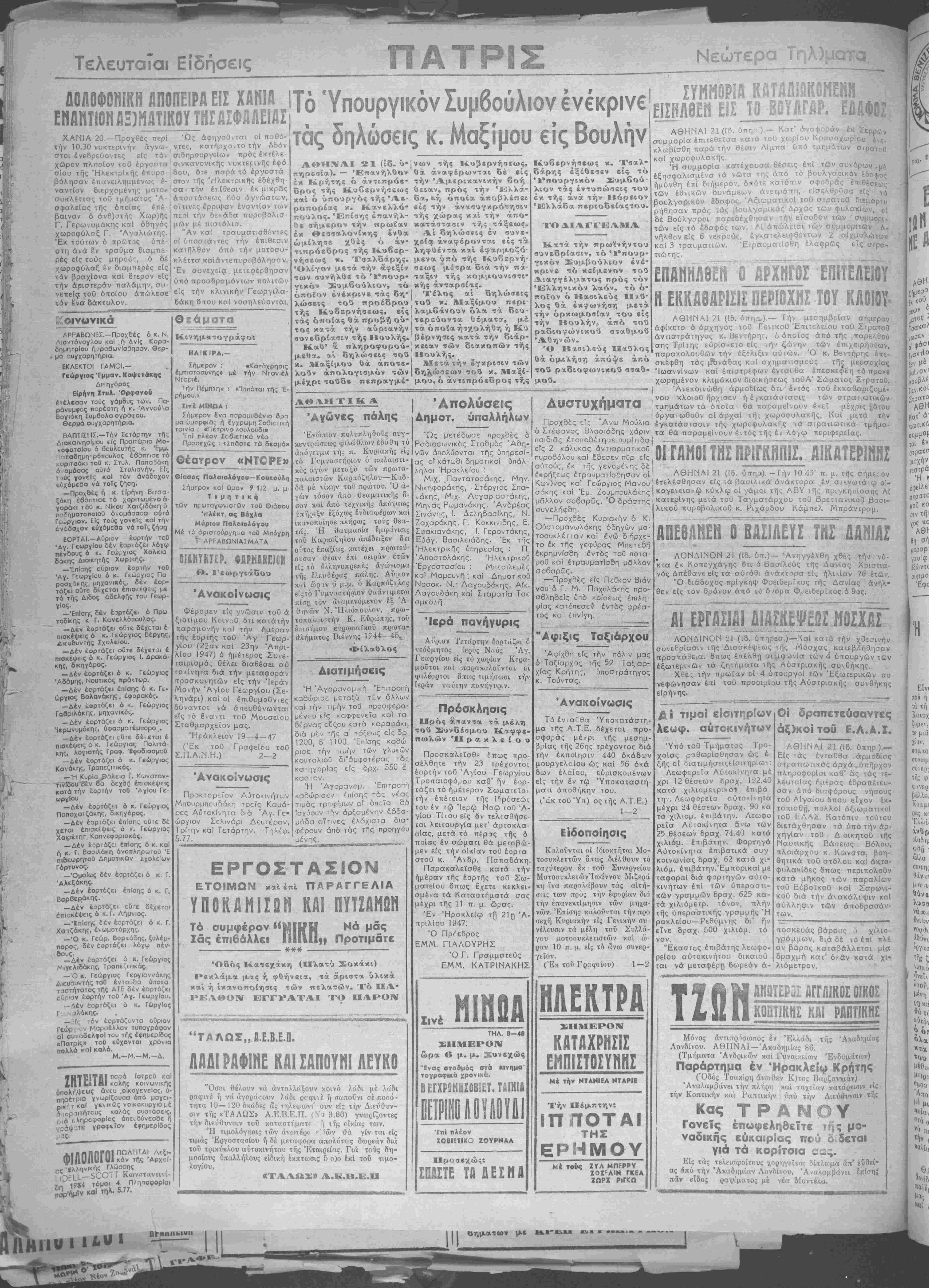 ΗΛ<ΊΠΡΑ.— Σήμερον ; «Κατάχρησις έμπισΓοσυνης» μέ την Ντανιέλ Νταριέ. ■"ήν Πέμπτην : «Ίππόται τής 'Ε- ρήμου.» Ζινέ ΜΙΗΩΑ : Σήμερον έ"να πσραμυθένιο δρα μοώμορφιάς ή έγχρωμη Σοβιετ κή ταινίαι «Πέτρινο λουλοθδι» "Επί πλέον Σοβιετικά νέα Προσεχώς : «Ιπαοτε τα δεσμά» θέατρον «ΝΤΟΡΕ» Οίασος Παλαιολόγου—Κουκούλη Σήμερον κοΙ ώραν 9 1)2 μ. μ Τ ι μη τ ι κή των πρωταγωνιστών τού ©ιάσου 'ίίλέκτ. άς Βάχλα Μαριου Παλαιολόγου Μέ τά^άρισΓθύργηαα τοθ Μπόγρη Γ ΑΡΡΑΒΩΝΙΑΙΜΑΤΑ ΒΙΟΥΚΤΕΡ. ΦΑΡΜΑΚΕΙΩ Θ. Γεωργιάδου Ανακοίνωσις Φέρομεν είς γνώσιν τοϋ ά ξιοτιμου Κοινοϋ δτι κατάτήν παραμονήν καί την ημέραν ιής εορτής τοΰ Αγ Γεωρ¬ γίου (22σν καί 23ην Απρι¬ λίου 1947) ό ήμέτερος Συνε¬ ταιρισμόν θέλει διαθέσει αύ το<ίνη:α διά την μεταφοράν ττροσκυνητών είς την Ιεράν Μονήν Άγίου ΓεωργΙου (Σε- ληνάρι) καί οί έπιθυμοθν.ες δύναντοι ά άπευθόνωνται είς τό ένατι τοϋ ΜουσεΙου Σταθμαρχεΐον μας. Ηράκλειον 19—4—47 (Έκ τοθ Γρσφείου τοθ Σ.Π.Α.Ν.Η.) 2—2 Ανακοίνωσις Πρακτορείον Αύτοκινήτων Μπθυρμπ<: υδάκη τρείς Καμά- ρες Αύτοκίνητα διό "Αγ. Γε¬ ώργιον Σελινόρι Δευτέραν, Τρίτην καΐ Τετάρτην. Τηλέφ. 5.77. ΛΘΙΙΝΑΙ 21 (ίδ. ύ-ϊνων τής Κυβερνήσεως, πηρεσία). — ΈπανήλΟον θά άναφέρωνται δέ είς έκ Κρήτης ό άντιπρόε- την Άμβρικανικήν βοή δρος τής Κυβερνήσεως θείαν, πρός την 'Ελλά- καί ό ύπουργός τής Άε- δα, «.ή όποία αποβλέπει ροπορίας κ. Κανελλό- είς την άνασυγκρότησιν πουλος. Έπίσης έπανήλ- τής χώρας καί την άπο- Θε σήμερον την πρωΐαν κατάστασιν τής τάξεως έκ ... Θεσσαλονίκης ένθα Αί δηλώσβις έν αυνε- ώμίλησε χθές ό άν χβία άναφέροντ*ι είς τ'ά τιπρόε5ρος τής Κυβερ- ληφθέντα καί έφαρμοζό νήσ&ως κ. Τααλδάρης. μενά υπό τής Κυββρνή- Όλίγον μετά την άφιξιν σβως μέτρα διά την πά των συνήλθε τό Υπουρ- τάξιν τής κομμουνιστι- γικόν Συμβούλιον, τό κης άνταρσίας. οποίον ενέκρινε τάς δή- Τέλος αί δηλωσεις λώσεις τού προέορου τού κ. ϋΐαξίμου πβρι- τής Κυβερνήσεως, είς1 λαμβάνουν όλα τα δευ- τάς οποίας θά προβή ού- ! τερεύοντα θέματν, μέ τος κατά την αυριανήν συνεδρίασιν τής Βουλής. Καθ' ά πληροφορού¬ μεθα, αί δηλωσεις τού κ. Μαξέμου θά άποτε- λούν άπολογισμόν των, μέχρι τούδε πεπραγμέ* μου, ό άντιπρόεδρος τής τα όποϊαήιχολήθη ή Κυ βέρνησις κατά την διάρ¬ κειαν των διακοπών τής Βουλής. ΛΙβ~άτήν έγκρισιν των δηλώσεων τού κ. Μαξί- . _ « ........ ^ _ β____.·«_ Κυβερνήσεως κ. Τααλ¬ δάρης έξέθεβεν είς τό Υπουργικόν Συμβού¬ λιον τάς έντυπώσεις τού έκ τής άνά την Βόρειον Έλλάοα περιοδείαςτου. ΤΟ ΔΙ ΑΓΓΕ ΑΜΑ Κατά την πρω'ίνήντου συνεδρίασιν, τό Υπουρ γικόν Συμβούλιον ένέ κρινε τό κείμενον τού Αιαγγέλματος πρός τόν Ελληνικόν λαόν, τό ο¬ ποίον ό Βασιλεύς Πχύ' λος θά έκφωνήση μετά την όρκωμοσίαν τού είς την Βουλήν, άπό τοΰ ραδιοφωνικοΰ αταθμοΰ Αθηνών. Ό Βασιλεύς Παΰλος θά ομιλήση άπόψε άπό τού ραδιοφωνικοΰ σταθ- μού. ΣΥΗΜδΡΙΑ ΕΙΣΗΛΘΕΝ ΕΙΣ 1α . Εΰί.ΦΓ' ΑΘΑΙΙΤΙΚ Α 'Δγωνες πάλης Ένώ.χιον πολυπληθονς συγ¬ κεντρώσεως φιλά&Λων εδόθη τύ άηόνευμα τής π. Κυριακής εί, ό λ άνμ ής τό Γυμναστήοιον ό παλαιστι- κός αγών μεταξύ των πρωτο- παλαιστών Καρ,τόζηλου—Καδ- δα μέ νίκην τοϋ πρώτου. Ό α¬ γών τόσον άπό θεαματικής ό¬ σον κ«Ί άπό τεχνικής απόψεως ύπήρεξν εξόχως ενδιαψέρων καί ίκιινοποί»)σε πλήρως τούς θεα- τάς. Ή θαυμασία εμφάνισις τοΰ Καρπύζηλου απέδειξεν δα ούτος επαξίως κατέχει πρωτεύ¬ ουσαν θέσιν επί σειράν έτών είς τό έό.ληνοπρ,επές άγώνισμα ιής ελευθέρας πάλης. Αυριον καί ώρ <ν 6 μ.μ. ό Καρπόζηλος ε(ςτό Γυμνΐίστήοιον θάάναμετω πίσχ) τϋν άναμενόμενον έξ Α¬ θηνών Ν. 'Η/αόπουλον, 