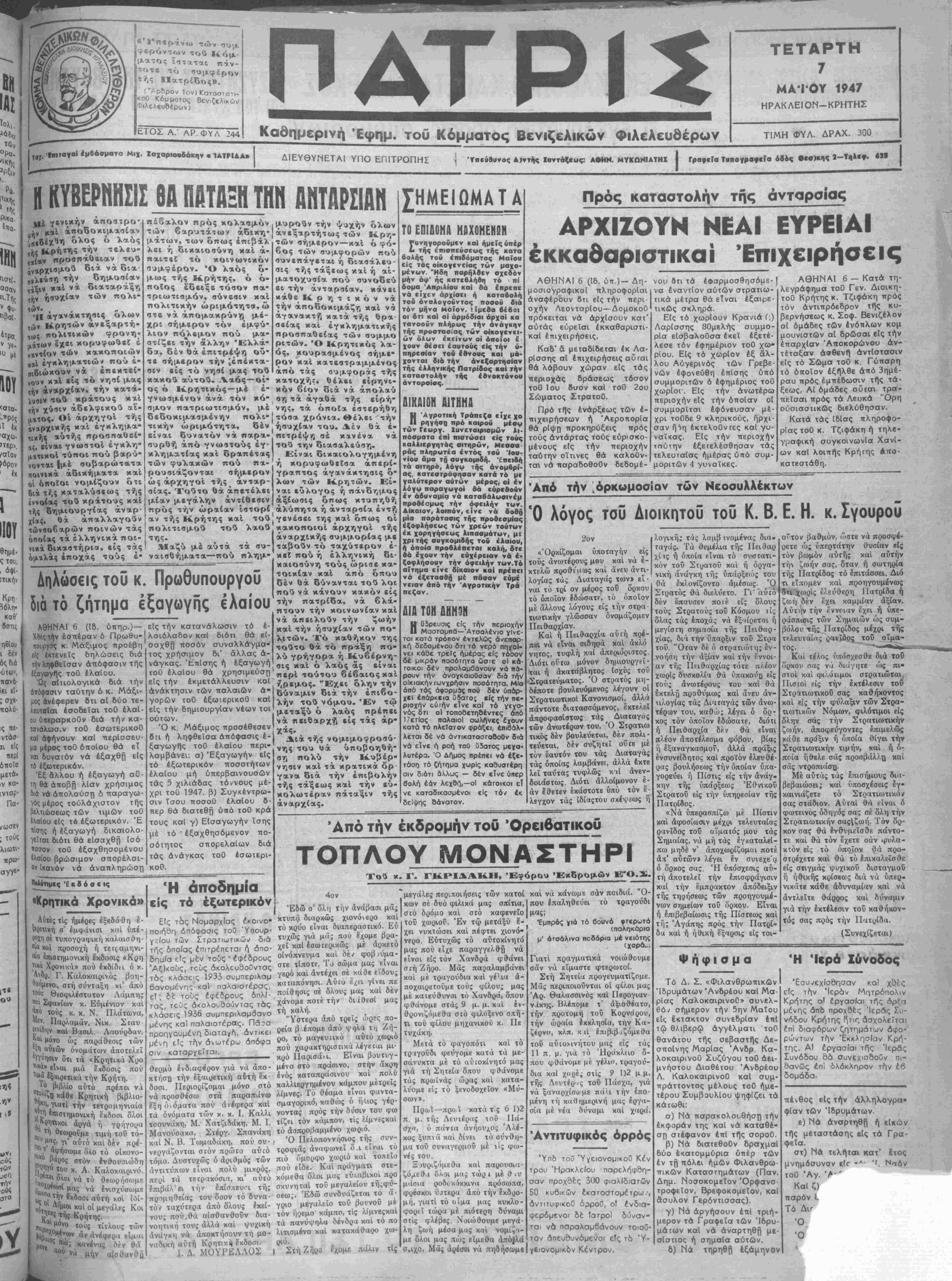 ίφερόντ<··ν τού Κόμ- 'μχτος ίσταται πάν- 'ΐθτβ τό συμφέρον Πατρίδος». ("άρδρον 1ον) Κστοσιοτι- κοθ Κόμμοτος Βενιζελικήν Φιλελευθέρων) ΕΤΟΣ Α.' ΑΡ. ΦΥΛ 244 Π ΑΤ ΡΙ Καθημερινή Εφημ. τού Κόμματος Βενιζελικών Φιλελευδέρων ΤΕΤΑΡΤΗ 7 ΜΑΊΌΥ 1947 ΗΡΑΚΛΕΙΟΝ-ΚΡΗΤΗΣ ΤΙΜΗ ΦΥΛ. ΔΡΑΧ. 300 τβϊ [. ΕιΐιταγαΙ έμβάσματα Μιχ. Ζαχαριουδάκην «ΊΑΤΡΙΑΑ» ΔΙΕΥΘΥΝΕΤΑΙ ΥΠΟ ΕΠΙΤΡΟΠΗΣ ] 'Τπε»β»νος Α)γτης Εονταξεος: Α·ΗΝ. ΜΥΚΟΝΙΑΤΗΧ Ι Γρα·«ϊα Ταπονραφεϊα όδός ·εσ)κης Ϊ-Τιιλε·. «II Η ΚΥΒΕΡΝΗΣΙΣ ΒΑ ΠϋΤΑΞΗ ΤΗΝ ΑΝΤΑΡΣΙΑΗ έ γενικήν άποστρο· *»ί αποδοκιμασίαν τελευ- «λς Μ.ρήτ*1?=».ν τελευ ,»,*ν προσπάθειαν τού δι* να δ&* ,»λ»Λ<ι?ί . δημοσίαν ,ίίιν καί νά διαταράξη την ησυχίαν των πολι- •II αγανάκτησις ολων ,ών Κρητών άνεξαρτή- ,ως πολιτικών φρονή- αΐτιον έχει κορυφωθεϊ ε ν*ντίον των κακοποιών *%ϊ εγκληματιών πού έ- πιδ.ώκουν νά έπεκτεί- ΥΟον καί είς τό νηαί μας φ άναρχίαν, την κατά- λυβιν τού κράτους καί ιήν χύσιν άδελφικού αΐ'- μι»τος. Οί άρχηγοί τής έν«ρχικής καί έγκλημα- υ έν«ρχής ιικής αυτής προσπαθεί- ις, είναι γνωστοί έγκλη- μχτικοΐ τύποι πού βαρύ- νονται |μέ σοβαρώτατα Βθΐν»κά άΒικήματα καί οί όποίοι νομίζουν ότι 6ι* τ?,ς καταλύσεως τής ΐννοίας τού κράτους καί τής οημιουργίας άναρ- χ£*ς, θά άπαλλαγούν τώνβαβαρών ποινών τάς οποίας τα έλληνικά ποι- νιχχ Βικαατήρια, είς τάς όμιλά; εποχάς τούς έ- πέβαλον πρός κολασμόν των βαρυτάτων άδικη- μάτων, των όπως έπιβάλ λει ή οικαιοσύνη καί ά- παιτεί τό κοινωνικόν συμφέρον. Ό λαός ό- μως τής Κρήτης, ό ο¬ ποίος εδειξε τόσον πα¬ τριωτισμόν, σύνεσιν καί πολιτικήν ώριμότητα,ώ ατε νά άπομακρύνη μέ- χρι σήμερον τόν εμφύ¬ ό ύ μυρούν την ψυχήν όλων ανεξαρτήτως των Κρη* των σήμερον—καί ό φό· 6ος των συμφορών πού συνεπάγεταιή διααάλευ- σις τής τάξεως καί ή αί- ματοχυσία πού συνοδεύ εί την άνταρσίαν, κάνει κάθε Κρητικόν νά την άποδθκιμάζη καί νά άγανακτή κατά τής θρα- σείας καί έγκληματικής προσπαθείας των συμμο ριτών. Ό Κρητικός λα¬ ός, κουρασμένος σήμε¬ ρον καί κατεστραμμένος λιον πόλεμον πού μα· στίζει την άλλην Έλλά- δα, δέν θά επιτρέψη θϋ· τε σήμερον την ',έπέκτα- σιν είς τό νησί μας τοΰΐαπο τάς κακού αυτού. Ααός—οί- κατοχήν, ος ό Κρητιχός—μέ έ- κόν βίον διά νά άπολαύ γνωσμένον άνά τόν κό- βη τα άγαθά τής είρή- αμον πατριωτισμόν, μέ νης, τα όποία εστερήθη δεδοκιμασμένην πολι-! τόαα χρόνια. Θέλει την τικήν ώριμότητα, δέν (ησυχίαν τού. Δέν θά έ- συμφοράς τής θέλει είρηνι είναι δυνατόν νά παρα< συρθή άπό γνωατούς έγ- κληματίας καί δραπέτας των φυλακών πού πα· ρουσιάζονται σήμερον ώς άρχηγοί τής άνταρ- σίας. Τούτο θά άπετέλει μίαν μεγάλην άντίθεσιν πρός την ωραίαν ίστορί πιτρέψη σέ κανέν* νά τού την διασαλεύση. Είναι δικαιολογημένη ή κορυφωθείσα άπερί- γραπτος αγανάκτησις δ- λων των Κρητών. Εί¬ ναι εΰλογος ή πάνδημος άξίωσις όπως κτυπηθή άλύπητα ή άνταρσία έντή αν τής Κρήτης καί τού γενέσει της καί όπως οί πολιτιβμού τού λαού Μαζύ μέ αύτά τα συ- ναιβθήματα—πού πλημ- Δηλώσεις τού κ. ΠρωΘυπουργοϋ ατό ζήτημα έξαγωγης ελαίου είς έκτενεΐς δηλώσεις διά την ληφθείσαν απόφασιν τής ΑΘΗΝΑΙ 6 (18. ύπηρ.)— είς την κατανάλωσιν τό έ- Χθέςτήν εσπέραν ό Πρωθυ- λαιόλαδον καΐ διότι θά εί- κ. Μάξιμος προέβη σαχθή ποσόν συναλλάγμα- τος χρήσιμον δι' άλλας α¬ νάγκας. ΈπΙσης ή έξαγωγή τού ελαίου θά χρησιμεύστ) είς την εκμετάλλευσιν κσί ανάκτησιν των παλαιών ά- γορών τοθ έξωιερικοϋ καί είς την δημιουργίαν νέων τοι ούτων. Ό κ. Μάξιμος προσέθεσεν 8ΐι ή ληφθεΐσα απόφασις έ- ξαγωγής τοΟ ελαίου περι- λσμβάνει: α) Εξαγωγ