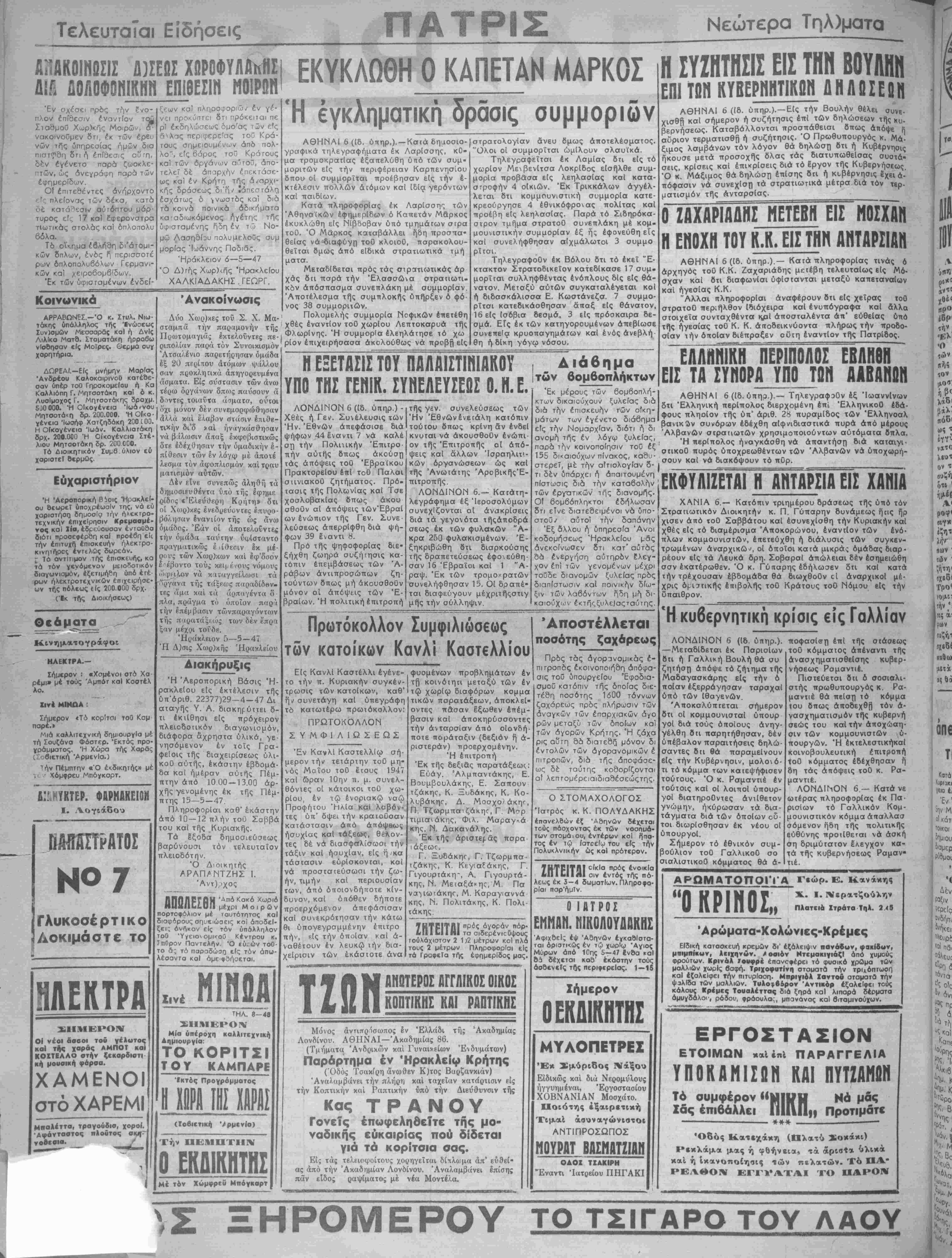 καιούχι,ιν έ<τηςξυλε)αςταύτης. Νεώτερα Τηλ)ματα Η ΣΥΖΗΤΗΣΙΣ ΕΙΣ ΤΗΝ ΒΟΥΛΗΝ ΕΠΙ ΤΩΝ ΚΥΒΕΡΗΗΤΙΚΩΗ ΔΗΛΩΣΕΩΝ ΑΘΗΝΑΙ 6 (ίδ. ΰπηρ.).—Είς την Βουλήν θέλει συνε- χισθη καΐ σήμερον ή συζήτησις επί των δηλώσεων τής Κυ. Βερνήσεως. Καταβάλλονται προσπάθειαι 6πως άπόψε κ αυριον τερματισθή ή συζήτησις. Ό Πρωθυπουργός κ. Μά· ξιμος λαμβάνων τόν λόγον θά δηλώση δτι ή Κυβέρνησις ήκουσε μετά προσοχής δλας τάς διατυπωθείσας συοτά- σεις, κρΐσεις καί έπικρΐσεις διά τό έργον τής Κυβερνήσεως. Ό κ. Μάξιμος θά δηλώση έπίσης Οτι ή κυβέρνησις ίχει α¬ πόφασιν νά συνεχίση τα στρατιωτικά μέτρα διά τόν τερ- ματισμόν τής Αντσροίας._______________ Ο ΖΑΧΑΡΙΑΔΗΣ ΜΕΤΕΒΗ ΕΙΣ ΜΟΣΧΑΝ Η ΕΗΟΧΗ ΤΟΥ Κ.Κ. ΕΙΣ ΤΗΝ ΑΝΤΑΡΣΙΑΗ ΑΘΗΝΑΙ 6(1δ. ύπηρ.).— Κατά πληροφορίας τινάς 6 άρχηγός τοϋ Κ.Κ. Ζαχσριάδης μετέβη τελευταίως είς Μό- σχαν καί δτι διαφωνίαι ύφΐστανται μεταξύ καπεταναΐων καί ήγεσίας Κ.Κ. "Αλλαι πληροφορίαι άναφέρουν 8τι είς χείρας τοθ στρατοθ περιήλθον Ιδιόχειρα καί ένυπόγραφα καί άλλα στοιχεΐα συνταχθέντα κρί άποσταλέντα άπ' εύθείας ύτιό τής ήγεσίας τοθ Κ. Κ. αποδεικνύοντα πλήρως την προδο- σΐαν ιήν οποίαν διέπραξεν ουΐη εναντίον τής Πατρίδος. ΤΑΛΗΝΙΚΗ ΠΕΡΙΠΟΛΟΣ ΕΒΛΗΘΗ ΕΙΣ ΤΑ ΣΥΗΟΡΑ ΥΠΟ ΤΩΝ ΑΑΒΑΝΩΝ ΑΘΗΝΑΙ 6 ((δ. ύπηρ.).— Τηλεγραφαθν έξ Ιωαννίνων δτι Έλληνική περίπολος διερχομένη επί ΈλληνικοΟ εδά- φους πληοίον τής ύπ' αριθ. 28 πυραμίδος των Έλληνοαλ βανικΰν συνόρων εδέχθη αίφνιδιαστικά πυρά άπό μέρους Άλβανών στρατιωτών χρησιμοποιούντων αύτόματα δπλα. Ή περίπολος ηναγκάσθη νά απαντήση διά καταιγι· σΐικοΟ πυρός ύποχρεωθέντων των Άλβανών νά ύποχωρή- σουν καί νά διακόψουν τό πϋρ. ΕΚΦΥΑΙΖΕΤΑΙ Η ΑΗΤΑΡΣΙΑ ΕΙΣ ΧΑΗΙΑ ΧΑΝΙΑ 6.— Κατόπιν τριημέρου δράσεώς τής υπό τόν Στρατιωτικόν Διοικητήν κ. Π. Γύπαρην δυνάμεως ήτις ί)ρ χισεν άπό τοθ Σαββάτου καί εσυνεχίσθη την Κυριακήν καί χθές είς τό διαμέρισμα Άποκορώνου, εναντίον των ένό· πλων κομμουνιστών, επετεύχθη ή διάλυσις των συγκεν- τρωμένων άναρχικών, οί όποΐοι κατά μικράς όμάδας βιαρ« ρέουν είς τα Λευκά δρη. Σοβαραί απώλειαι δέν εσημειώθη σσν εκατέρωθεν. Ό κ. Γύπαρης εδήλωσεν δτι καί κατά την τρέχουσαν έβδομάδα θά διωχθοθν οί άναρχικοί μέ¬ χρις όρι-7ΐικής έπιβολής τοθ Κράτους τοθ Νόμου είς την ύπαιθρον. Πρωτόκολλον Συμφιλιώσεως των κατοίκων Κανλι Καστελλίου Είς Κανλί Καστέλλι εγένε¬ το την π. Κυριακήν συγκέν¬ τρωσις των κατοίκων, καθ" ήν συνετάγη καί υπεγράφη τό κατωτέρω πρωτόκολλον: ΠΡΩΤΟΚΟΛΛΟΝ ΣΥΜΦΙΛΙΩΣΕΩΣ Έν Κανλί Καστελλίω σή¬ μερον την τετάρτην τοθ μη¬ νός Μαΐου τοθ ετους 1947 καί ώραν ΙΟην π. μ. συνελ¬ θόντες οί κάιοικοι τοϋ χω¬ ρίου, έν τώ ένοριακώ ναώ Προφήτου 'ΗλΙα καί λαβόν¬ τες ΰπ' δψει την κρατούσαν κατάστασιν άττό άπόψβως ήσυχΐας καί τάξεως, θέλον¬ τες δέ νά διασφαλίσωοι την τάξιν καί ησυχίαν, είς ή 'κα τάσιασιν ευρίσκονται, καί νά προσταιεύσωοι την ζω¬ ήν, τιμήν καί περιουσίαν των, άπό ότιοιονδήηοτε κίν¬ δυνον, καί οπόθεν δήποτε προερχόμενον απεφάσισαν καί συνεκρότησαν την κάτω θι ϋπογεγραμμένην έπιτρο πήν, είς την οποίαν καί ά- ναθέτουν έν λευκώ την δια¬ χείρισιν των εκάστοτε άνα φυομένων προβλημάτων έν τή κοινότητι μετσξύ των έν τώ χωρΐφ διαφόρων κομμα τικών πσρατάξεων, άποκλεΐ όντες πασάν έξωθεν έπέμ βάσιν καί άποκηρύσσοντε την άνταρσίαν άτιό οΐονδή ποτε ποράταξιν (δεξιάν ή ά ριστεράν) προερχομένην. Ή έπιτροπή "Εκ τής δεξιας παρατάξεως Εύαγ. Άλμπαντάκης, Ε Βουμβουλάκης, Ε. Σαπουν τζάκης, Κ. Ξυδάκης, Κ. Κο λυβάκητ, Δ. Μοσχο/ άκη<" Π. Τζωρμπαιζ