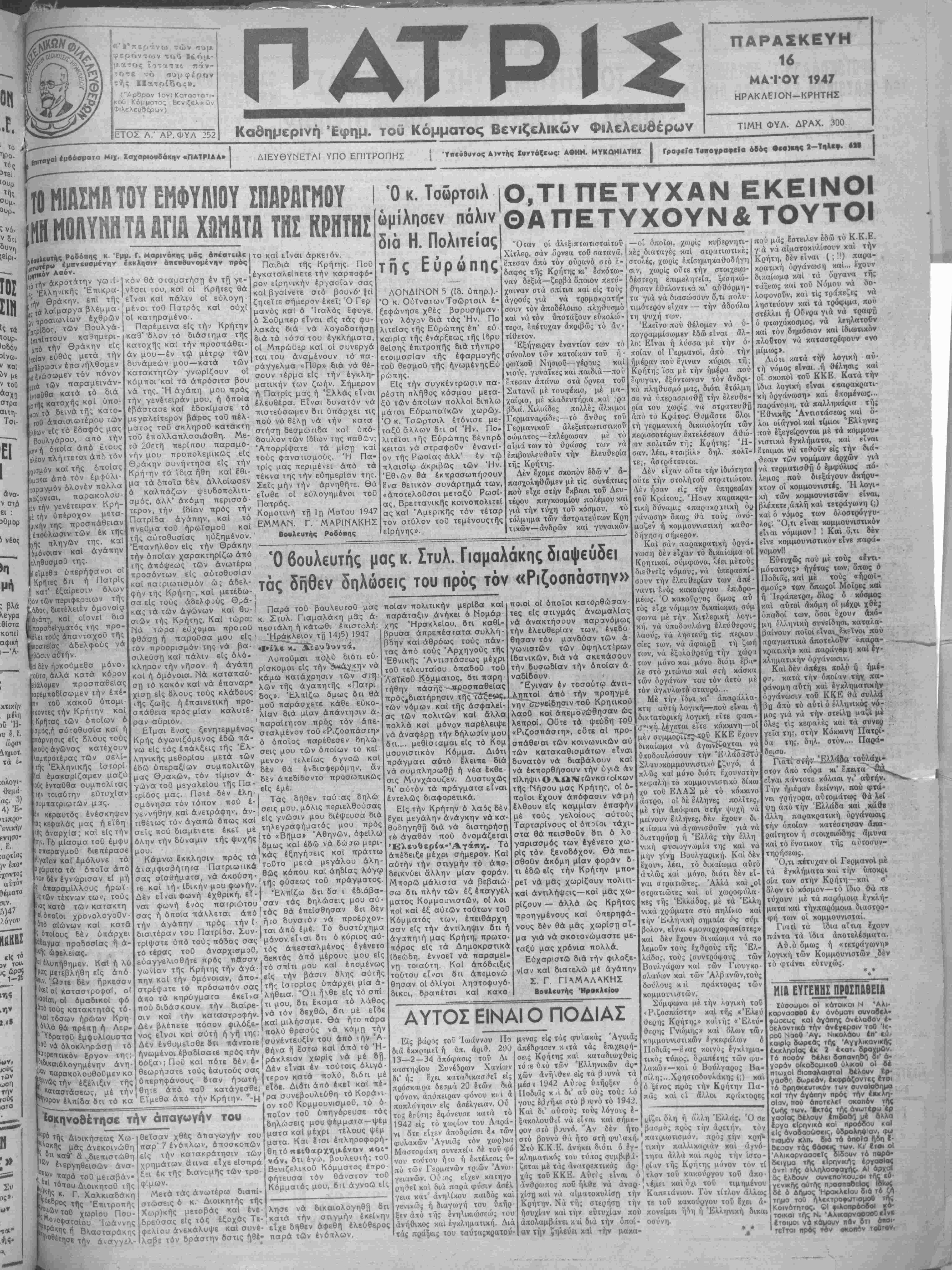 φερόντ<»ν τού Κόμ- 1*αιος Ι πάν- τό συμφέρον τής Πατρίδος». ("Αρδρον 1ον) Καταστατι- κοθ Κόμματος Βενιζελικήν Φιλελεύθερον) ΕΤΟΣ Α.' ΑΡ. ΦΥΛ 252 ΠΑΤ Καθημερινή Έφημ. τοΰ Κόμματος Βενιζελικήν Φιλελεύθερον ΠΑΡΑΣΚΕΥΗ 16 ΜΑΤΟΥ 1947 ΗΡΑΚΛΕΙΟΝ-ΚΡΗΤΗΣ Τ1ΜΗ ΦΥΛ. ΔΡΑΧ. 300 (ΐιιτβγαΙ Ιμβάσματα Μιχ. Ζαχαριουδάκη^ «ΠΑΤΡΙΑΑ» ΔΙΕΥΘΥΝΕΤΑ! ΥΠΟ ΕΠΙΤΡΟΠΗΣ ίθ Η1ΑΙΗΑ ΤΟΥ ΕΜΦΥΛ10Υ ΣΠΑΡΑΓΜΟΥ ΗΗ ΜθΑΥΗΗ ΤΑ ΑΓ1Α ΧϋΜΑΤΑ ΤΗΣ ΚΡΗΤΗΣ .. κ. Έμμ. Γ. Μαρινάκης μάς Απέστειλε ,ίΐ«τέρ» έμπνευομένην έκκλησιν άπευβυνομένην πρός » μ Λαόν. ρ,τ όίήν άκροτάτην γω,Ι- τήν θράκην Επικρα- έπί τής ,'χίιλαίμαργαβλέμμα- ίνιΐροαιωνίων έχθρών ΐαΓρίδος, των Βουλγά- {1ιπ[τΐτουν κα9ημερι- &Ι6 την Θράκην είς ί,οίαν ευθύς μετά την επανήλθομεν Λέν'ώσωμεν τόν πόνον ιΕΐά των παραμεινάν- ΐσθθα κατά τό διά ΐή-ςκατοχής κοΐ ΰπο- (ον τα δεινά τής κατο- τ00 άπαισιωτέρου των 1ων είς τό εδαφός μας Βουλγάρου, από την ΐν ή όποία άπό έτους ιλέον πλήττεται άπό τόν χισμόν καί τής οποίας «ατα άτιό τόν έμφύλι- ραγμόν δλονέν πολλα ,άζον.αι, παρακολου- :ν την γενέτειραν Κρή¬ την υπέροχον μετα- ιικήν της προσπάθειαν έηούλωοιν των έκ τής -?)ς τιληγών της, καί Ομόνοιαν καΐ αγάπην ^ηθυσμοο της. ύπερήφανοι οί Κρήτες Βα ή Πατρίς κατ' εξαίρεσιν δλων των περιφερειων τής διετέλειέν όμονοίςχ άγ6ττ.τ, κσί οίονεί διά ΙιταρσΜγματός της προ- (έλει τοθς άπανταχοΟ τής ιικρατείας άδελφούς νά ηθώσιν αύτην. ίβΙδέν ήοκούμεθα μόνον γοΟτο, άλλά κατά κόρον ■βάλομεν προσπαθείας ιαρεμποδΐσωμεν την έπέ- ιιν τοθ κακοϋ ύπομι- ικοντες την Κρήτην καί Κρήτας των οποίων ό ιομδς,ή αύτοθυσΐα καί ή ΐΐάρνησις είς δλους τούς «ούς αγώνας κατέχουν λαμπροτέρας των σελί- ΐτ)ς Έλληνικής ΙστορΙ >αί έμακαρΐζαμεν μαζύ