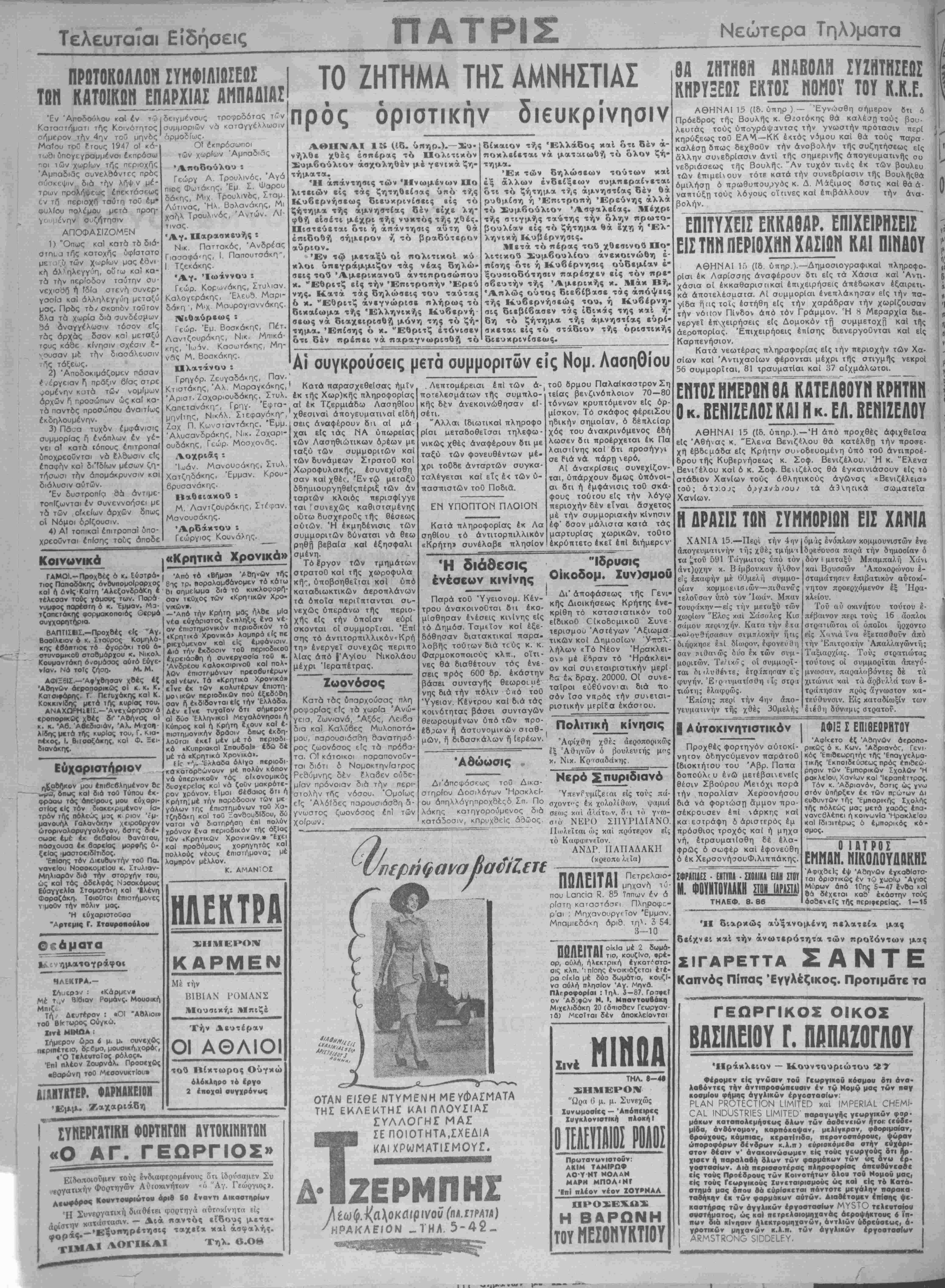 σης τό άντιτορπιλλικόν<Κρή τη» ένεργεΐ συνεχώς περιπο 1ας άπό |ΆγΙου Νικολάου μέχρι Ιεραπέτρας. Ζωονόσος Κατά τος υπαρχούσας πλη ροφορΐας είς τα χωρία Άνώ- γεια, Ζωνιανά, 'Αξός, Λειβα δια κα! Καλυβες Μυλοποτά¬ μου, παρουσιάσθη θανατηφό ρος ζωονόσος είς τα πρόβα- τα. ΟΙ κάτοικοι παραπονοΰν- ται διότι 6 Νομθκτηνίατρος Ρεδύμνης δέν Ελαβεν ουδε¬ μίαν πρόνοιαν διά τί^ν περι- σιολίΊν ΤΓ*ίς νόσου. "Ομοίως είς Άλόίδες παρουσιάσθη δ- γνωστος ζωονόσος επί των χοίρων. ΗΛΕΚΤΡΑ ΣΗΜΕΡΟΝ ΚΑΡΜΕΝ Μέ την ΒΙΒΙΑΝ ΡΟΜΛΝΣ Μουσική: Μπιζέ Την Δευτέραν ΟΙ ΑΘΛΙΟΙ τού Βίκτωρος Ουγκώ όλόκληρο τό ίργο 2 εποχαί ουγχρόνυς ΣΥΝΕΡΓΑΤΙΚΗ ΦΟΡΤΗΓΩΝ ΑΥΤΟΚΙΝΗΤΟΝ «Ο ΑΓ. ΓΕΩΡΓΙΟΣ» Ειδοποιούμεν τού; ενδιαφερομένους δτι Ιδρύσαμεν Συ νατικήν Φορτηγών Αυιοκινήτων «ό "Αγ. Γεώργιος». Λ«*ορος Κο«ντβ·Ρ"ύτσυ αριθ 80 Ιναντι ΑικαστηρΙαν Ή Συνεργατική διαθέτει φορτηγά αύτοκίνητα είς ' ίΛτϊΐν κατάστασιν. — Διά παντός εΐδους μετα· α οίς -♦ΑΒ?«"*)Ρ·τ»1β6? ταχεϊα καΐ ασφαλής. ΤΙΜΑΙ ΑΟΓΙΚΑΙ Τηλ. β.Ο8 Λεπτομέρειαι επί των ά-1 ποτελεσμάτων τής συμπλο- κής δέν ανεκοινώθησαν εΙ- σέτι. "Αλλαι (διωτικαί πληροφο ρίαι ϋεταδοθεϊσαι τηλεφω- νικώς χθές άναφέρουν δτι με ταξύ των φονευθέντων μέ· χρι τοθδε άνταρτών συγκα- ταλέγεται καί είς έ< των ύ- πασπισχών τοθ Ποδια. ΕΝ ΥΠΟΠΤΟΝ ΠΛΟ1ΟΝ Κατά πληροφορίας έκ Λα σηθίου τό άντιτορπιλλικόν «Κρήτη» συνέλαβε πλησίον τοθ δρμου ΠαλαΙκαστρονΣη τεΐας βενζινόπλοΐον 70—80 τόννων κρυπτόμενον είς όρ- μΐσκον. Τό σκάφος φέρειΣου ηδικήν σημαίαν, ό δέτιλοΐαρ χός τού άνακρινόμενος έδή λωσεν διι προέρχεται έκ Πά λαισιίνης καί ότι (ΐροσήγγι σε Ριά νά πάρη νερό. ΑΙ άνακρίσεις συνεχίζον- ται, ύπάρχουν δμως υπόνοι¬ αι δ τι ή εμφάνισις τοθ οκά φους τούτου είς την λόγω περιοχήν δέν είναι άσχετος μέ την συμ μοριακήν κίνησιν έφ' δσον μάλιστα κατά τάς μαρτυρΐας χωρικών, τοθτο έκρύπτετο έκεΐ επί διήμερον 'Η διάθεσις ένέσεων κινίνης Παρά τοθ Ύγειονομ. Κέν- τρου άνακοινοθται δα εκο¬ μίσθησαν ένέσεις κινίνης είς τό Δημόσ. Ταμείον καί εξε¬ δόθησαν διατακτικαΐ παρα- λοβής τούτων διά τεύς κ. κ. Φαρμοκοποιούς κλπ., οΐτι¬ νες θά διαθέτουν τος ένε- σεις πρός 600 δρ. εκάστην βάσει συνταγής θεωροιιιέ νης διά την πόλιν ύιιό τοθ Ύγειον. Κέντρου καί διά τάς κοινότητος βάσει συνταγών θεωρουμένων υπό των προ- έΒρων ή αστυνομικαι σταθ- μών, τ] διδασκάλων ή Ιερέων. 'Αβώωσις ν Δι'άττοφοσεως τού Δικα¬ στήριον Δοσιλόγων Ηρακλεί¬ ου άπηλλόγηπροχδέςδ Σπ. Πό λάκης κατηγορούμενος διά κατά5οσιν, κπρυχσείς άδώος "Ιδρυσις Οίκοδομ. Συν)σμοΰ ι Δι" αποφάσεως τής Γενι κης Διοικήσεως Κρήτης ένε κριθη τό καταστατικόν τοθ είδικοθ ΟίκοδομικοΟ Συνε τερισμου Άστέγων Άξιωμα τικών κοΐ Δημοσίων Ύττσ?ν λήλων «Τό Νέον Ήρακλει όν» μέ Ε5ραν τό εΗράκλει* όν καΐ συνεταιριστικήν μερΐ *α έ* δραχ. 20000. Οί συνε· ταΐροι εύθύνονιαι διά πό σόν ϊσο νπρός την συνειαι- ριστικήν μερΙΕα εκάστου. Πολιτική κίνησις Αφιχθη χθές άεροπορικώς έξ Αθηνών ό βουλευιής κ. Νικ. Κρ'<σαδάχης. Ηερά αραϋΐεη 'ΥπενΡνμίζεΐαι είς τούς πά- σχοντ«ς έκ χολολίθων, ψαμιά σεο)ς καί άλάτα,ν, οί ι ό γνω- σ-ό ΝΕΡΟ ΣΙΙΥΡΙΔΙΑΝΟ. ΙΙιιιλεΐται ώς καί πρότερον είς τό Καφφενείον. ΑΝΔΡ ΠΑΠΑΔΑΚΗ (κρεοπα λιΐα) ΠΩΛΕΙΤΑΙ που ίαποια Κ. 85 1'ππων έν ά ρίστη καΐαστάσπ Πληροφτ,- ρ'αι : Μηχανουργεΐον Έμμπν Μπαμιεδάκη άρισ την. 3 54 3—10 ΠίΙΑΡΙΤΑΙοίκ|α με 2 1ΙΙ£Ι1ΕΙΐΗΐ τ*σ, κουζΐνσ, *ρέ- ορ, ούλή, ήλεκτρική εγκατάστα¬ σις κλπ. 'ίπΐσης ένοικιόζίται ετέ¬ ρα οΐκΐα μέ δύο δωμάτια, κουζί- νο αύλή πλησίον Αγ. Μηνβ. Πλτροφορίαι : 1η. 3—8