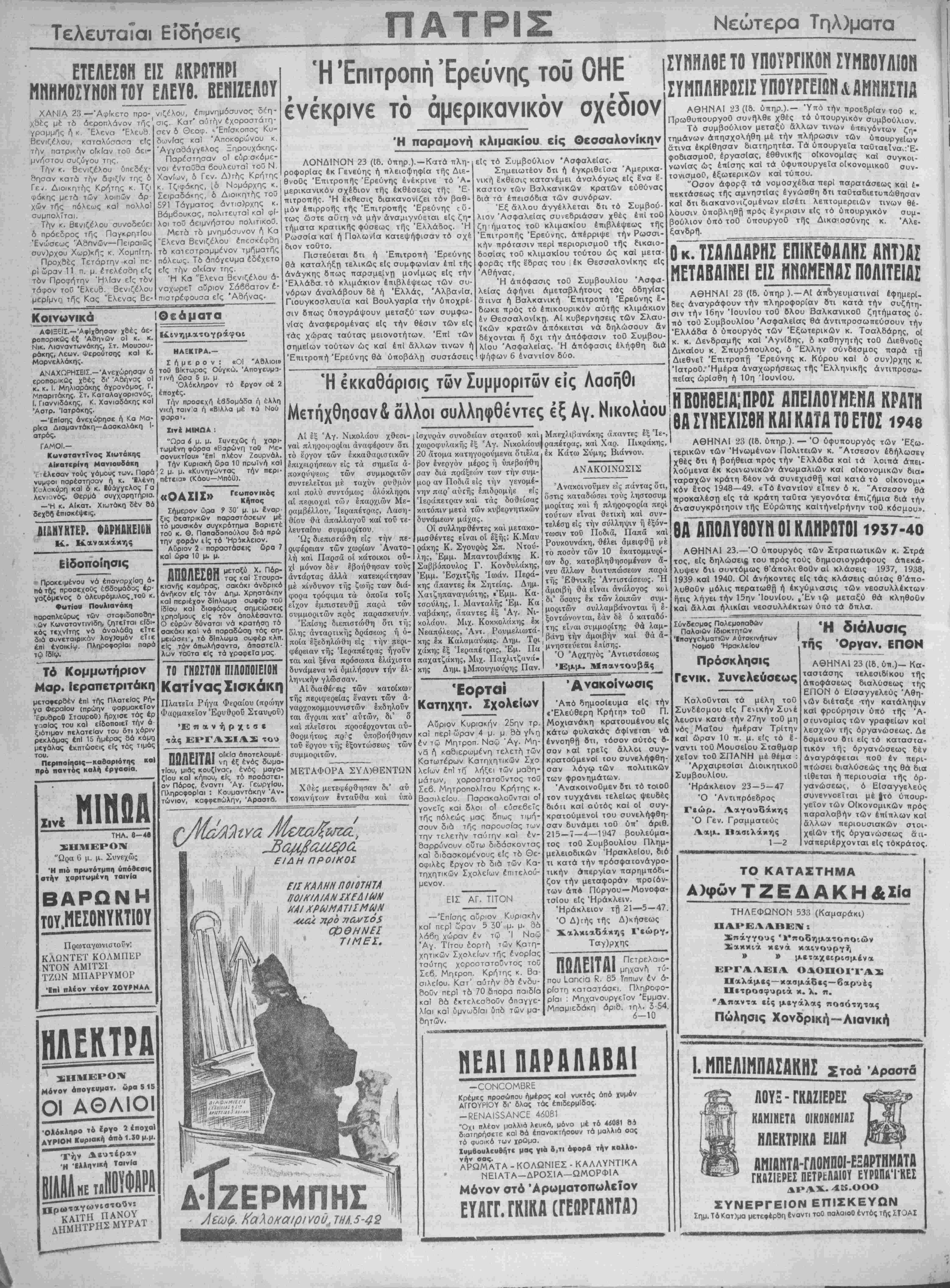 χάκη<; εξ Ιεραπέτρας, Έμ. Πά παχατζάκης, Μιχ. Παχλιτζ<ινά- κης Δημ. |Μπουγιούρης Παν. Κάτω Σύμης Βιάννου. ΑΝΑΚΟΙΝΩΣΙΣ Ανακοινούμεν εις πάντας ότι, όστις καταδώσει τούς ληστοσυμ μορίτας καί ή πληροφορία περί τούτων είναι θετική καί συν¬ τελέση είς την σύλληψιν ή εξόν¬ τωσιν τοΰ Ποδιά, Παπά καί Ρουκουνάκη, θέλει άμειφθη μ έ το ποσόν των 10 εκατομμυυί- ων δρ. καταβληθησομένων ά¬ νευ άλλων διατυπώσεων παρά τής Έθνικής Άντιστάσεως. Ή άμοιβή θά είναι άνάλογος κοί δι' όσους έκ των λοιπών συμ¬ μοριτών συλλαμβάνονται ή ε- ξοντώνονται, εάν δέ ό καταδό- της είναι σνμμορίτης θά λαμ¬ βάνη την αμοιβήν καί θά ά- μνηστεύεται έπίσης. Ό Άρχηγός Άντιστάσβως Έμμ. Μπαντουβάς ΣΥΝΗΛΘΕ ΤΟ ΥΠΟΥΡΓΙΚΟΝ ΣΥΜΒΟΥΛΙΟΝ ΣΥΜΠΛΗΡΩΣΙΣ ΥΠΟΥΡΓΕΙΩΗ & ΑΗΜΗΣΤΙΑ ΑΘΗΝΑΙ 23 (Ιδ. ύπηρ.).— Υπό την προεδρίαν τοθ κ. ΠρωθυπουργοΟ συνήλθε χθές τό υπουργικόν συμβούλιον" Τό συμβούλιον μεταξύ άλλων τίνων έιειγόντων ζη- τημάνων άττησχολήθη μέ την πληρώσιν των υπουργείων άτινα έκρίθησαν διατηρητέα. Τα ύπουργεΐα ταΟταεΐναΓ'Ε- ψοδιασμοθ, εργασίας, έθθνικής οίκονομίας καί συγκοι- νωνίας ώς έπίσης καί τα ύφυπουργεΐα οίκονομικοθ συν- τονισμοθ, εξωτερικών καί τύπου. "Οσον άφορά τα νομοσχέδια περί παρατάσεως καί ε¬ πεκτάσεως τής αμνηστίας εγνώσθη δτι ταθταδιετυτιώθησαν καί δτι διακανονΐζομένων εισέτι λεπτομερειών τίνων θέ¬ λουσιν υποβληθή πρός έγκρισιν είς τό υπουργικόν συμ¬ βούλιον υπό τού ύπουργοθ τής Δικα'οσύνης κ. Άλε- ξανδρή. ______________ Οκ.ΤΣΑΛΛΑΡΗΣ ΕΠ1ΚΕΦΑΛΗΣ ΑΝΤ]Α! ΜΕΤΑΒΑΙΝΕΙ ΕΙΣ ΗΝΩΜΕΝΑΣ ΠΟΛΙΤΕΙΑΙ ΑΘΗΝΑΙ 23 (Ιδ. ύπηρ ).—ΑΙ απογευματιναί έφημερί. 8ες άναγράφουν την πληροφορίαν Οτι κατά την συζήτη. σιν την 16ην ΊουνΙου τοθ δλου ΒαλκανικοΟ ζητήματος υ¬ πό τοθ Συμβουλίου Ασφαλείας θά άντιπροσωπεύσουν την Έλλάδα ό ύπουργός των "Εξωτερικών κ. Τσαλδάρης, οί κ. κ. Δενδραμής καί Άγνίδης, ό καθηγηΐής τοθ Διεθνοθς ΔικαΙου κ. Σπυρόπουλος, ό "Ελλην σύνδεσμος παρά τϋ Διεθνεΐ Έπιτροπη Ερεύνης κ. Κύρου καί ό συν)ρχης κ. ΊατροΟ. Ήμέρα αναχωρήσεως τής Έλληνικής άντιπροσω- πείας ωρίσθη ή 10η ΊουνΙου. ΗΒΟΗΘΕΙΑΙΠΡΟΣ ΔΠΕΙΛΟΥΜΕΗΑ ΚΡΑΤΗ ΘΑ ΣΥΝΕΧΙΣΘΗ ΚΑΙ ΚΑΤΑ ΤΟ ΕΤΟΣ1948 ΑΘΗΝΑΙ 23 (ίδ. ύπηρ ). — Ό ύφυπουργός των Έξω- τερικών των Ήνωμένων Πολιτειών κ. "Ατσεσον εδήλωσεν χθές ότι ή βοηθεία πρός την Έλλάδα καί τα λοιπά άπει- λούμενα έκ κοΐνωνικών άνωμαλιών καί οίκονομικών δια- ταραχών κράτη δέον νά συνεχισθή καί κατά τό οίκονομι- κόν έ"τος 1948—49. «Τό εναντίον είπεν ό κ. "Ατσεσον θά προκαλέση είς τα κράτη ταυτα γεγονότα έπιζήμια διά την άνασυγκρότηοιν τής Εύρώπης καίτήνείρήνην τοθ κόσμου». 8Α ΑΠ0ΛΥ80ΥΓ1 ΟΪ ΚΛΗΡΟΤΟ11957-40 ΑΘΗΝΑΙ 23.—Ό ύπουργός των Στραιιωτικών κ. Στρά τος, είς δηλώσει^ τού πρός τούς δημοσιογράφους άτιεκά- λυψεν δή συντόμως θ'άπολι θοθν αί κλάσεις 1937, 1938, 1939 καί 1940. Οί ανήκοντες είς τάς κλάσεις αύιας θ'άπο- λυθοϋν μόλις περατωθή ή έκγύμνασις των νεοσυλλέκτων ήτις λήγει την 15ην ΊουνΙου. ,Έν τώ μεταξύ θά κληθοθν καί άλλαι ήλικίαι νεοσυλλέκτων υπό τα 6πλσ. .. - ^ διάλυσις τής Οργαν. ΕΠΟΝ Έορται Κατηχητ. Σχολείων Αύριον Κυριακήν 25ην τρ. καΐ περί ώραν 4 μ. μ 8ά γΚη ίν τώ Μητροπ Ναώ Αγ. Μη- νά ή καθιερωμένη τελετί1) των Κατωτέρων Κατηχηιικών Σχο λείων επι τή λήξει των μαοη- μάτων, χοροστατοΰντος τού Σεβ Μητροπολίτου Κρήτης κ. ΒασιλεΙου Παρακαλοΰνται οί γονεΐς και δλοι οί εύσεβεϊς τής πόλεώς μας δπως τιμή- σουν διά τής παρουσίας των την τελετήν ταύτην καΐ έν- σαρρύνουν ούτω διδάσκοντος καΐ διδασκομένους είς τδ Θε- οφιλές έργον τδ διδ των Κα- τηχητικώ