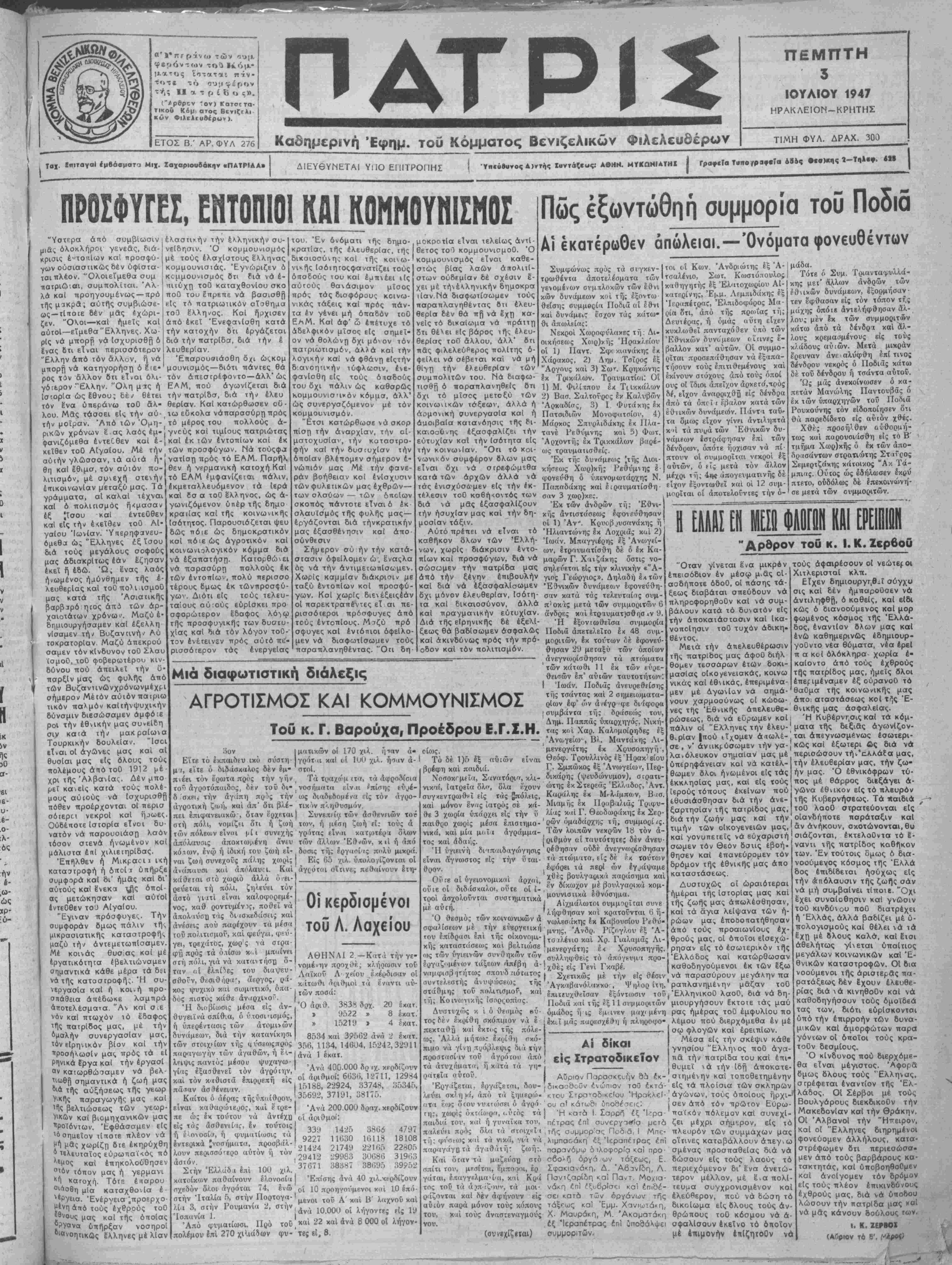 Ύηεύβυνος Α)ντής Ι«ντάζε«ς: ΑβΗΝ. ΜΥΚαΝΙΑΤΗΙ | ΓραφεΤα Τ·«ο **■«**« ββ4<· ΠΡΟΣΦΥΓΕΣ, ΕΗΤ0ΠΙ01ΚΑΙ ΚΟΜϋΟΥΠΙΣΜΟΣ "Υστερα άτιό συμβΐωσιν μιάς όλοκλήροι γενεάς, διά- κρισις έ"τοπΙων κπί προσφύ¬ γων ούσιαστικώς δέν υφίστα¬ ται πλέον. "Ολοιεί'μεθα συμ πατριώται, συμπολίται. Άλ¬ λά καΐ προηγουμένως —πρό τής μακρά; αυτής συμβιώσε- ως —ΐίποιε δέν μάς εχώρι- ζεν. "ΟΛοι—καΐ ημείς καί αύτοΐ—είμεθα 'Έλληνες. Χω- ρΐς νά μπορρ νά ίσχυρισθή ό εας 6τι είναι περισσότερον "Ελλην άπό τόν άλλον, ή νά μπορή νά κατηγορήση ό εΊε έλ-ασΐιι·ήν την ελληνικήν ου-1 τού. Έν ονόματι τής δημο- μοκροτΐα είναι τελείως άντΐ νεΐδησιν. Ό κομμουνισμός κρατίας, τής έλευθερΐαο, ΐΗς θετος τοθ κομμουνισμοθ. '(. μέ τούς έλαχΐστους έλληνας κομμουνιστάς. "Εγνώριζεν ό κομμουνισμός 6π διά νά ε¬ πιτύχη τοϋ καταχθονΐου σκο ποθ τού έΉ,ρεπε νά βασισθή Βΐς τΛ πατριωτικόν σΐσθημα τοϋ Ελληνος. ΚοΙ ήρχισεν άπό έκεΐ Ενεφανίσθη κατά την κατοχήν 8τι έργάζεται διά την πατρΐδα, διά την έ λευθερΐαν. Έπαρουσιάοθη δχι ώςκομ μουνισμός—διότι πάντες θά ρος τόν άλλον δα &Τ*αι όλι- τόν άπεστρέφοντο — άλλ' ώς γόιερόν Έλλην. "Ολη μκ ή ΕΑΜ, πού άγωνΐζεται διά Ι ώ 6θ δέ θέ η ΐδσ δά τη έλευ ΙθίορΙα ώς 6θνου; δέ.» θέτει την πατρΐδσ, διά την έλευ τόν ίνα υπεράνω τοθ όλ- θερΐαν. Καΐ κατώρθωσεν οϋ· λου. Μδς τάσοει είς την αύ- ( τω εΰκολα νάπαρασύρη πρός την μοίραν. Άπό τών Όμη- τό μέρος τού πολλούς ά- ρικων χρόνων £ άς λαός έμ·!γνούς καί τιμίους πατριώτας φανιζόμεθα έντεθθεν καί έ-|καί έκ των εντοπίων καί έκ κεΐθεν τοθ ΑΙγαΙου. Μέ την τών προσφύγων. Νά τούςφα αύτην γλώσσαν, τα αύτά ή· θη καΐ έθιμσ, τόν αύιόν πο¬ λιτισμόν, μέ συνεχή στενήν επικοινωνίαν μεταξύ μας. Ίά γράμματα, αί καλαί τέχναι καί ό πολιασμός ήκμασαν έξ |ΐσου καί εντεύθεν είς την έχεΐθόν τοθ ΑΙ· γαίου Ίωνίαν. 'Υπερηφηνευ- όμεθα ώ; Έλληνες έξ ΐσου διά τούς μεγάλους σοφούς μας άδιακρΐτως εάν έζησαν έκεΤ ή έβώ. Ώ, Ινας λαός ηνωμένος ήμύνθημεν τής ε¬ λευθερίας καί τοΟποΗ ισμοθ μας κατά τής Άσιατικής βαρβΐρό Γ}Εος άπό τών αρ¬ χαιοτάτων χρόνων. Μαζύ έ· Βημιοοργήσαμεν καί έξελλη νίσαμεν τή/ Βυζαντινήν Αύ τοκρατορΐαν. Μαζύ άπεκρού σαμεν τόν κίνδυνον τοθ Σλαυ (σμοθ, τοθ φοβερωτέρου κιν- δύνου πού άπειλεΐ την ϋ· τισρξΐν μας ώς φυλής άτιό τών Βυζανηνώνχρόνωνμέχρι σήμερον Μέιόν αύιόν παιριω τικόν παλμόν καίιήνψυχΐχήν δυναμιν διεσώσαμεν άμφό.ε ροΐ την εθνικήν μας συνεΐθη σιν καιά την μακρσίωνα Τουρκικήν δουλεΐαν. "Ισε είναι οί άγώνες μας καί α θυσίαι μας είς δλους τούς πολέμους άιτό τοθ 1912 μέ χρι τής ΆλβανΙας. Δέν μπο ρεΐ κανείς καΐά τούς πολέ- μους αύιούς νά Ισχυρισθή πόθεν προέρχονται οί ττερισ σότερπ νεκροί καί ή^ες Ουδέποτε Ιστορία εΤνοι δυ νατόν νά παρουσιάση λαόν τόσον στενά ηνωμένον κα' μάλιστα επί χιλιειηρίδας. Επήλθεν ή Μικραι: 11 ι«τ καταστροφή ή δποί ι υπήρξε συμφορά καί δι" ημάς καί δι' αύτούς καΐ Ενεκα τ^ς όττοΐ άς μετώκησαν καί αύτοι εντέυθεν το'ο ΑίγαΙου. "Εγιναν πρόσφυγες. Την συμφοράν Βμως πάλιν τή· μικρασιατικήν καταστροφήν μαζύ την άντεμετωπίσαμεν Μέ κοινάς θυσ.ας κσί μέ ίργατικότητα ίβελτιώναμεν σημαντικά κάθε μερά τα δεί νάτής καταστροφήν Ή συ νεργασία καΐ ή κοι.ή προ σπάθεια απέδωκε λαμπρά άτίοτελέσματα. "Αν καί νόν καί πτωχόν τό έδαφος ^ζ πατρίδος μας, μέ την ομαλήν συνεργασίαν μας Τ°ν ειρηνικόν βίον καί την 1<ροσήλ.ωσ1ν μας πρός τα ε" Ρηνικά Ιργα καΐ την έργασί °ν καιωρθώααμεν νά βελ οημαντικά ή ζωή μας τής αυξήσεως τής γεωρ ής παραγωγής μας καί βελτιώσεως τών γεωρ καί βιομη