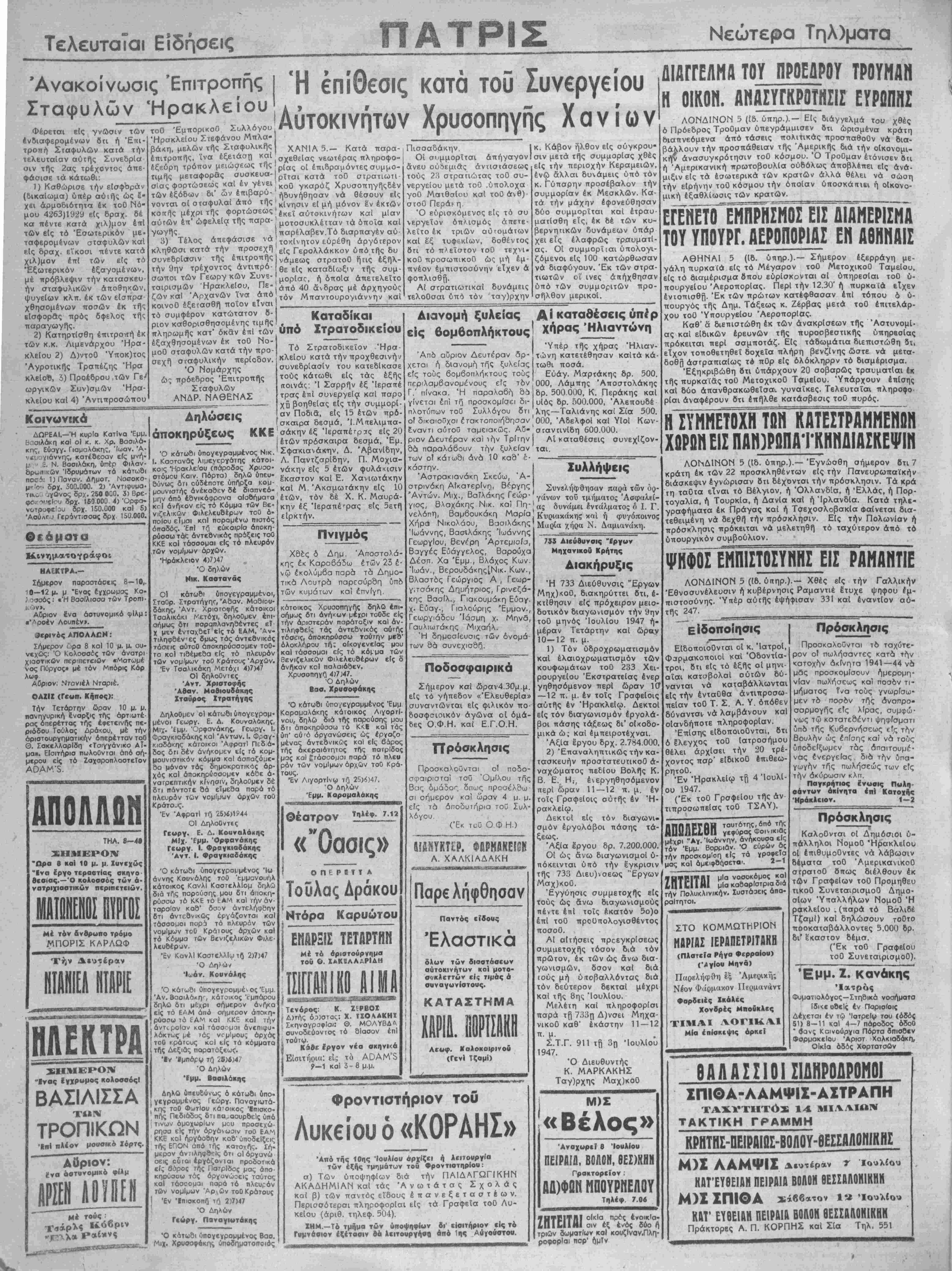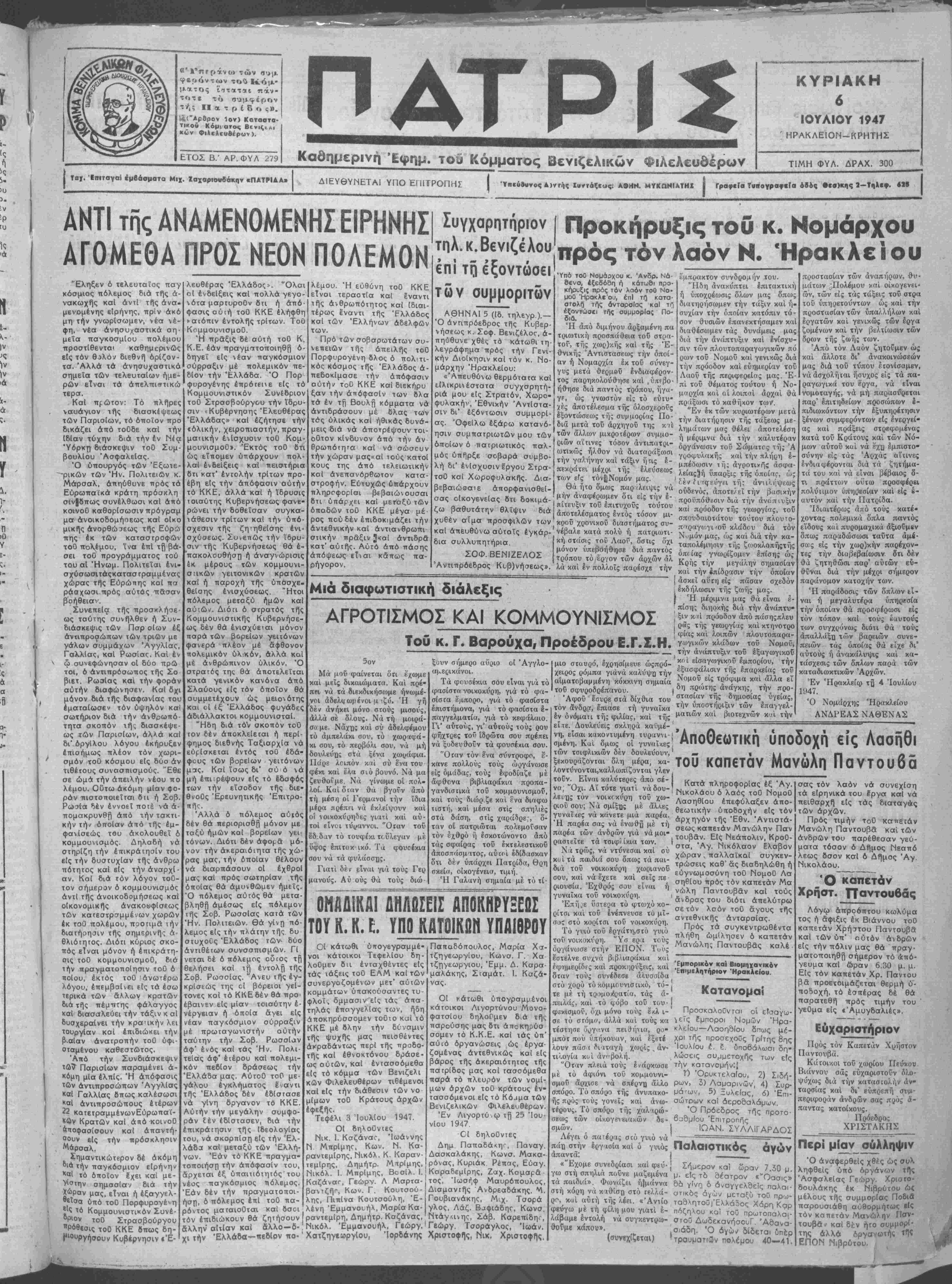 5&<"Άρ8ρον ΐον) Καταστα- τικοδ Κόμιατος Βεν κύν Φιλελεύθερον ). ΕΤΟΣ Β.' ΑΡ. ΦΥΛ 279 ΠΑΤ ΚΥΡΙΑΚΗ 6 * ΙΟΥΛΙΟΥ 1947 ΗΡΑΚΛΕΙΟΝ-ΚΡΗΤΗΣ ΤΙΜΗ ΦΥΛ. ΔΡΑΧ. 300 Τβχ. Επιταγαί έμβάσματα Μιχ. Ζαχαριουδάκη* «ΠΑΤΙΗΑΑ» Καθημερινή Έφημ. τοί» Κόμματος Βενιζελικήν Φιλελεύθερον 1 "Υπε.ύουνος Α>/Γ^ς Ιιι/τάς«ας; ΑΘΗΝ. ΜΤΚΠΝΙΑΤΗΙ | ΓραφεΙα ΤιιαογραφεΓα όδος θεα)κης 2-Τηλ>·. «Μ