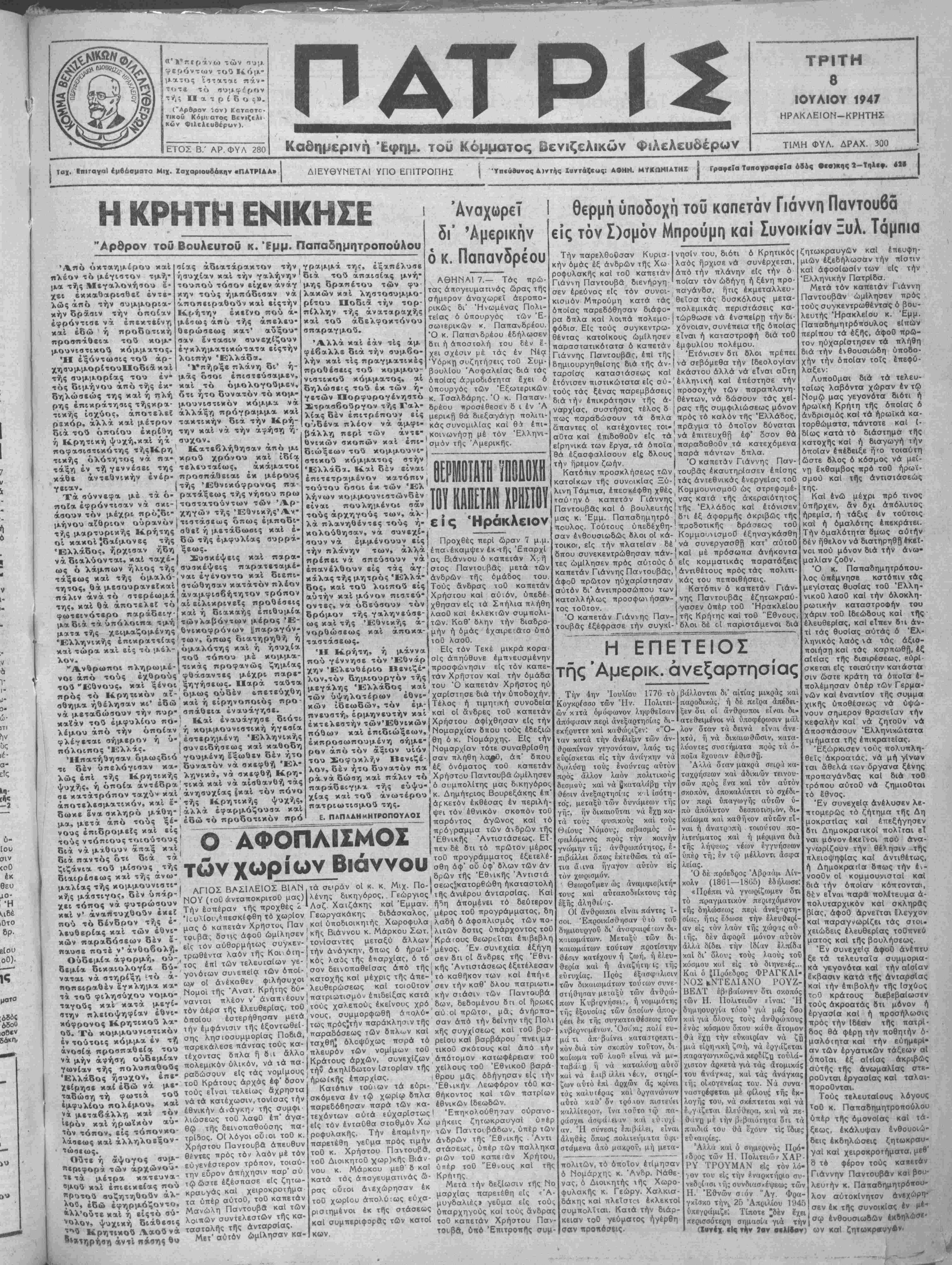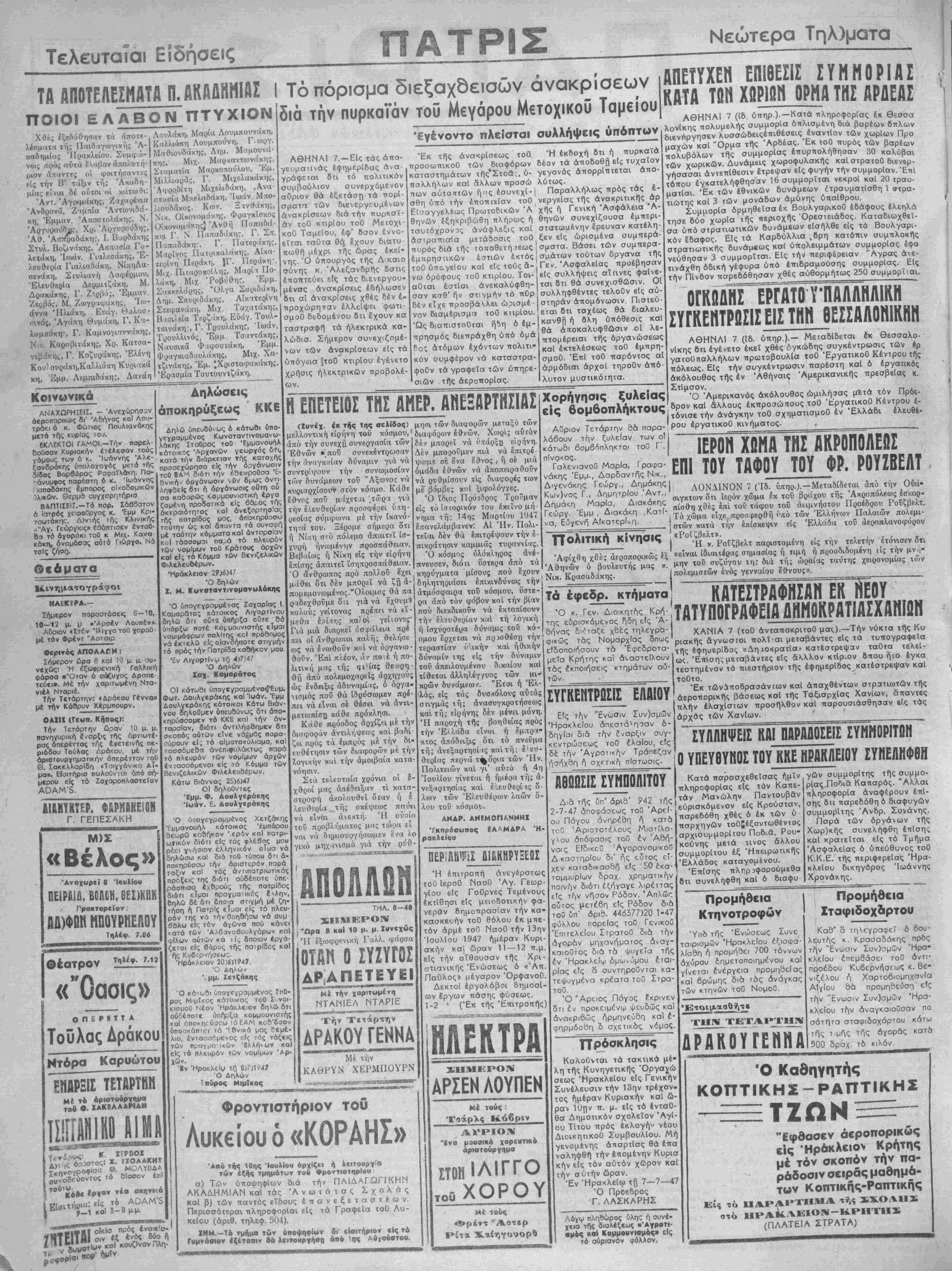 με βόμβες χ<Λ ξιφολόγγες. Ό ϊδιος ΠρΟΒδρος Τροΰμαν είς τό ιστορικόν τού έκεΐνο μή- νημα τή; 14ης Μαρτίου 1947 έπανελάμβανεν! Αί Ήν. Πολι¬ τειαι δέν θά έπιτρέψουν την ε¬ πικράτησιν καμμιάς τυρανιίας. Ό κόσμος δλόκληρος άνέ- πνευσεν, διότι ΰστερα άπό τα κηρύγματα μίσους πού εχουν δηλητηριάσει επικινδύνως την άτμόσφαιρα τοϋ κόσμου, ϋστε- ρα άπό τόν φόβον καί την βίαν πού διεκδικοΰν νά έκτοπίσουν την ελΕυ&ερίαν καί τή λογική ή ίσχυροτέρα δύναμις τού κό¬ σμου έρχεται νά πρισθέσο την τεραστίαν ύικήν καί ηθικήν δύναμίν της είς την δύναμιν τοϋ άπειλουμένου δ,καίου καί τίθεται άλληλέγγυος των μι- κρών δυνάμεων. "Ετσι ή Ελ¬ λάς, είς τάς δυσκόλους αύτάς στιγμάς τή; ανασυγκροτήσεως καί τή; Είρήνης δέν μένει μόνη. Ή παροχή τής βοηθείας πρός την Έ/ λάδα είναι ή έμπρα- κτος απόδειξις ότι τό πνενμα τή; άνεξαρτησί τς καί τή, έ'ευ- θερίας περνά" τβ^δρια των Ήν. Πολιτειών καί γι' αύτό ή 4η Ιουλίου γίνεται ή ήμέρα τής ά- νί.ξ(ϊρτησίας καί εΐευθερίτς ο λων των Έλευθέρων λαών δ- λου τοϋ κόσμον. ΑΝΑΡ. ΑΝΙΜΟΓΗΑΝΙΝΗΧ Τκπρέσωπος ΕΑΑΜΑΡΑ Η¬ ρακλείου Χορήγησις ξυλείας είς βομβοπλήκτους Αϋριον Τετάρτην δα παρα-'Ρου έργατικοΟ κινήματος. Νεώτερα Τηλ)ματα ΑΠΕΐΥΧΕΗ ΕΠΙΘΕΣΙΣ ΣΥΜΜΟΡΙΑΙ ΚΑΤΑ ΤδΗ ΧΠΡ1ΠΙ1 ΟΡΜΑ ΤΗΣ ΑΡΔΕΑΣ ΑΘΗΝΑΙ 7 (Ιδ ύπηρ ). —Κατά πληροφορίας έκ Θίισσα λονίκης πολυμελής συμμορία όπλισμένη διά βαρέων οπλων διενήργησεν λυσσώδειςέπιθέσεις^ εναντίον των χωρίων Προ μαχών καί "Ορμα τής Άρδέας. Έκ ΐοθ πυρός των βαρέων ' πολυβόλων τής συμμορίας έπυρπολήθησαν 30 καλύβαι των χωρικών. Δυνάμεις χωροφυλακής καΐστρατοθ διενερ- γήσασαι άντεπίθεσιν έτρεψαν είς φυγήν την συμμορΐαν. 'ΕτιΙ τόπου έγκατελήφθησαν 16συμμορΐται νεκροΐ καί 20 τραυ- ματΐαι. Έκ των έθνικών δυνάμεων έτρσυματΐσθη 1 «τρα- τιώτης καί 3 των μονάδων αμύνης ύπαίθρου. Συμμορία όρμηθεΐσα εις Βουλγαρικοθ έδάφους έλεηλά τησε δύο χωρία τής περιοχής Όρεσιειάδος. Καταδιωχθεί¬ σα υπό στραΐιωτικών δυνάμεων εΐσήλθε είς τα Βουλγαρι¬ κόν εδαφος. Είς τα Καρδύλλια ν6ρη κατόπιν συμπλοκής στρατιωτικίΐς δυνάμ€ως καί ύπολειμμάτων συμμορίας έφο νεύθησαν 3 συμμορΐται. Είς την περιφέοειαν "Αγρας άνε- τινάχθη όδική γέφυρα υπό έπιδραμούσης συμμορίας. Είς την Πίνδον παρεδόθησαν χθές αυθορμήτως 250 συμμορΐΐαι. ΟΓΚΩΔΗΠρΓΑΤΟ Υ'ΠΑΛΛΗΛΙΚΗ ΣΥΓΚΕΝΤΡΩΣΙΣ ΕΙΣ ΤΗΝ ΘΕΣΣΑΛΟΝΙΚΗΝ ΑΘΗΝΑΙ 7 (Ιδ. ύπηρ ).— ΜεΐαδΙδεται έκ Θεσσαλο¬ νίκης δτι εγένετο έκεΐ χθές όγκώδης συγκέντρωσις των *ρ γαιοϋπαλλήλων πρωτοβουλία τοθ ΈργατικοΟ Κένιρου τής πόλεως. Είς την συγκέντρωσιν παρέστη καί ό εργατικάς άκόλουθος τής έν Αθήναις Άμερικανικής πρεσβείας κ. Στίμσον. Ό Άμερικανός άκόλουθος ώμιλήσας μΐτά τάν Πρόε¬ δρον καί άλλους έκπροσώηους τοθ 'ϋργατικοθ Κέντρου έ- I τόνισε την ανάγκην τοθ σχηματισμοθ έν Ελλάδι έλευθέ- ΙΕΡΟΝ ΧΩΜΑ ΤΗΣ ΑΚΡΟΠΟΛΕΒΣ ΕΠΙ ΤΟΥ ΤΑΦΟΥ ΤΟΥ ΦΡ. ΡΟΥΖΒΕΛΤ ΔημάκηςΙ ίηιι 'Δν/τ ' Διγενάκης Γεώργ Κων)νος Γ , Δημητρΐου Άντ., Δημάκη Μαρία, Διακάκης Γεώργ Έμμ , Διακάκη Κατί¬ να, Εύγενή Αίκατερίνη ΛΟΝΔΙΝΟΝ 7 (Ίδ. ύπηρ.).—Μεταδίδεται άπό την Ούά- σιγκτων δΐι ιερόν χώμα εκ τοϊ βρσχου τής Άκροπόλεως έσκορ- πίσθη χθές επι τοΰ τάφου τοϋ αειμνήστου Προέδρου Ροίζβελτ. Το χώμα εΐχε προσφερθή ί'^ά των Έλλήνων Παλαιών πολεμι- στών κατά την επίσκεψιν είς Έλλάδα τοϋ άεροπλανοφόρου «ΡοΓζβελτ». ι Ή «. ΡοΓζβελτ παρισταμένη είς την τελετήν ετόνισεν δτι Αφιχθη χθέ; «εροπορικώς έξ «είναι ιδιαιτέρας σημασίας ή τιμ,ή ή προσδιδομένη ιίς την μν,,- μην τού σύζυγον τη: διά τή; ωραίας ταύτης χειρο