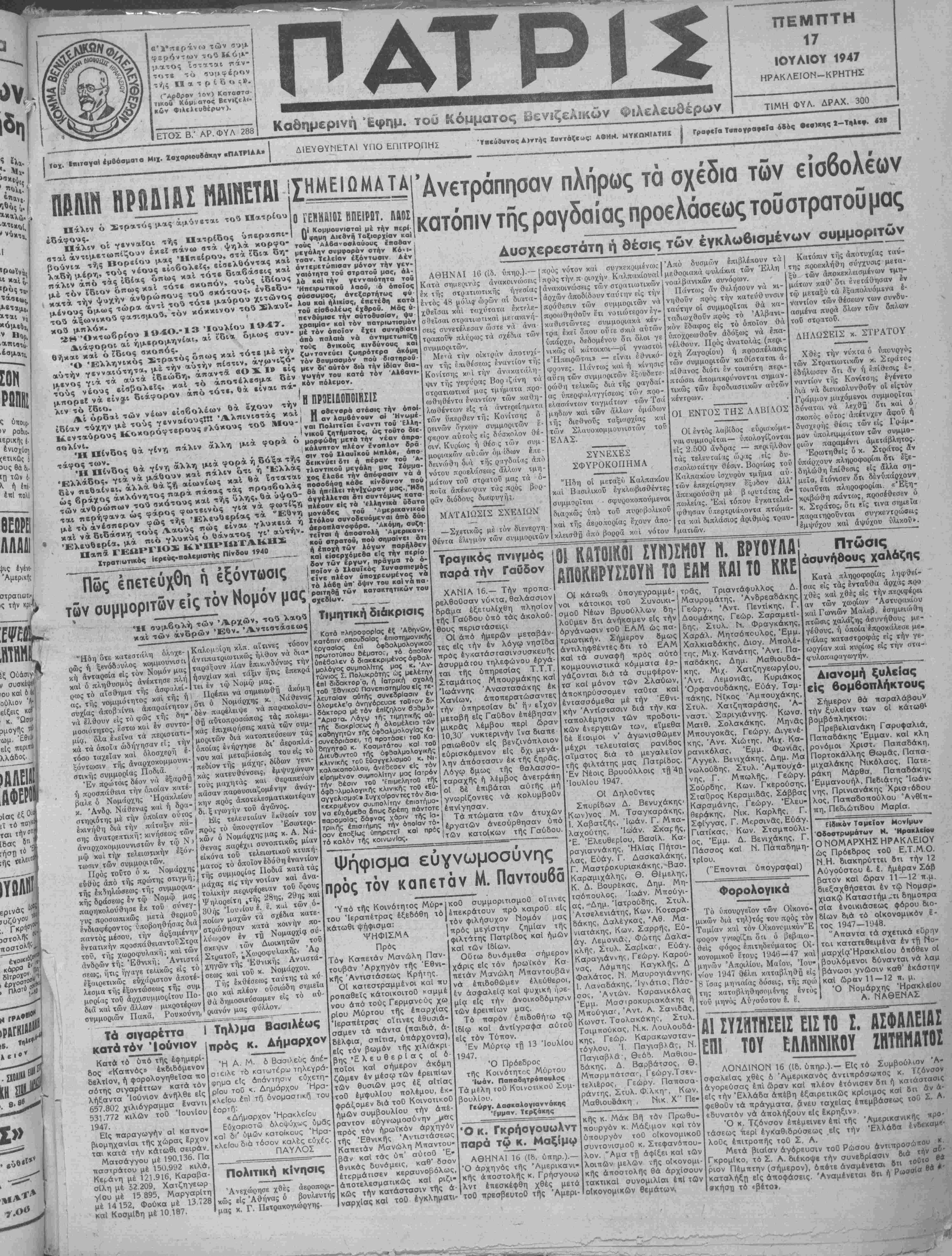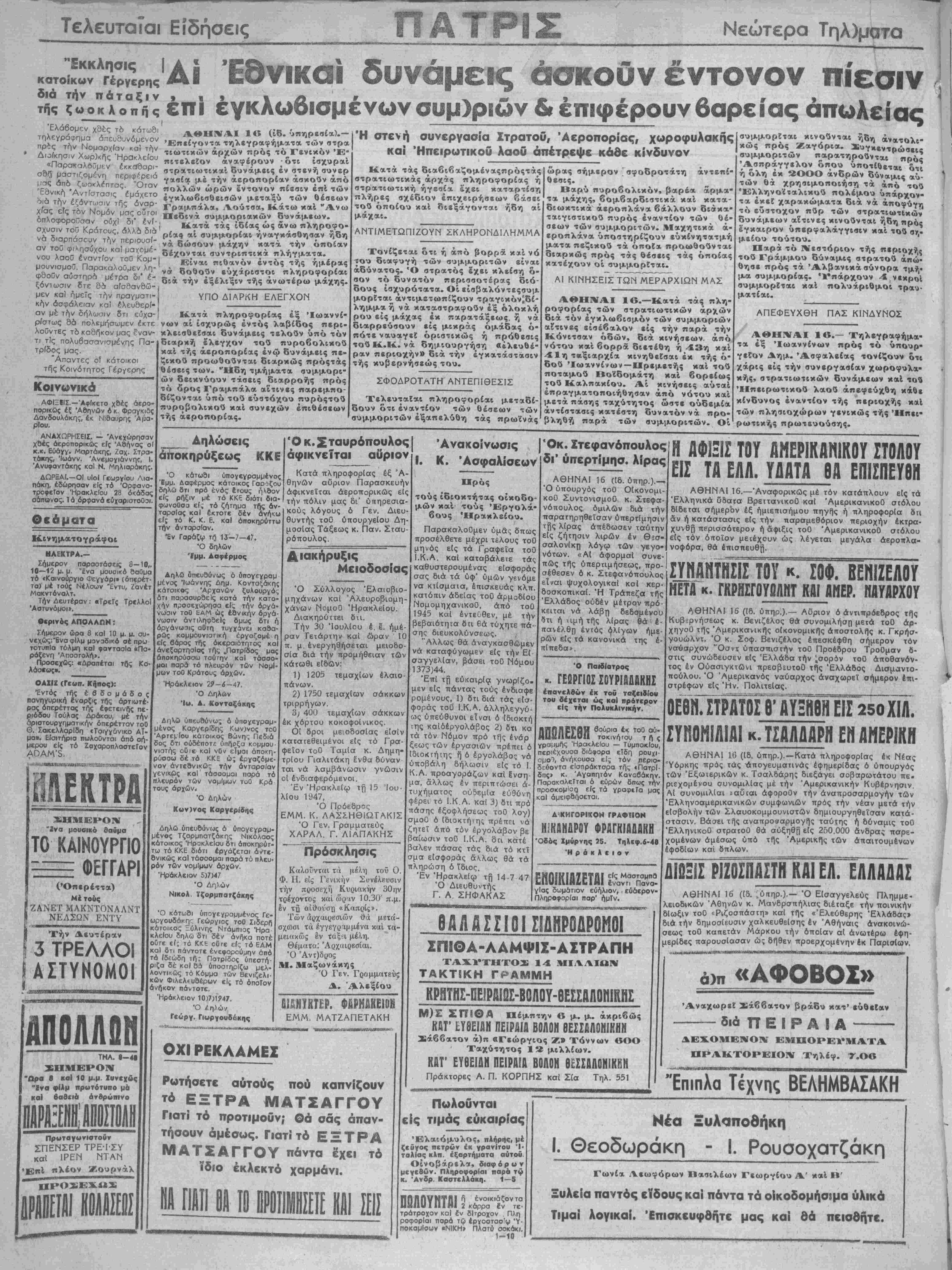 ταρσΐας καΐ έκτοτε δέν άνή< εί; τό Κ, Κ. Ε. καΐ άποκηρύττ την άνταρσΐαν. Έν Γαράζφ τζϊ 13-7-47. "Ο δηλθν Ίμμ. Ααφέρμος Δηλώ ύπευθύνως ό ύπογεγραμ μένος Ιωάννης Δημ. Κονταξάκη κάτοικος Αρχανών ξυλουργό δτι παρασυρθεΐς κατά την κατο χήν προσεχώρησα είς την όρ»·ά νωσιν τοθ &ΑΜ ώς εθνικήν όργά νωσιν άνπληφΒείς ομως δτι ί οργάνωσις αυτή τυγχάνει καθα ρθς κομμουνισπκή έργαζομέ είς βάρος τής άκεραιότητος κα άνεζαρτησίας τής ^Πατρίδος μοί άποκηρύσσω ταύτην καΐ τάσοο μαι παρά τό πλευρόν των ΝομΙ μων τοθ Κράτους άρχών. Ηράκλειον 29-6-47. Ό Δηλών Ί«. Α. Κονταξάκης ΑΕΚΤΡΑ ΣΗΜΕΡΟΝ Ίνα μουοικό δαύμα ΤΟ ΚΑΙΝΟΥΡΠΟ ΦΕΓΓΑΡΙ (Όπερέττα) Μέ τοΰς ΖΑΝΕΤ ΜΑΚΝΤΟΝΑΛΝΤ ΝΕΛΣΩΝ ΕΝΤΥ Ι Την Δευτέραν 3 ΤΡΕΛΛΟΙ ΑΣΤΥΝΟΜΟΙ Δηώ ύπευδύνω; ό ύπογεγραμ μένος ΚαργερΙδης Κων)νος τοθ "Αρτεμΐου κατοκος Βώνης Πεδιά δος δτι ουδέποτε ύπήρξα κομμου νιοτής ου τε κα! νυν εϊμαι άποκη· ρύοοω δέ τό ΚΚΕ ώ; έργαζόμε νόν άντεθνικώς την άνταρσΐαν γενικώς καΐ τάσοομαι πορά τό πλευρόν των νομΐμων τυθ Κρά τους άρχών. Ό Δηλών Κυν)νος Καργερίδης ΑΠΟΛΛΟΚ ΤΗΛ. 8-41 ΣΗΜΕΡΟΝ "Λρο β καΙ 10 μ.μ. Ζυνεχδς "Ινα φ(λμ πρατότυπο μά καΑ βαθιιά άνβρώπινο Πρυταγυνιοτοϋν ΣΠΕΝΣΕΡ ΤΡΕΊ-ΣΥ καί ΙΡΕΝ ΝΤΑΝ πλέον Ζουρνάλ Δηλώ ΰπευβύνιος 6 υπογεγραμ¬ μένος Τζορμπατζάκης Νικόλαος κάτοικος Ηρακλείου ότι άποκηρύτ- τω τό ΚΚΕ διότι έργάζεται άντε- θνικώς καΐ τάσοομαι παρά τό πλευ ρόν των νομΐμων άρχών. Ηράκλειον 5)7)47 Ό Δηλών Νικολ. Τζορμπατζακης Ό κάτωθι υπογεγραμμένος Γε- ωργουδάκη', Γεώργιος τοθ Σιοερή κάτοκος Ξύλινης Ντάμπιας Ήρα κλεΐου δηλώ δτι δέν άνήκα ποτέ οθτε εί; τό ΚΚ6 ου τε είς τό ΕΑΜ καί δτι πάντοτε ένεφορούμην άπό τό ίδεώδη τή; Πατρίδος υπέστη- ριζα δέ κοΙ βά ΰποοτηρΐζω μελ- Αοντικώς τό Κόμμα των Βενιζελι· κων Φιλελΐυθέρων είς τό οποίον |άνήκον πάντοτε. Ηράκλειον 10)7)1947. Ό /ηλών Γεώργ. Γιοργουδόκης Ο κ. Σταυρόπουλος αφικνείται αυριον Κατά πληροφορίας έξ Α¬ θηνών αυριον Παρασκευήν αφικνείται άεροπορικως είς την πόλιν μας δι' ύπηρεσια- κούς λόγους ό Γεν. Διευ- θυντής τοθ ύπουργείου Δη¬ μοσίας Τάξεως κ. Παν. Σταυ¬ ρόπουλος. Αιακήρυξις Μειοδοσίας Ανακοίνωσις | Όκ. Στεφανόπουλος Ι. Κ. 'Ασφαλίσεων Πρός τούς ιδιοκτήτας οίχοδο μών χ αί βους τούς 'Έργολά- Ήρακλείου Πβρακαλοθμεν υμάς δπως προσέλθετε μέχρι τέλους τοθ μηνός είς τα Γραφεΐα τοθ Ι.Κ.Α. καί καταβάλετε τάς καθυστερουμένας εΐσφοράς σας διά τα υφ' υμών γενόμε ί έά μ γμ Ό Σύλλογος Έλα,οβιο- νσ ^ίσ^α' έπισκευάς κλπ μηχάνων καΐ Άλευροβιομη- χάνων ΝομοΟ Ηρακλείου. Διακηρύττει διι. Την 30 Ιουλίου έ. έ. ημέ¬ ραν Τετάρτην καΐ ώραν 10 π. μ.ενεργηθήσεται μειοδο- σία διά την προμήθειαν των κάτωθι είδών: 1) 1205 τεμαχΐων έλαιο- πάνων. 2) 1750 τεμαχΐων σάκκων τριρρήγων. 3) 400 τεμαχΐων σάκκων έκ χάρτου κοκοφοΐνικος. Οί δροι μειοδοσίας είσίν καταΓεθειμένοι είς τό Γρα¬ φείον τοθ ΤαμΙα κ. Δημη- τρΐου Γιαλιτάκη "ένθα δύναν ται νά λαμβάνωσιν γνώσιν οί ένδιαφερόμενοι. Έν Ήρακλείφ ιή 15 Ιου¬ λίου 1947, Ό Πρόεδρος ΕΜΜ. Κ. ΛΑΣΣΗΘΙΩΤΑΚΙΣ Ό Γεν. Γραμματεύς ΧΑΡΑΛ. Γ. Λ1ΑΠΑΚΗΣ Πρόσκλησις Καλοΰνται τα μέλη τοϋ Ο. Φ. Η. είς Γενικήν Συνέλευσιν την προσέχη Κυριακήν 30 ην τρέχοντος καΐ ώραν 10.30' π.μ. έν τβ αίθούσχ) «Καπρίς». Των αρχαιρεσιών θά ά ρχρ σχωσι τα έγγεγριμμένα καί τα- μειακώς έν ταξι-ι μέλη. Θέματα: Αρχαιρεσίαι. Ό Άντ)δρος Μ. Μαζωνάκης Ό Γεν. Γραμματεύς Δ. Αλεξίου ϋί£Ν1ΚΤ£Ρ. ΦΑΡΜΔΧΕΙΟίΙ ΕΜΜ. ΜΑΤΖΑΠΕΤΑΚΗ ΟΧί ΡΕΚΛΑΜΕΣ ; Ρωτήσετε αύτούς πού καπνίζουν τό ΕΞΤΡΑ ΜΑΤΣΑΓΓΟΥ Γιατί τό προτιμοϋν; ©α σάς άτταν- τήσουν άμεσος. Γιατΐ τό ΕΞΤΡΑ ΜΑΤΣΑΓΓΟΥ πά