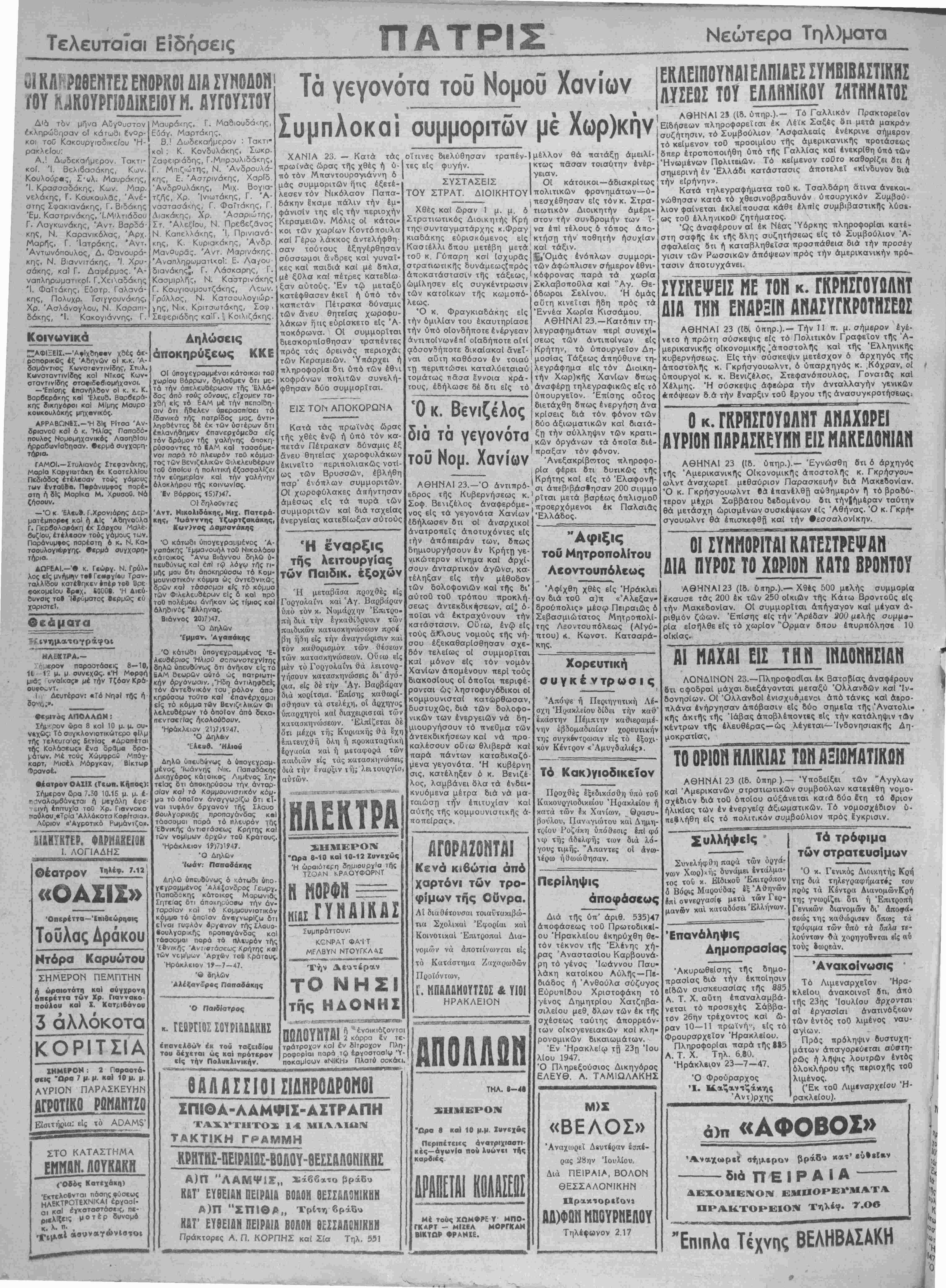 τό Κατάστημα ΖΓ<χαρωδών ΠροϊόνΓων, Γ. ΜΠΑΛΑΜΟΥΤΣΟΣ & ΥΙΟΙ ΗΡΑΚΛΕΙΟΝ ΑΠΟΛΑΟΗ ΤΗΛ. 8-4· ΣΗΛΙΕΡΟΙΝί Όρα 8 καΜΟ μ.μ. Σ»νεχ·ς Περιπέτεικς άνατριχιαοτι- κές— άγυνΐα πού λυώνκι τής καρδιές Μέ τούς ΧΩΜΦΡτ: Υ ΜΠΟ· ΓΚΑΡΤ - ΜΙΖΕΑ ΜΟΡΓΚΑΝ ΒΙΚΤΩΡ ΦΡΑΝΙΕ. τροερχόμενοι Ελλάδος. Αφιξις τού Μητροπολίτου Λεοντουπόλεως Αφιχθη χθές είς Ήράκλει όν διά τοθ α)π «Άλεξαν- δρούπολις» μέσω Πειραιώς ό Σεβασμιώτατος ΜητροπολΙ- της Λεοντουπόλεως (Αίγύ- πτου) κ. Κωνστ. Κατσαρά- κης. ΣΥΣΚΕΨΕΙΣ ΜΕ ΤΟΝ κ. ΓΚΡΗΣΓΟΥΟΛΝΤ ΔΙΑ ΤΗΝ ΕΝΑΡΞΙΝ ΑΝΑΣΥΓΚΡΟΤΗΣΕΩΣ ΑΘΗΝΑΙ 23 (ίδ1. ύπηρ.).- Την 11 π. μ. σήμερον εγέ¬ νετο ή πρώτη σόσκεψις είς τό Πολιτικόν Γραφείον της Ά- μερικανικης οικονομικάς 'άποστολής καί της Ελληνικήν κυβερνήσεως. Είς την σύσκεψιν μετέσχον ό άρχηγός τής άποστολης κ. Γκρήσγουωλντ, ό ύπαρχηγός κ. ,Κόχραν, οί ύπουργοί κ. κ. Βενιζέλος, Στεφανόπουλος, Γονατάς καί Χέλμης. Ή σύσκεψις αφεώρα την ανταλλαγήν γενικΔν «πόψεων δ.ά την έναρξιν τοθ Εργου της ανασυγκροτήσεως; Χορευτική συγκέντρωσις Άπόψε ή Πεοιηγϊΐτική Λέ- σχη Ηρακλείου δίδει την καθ' άστην Πέμπτην καθιεροομέ- |ν έβδομαδιαίαν χορευτικήν της συγκέντρωσιν είς τό Ιξοχι- κόν Κέντρον «Άμυγδαλιές». Τό Καιθγιοδικειον Προχθές έξεδικάσθη υπό τού Κακουργιοδικείου Ήρακλϊίου ή κατά των έκ Χανίων, ©ρασυ- βούλου, Παν.ιγιώτου καί Δημη- τρίου Ροζάκη υπόθεσις επί φό νφ τής αδελφής των διά λό- γους τιμής. "Απαντες οί άνιο- ιέρω ήθωώθησαν. Περίληψις αποφάσεως Διά τής ύπ' αριθ. 535)47 αποφάσεως τοθ Πρωτοδικεί- ου Ηρακλείου εκηρύχθη θε- τόν τέκνον της "Ελένης χή- ρας Αναστασίου Καρβουνά- ρη τό γένος Ιωάννου Παυ- λάκη κατοίκου Αύλης—Πε¬ διάδος ή Άνθούλα σύζυγος ΕύρυτιΙδου Χριστοφάκη τό γένος Δημητρίου Χατζηβα- σιλείου μεθ, δλων των έκ τής σχέσεως ταύτης άπορρεόν- των οίκογενειακών καί κλη- ρονομικών δικαιωμάτων. Έν "Ηρακλείω τή 23η Ίου λίου 1947. Ό Πληρεξούσιος Δικηγόρος ΕΛΕΥΘ. Α. ΤΑΜΙΩΛΑΚΗΣ Μ)Σ «ΒΕΑΟΣ» Αναχωρεί Δβυτέραν εσπέ¬ ρας 28ην Ιουλίου, Διά ΠΕΙΡΑΙΑ, ΒΟΛΟΝ ΘΕΣΣΑΛΟΝΙΚΗΝ Πρακτορείον) ΑΔ)ΦΩΝ ΜΠΟΥΡΝΕΛΟΥ Τηλέφωνον 2.17 Ο κ. ΓΚΡΗΣΓΟΥΟΛΝΤ ΑΝΑΧΩΡΕΙ ΑΥΡΙΟΝ ΠΑΡΑΣΚΕΥΗΝ ΕΙΣ ΜΑΚΕΔΟΝΩΝ ΑΘΗΝΑΙ 23 (Ιδ. ύπηρ.).- Εγνώσθη ότι ό άρχηγός της Άμερικανικης Οίκονομικης άποστολης κ. Γκρήσγου¬ ωλντ αναχωρεί μεθαύριον Παρασκευήν διά ΜακεβονΙαν. Ό κ. Γκρήσγουωλντ βά επανέλθη αυθημερόν η τό βραδύ¬ τερον μέχρι Σαββάτου δεδομένου δτι τήν|ήμβραν ταύτην θά μετάσχη ωρισμένων συσκέψεων είς Αθήνας. Ό κ. Γκρή¬ σγουωλντ θά επισκεφθή καί την θεσσαλονίκην. ΟΙ ΣΥΜΜΟΡ1ΤΑ! ΚΑΤΕΣΤΡΕΨΑΗ ΔΙΑ ΠΥΡΟΣ ΤΟ ΧΩΡΙΟΝ ΚΑΤΩ ΒΡΟΝΤΟΥ ΑΘΗΝΑΙ 23 (Ιδ. ύιτηρ.).—Χθές 500 μελής συμμορΐα εκαυσε τάς 200 έκ των 250 οίκιων της Κάΐω Βροντοθς είς την ΜακεδονΙαν. Οί συμμορΐται άπήγαγον κσΐ μέγαν α¬ ριθμόν ζώων. Έπίσης είς την Άρέ^αν 200 μελής συμμ·- ρία εισήλθε είς τό χωρίον 'Όρμαν δπου έπυρπόλησε 10 οίκίας. ΑΙ ΜΑΧΑΙ ΕΙΣ ΤΗΝ ΙΝΔΟΝΗΣΙΑΝ ΛΟΝΔΙΝΟΝ 23.—ΠληροφοσΙαι έκ Βατσβίας άνσφέρουν 8τι σφοδραί μαχαι διεξάγονται μεταξύ Όλλανδών κσί Ίν- δονησίων. Οί Όλλανδοί ένισχυάμενοΐ άπό τάνκς καί άβρο- πλάνα ένήργησαν άπόβασΐν είς 8ύο σημεΐα της ,Άνατολι- κης άκτης τής Ίάβας αποβλέποντες είς την κατάληψιν τΛν κέντρων της ελευθέρας—ώς; λέγεται—Ίνδονησιακής Δη¬ μοκρατίας, _____________________________ ΤΟ ΟΡΙΟΝ ΗΛΙΚΙΑΣ ΤΩΝ ΑΞΙΩΜΑΤΙΚΟΝ ΑΘΗΝΑΙ 23 (Ιδ. ύπηρ ).— ΎποδεΙξει των "Αγγλων καί Άμερικανών στρατιωτικών συμβουλων κατετέθη νομο¬ σχέδιον διά τοθ όποίου αύξάνεται καΐά δύο έτη τό βριον ήλικίας των έν ένεργεΐα αξιωματικών. Τό νομοσχέδιον ύ- ιτε»ήθη είς τό πολιτικόν 