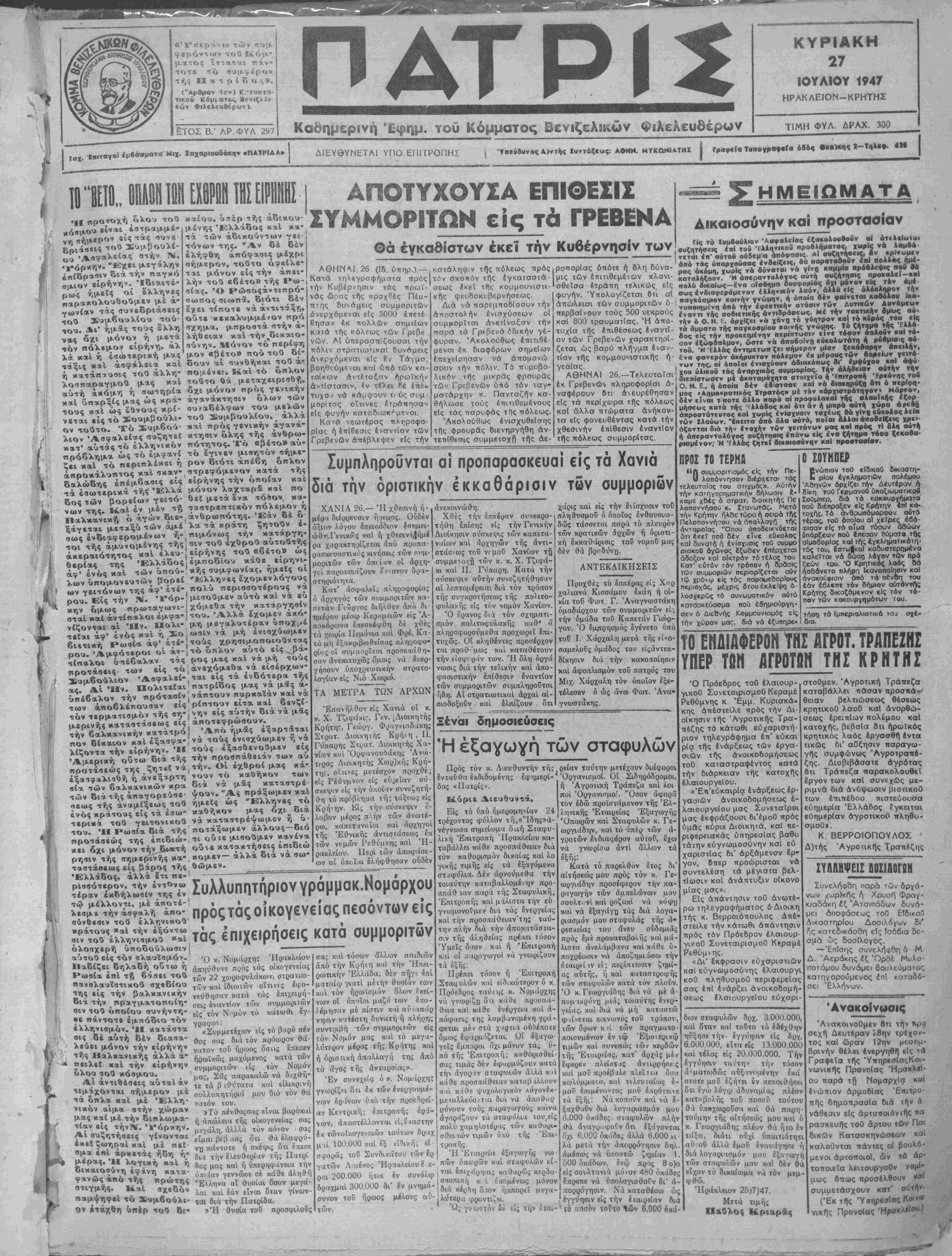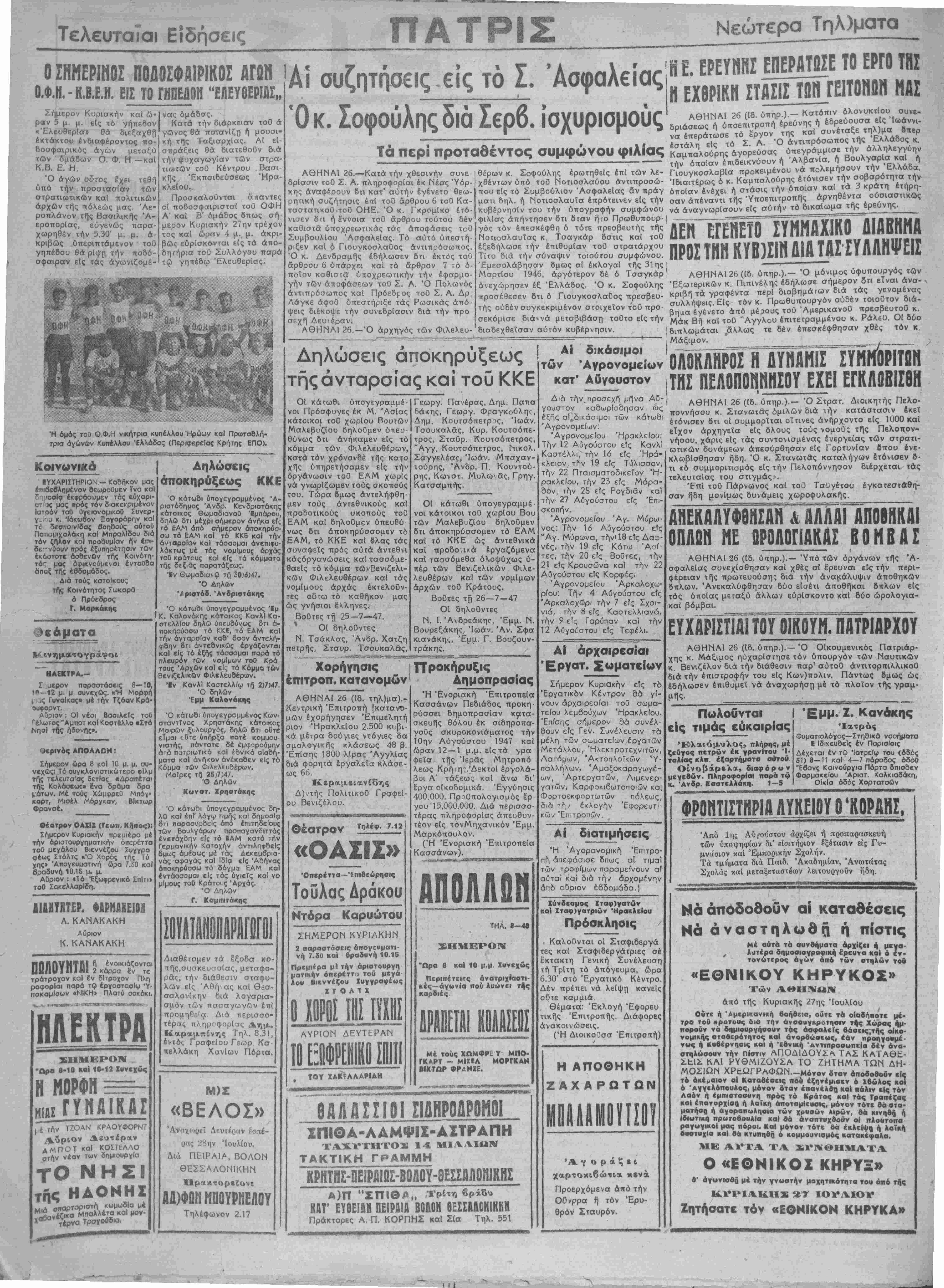 ΛατΛμων, 'Α<τοπλο7κ(Γιν "Υ παλλήλων, 'Αμαξοκαραγωγέ- ων, Άρτεργατών, Λιμενερ- γατών, Καρφθκιβωτοποιών κα1, Φορτοεκφορτωτών πόλεως, διά τή/ εκλογήν Έφορευτι κων Επιτροπών ΑΙ διατιμήσεις 'Η Άγορανομική Έπιτρο- πή απεφάσισε δπως αί τιμαί των τροφίμων παραμείνουν αί αύται κα! διά την" αρχομένην άπδ αύριον έβοομάδα " Χύνβεομος Ιταφ)γατών καΐ ϊταφ)γατριθν Ηρακλείου Πρόσκλησις Καλοϋνται οί Σταφιδεργά τες καί Σταφιδεργάτριες σέ έκτακτη Γενική Συνέλευση τή Τρίτη τό άπόγευμα, ώρα 6.30' στό Έργατικό Κέντρο. Δέν πρέπει νά λεΐψτι κανείς οϋΐε καμμιά Θέματα: 'Εκλογή Έψορευ τικής Έπιτροπής. Διάφορες άνακοΐνώσεις. (*Η Διοικοθσα Έπιτροτιή) Η ΑΠΟΘΗΚΗ ΖΑΧΑ ΡΩΤΩΝ ♦Αγ οράζει χαρτοκιβώτια κενά Προερχόμενα άπό την Οΰνρρα ή τόν Έρυ- θρόν Σταύρον. ·ι^ άντιτφοσωτιος .,- - - ... παλοΰρης «γορευσα*. ύπεγράμμισε την αλληλεγγύην την όποίανϊπΓδεικνύουν ή Άλβανία. ή Βουλγαρία καΐ ή Γιουγκοσλσβία προκειμένου νά πολεμήσουν την Ελλάδα. ΊοιΓτέρωςί κ. Καμπαλούρης ετόνισεν την σοβαρότητα την όποιαν ένέχει ή στάσις την οποίαν καί τα 3 κράτη έτήρη- σαν άπέναϊτι τής "Υποεπιτροπής άρνηθέντα ου««σΐικβς νά άναγνωρίσουν είς αυτήν τό δικαίωμα τής ερεύνης. 1 δεηΤγεΙεΙΠυΙϊΑαΙΓδιαβημα προσ την κυβ3σιη δια τασ συλληψεισ 1 ΑΘΗΝΑΙ 26 (ίδ. ύπηρ.).- Ό μόνιμος ύφυπουργός των Εξωτερικών κ. Πιπινέλης εδήλωσε σήμερον δτι είναι άνα- κριβή τα γραφέντα περί διαβημάτων οιά τάς γενομένας συλλήψεις. Είς τόν κ. Πρωθυπουργόν ουδέν τοιοθτον Βιά- βηΛα εγένετο άπό μέρους τοθ ΆμερικανοΟ πρεσβευτού1 κ. Μάκ Βή καί τοθ Άγγλου έπιτετραμμένου κ. Ράλεϋ. Οί δόο (διπλωμάται ,άλλως τε δέν επεσκέφθησαν χθές τόν κ. . Μάξιμον. __^__________________ ΟΛΟΚΛΗΡΟΪΪΜΗΑΜΐ1"ΐΫΜΜϋΦΙΤδ« ΤΗΣ ΠΕΛΟΠΟΗΗΗΣΟΥ ΕΧΕΙΕΓΚΛΩΒΙΣΘΗ ΑΘΗΝΑΙ 26 (Ιδ. ύπηρ.).— Ό Στρατ. Διοικητής Πελο- ιτοννήσου κ. Στανωΐδς ομιλών διά την κατάστασιν έκεΐ ετόνισεν διι οί συμμορΐται οΐτινες ανήρχοντο είς 1000 καί είχον άρχηγεΐα είς δλους τούς νομούς τής Πελοπον- νήσου, χάρις είς τάς συντονισμένας ενεργείας των στρατι¬ ωτικών δυνάμεων άπεσύρθησαν είς Γορτυνίαν 6που ένε- κλωβίσθησαν ήδη. Ό κ. Στανωτας καταλήγων ετόνισεν δ- τι «ό συμμοριτΐσμάς είς την Πελοπόννησον διέρχεται τάς τελευταίας τού στιγμάς». Επί τοθ Πάρνωνος καί τοθ Ταϋγέτου έγκατεστάθη- σαν ήδη μονί^μως δυνάμεις χωροφυλακής. ΑΗΕΚΑΛΥΦΘΗΣΑΝ & ΑΛΛΑΙ ΑΠΟίΗΚΑΙ ΟΠΛΩΝ ΜΕ ΟΡΟΑΟΓΙΑΚΑΣ ΒΟΜΒΑΣ ΑΘΗΝΑΙ 26 (ίδ. ύτιηρ.).— "Υπό των όργάνων τής Α¬ σφαλείας συνεχίοθησαν καί χθές αί έρευναι ε&ς την περι¬ φέρειαν τής πρωτευούσης διά την ανακάλυψιν άποθηκών οπλων. *Ανεκαλύφθησαν δύο είσέτι αποθήκαι δηλών είς τάς οποίας μεταξύ άλλων ευρίσκοντο καί δύο ωρολόγια- καί βόμβαι. ευχαΜτΙαΤμ'οΙκΤυΟατριαρχου ΑΘΗΝΑΙ 26 (ίδ. ύπηρ.).— Ό Οίκουμενικός Πατριάρ- χης κ. Μάξιμος ηυχαρίστησε τόν υπουργόν των Ναυτικων κ Βενιζέλον διά την διάθεσιν παρ' αύτοθ άντιτορπιλλικοθ διά την επιστροφήν τού είς Κων)πολιν. Πάντως Βμως ώς εδήλωσεν έπιθυμεΐ νά αναχωρήση μέ τό πλοΐον τής γραμ¬ μάς· ________________________________ , , .. ι . ......-ι · Ι -.11». —~ Πωλοθνται Ι ΈΜΜ* -· Κανάκης είς τιμάς εύκαιρίας Έλαιόμυλος, πλήρης, μέ ζκΰγος πετρύν ίκ γρανίτου Ί· ταλΐας κλπ έξαρτήματα αυτού Οινοβάρελα, διαφόρων μεγεβϋν. Πληροφορίαι παρά τφ κ. Ανδρ. Καστελλάκη. 1—5 Ίαχρός Φυματιολόγος—Στηδικό νοσήματο Β ΙδικευθεΙς έν Παρισίοις Δεχεται έν τώ Ίοτρείν τού (δδός 51) 8—11 κα) 4—7 πάροδος όδόθ "Εβανς Καινούργια Πόρτα δπισββν ΦσρμακεΙου Άριστ <αλκιαδάκη, ΟίκΙα όδδς Χορτατοθν ΦΡΟΝΤΙΣΤΗΡΙΑΛΥΚΕΙΟΥΟ'ΚΟΡΑΗΣ, Άπό 1η; Αύγούστου άρχίζει 